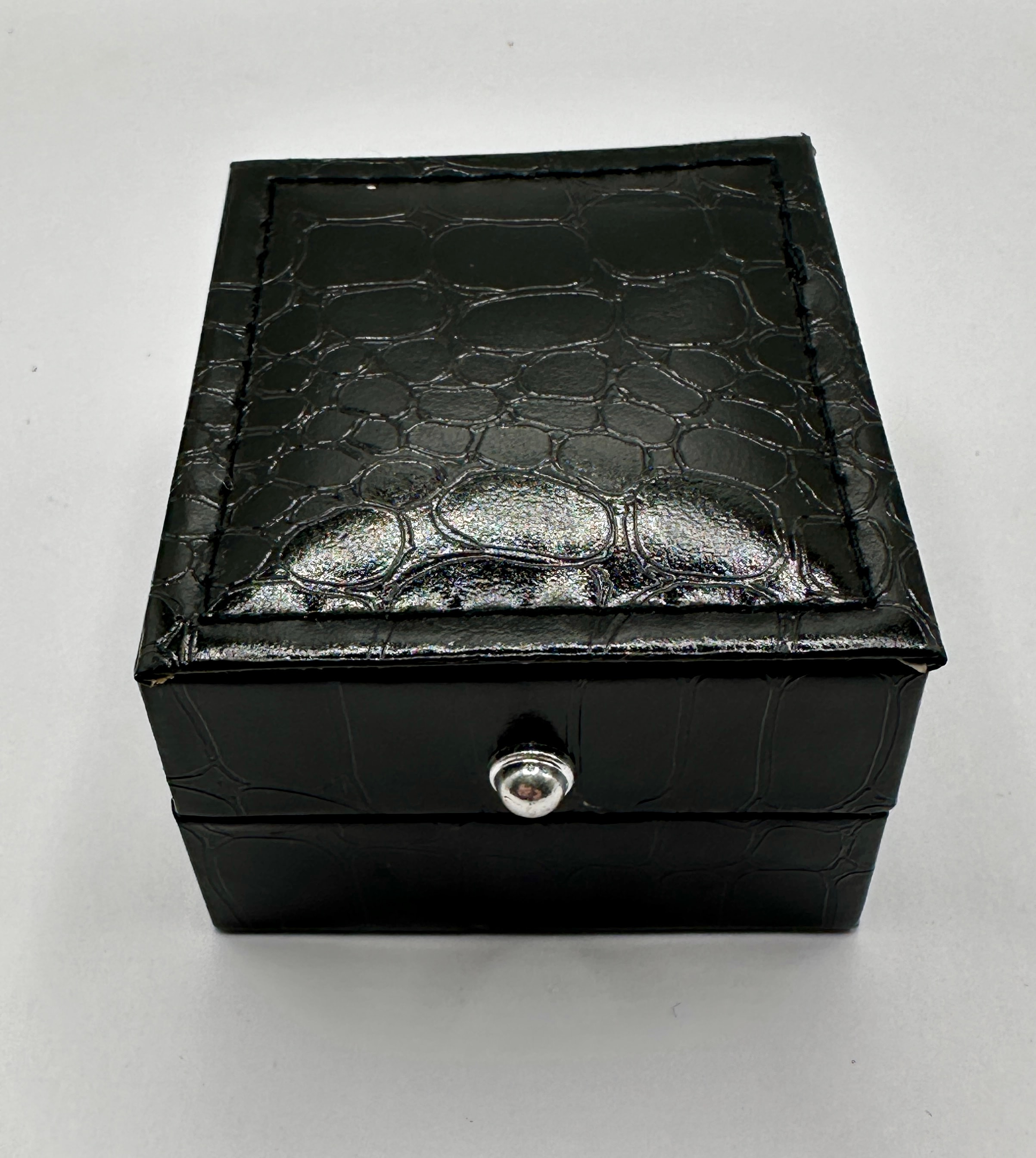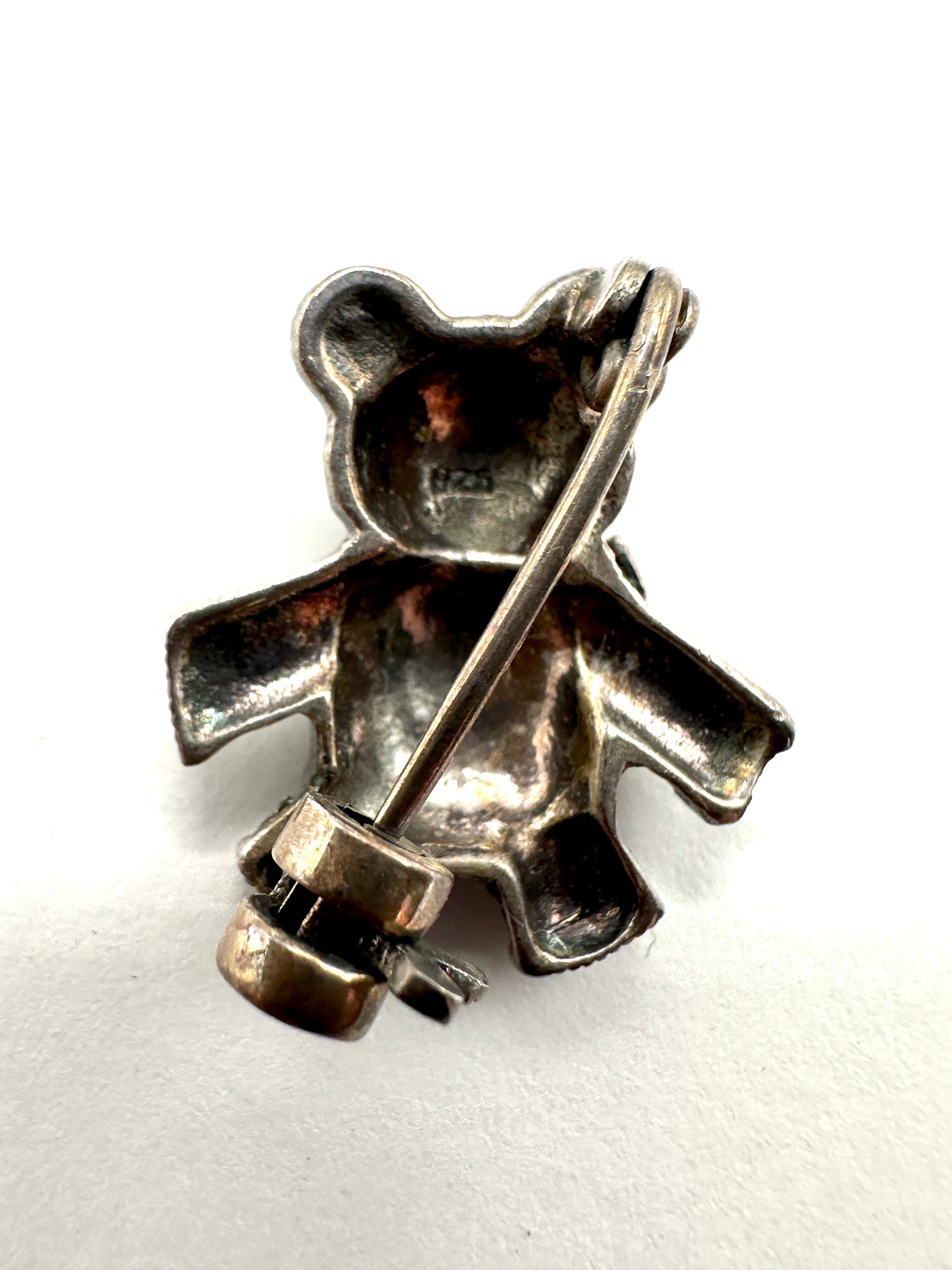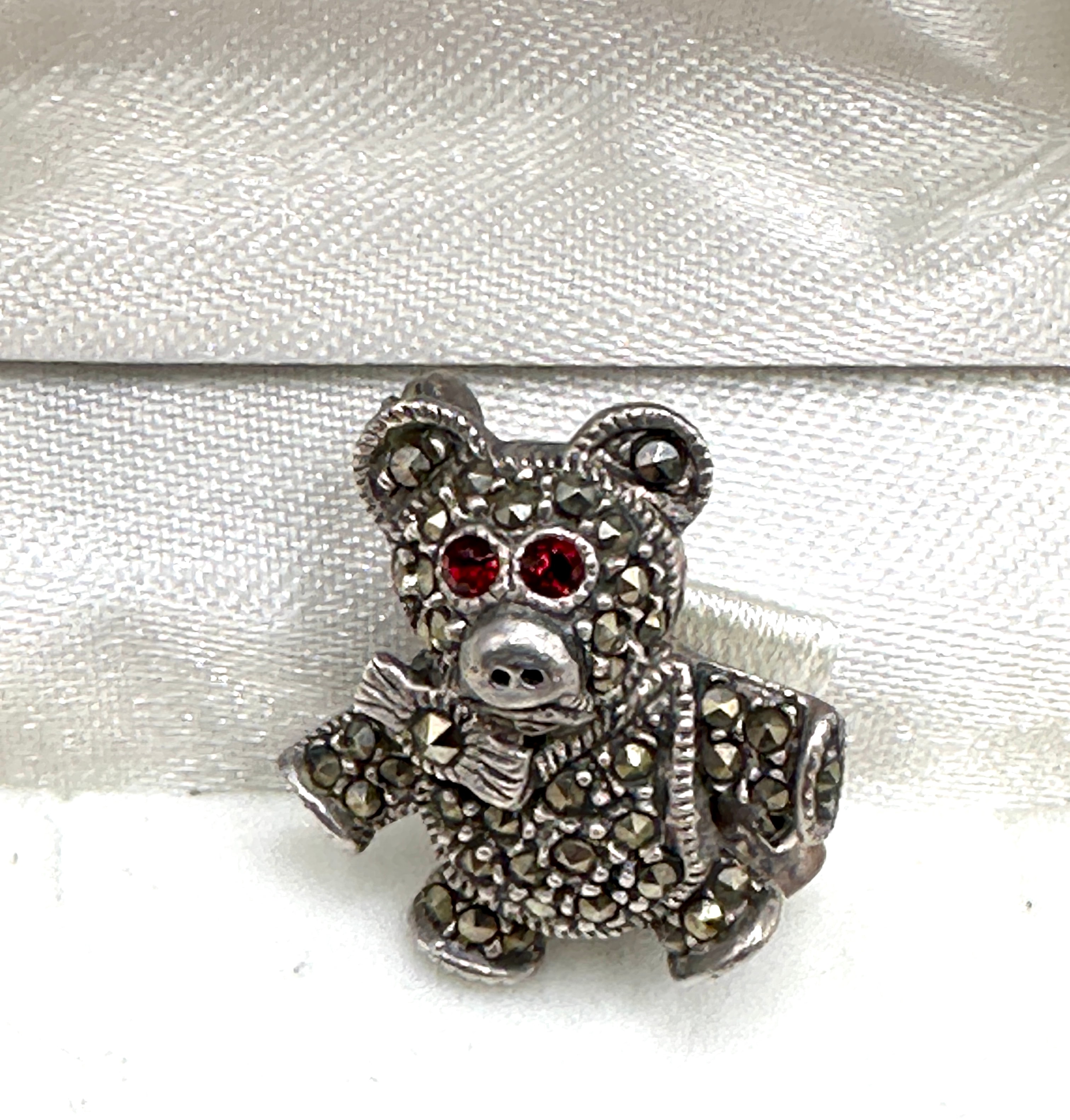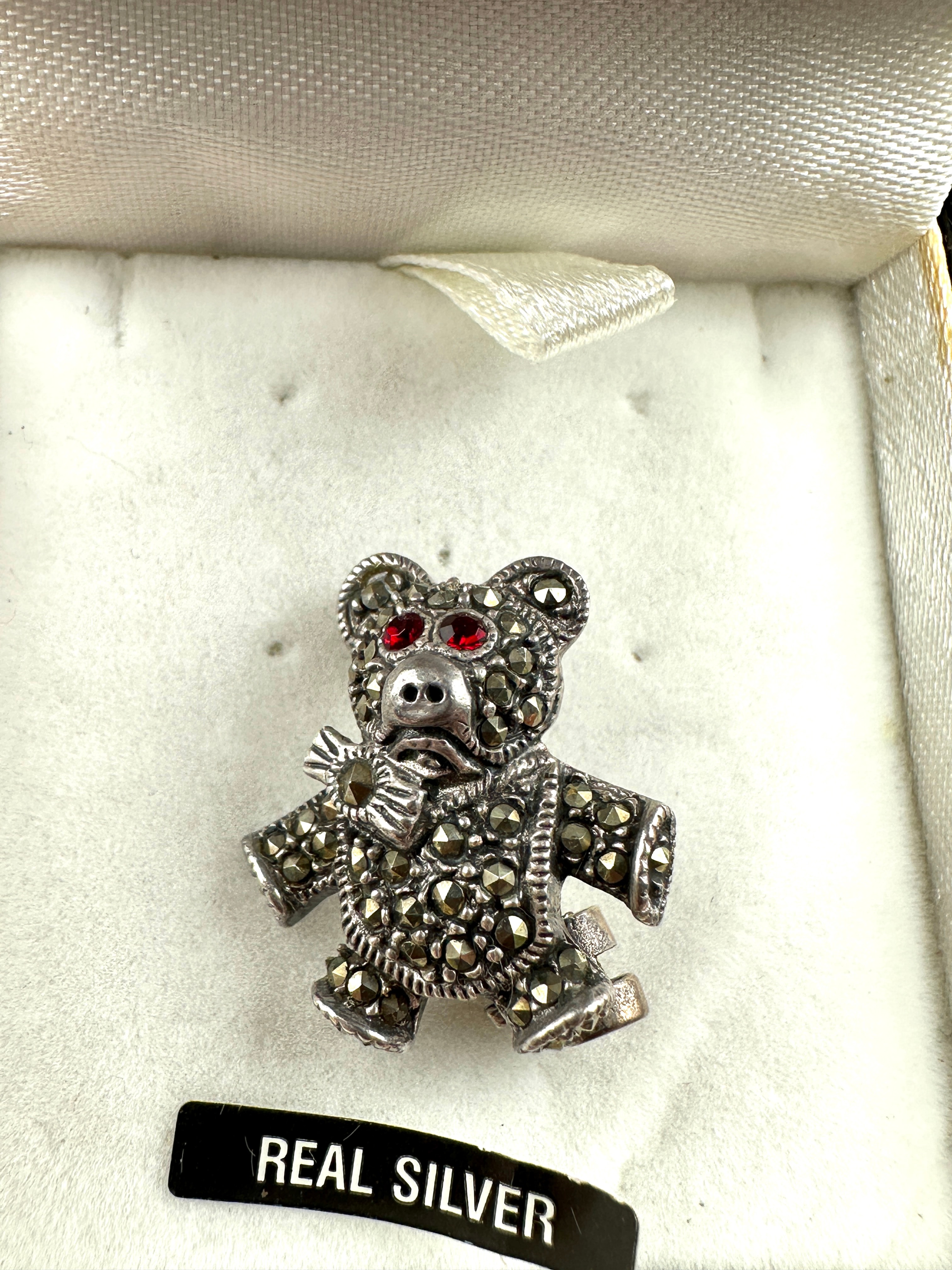 A vintage sterling silver teddy bear brooch, confirmed by a visible “925” hallmark on its reverse and an accompanying “REAL SILVER” tag. The piece is intricately embellished with numerous small, faceted marcasite stones covering the bear’s body, ears, and limbs, accented by two prominent round red stones forming the eyes. The bear is depicted wearing a bow tie and features an antiqued finish. On the reverse, a functional pin-back closure with a safety clasp is present. The brooch is presented in a black faux-alligator textured jewelry box.