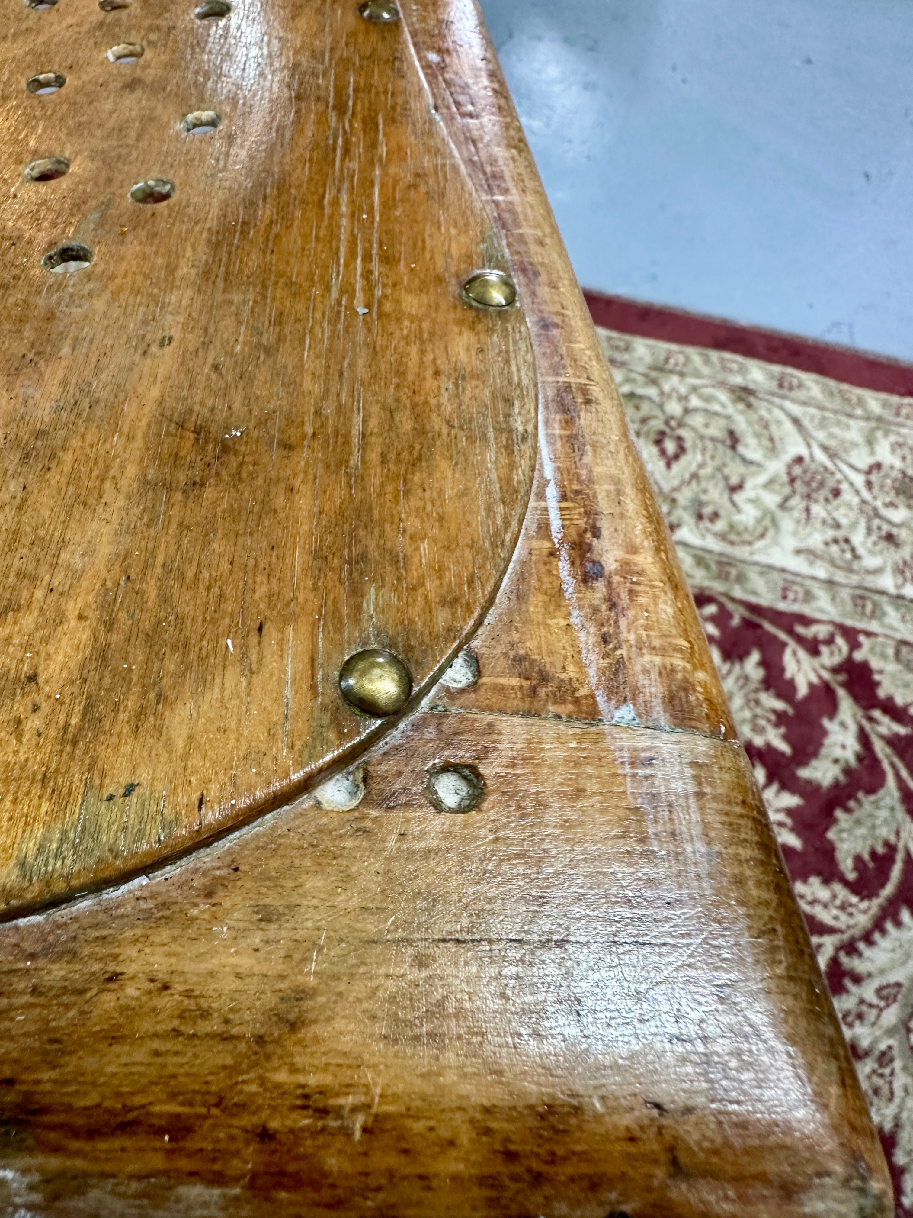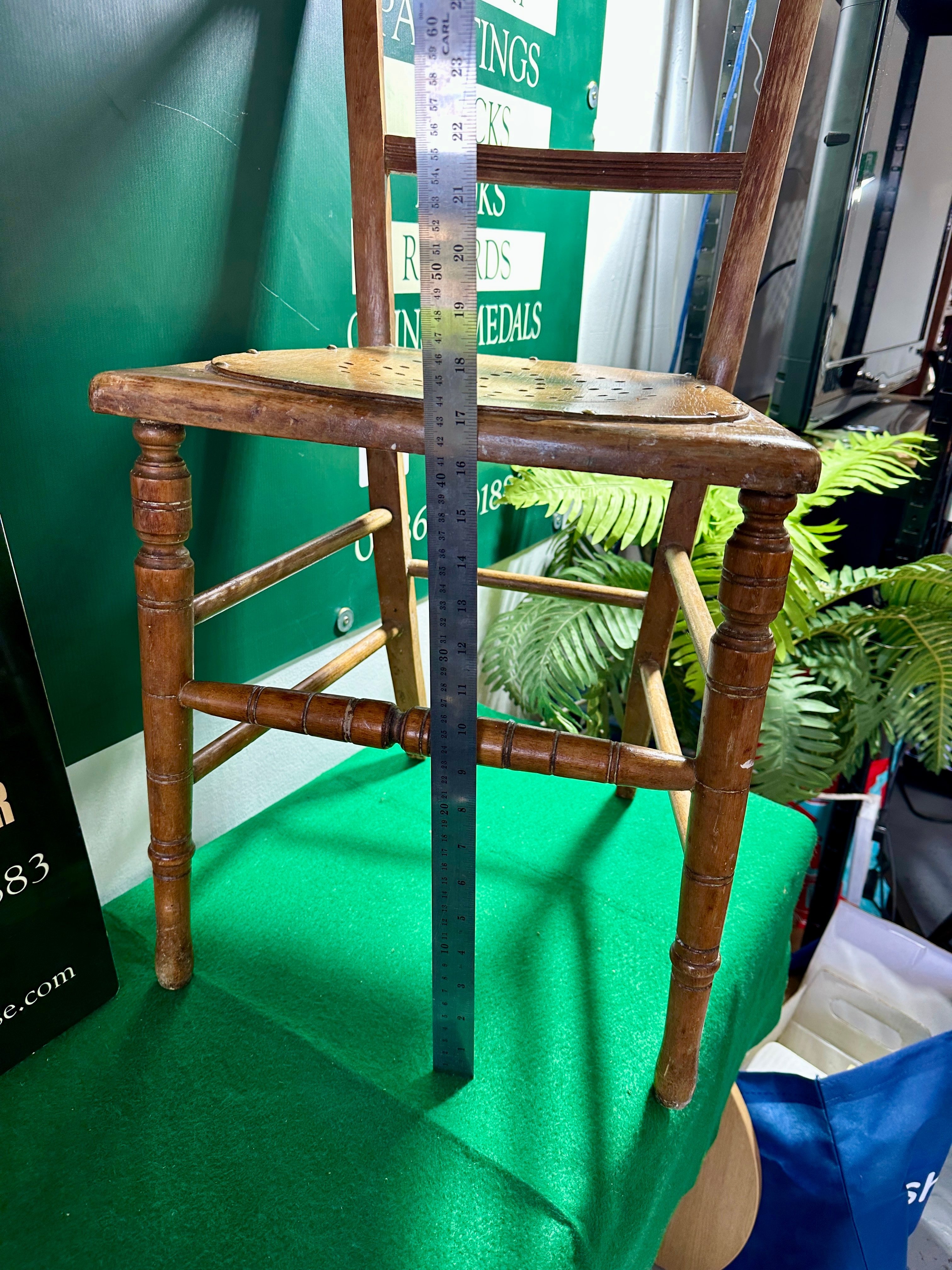 An antique or vintage wooden utility chair, constructed from a light-toned hardwood. It features a spindle-back design with three horizontal slats and turned legs with similarly turned stretchers, including a distinctive bobbin-turned central stretcher. The solid plank seat is perforated with a pattern of numerous small circular holes and secured around the edge with small brass-colored tacks or rivets.