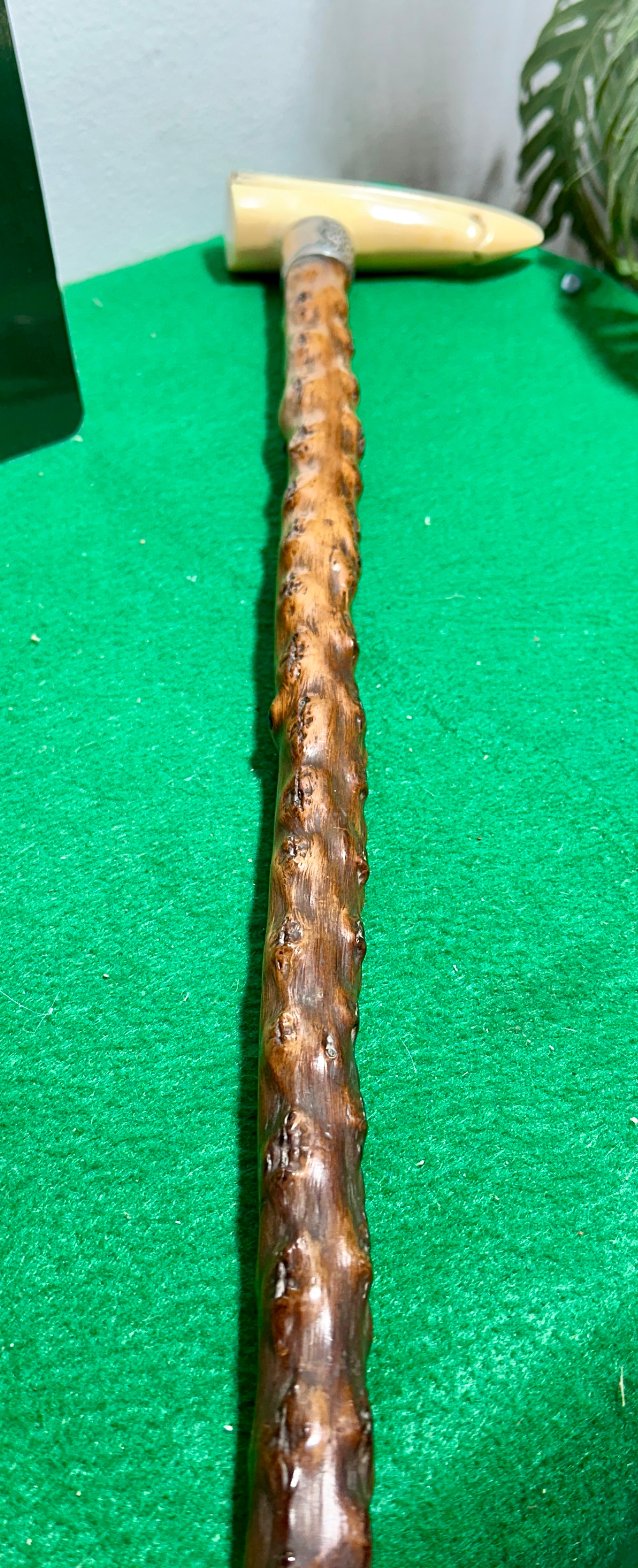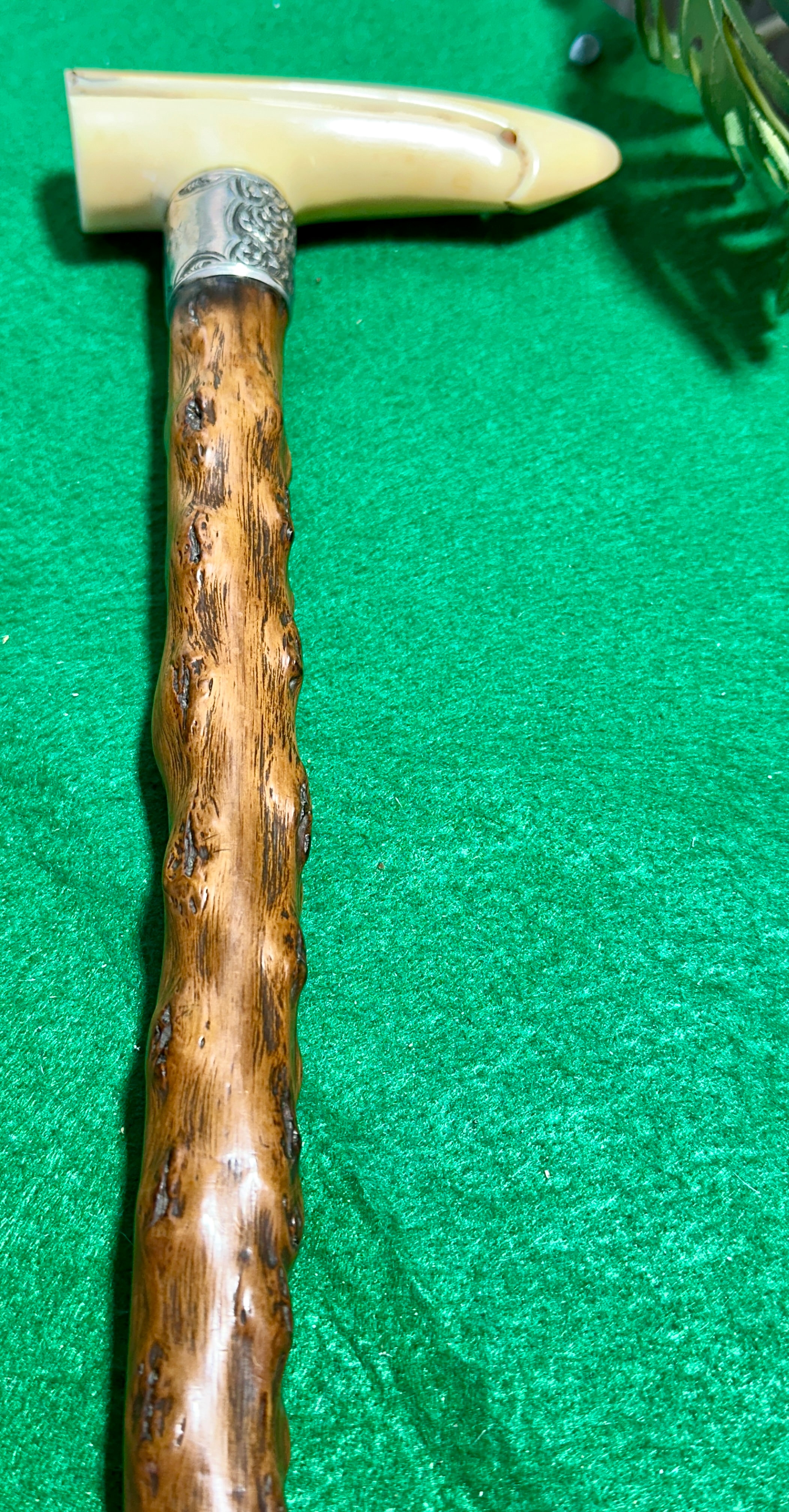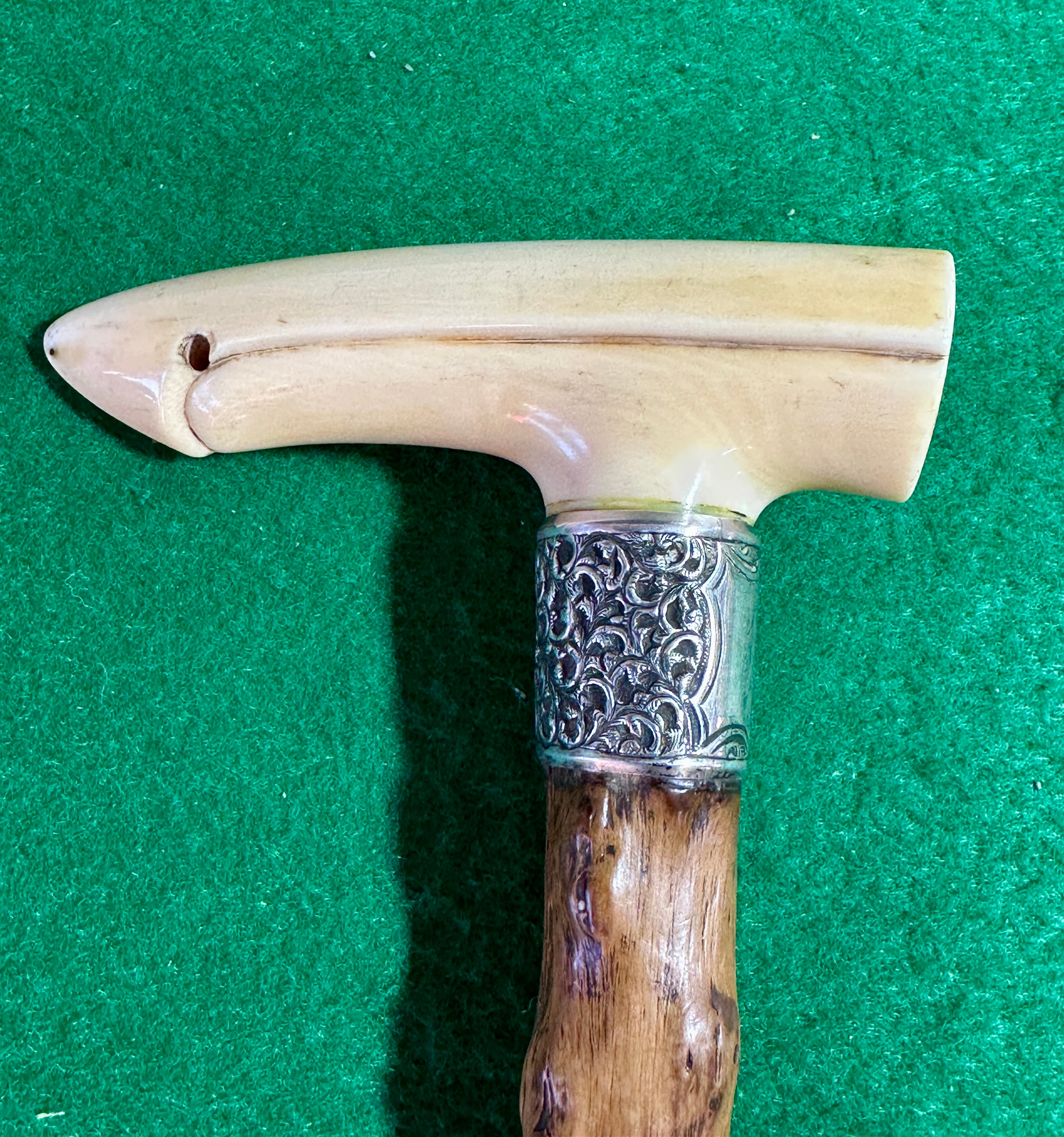 An Antique Sterling Silver Antler Handled Presentation Walking Stick. The T-shaped handle is crafted from antler, exhibiting natural striations and tapering to a pointed end. It connects to the shaft via an ornate sterling silver collar, distinguished by elaborate chased or repoussé foliate scrollwork, with the word “STERLING” clearly legible within the design. The shaft is composed of a natural, gnarled wooden branch or root, showcasing a rustic texture with numerous knots and a dark, glossy finish.