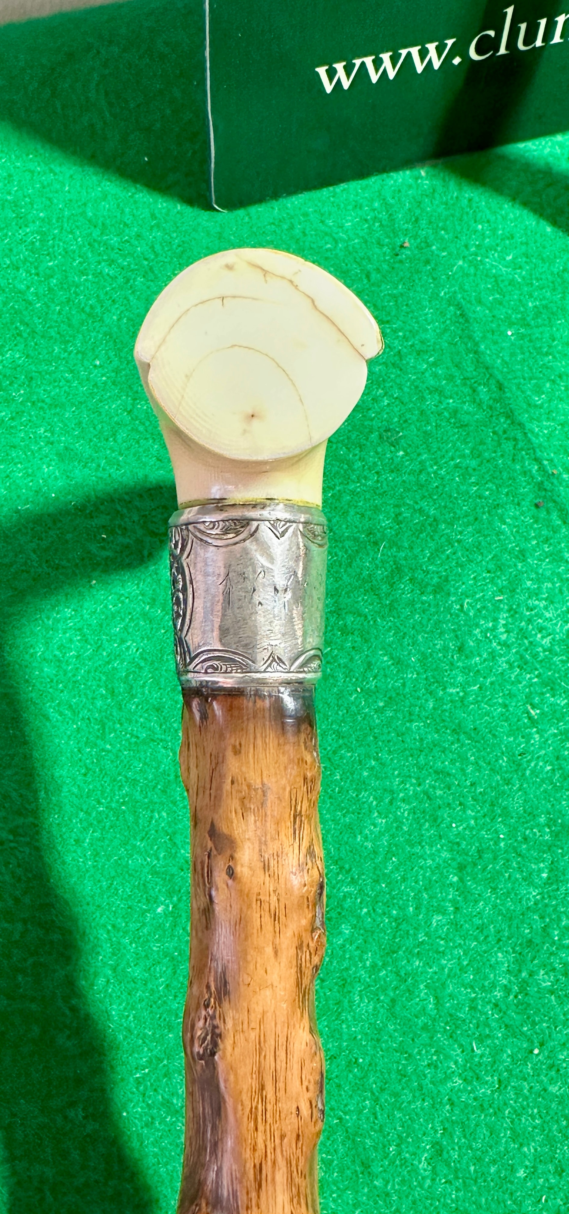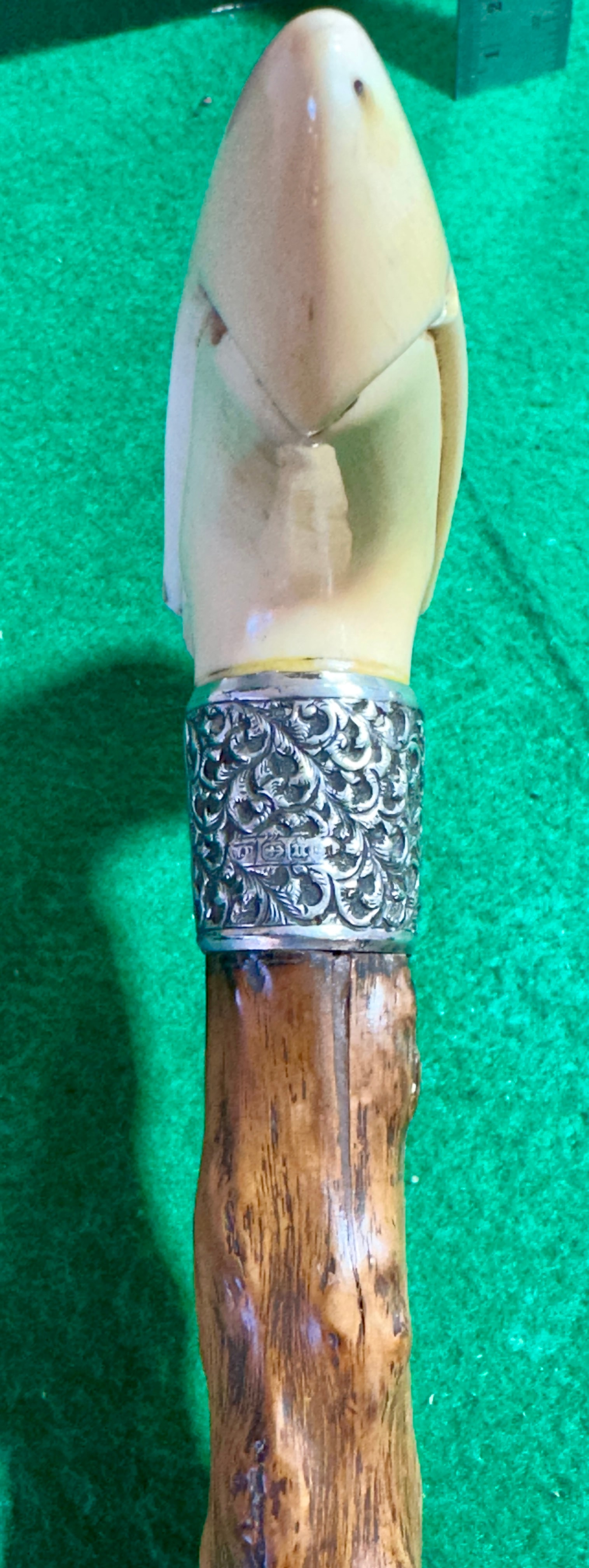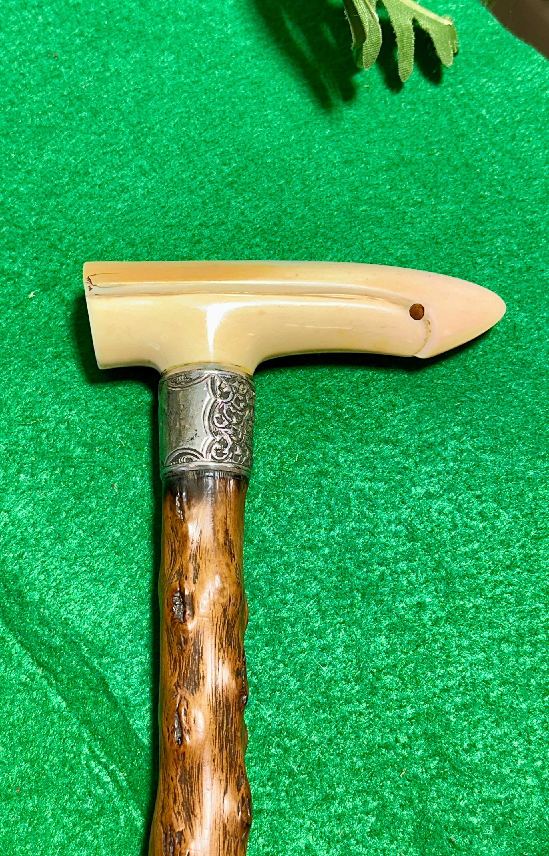 An Antique Sterling Silver Antler Handled Presentation Walking Stick. The T-shaped handle is crafted from antler, exhibiting natural striations and tapering to a pointed end. It connects to the shaft via an ornate sterling silver collar, distinguished by elaborate chased or repoussé foliate scrollwork, with the word “STERLING” clearly legible within the design. The shaft is composed of a natural, gnarled wooden branch or root, showcasing a rustic texture with numerous knots and a dark, glossy finish.