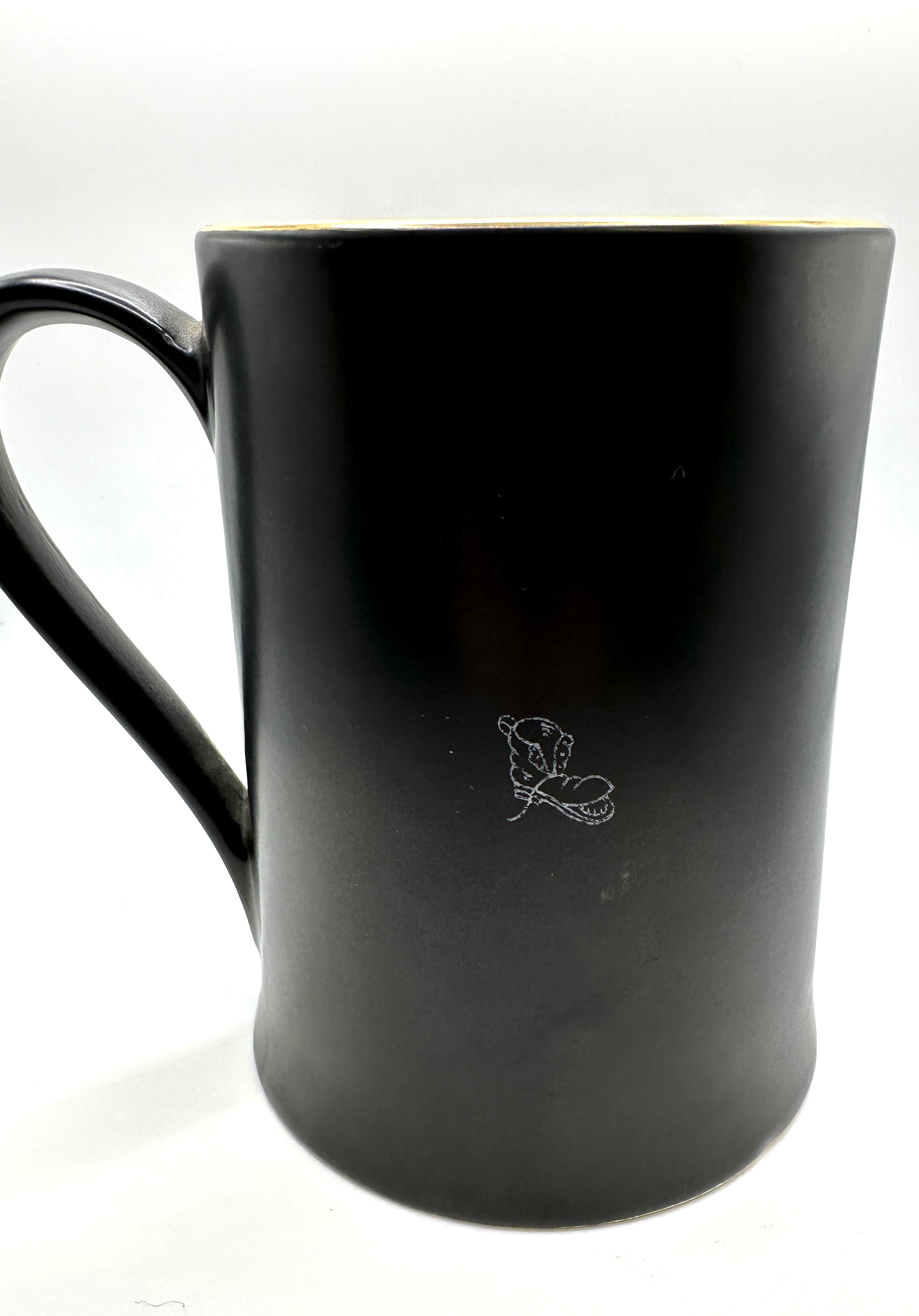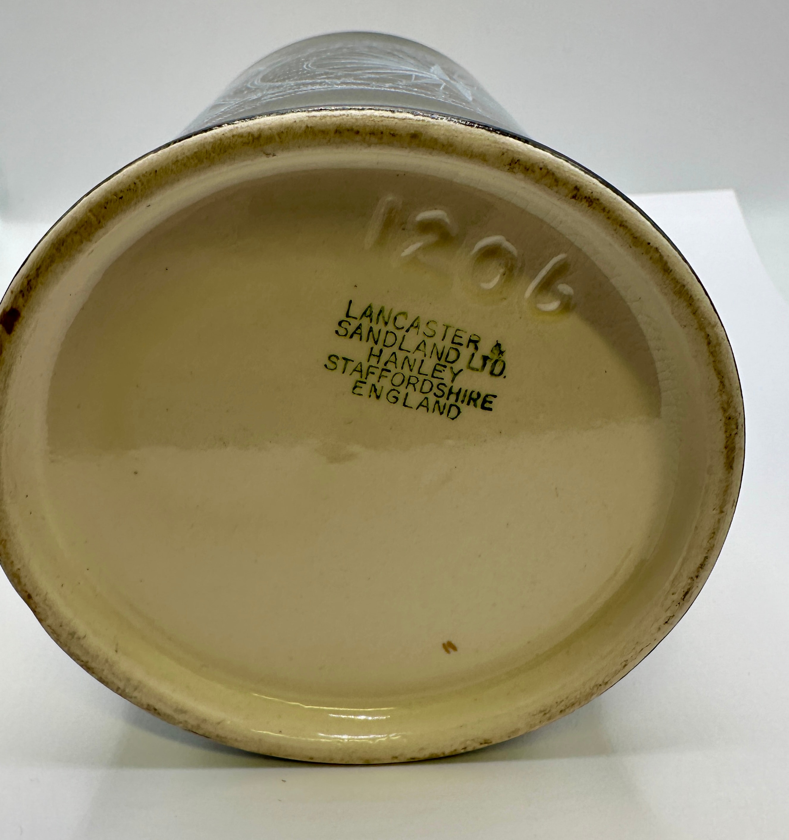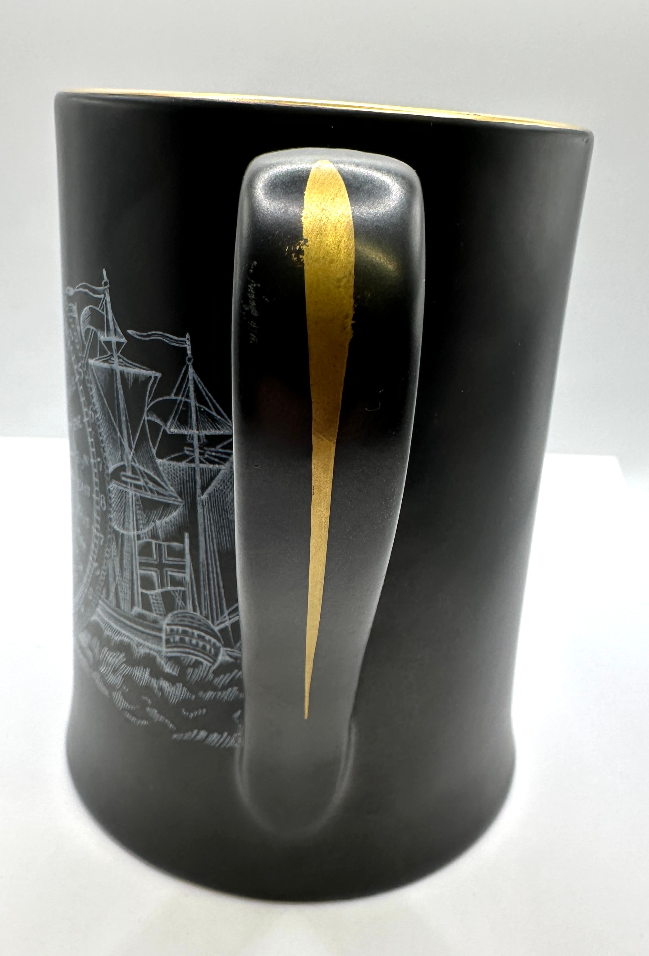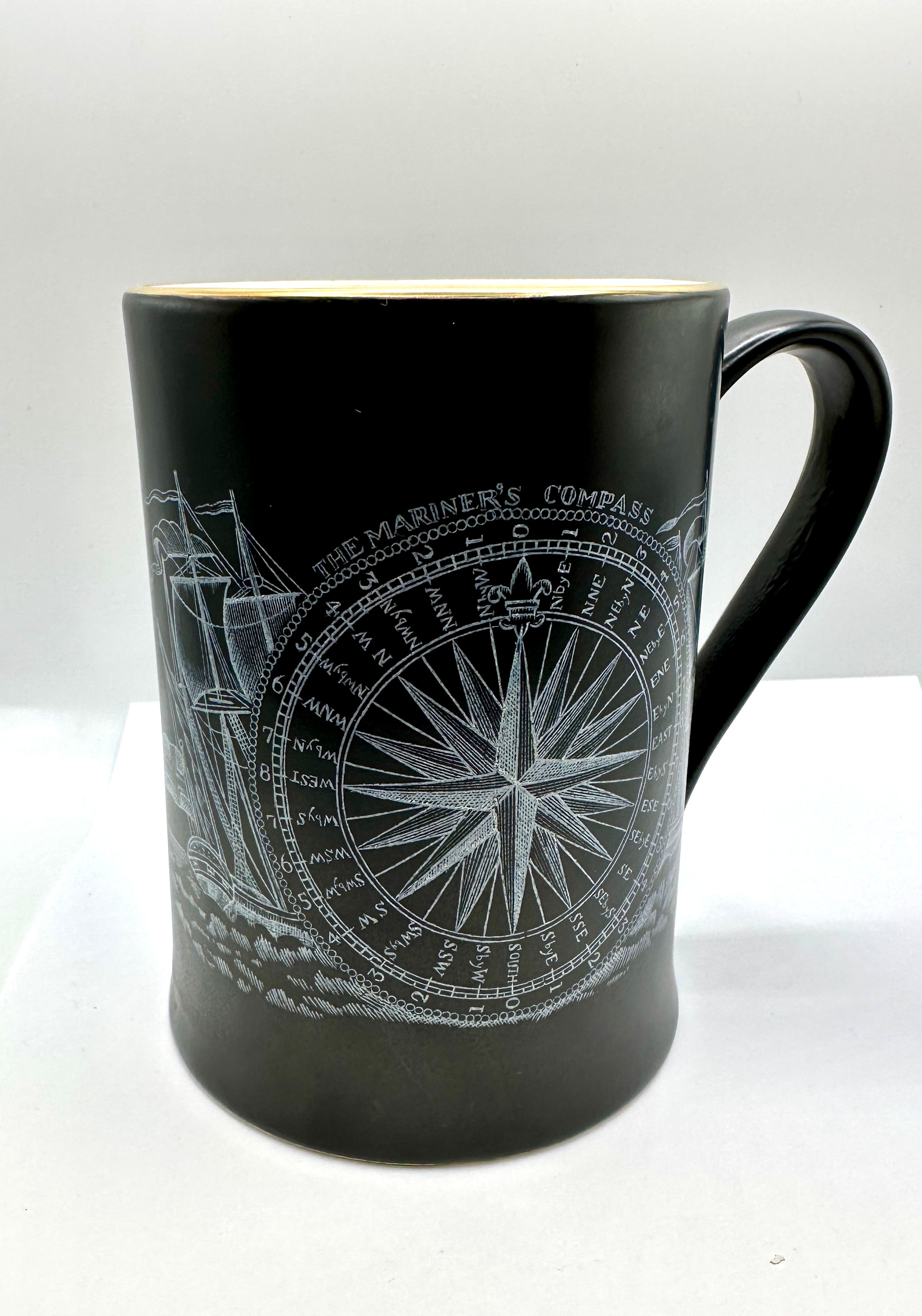 A ceramic mug by Lancaster & Sandland Ltd., Hanley, Staffordshire, England, in ‘The Mariner’s Compass’ pattern. This black ceramic mug or tankard features a white sgraffito-style design on its exterior, depicting “THE MARINER’S COMPASS,” a detailed compass rose with cardinal and intercardinal points, and a sailing ship. The interior is a contrasting lighter color. Both the rim and handle are accented with gold. A small boot graphic is present on the reverse side. The base is marked “1206” and “LANCASTER & SANDLAND LTD. HANLEY STAFFORDSHIRE ENGLAND.”