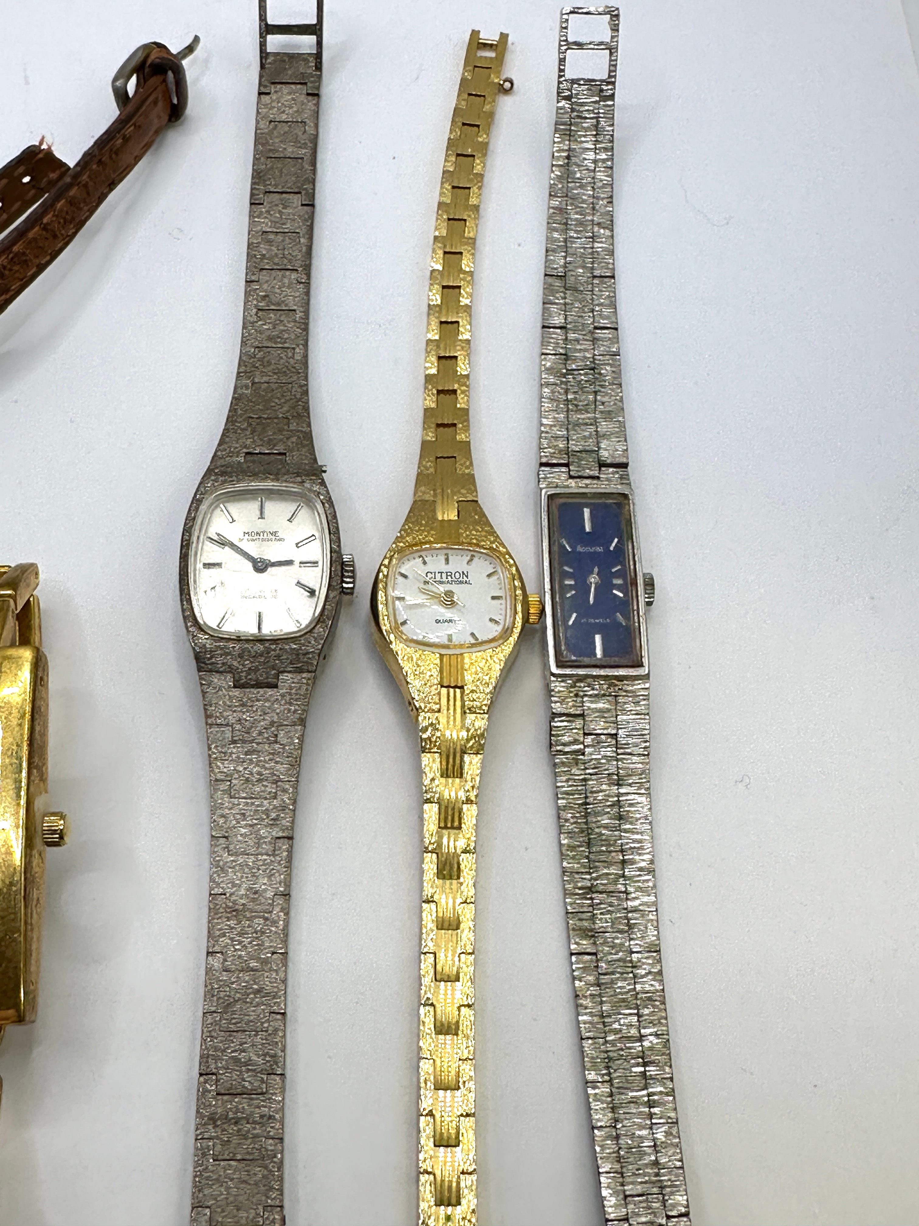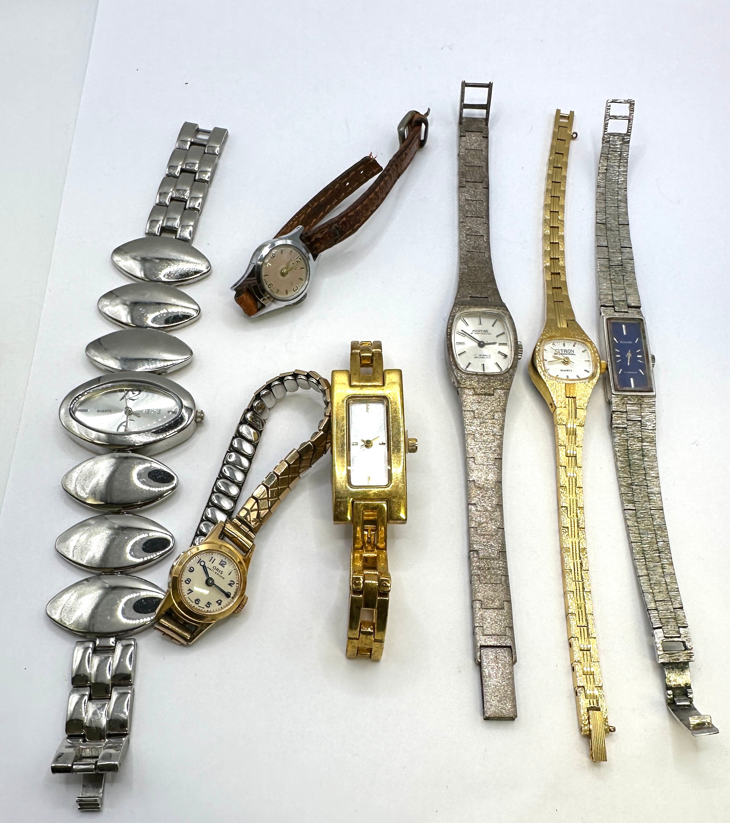 A group of seven diverse quartz wristwatches, predominantly from the late 20th to early 21st century. The collection includes watches with visible brand markings and dial text such as “IKEKE QUARTZ”, “FRONTLINE QUARTZ”, “CITRON QUARTZ”, “Accurist” (on two watches), and “Oris QUARTZ SWISS MADE”. Materials comprise silver-tone and gold-tone metal, with one watch featuring a brown leather strap. Styles vary, including a large silver-tone watch with prominent oval links, smaller rectangular and cushion-shaped cases with textured metal bracelets, and a small round watch.