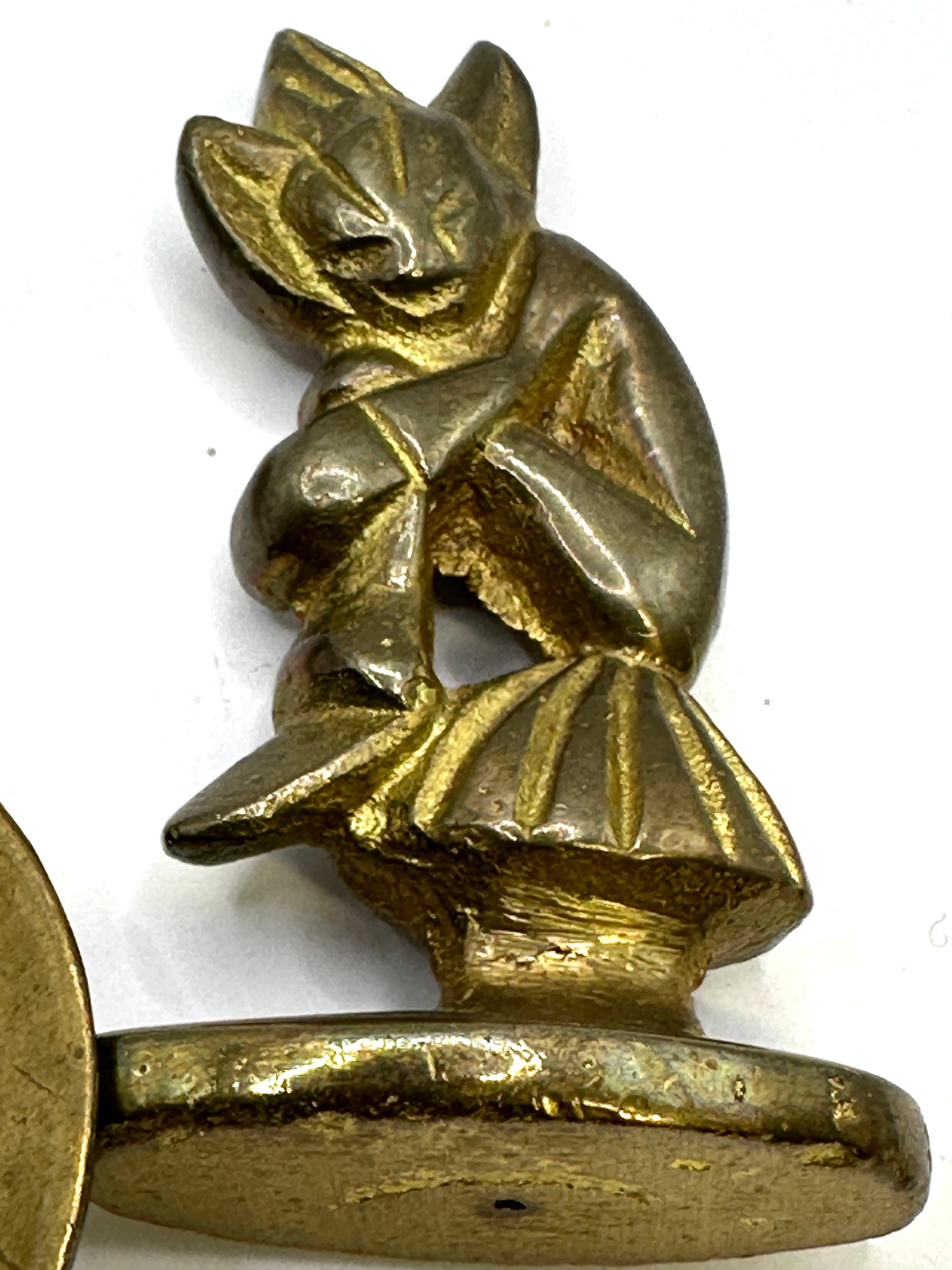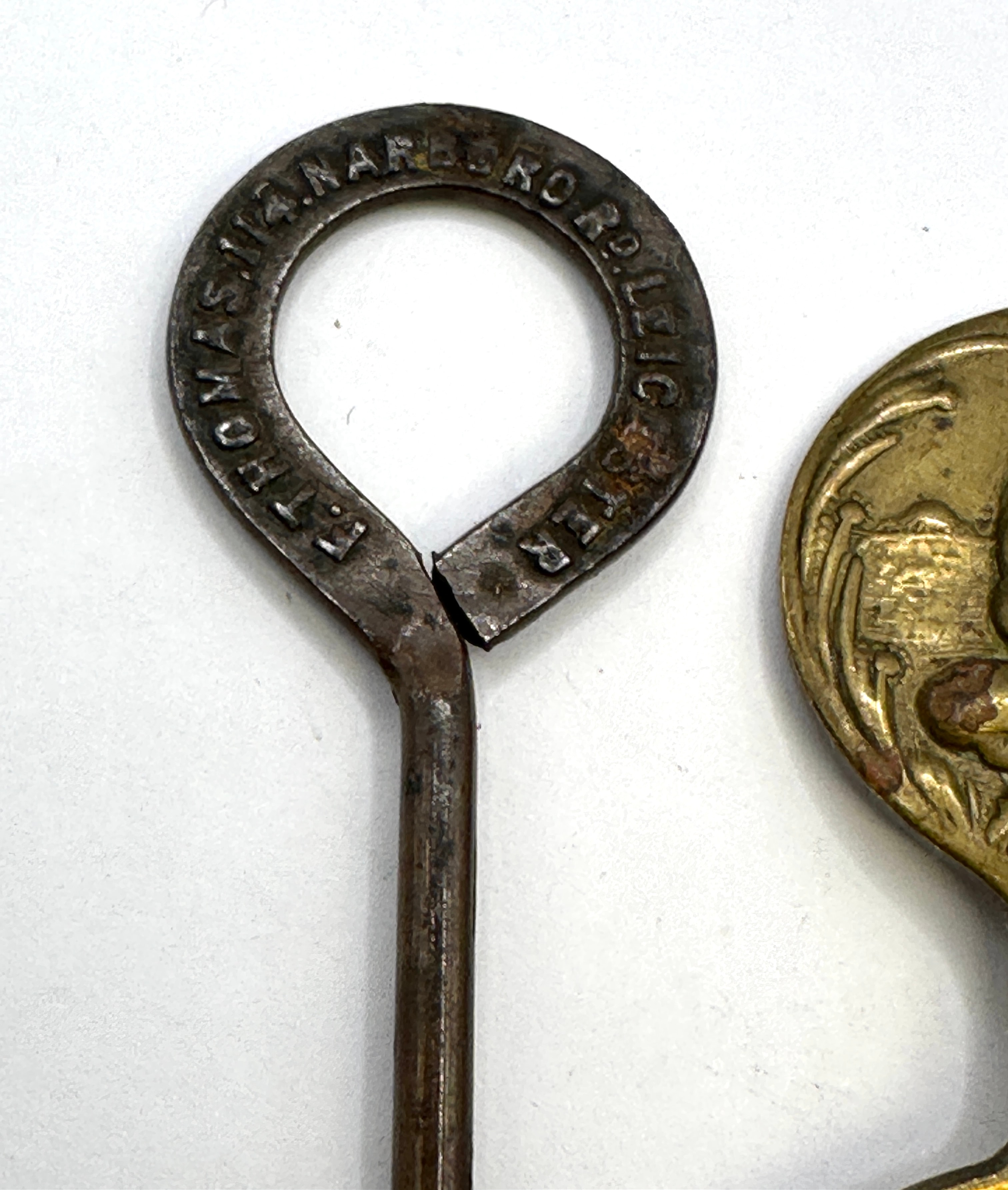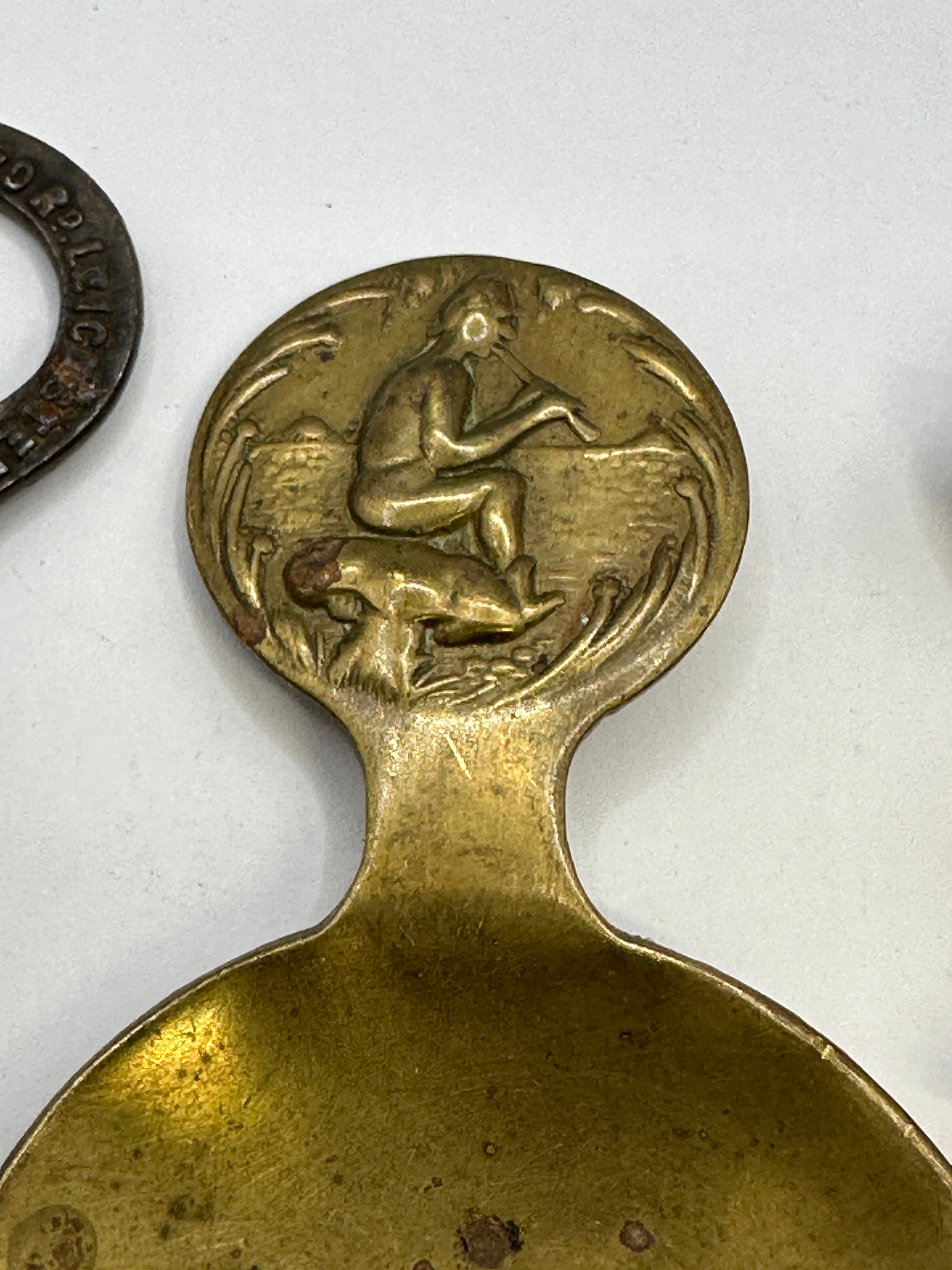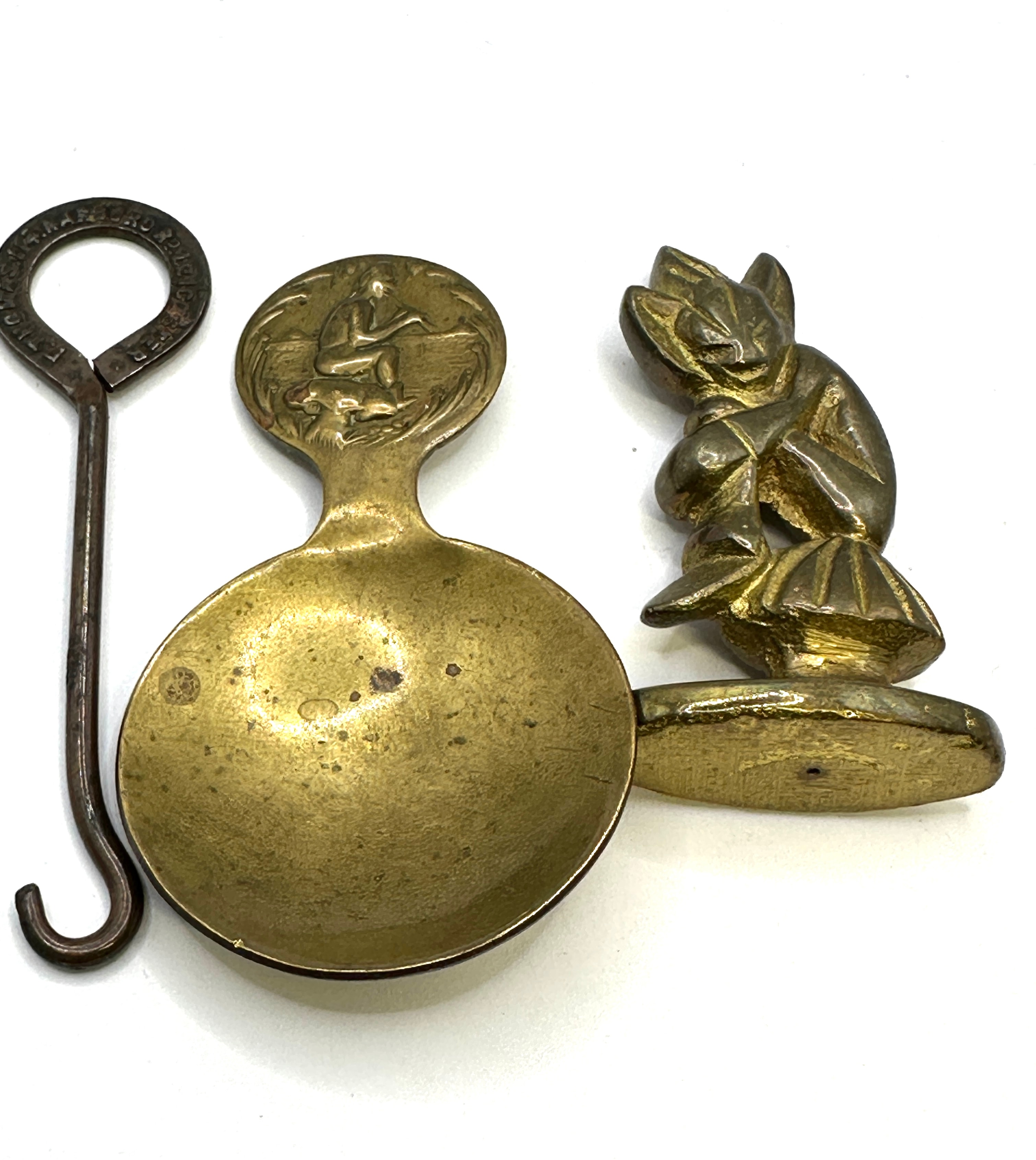 A group of three metallic items. The first is a brass or bronze figurine, identified through visual matches as a ‘Weba Ware Pixie on Toadstool’ or similar ‘Leprechaun’ figure. It depicts a stylized creature perched on a domed base. The second item is a small brass or bronze tea caddy spoon, featuring a circular handle decorated with a classical or pastoral scene of a seated figure playing a wind instrument with an animal. The third item is an iron or steel bottle opener/key, marked ‘F. THOMAS, 12 ANNA RD, LEICESTER’. All items exhibit an aged patina and wear consistent with their apparent age and use.