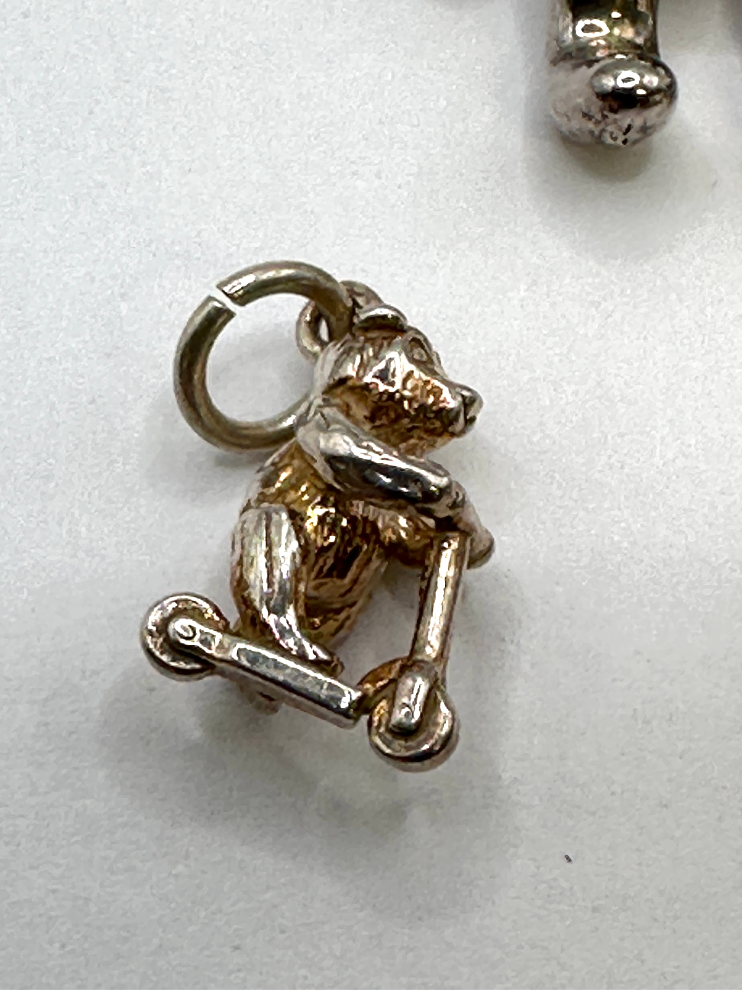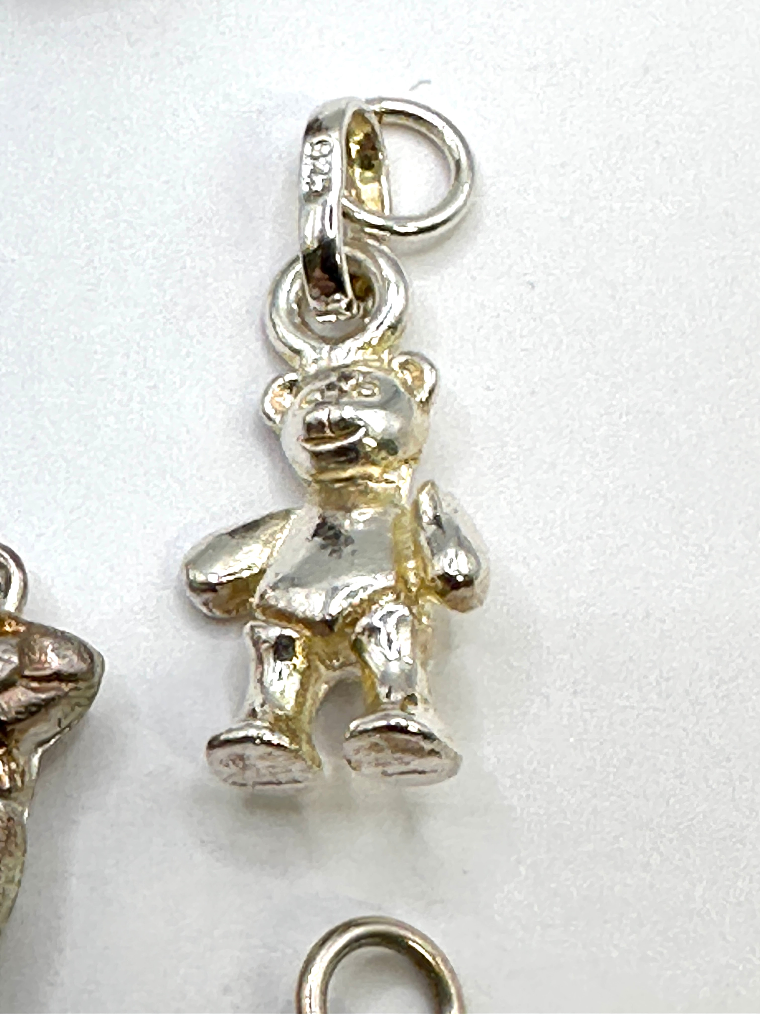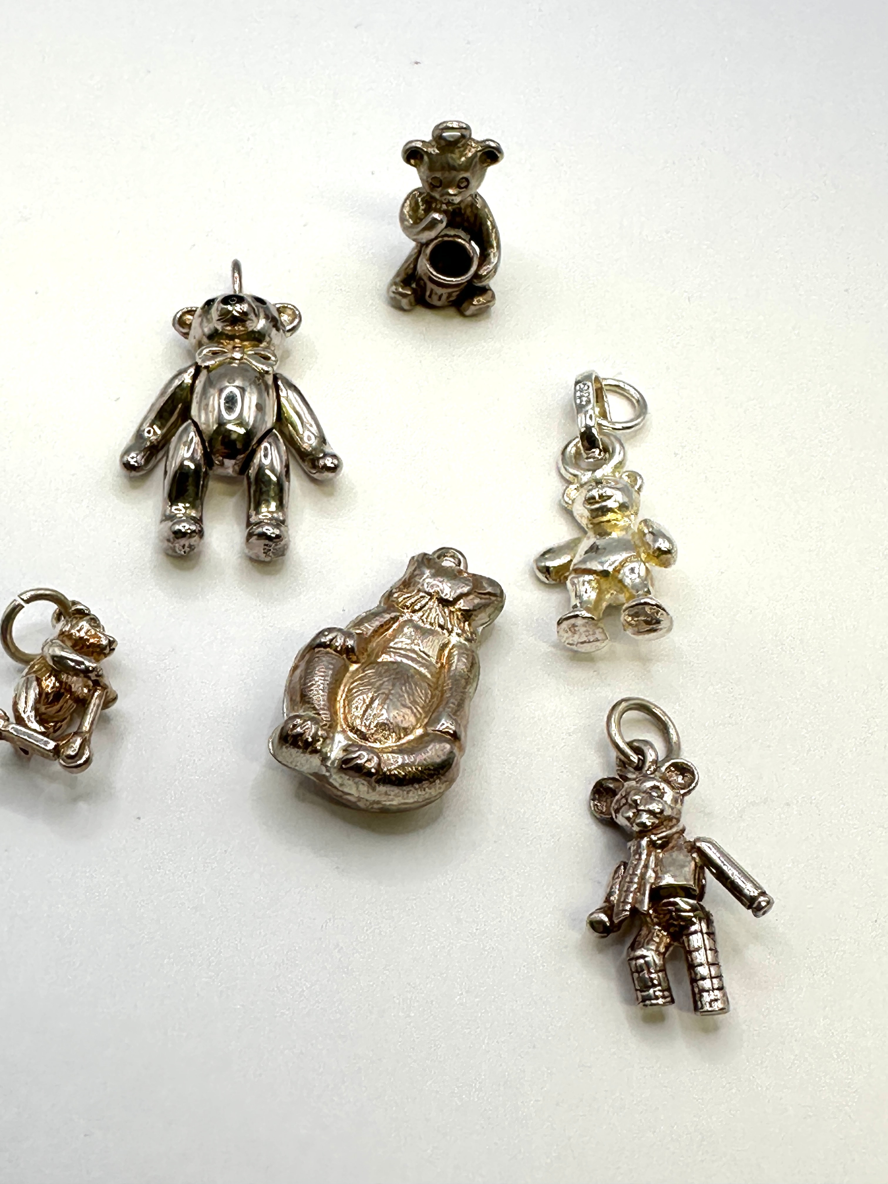 A collection of six sterling silver charms, each designed as a teddy bear or bear-like figure, attributed to RM Trush Cazenovia Abroad. The individual charms display varied poses and designs, including a bear on a scooter, a standing bear wearing a scarf and textured trousers, a larger standing bear with a prominent bow tie, a simpler standing bear, a seated bear, and another standing bear with a central aperture. Visible markings on the bails of at least two charms clearly indicate “925,” confirming the material as sterling silver.