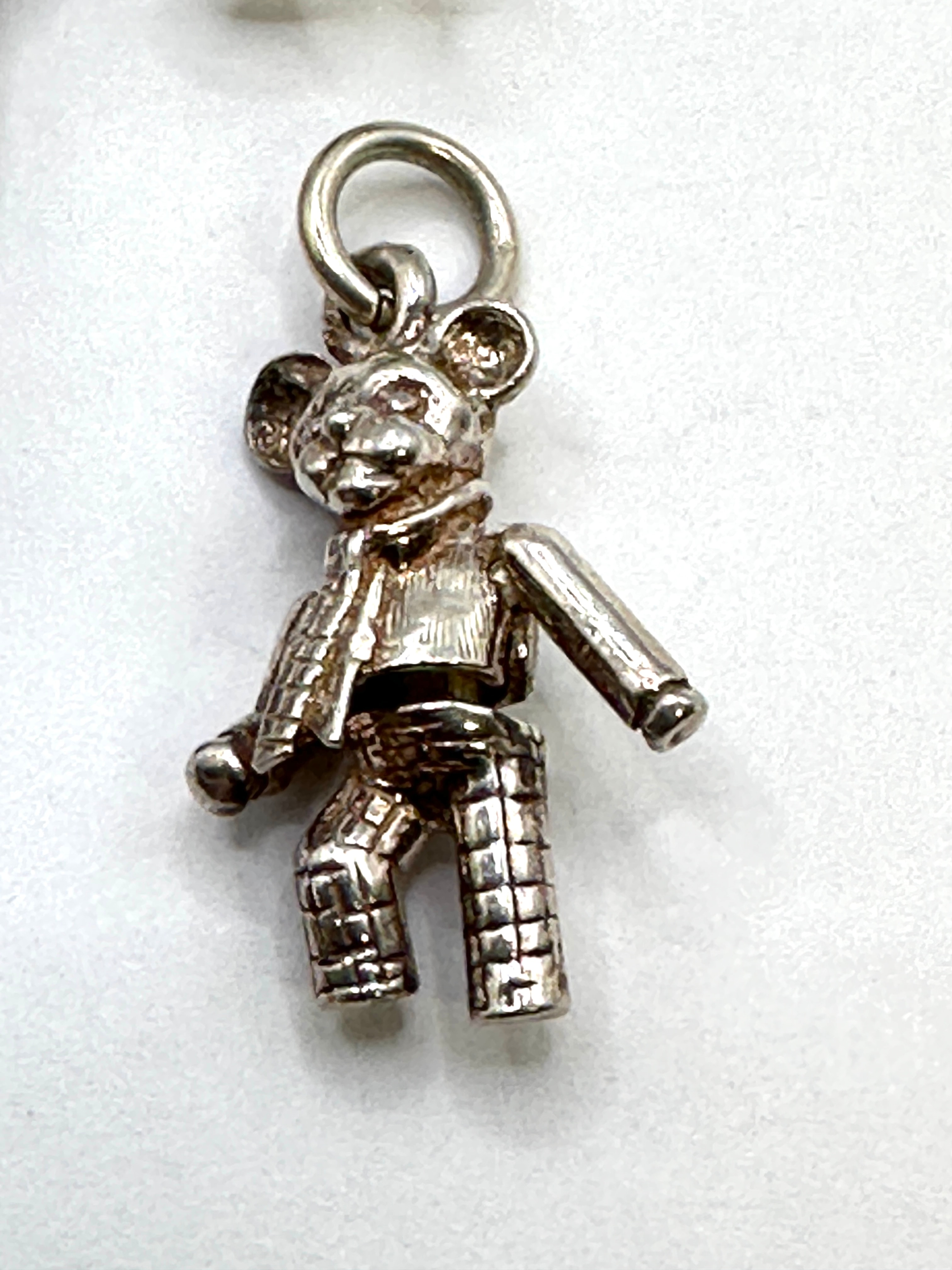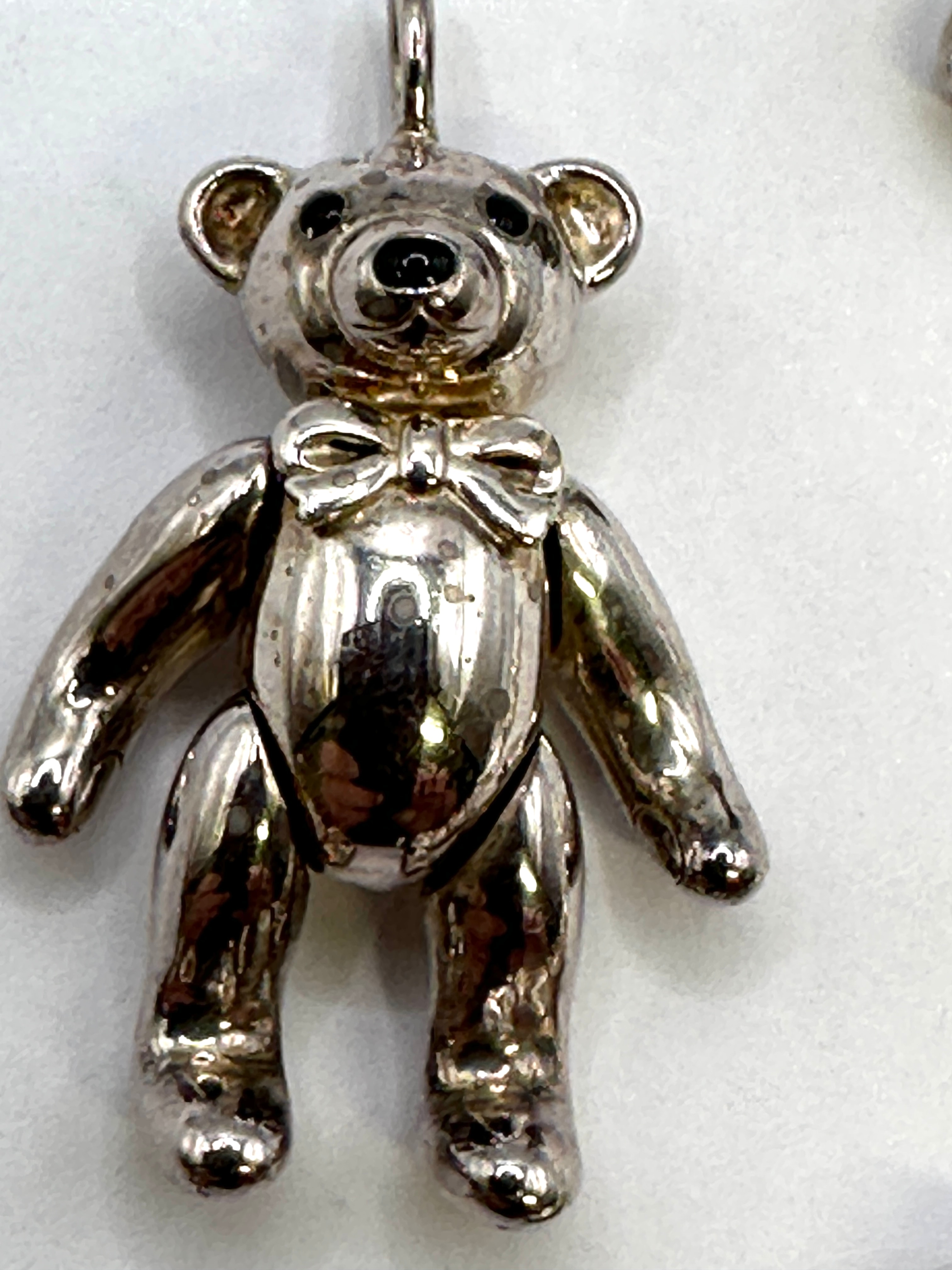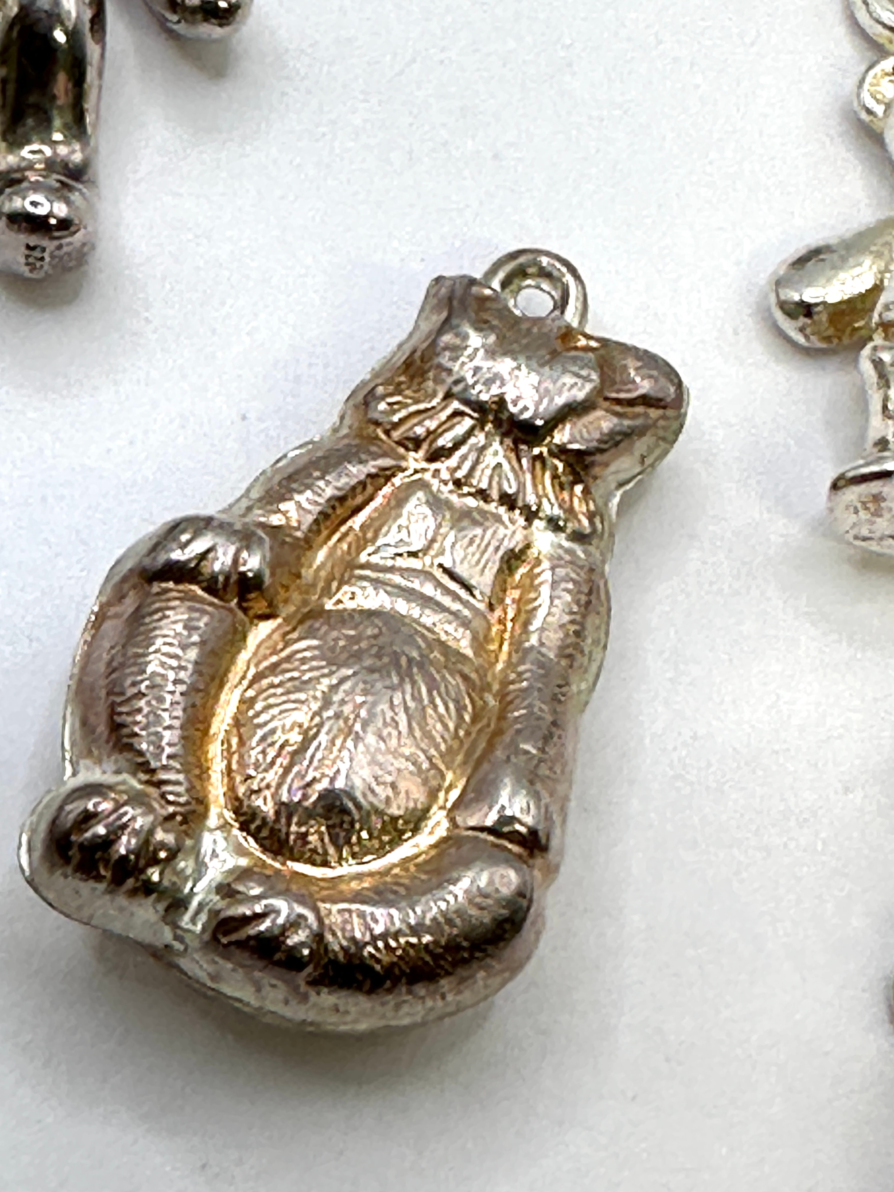 A collection of six sterling silver charms, each designed as a teddy bear or bear-like figure, attributed to RM Trush Cazenovia Abroad. The individual charms display varied poses and designs, including a bear on a scooter, a standing bear wearing a scarf and textured trousers, a larger standing bear with a prominent bow tie, a simpler standing bear, a seated bear, and another standing bear with a central aperture. Visible markings on the bails of at least two charms clearly indicate “925,” confirming the material as sterling silver.