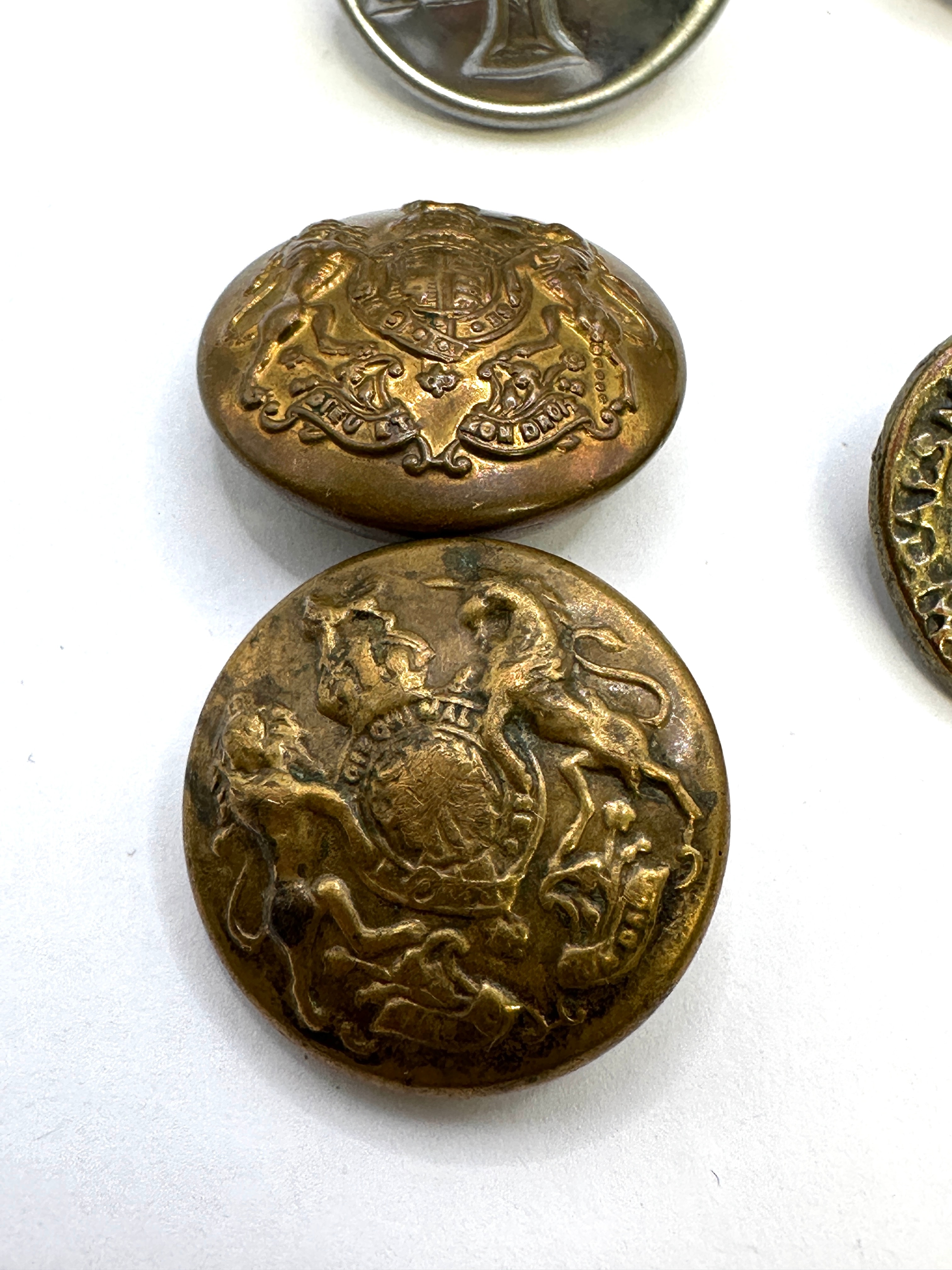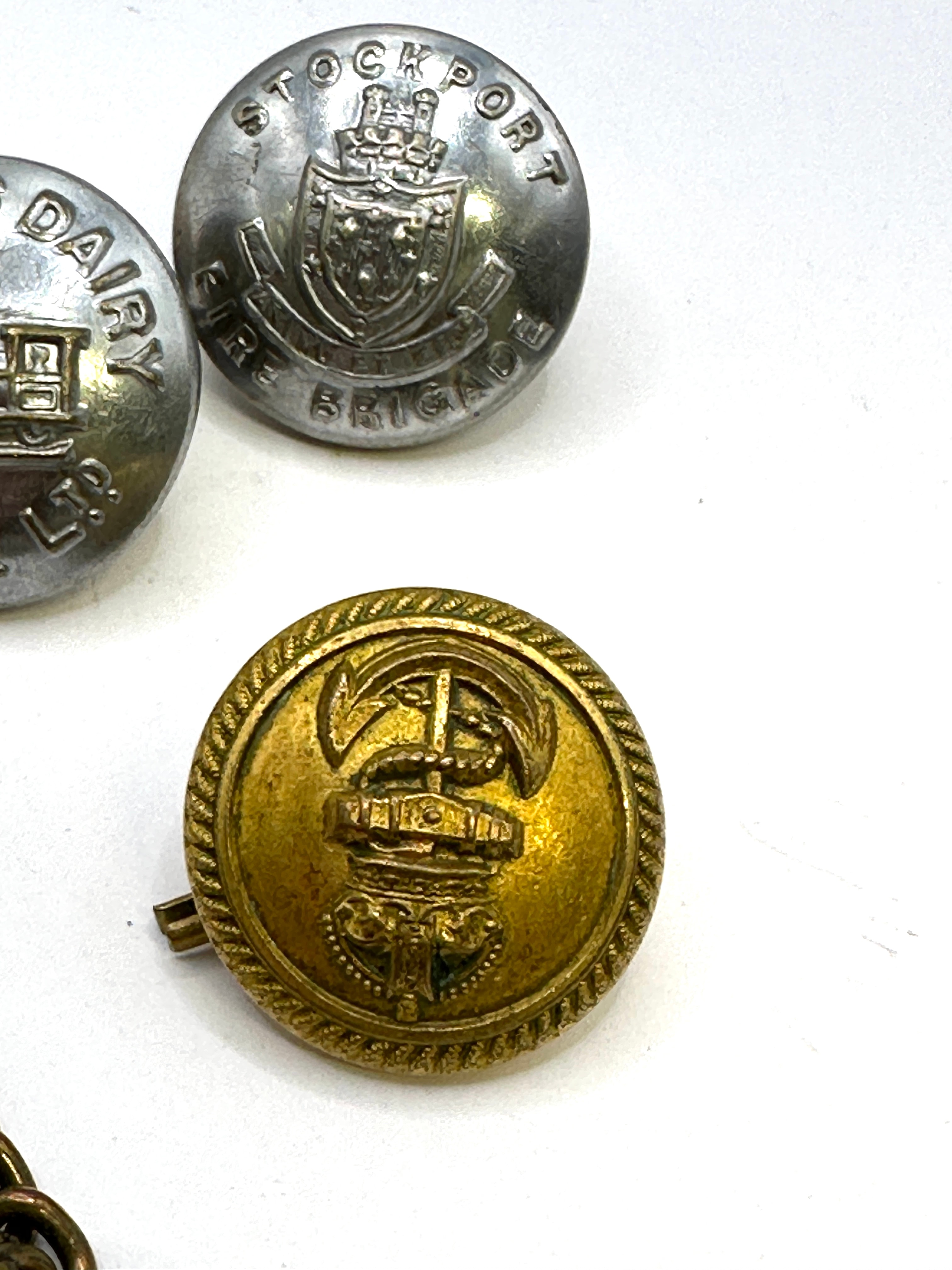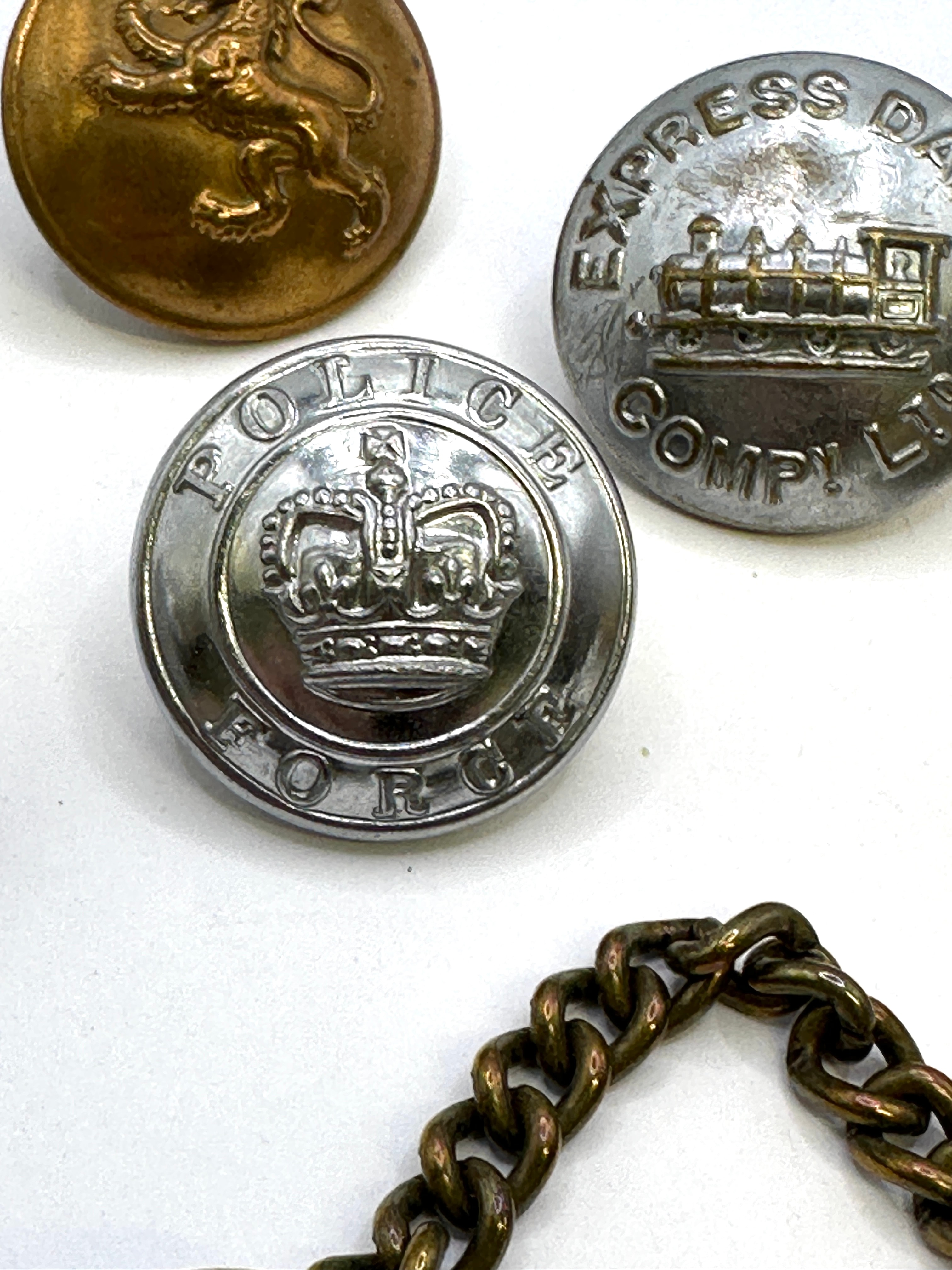 This collection comprises ten metallic objects: eight uniform buttons and one brass-toned linked double medallion. The linked double medallion is identified through web intelligence as a Roman coin motif cape brooch. It features profiles reminiscent of Roman emperors on each disc, with partially legible Latin text, possibly including ‘CAESAR AUGUSTUS’ and phrases like ‘SENATVS POPVLVSQVE ROMANVS’. The medallion is made of brass-toned metal and connected by a chain. The accompanying eight uniform buttons vary in material, featuring both silver-toned and brass-toned metals. Visible markings on the silver-toned buttons include ‘AFS,’ ‘POLICE FORCE,’ ‘EXPRESS DAIRY COMPY LTD’ with a train emblem, and ‘STOCKPORT FIRE BRIGADE’ with a crest. The brass-toned buttons display various emblems, including a lion rampant and two examples of the British Royal Coat of Arms, incorporating the French mottoes ‘DIEU ET MON DROIT’ and ‘HONI SOIT QUI MAL Y PENSE’.