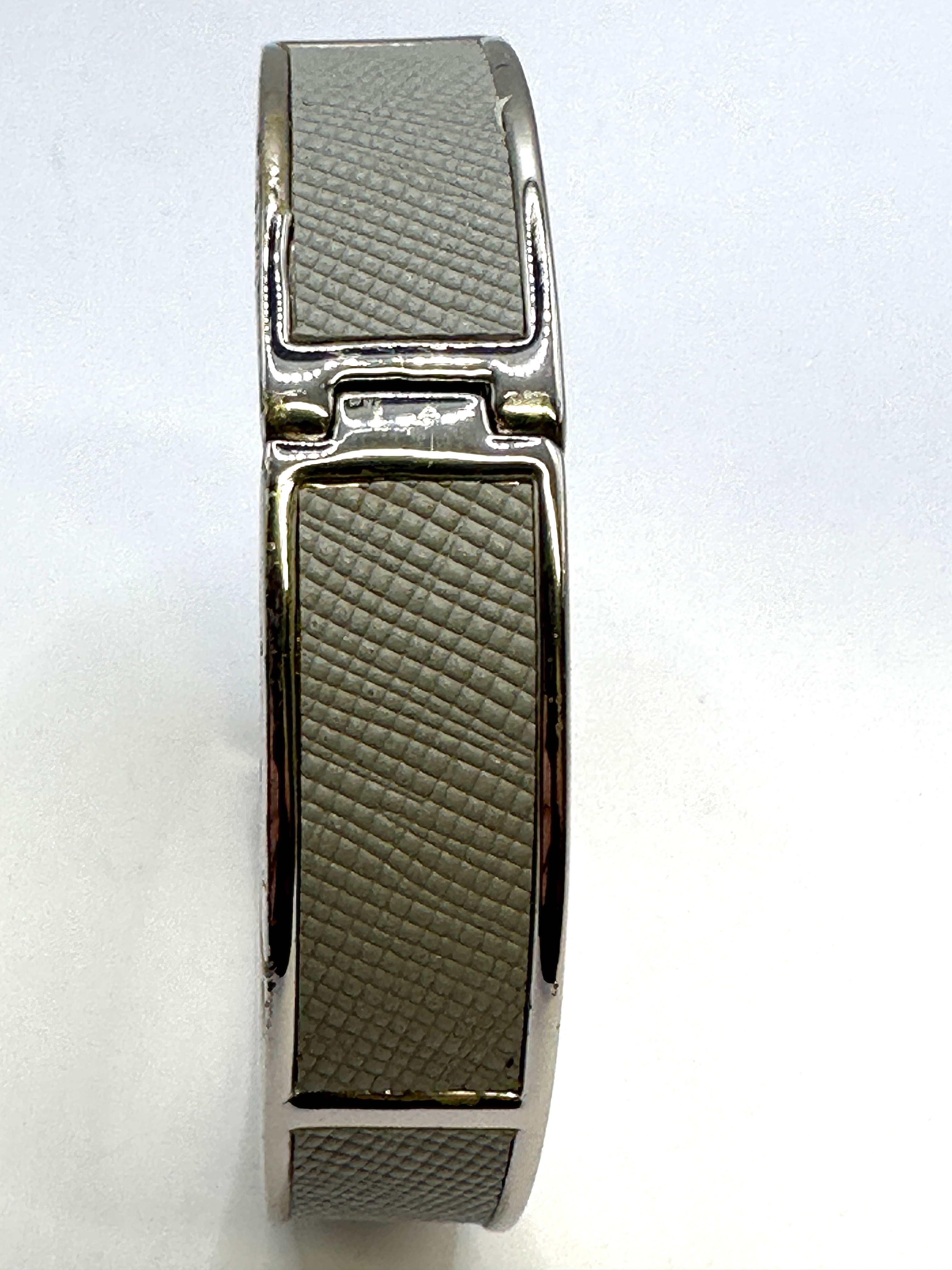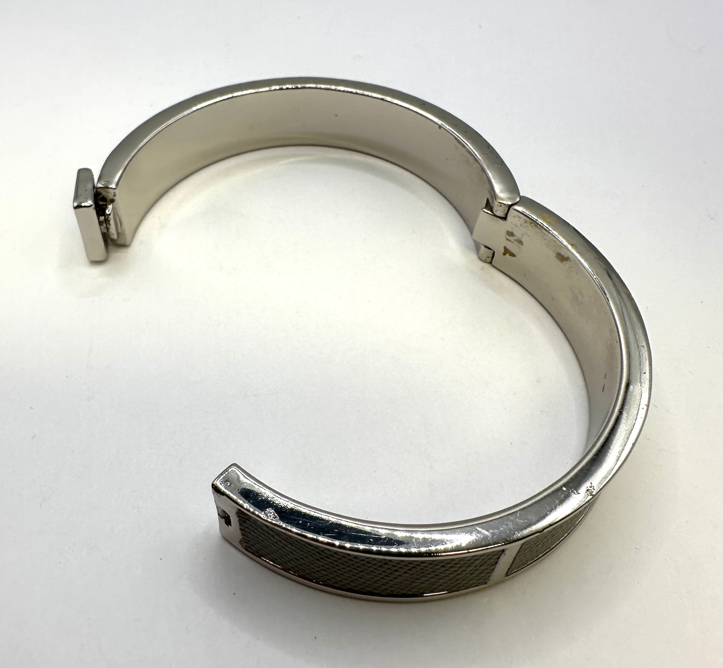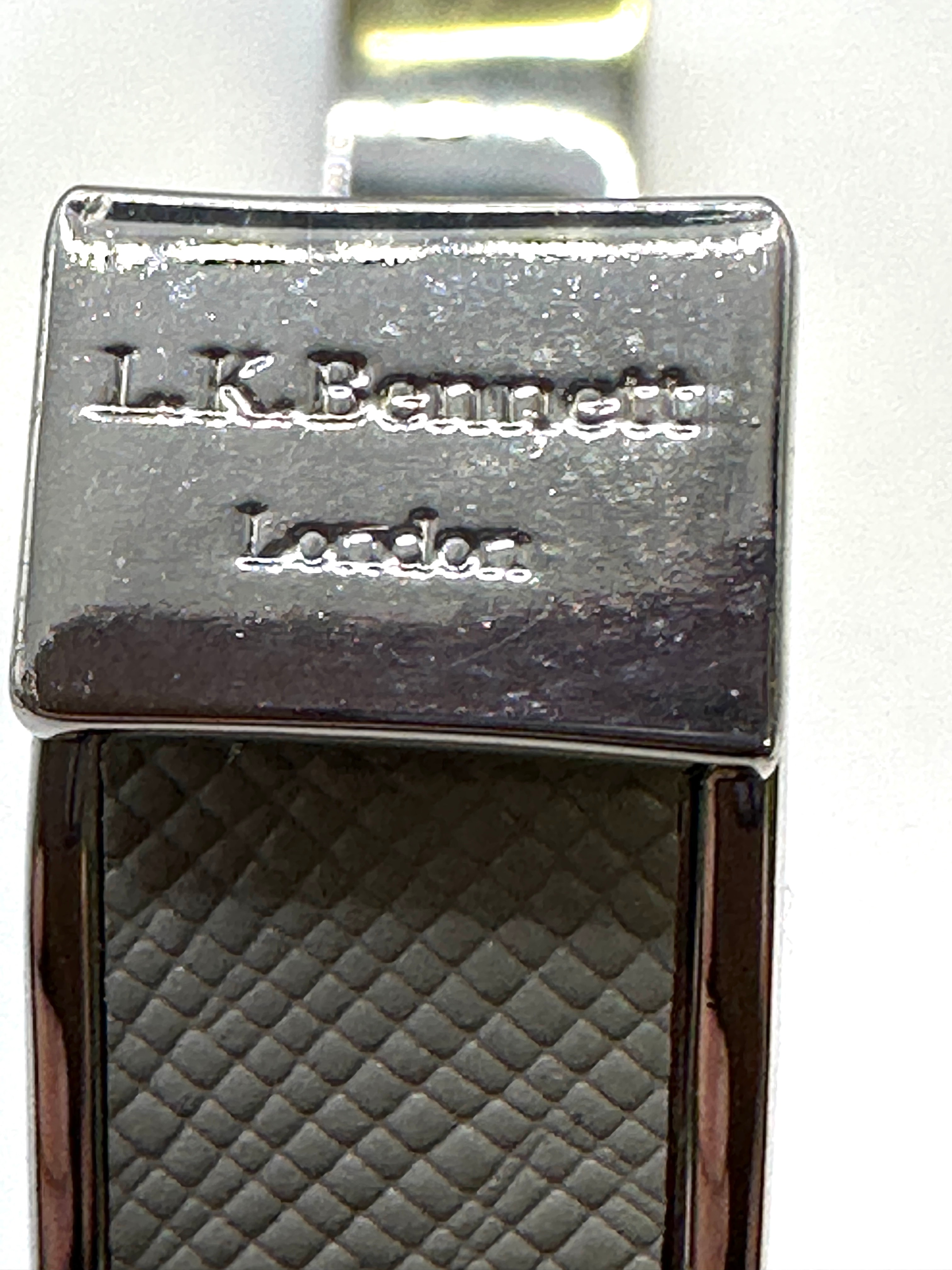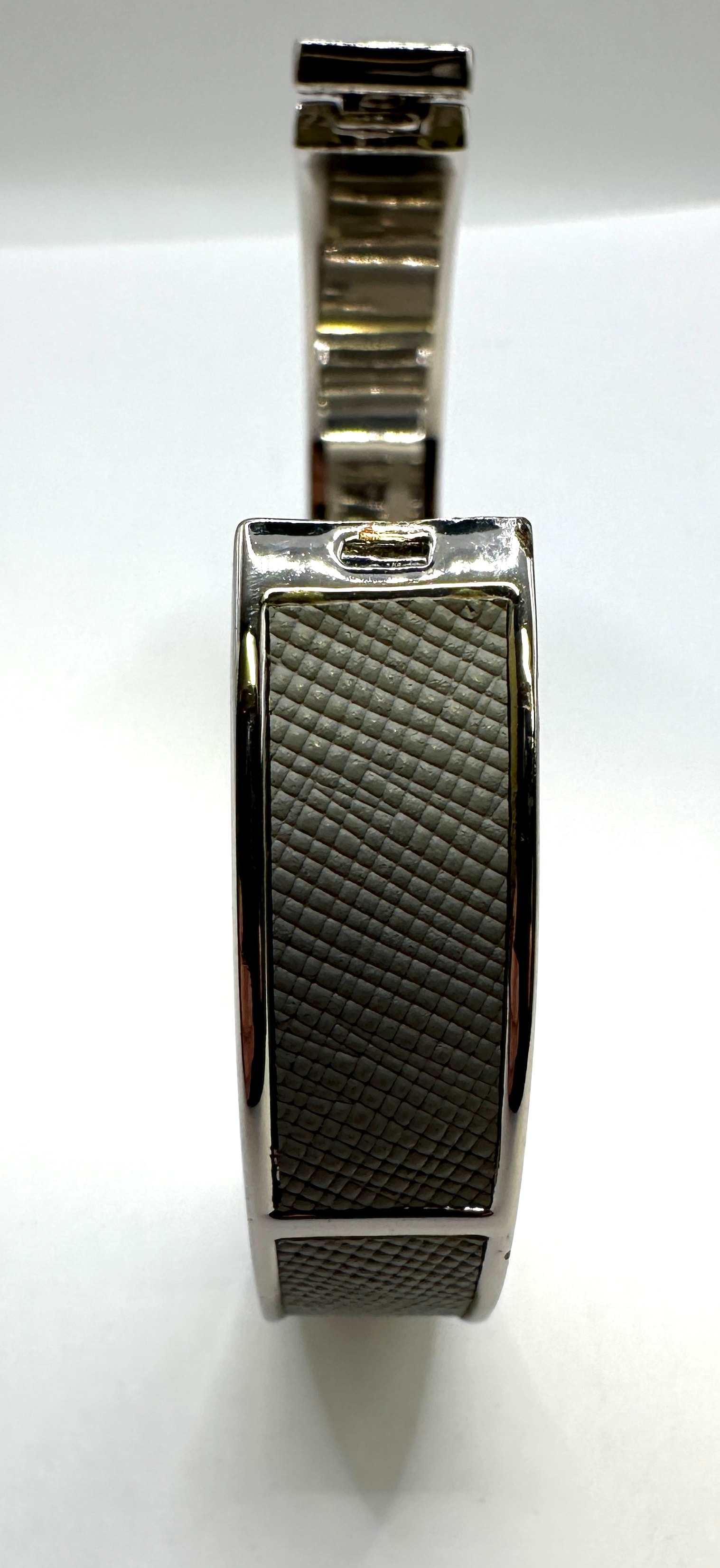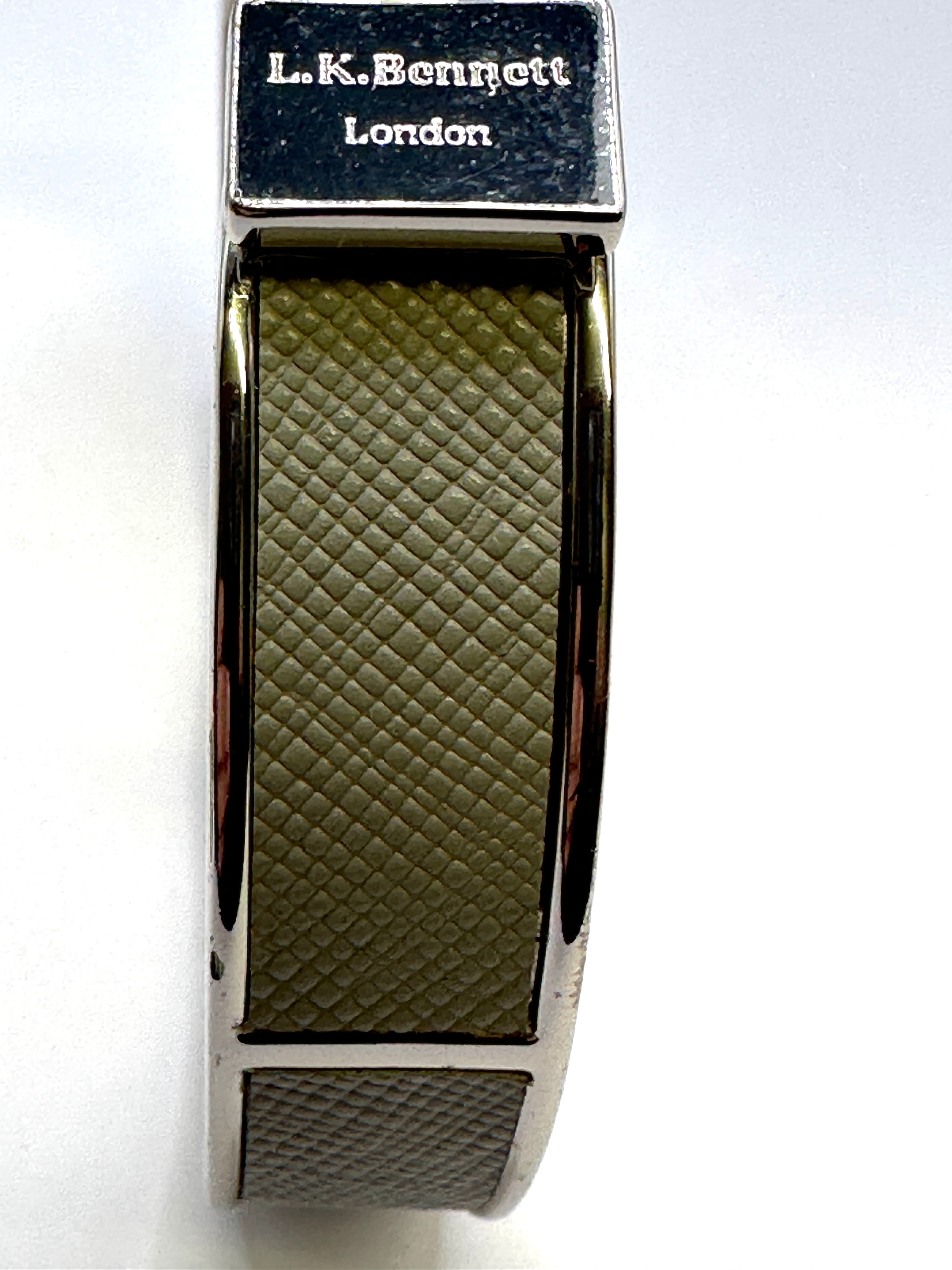A contemporary bangle bracelet by L.K.Bennett London. Constructed from silver-tone metal, this hinged bracelet features a push-button clasp. It is adorned with multiple inset panels of a textured, greyish-green material, likely faux leather, exhibiting a fine crosshatch pattern. The clasp mechanism is engraved ‘L.K.Bennett London’.