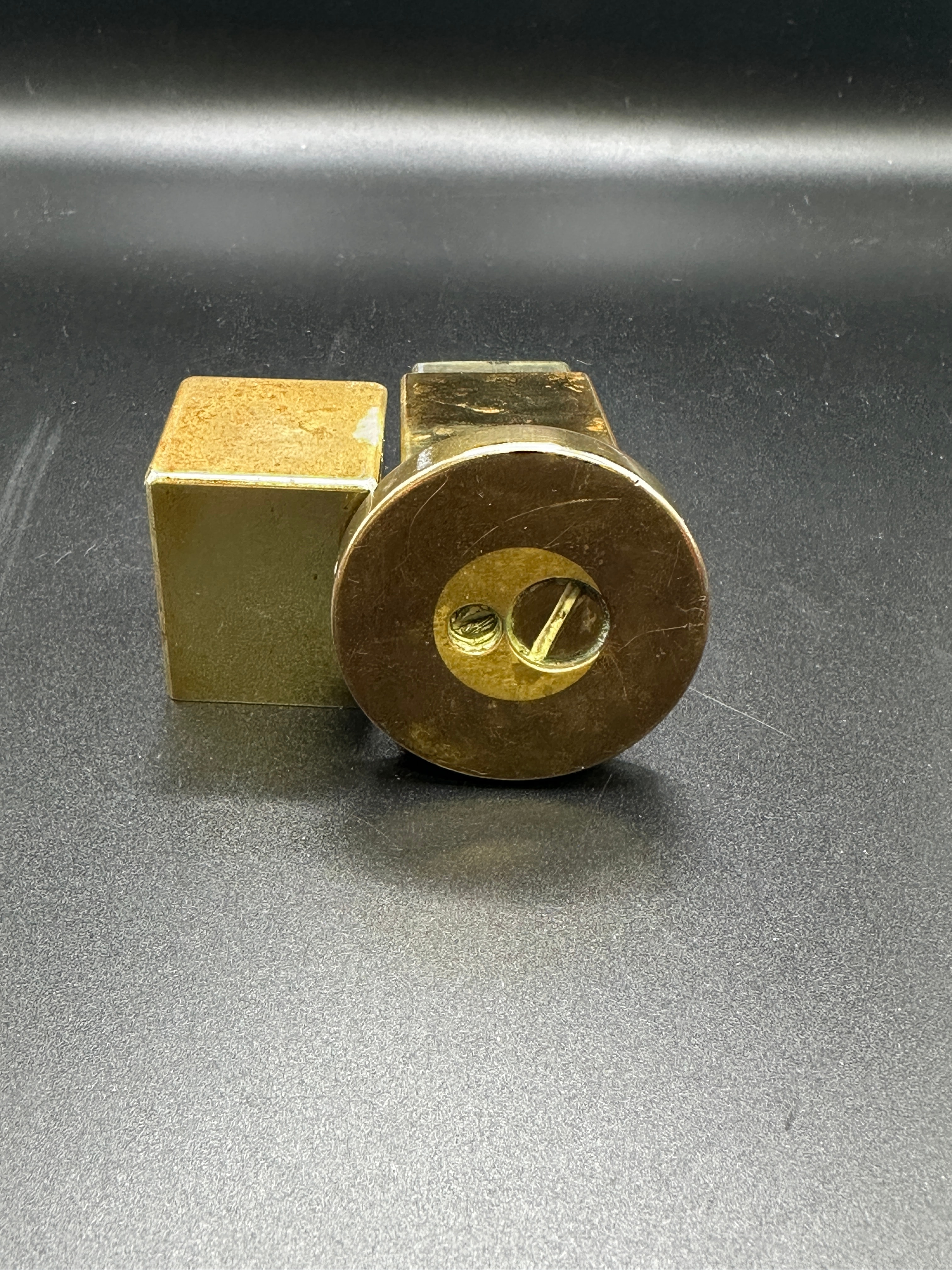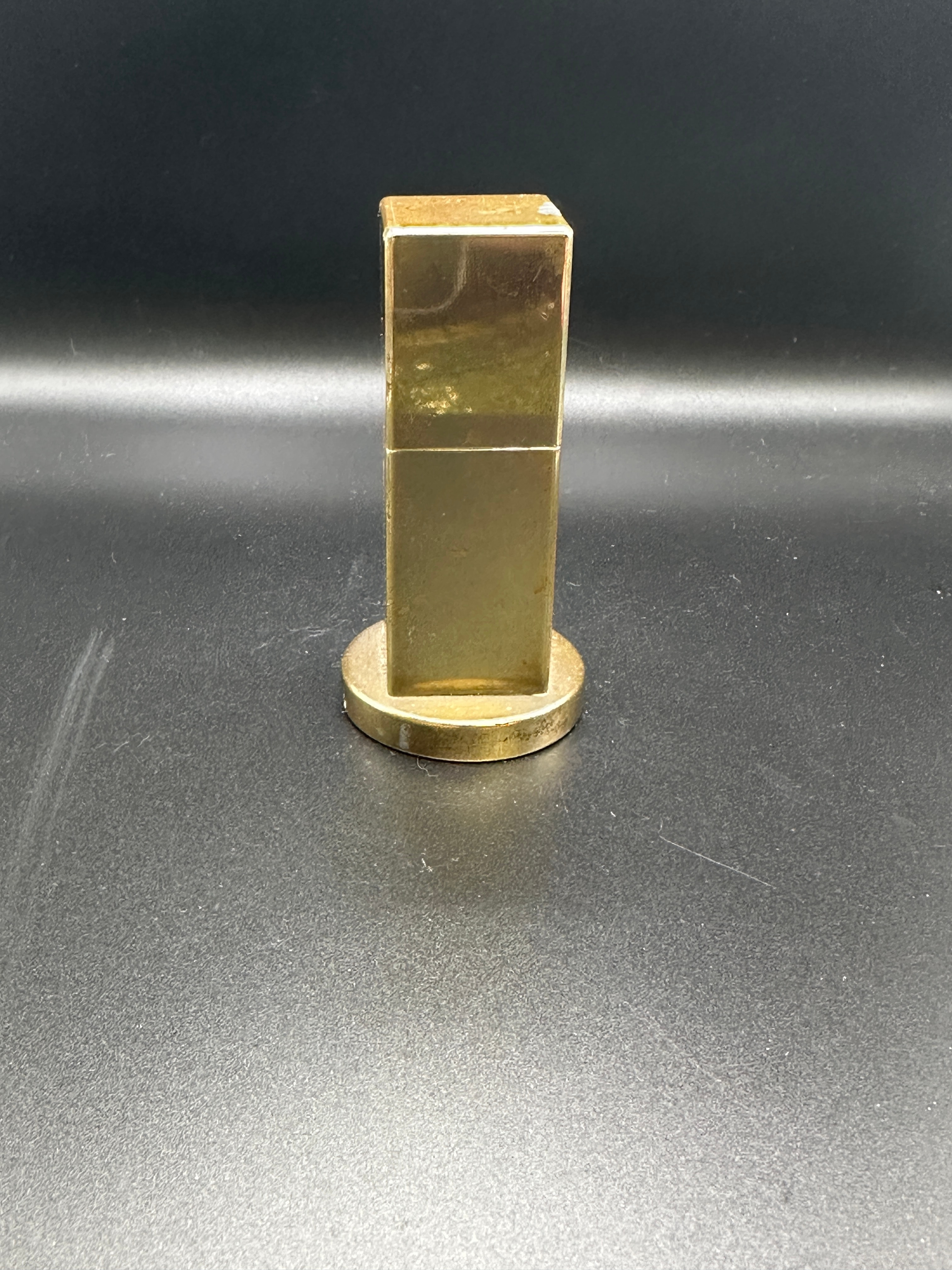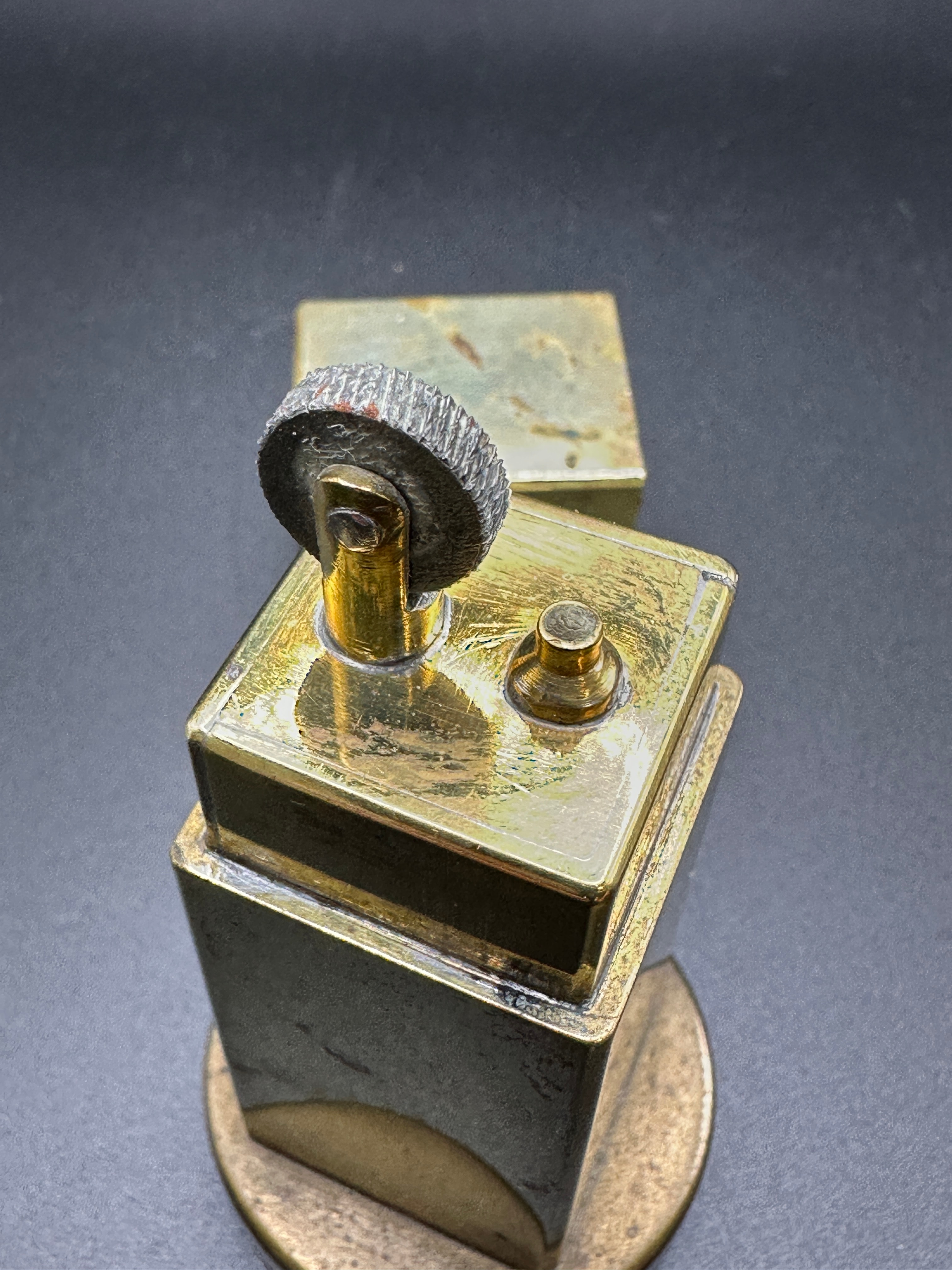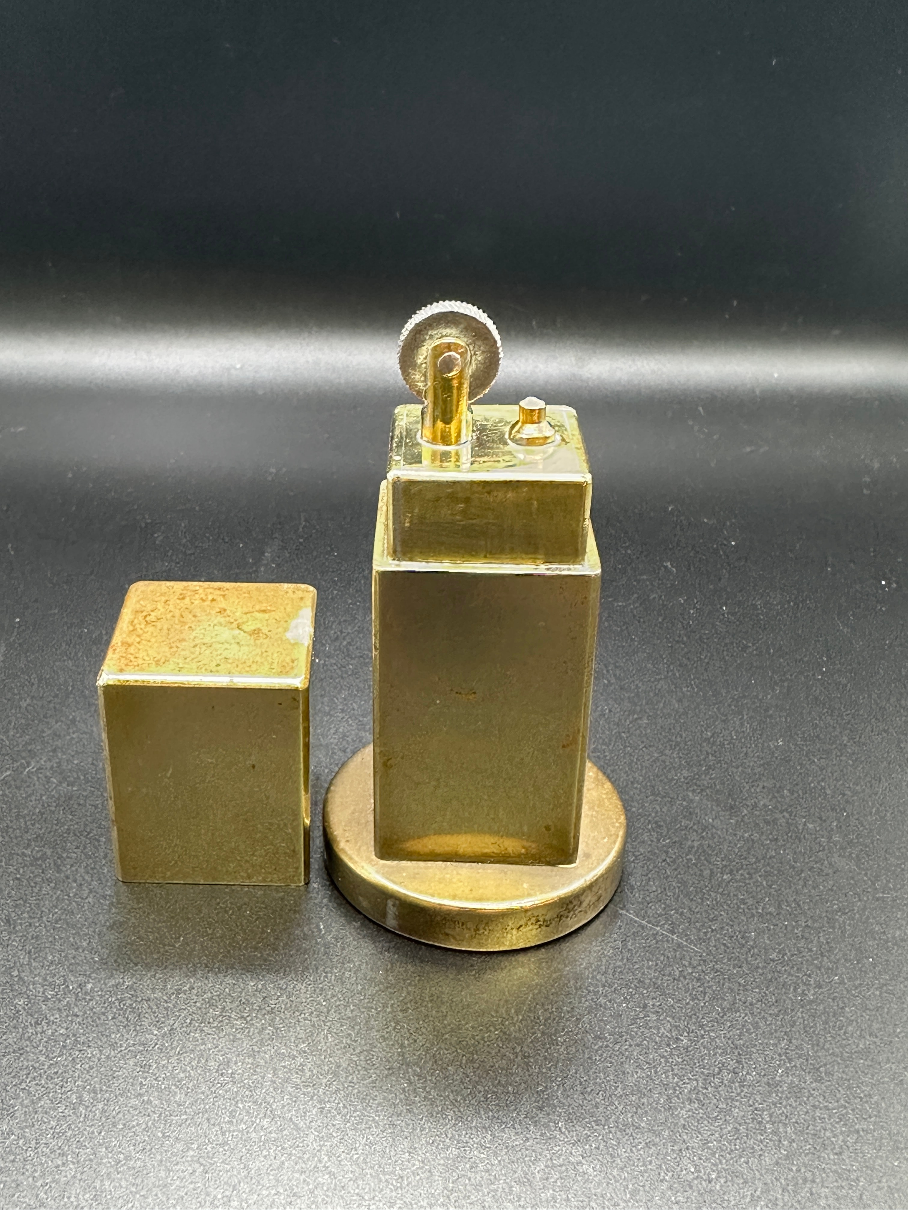 A vintage brass It features a minimalist design with a rectangular body standing on a circular base, accompanied by a separate, plain rectangular cap. When uncapped, the lighter mechanism is visible, comprising a ridged flint wheel and a fuel cap or button on its top surface. No discernible text or manufacturer markings are visible on any of the exposed surfaces.