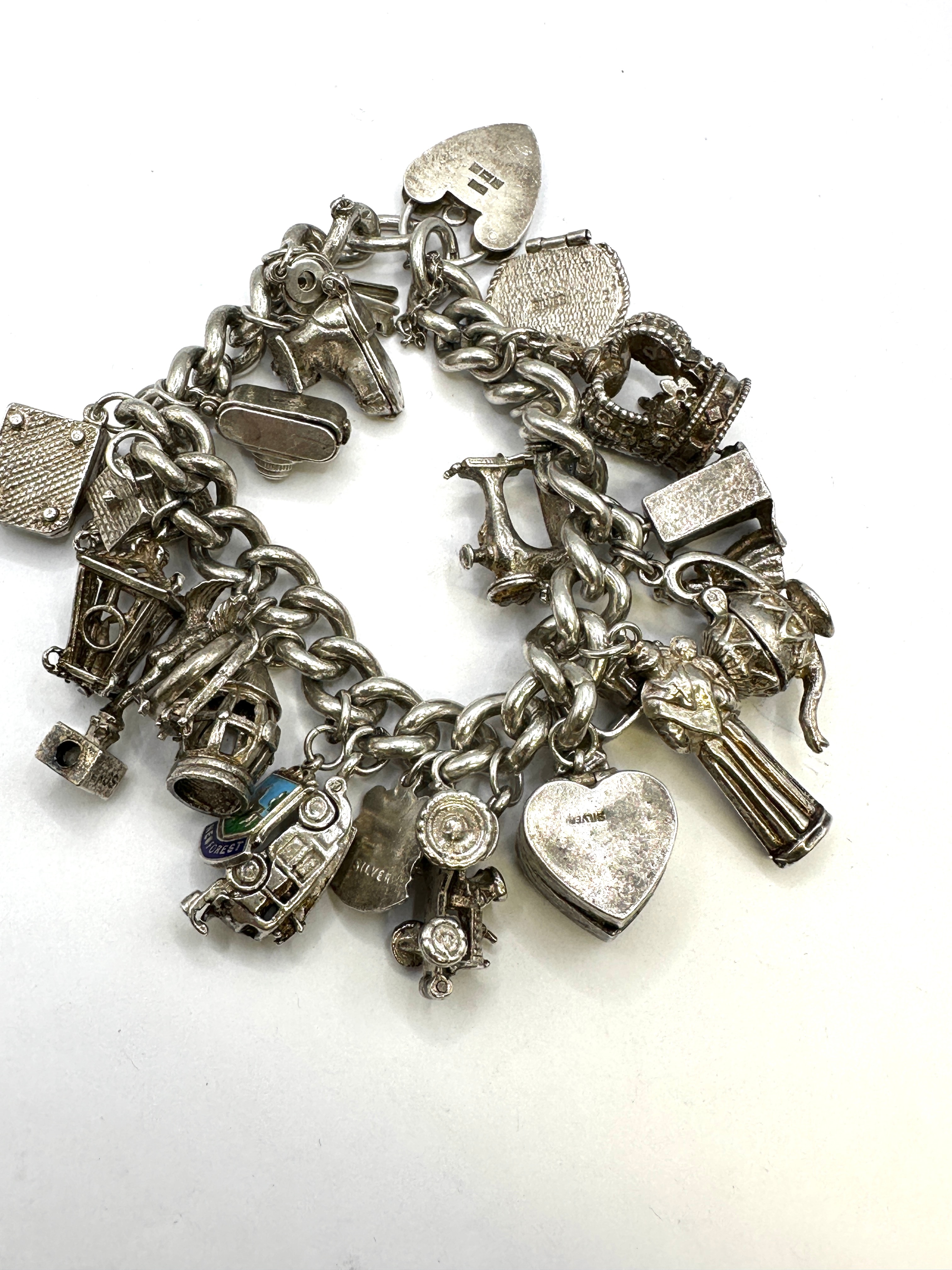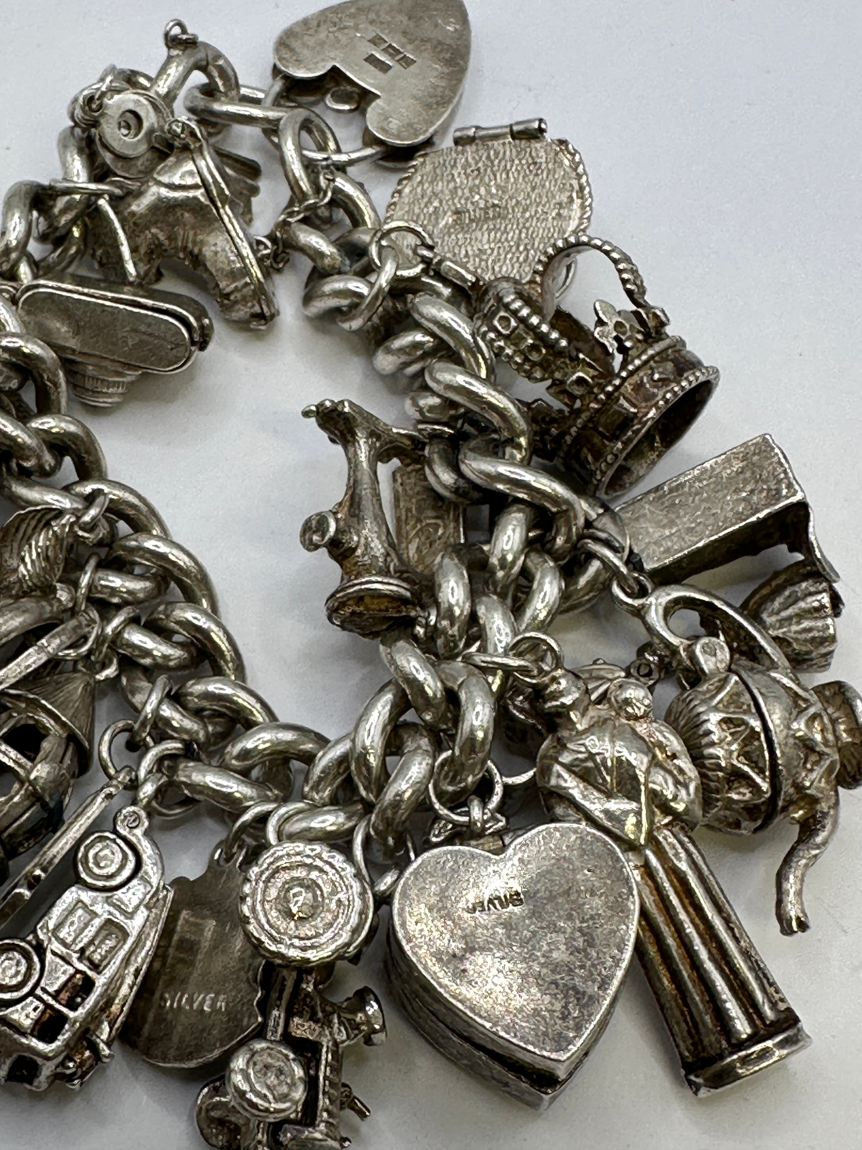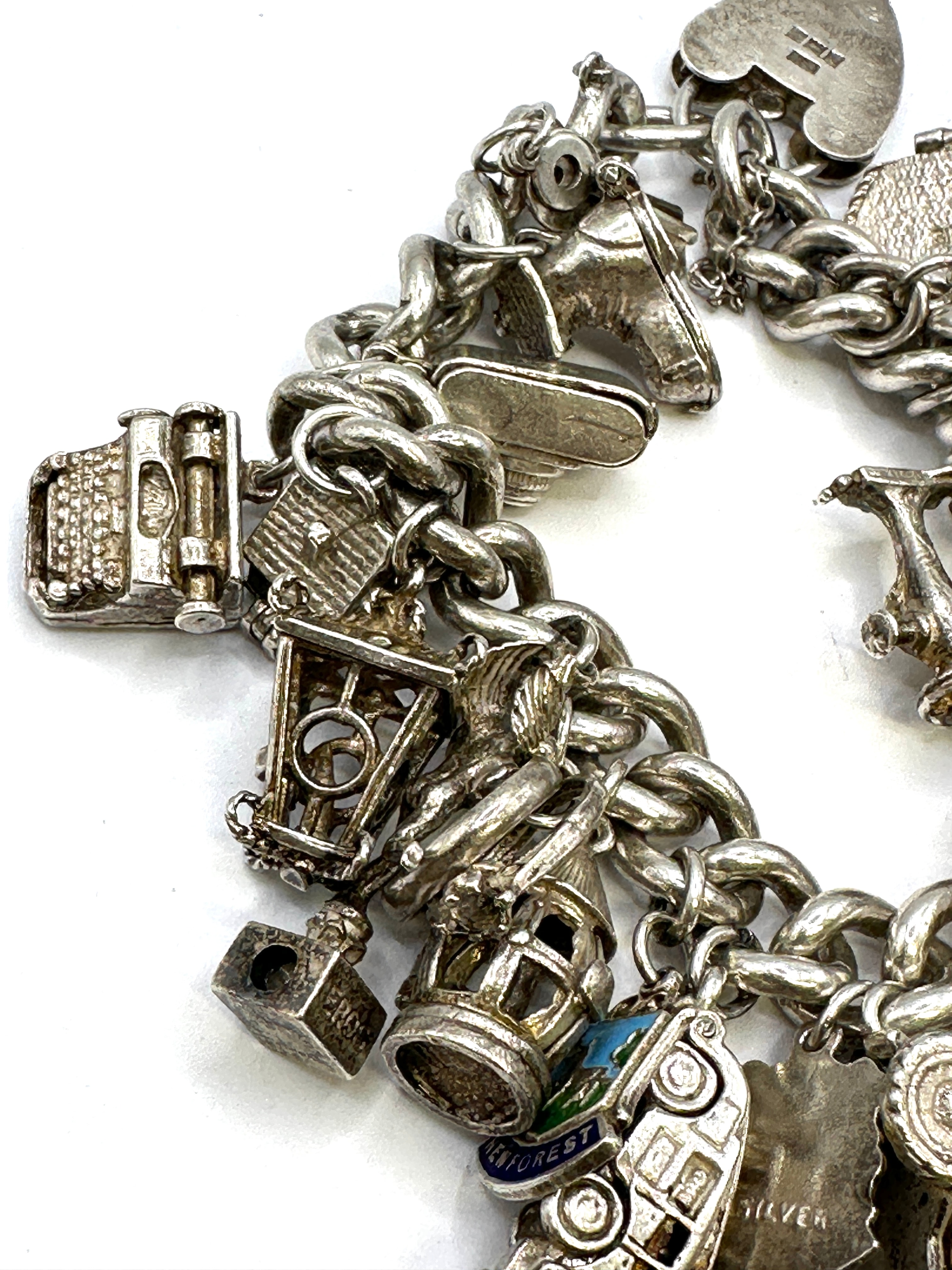 A vintage sterling silver charm bracelet, composed of a heavy curb link chain densely adorned with an eclectic collection of figural and commemorative charms. Several charms are marked ‘SILVER’, a heart-shaped locket is engraved ‘MUM’, and an enameled shield-style charm features a partial ‘FOREST’ inscription. The bracelet is consistent with a mid-20th century vintage period.