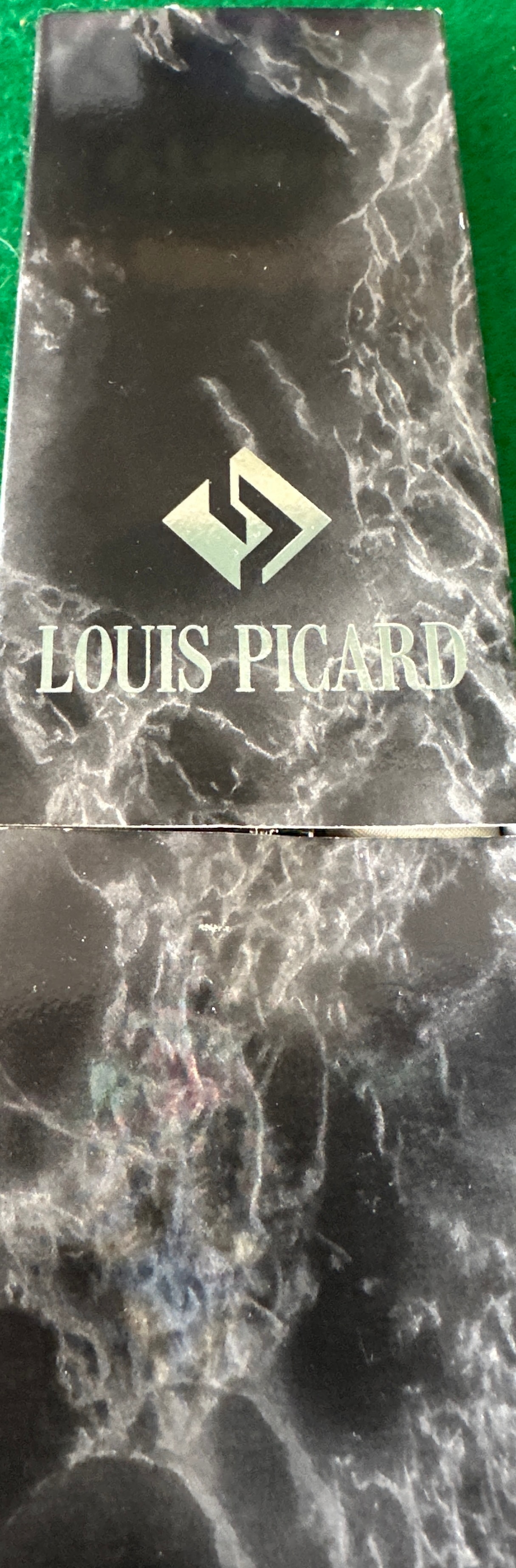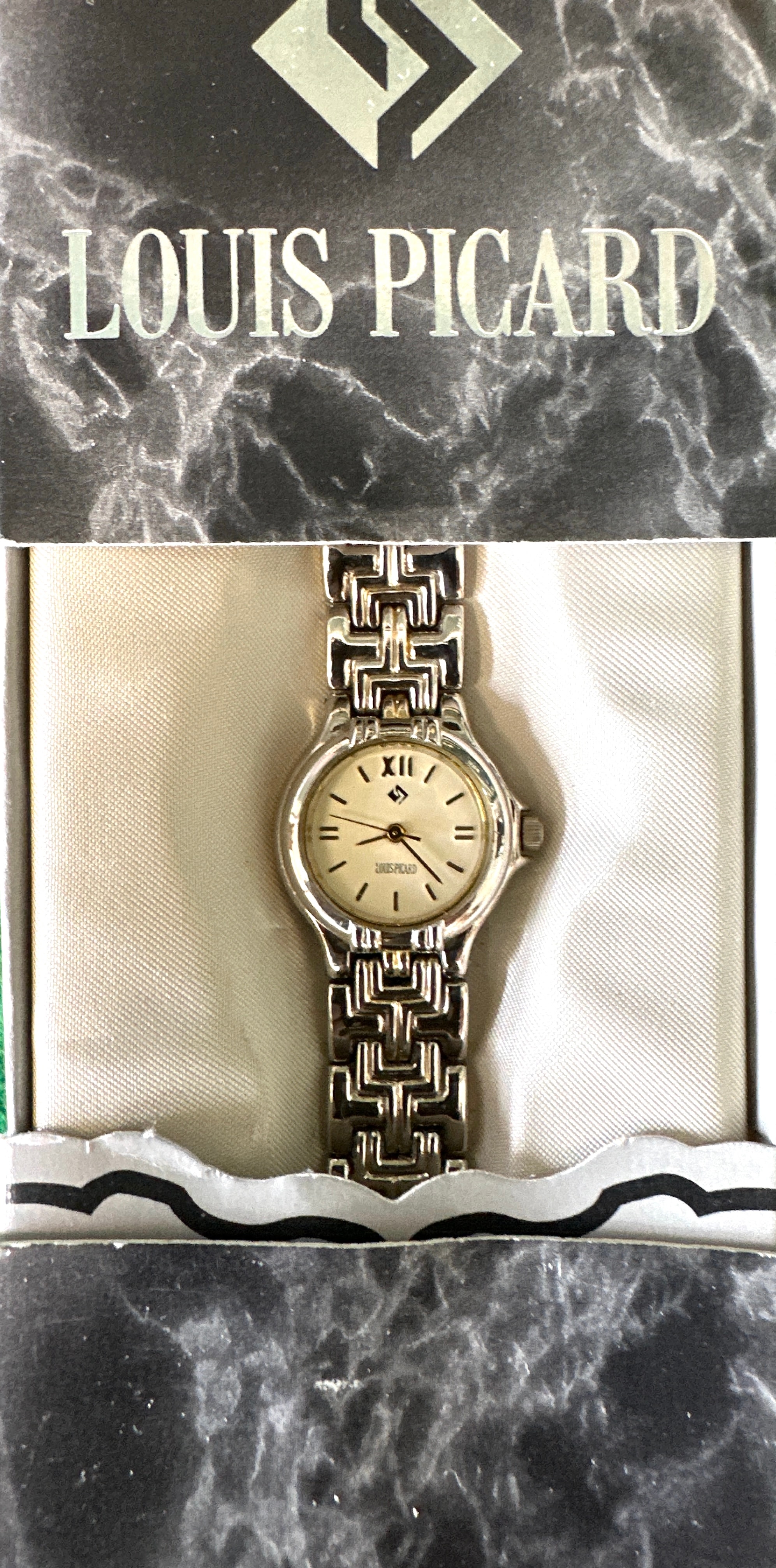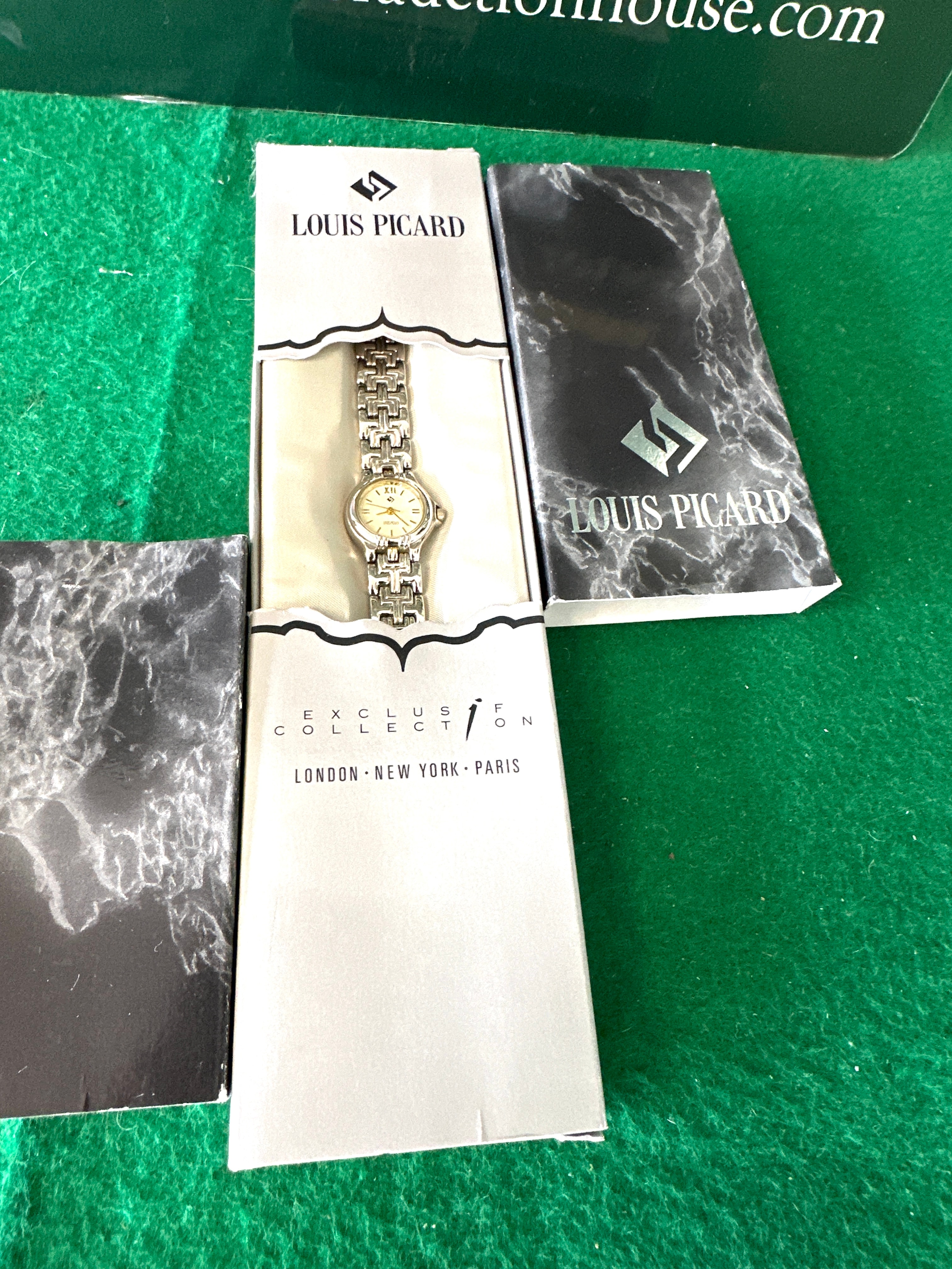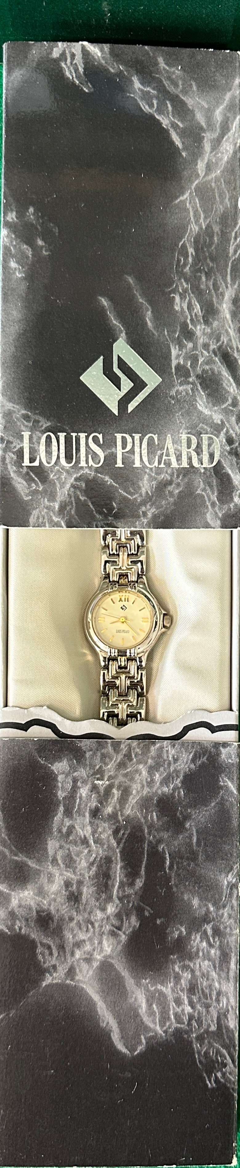 A Louis Picard ladies wrist watch featuring a silver-tone metal oval case and an integrated link bracelet. The light-colored dial displays a Roman numeral XII at the 12 o’clock position, bar indices for the other hours, the “LOUIS PICARD” brand name and logo, and “SWISS” visible at the bottom. The watch is presented in its original black marble-effect retail packaging, which identifies the brand “LOUIS PICARD” with its distinctive logo, and additionally specifies “EXCLUSIVE COLLECTION” and “LONDON • NEW YORK • PARIS”. Its style suggests a contemporary period, likely late 20th or early 21st century.