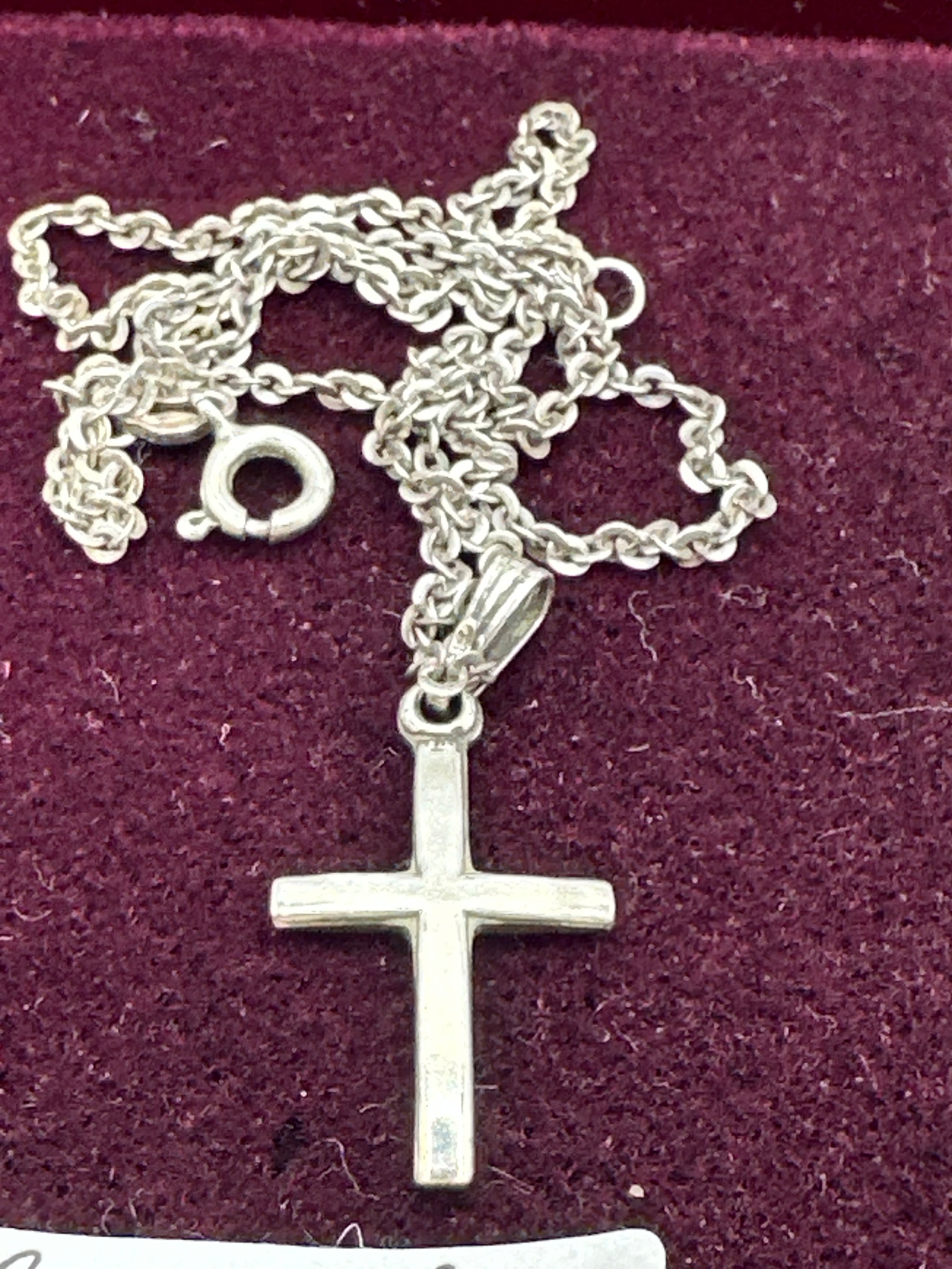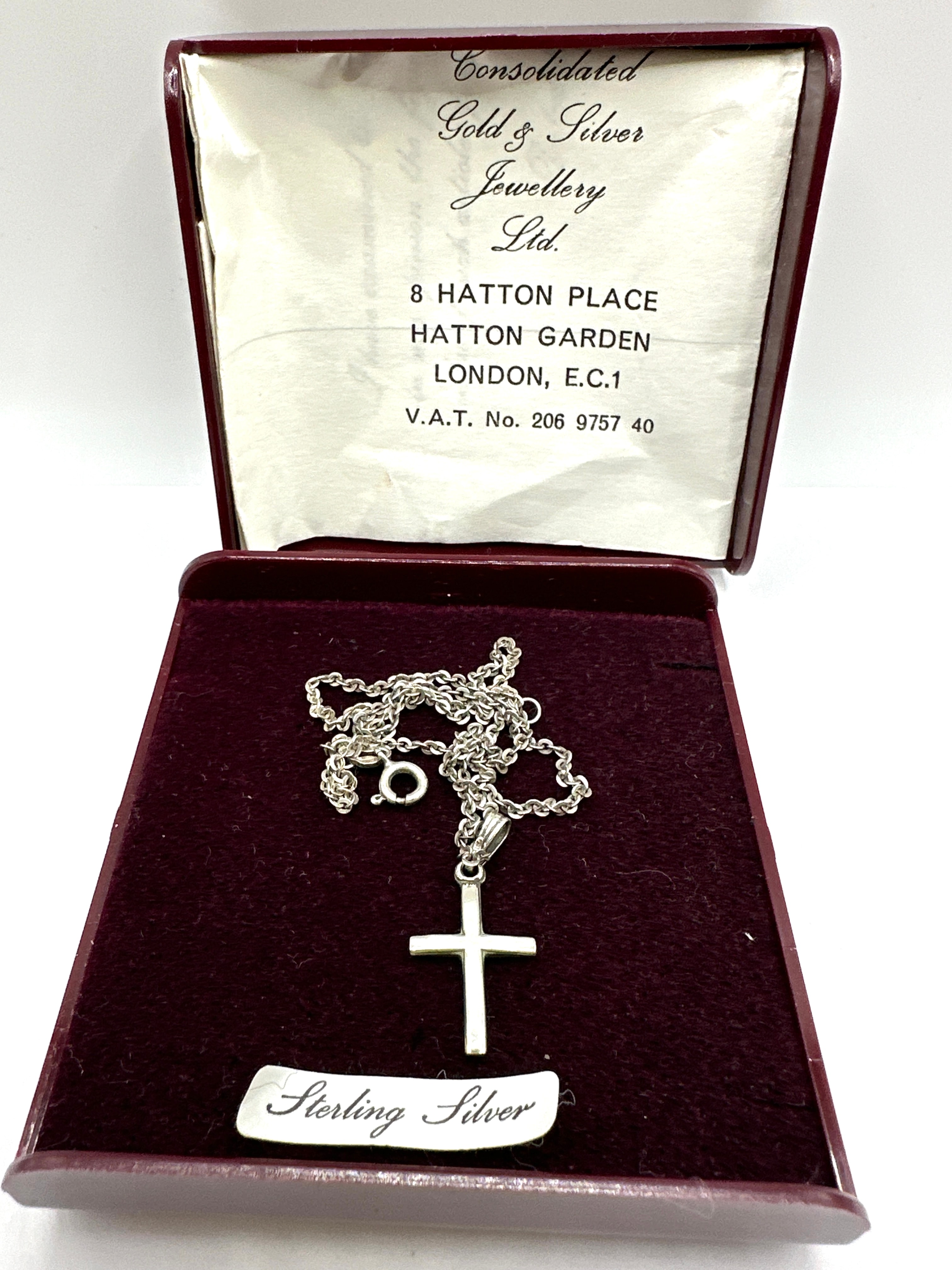 A sterling silver necklace, comprising a link chain and a plain, unadorned cross pendant. The necklace is presented within its original hinged box, which features a purple velvet-lined interior. The inside lid of the box is marked “Consolidated Gold & Silver Jewellery Ltd.”, followed by the address “8 HATTON PLACE HATTON GARDEN LONDON, E.C.1”, and “V.A.T. No. 206 9757 40”. A separate white label inside the box explicitly states “Sterling Silver”. The piece is consistent with a mid-to-late 20th-century period.