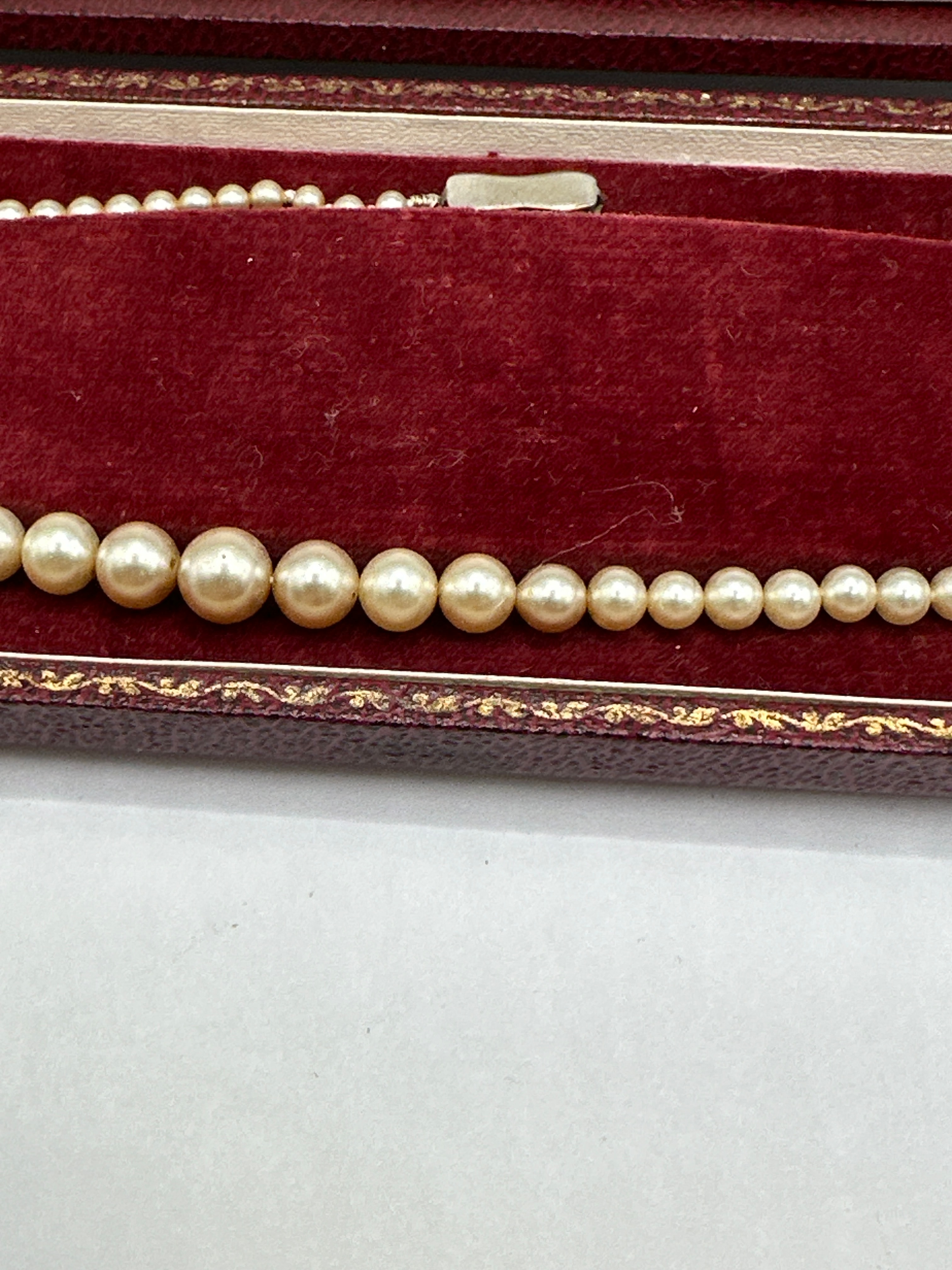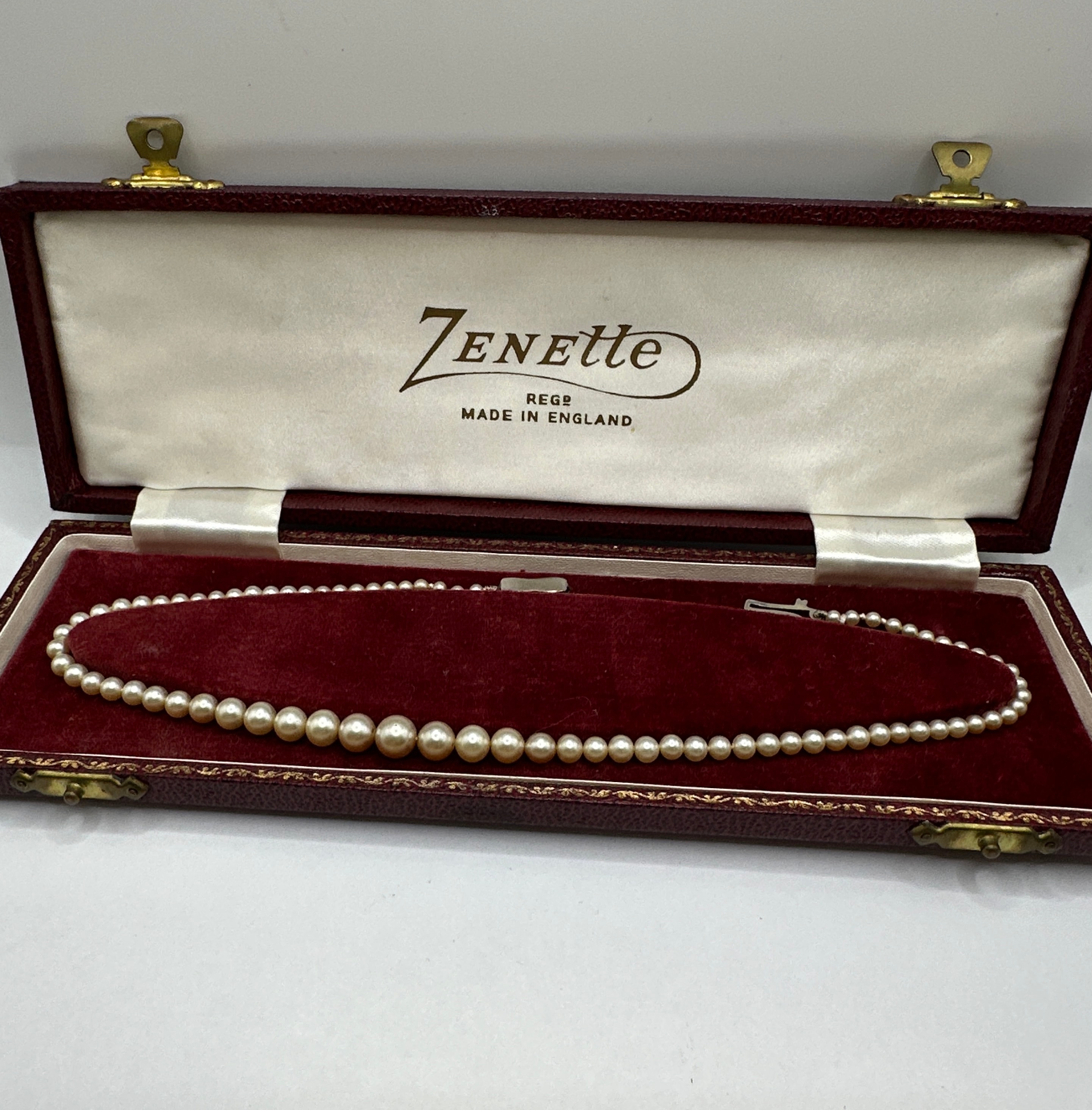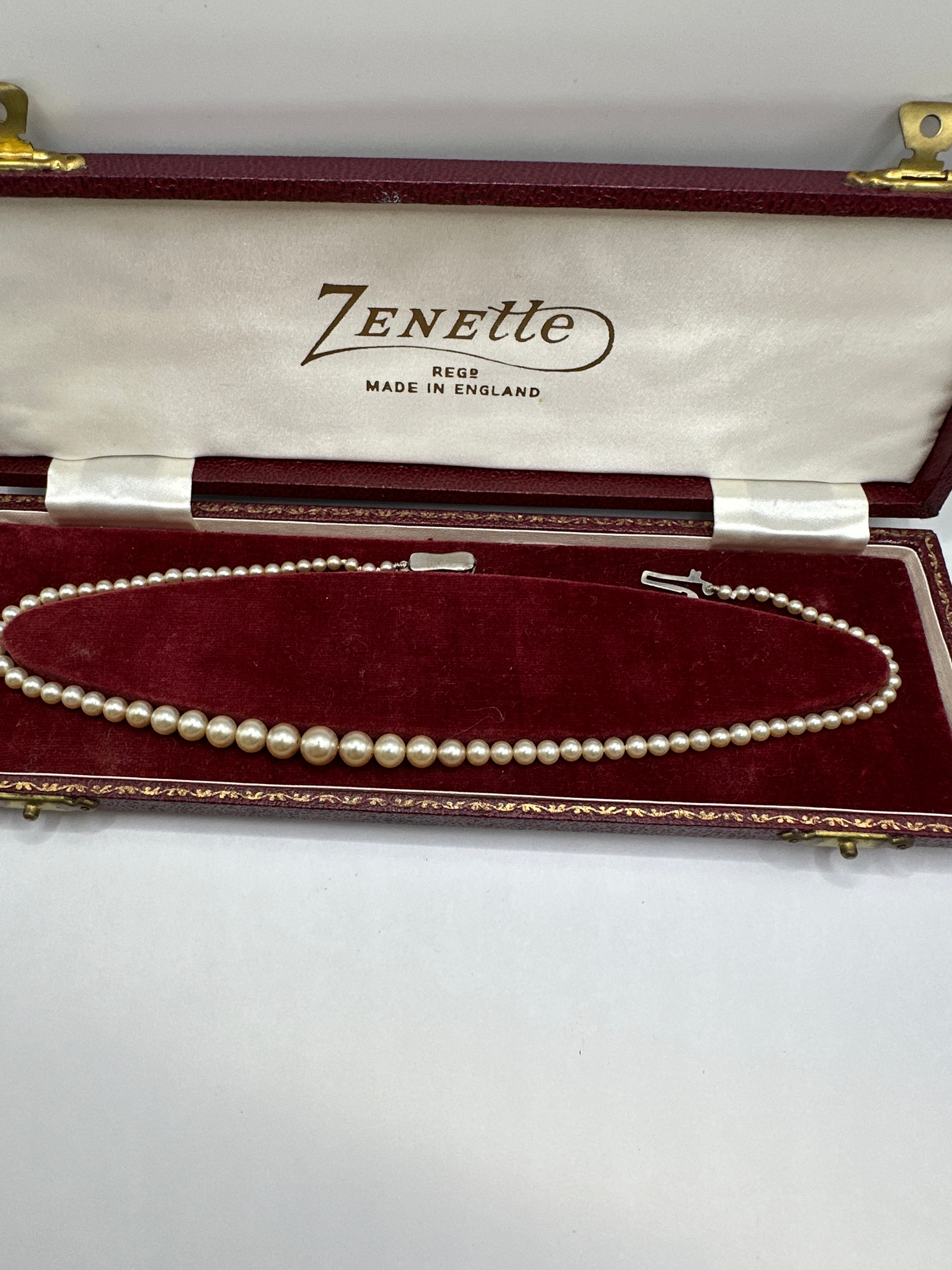 A vintage Zenette graduated pearl necklace. The necklace features faux pearls, graduated in size, secured with a simple silver-tone clasp. It is presented in its original red, hinged box with a red velvet interior and a cream satin lid lining. The lid lining is visibly marked “Zenette REGS MADE IN ENGLAND”.