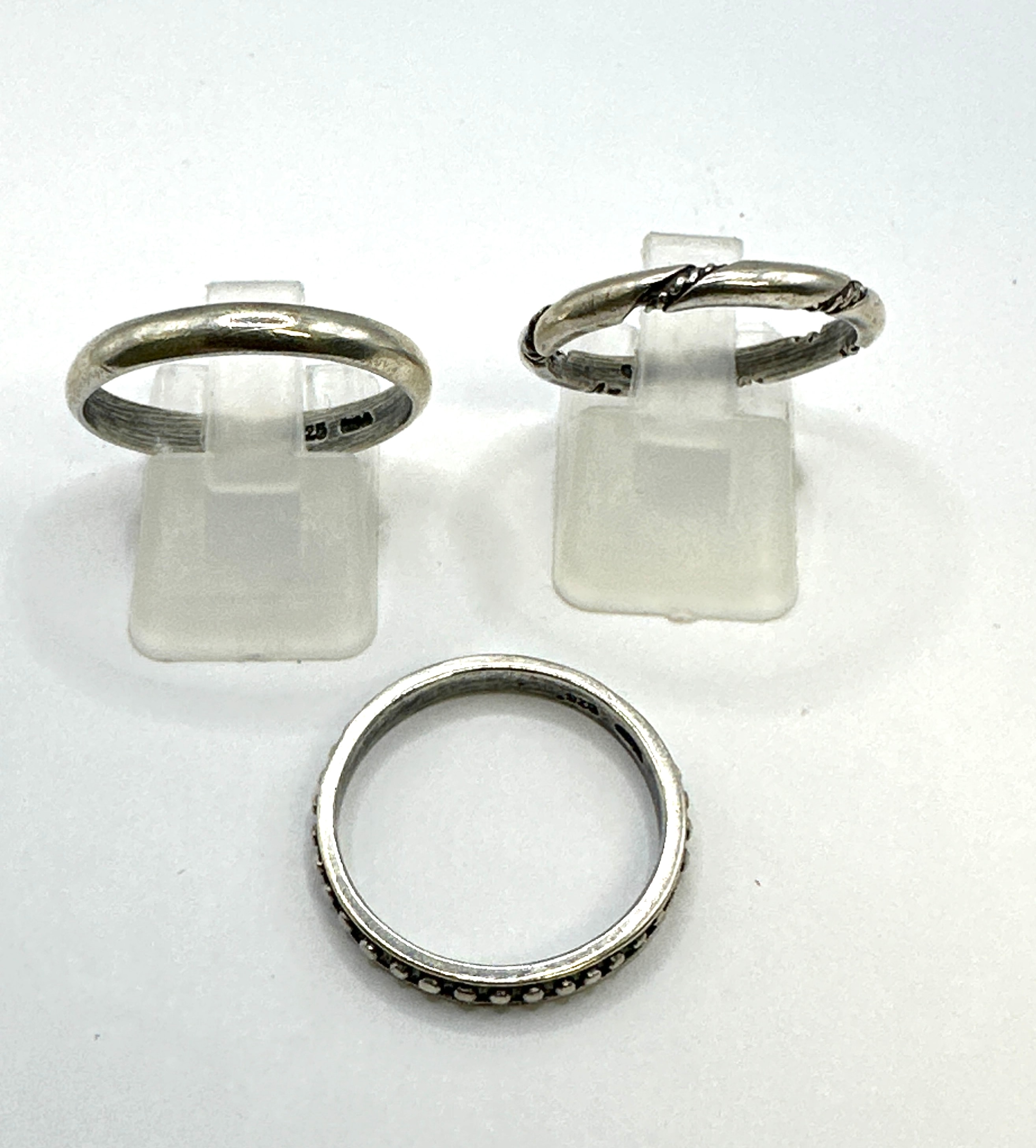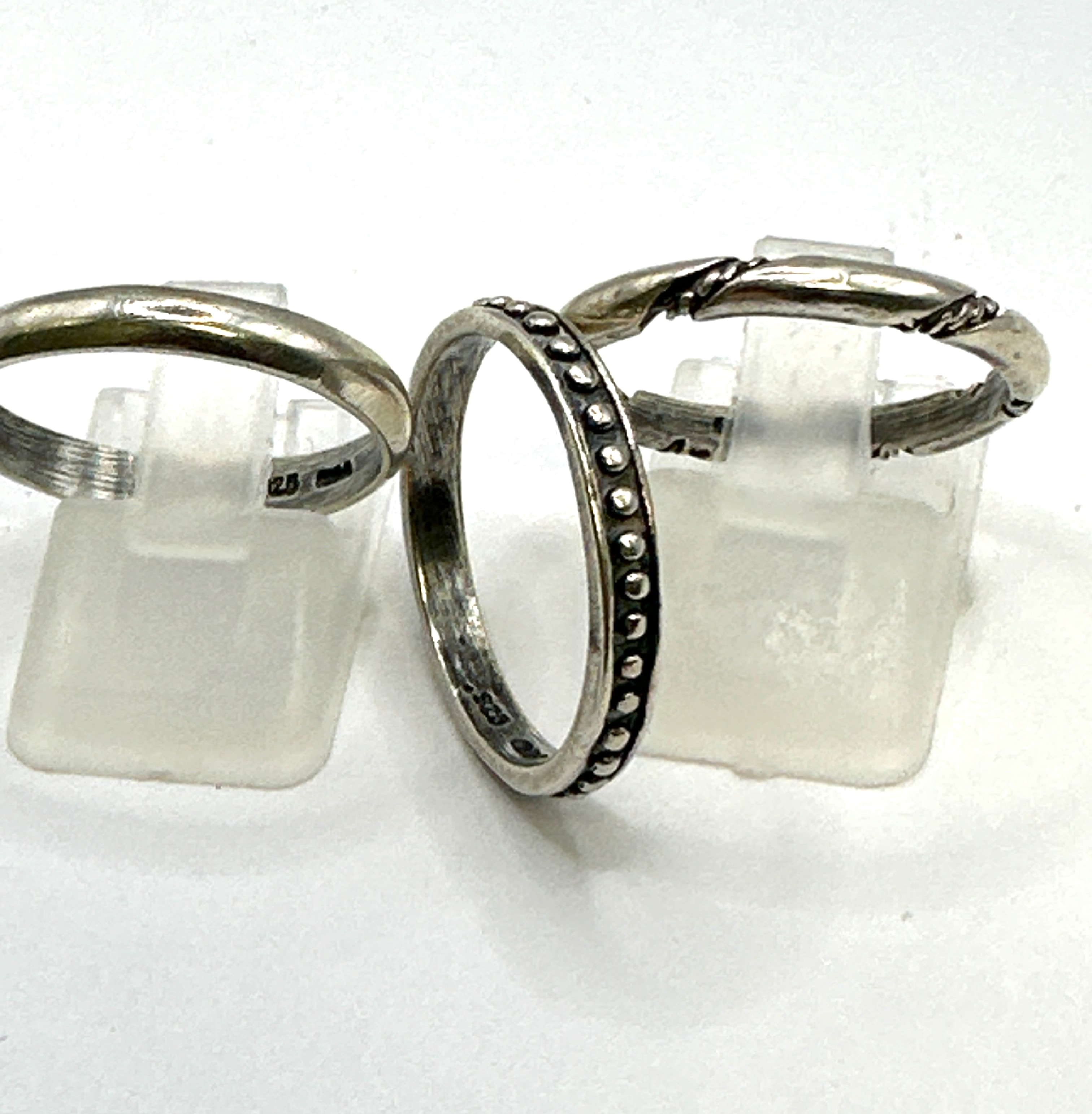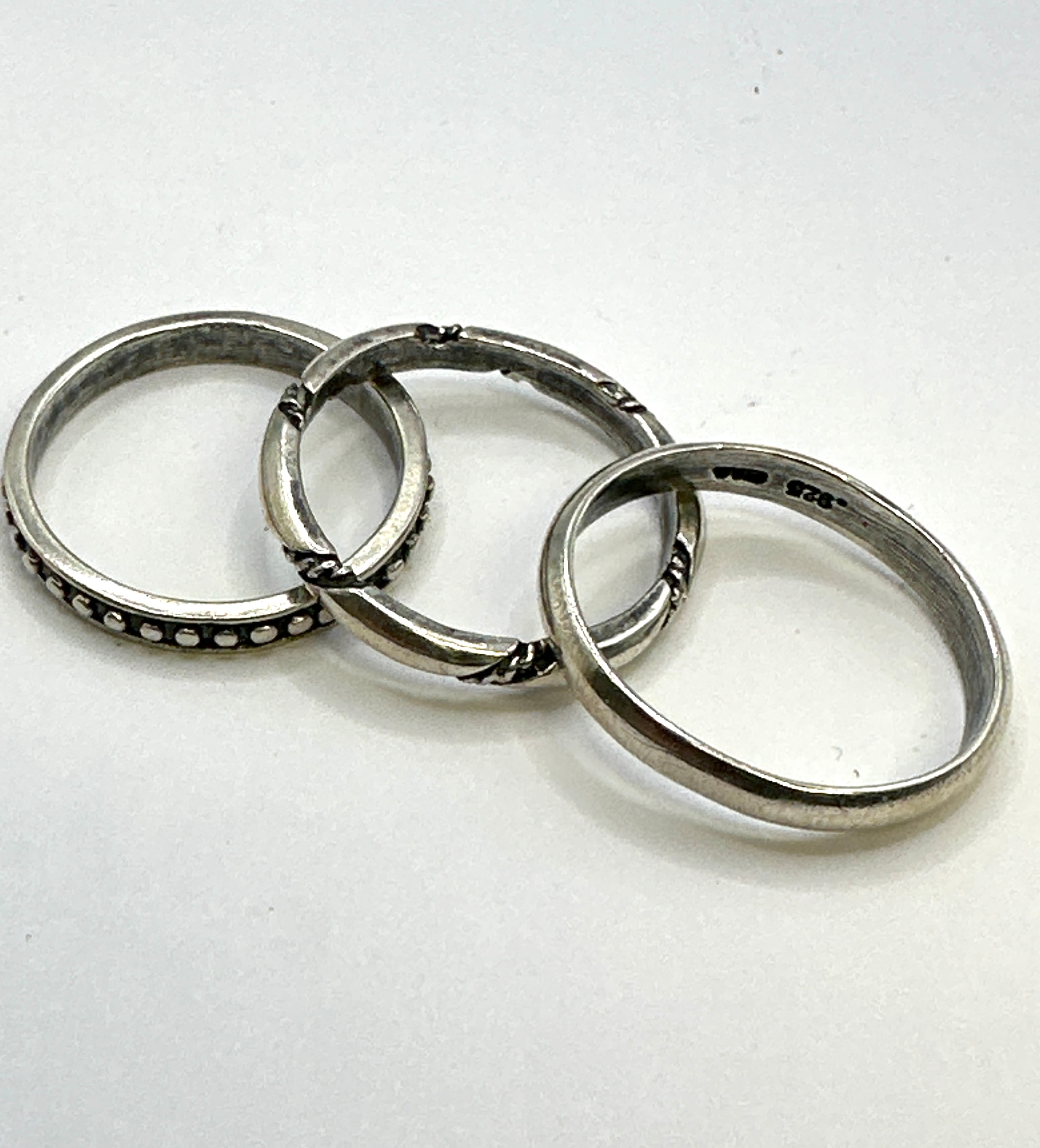 A set of three Silpada 925 silver band rings. One ring features a continuous pattern of raised dots or beads along its band. A second ring exhibits a twisted or braided design. The third is a plain, polished band. Visible ‘925’ purity marks are present on the interior of at least two of the bands. The materials are confirmed as 925 silver.