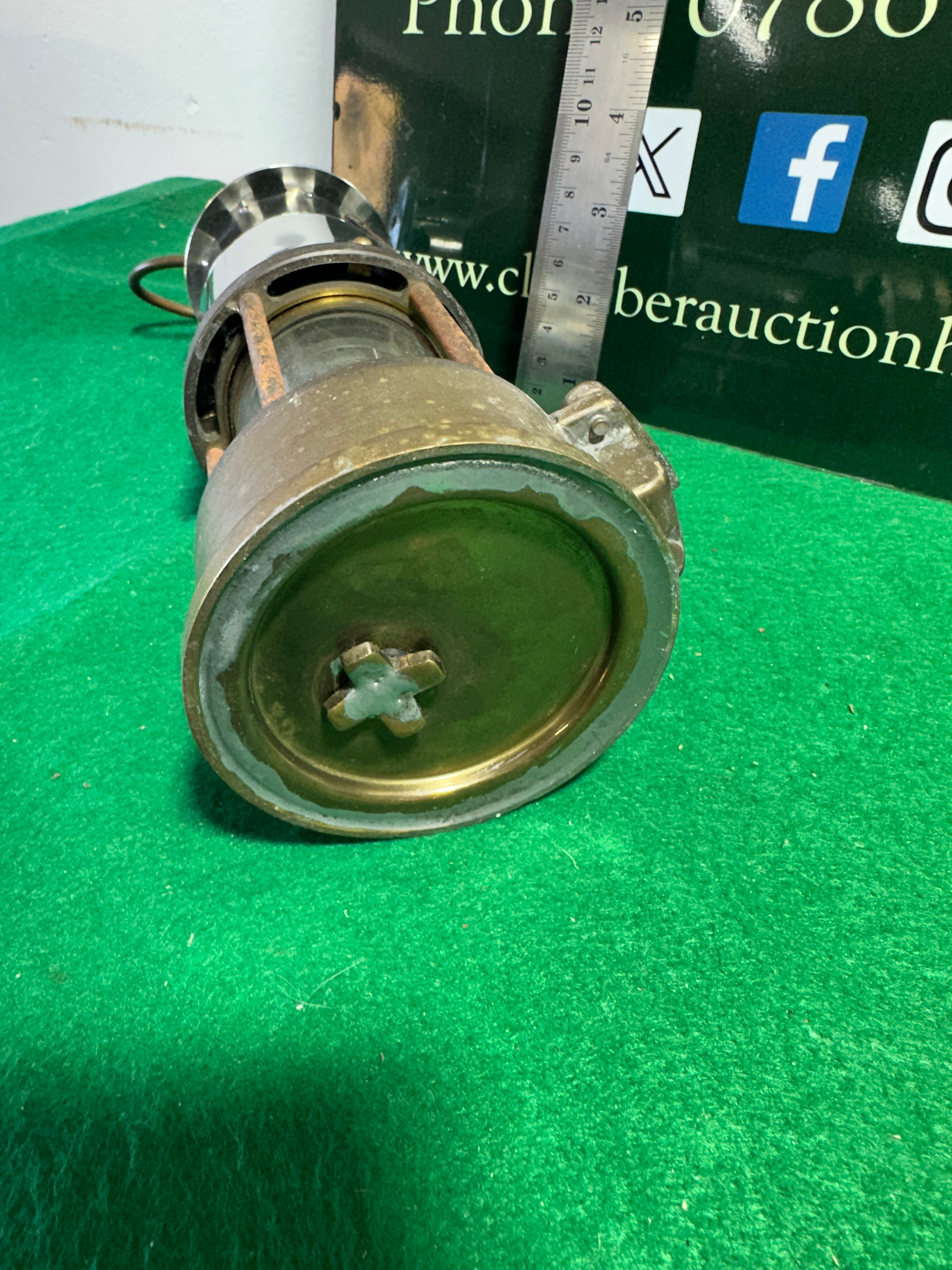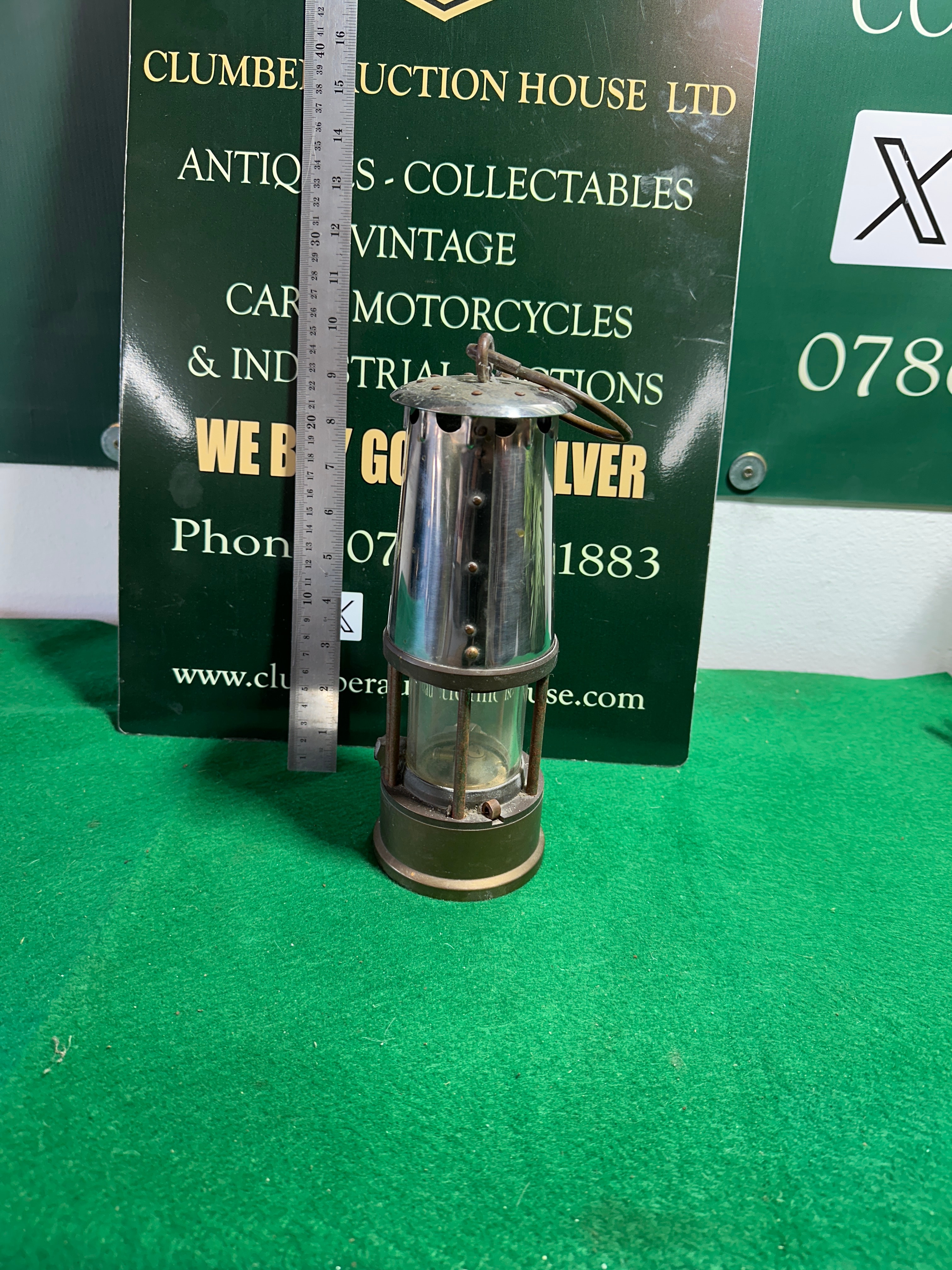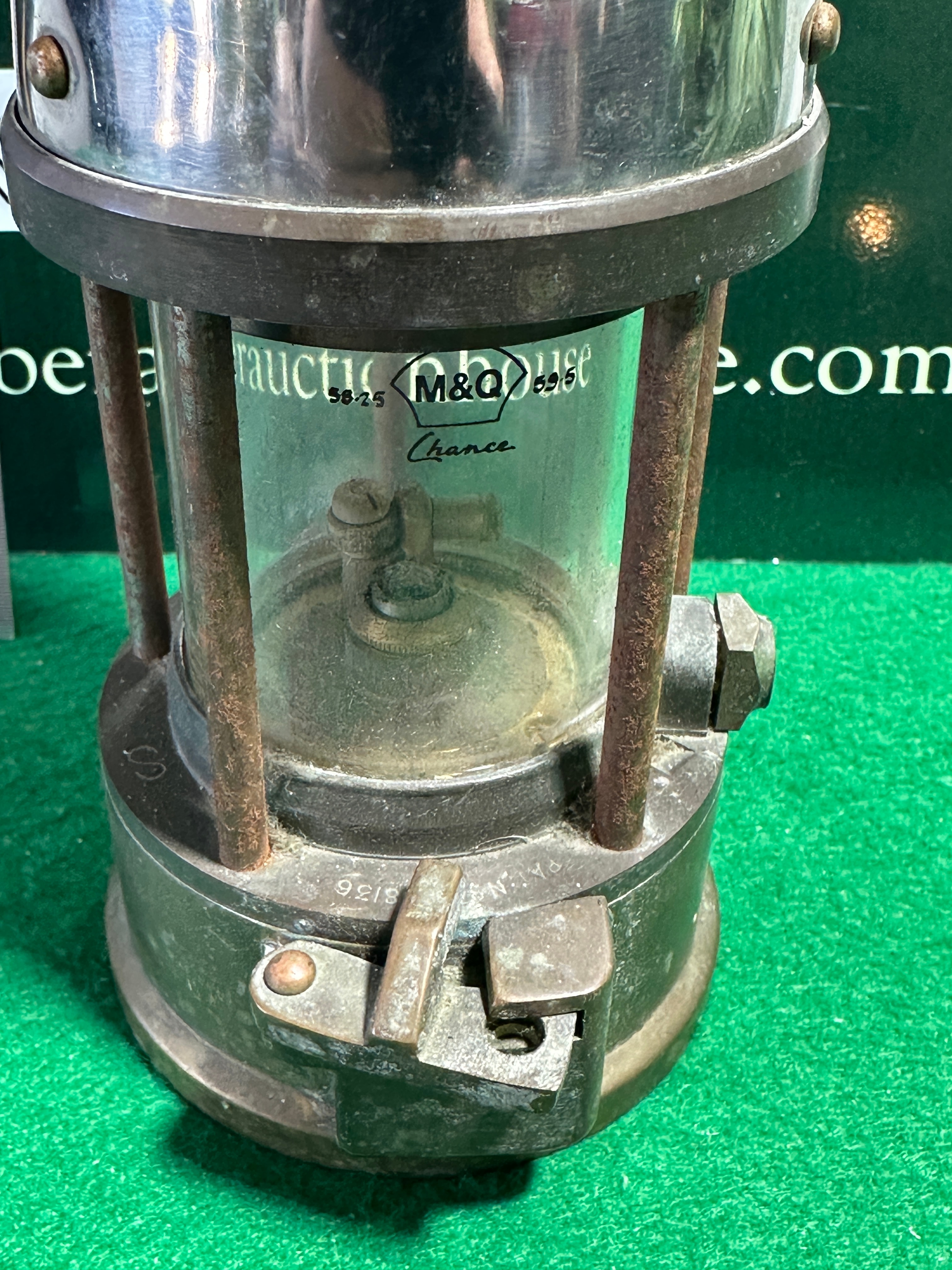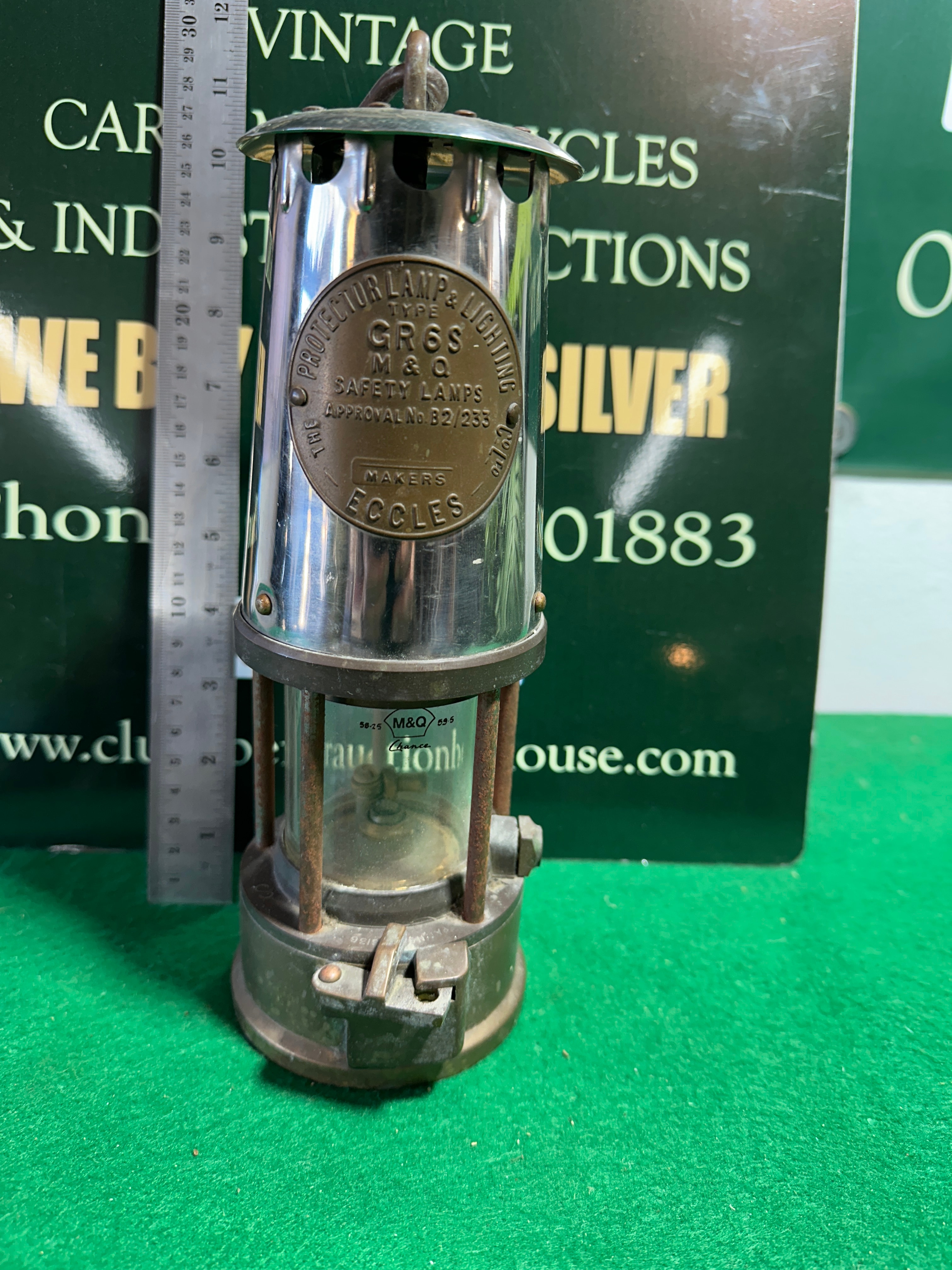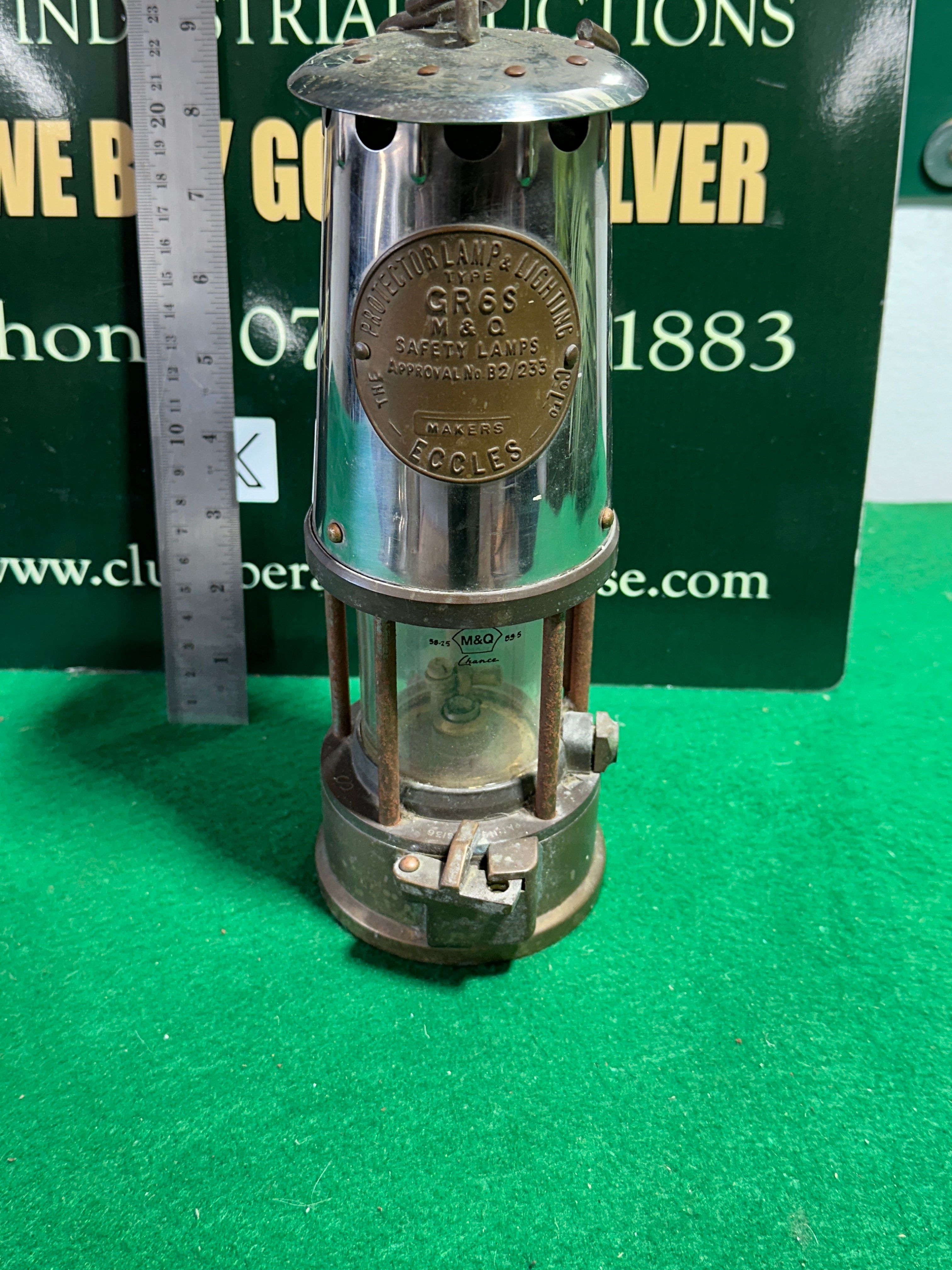 An Eccles Type GR6S Miner’s Safety Lamp, featuring a polished metal upper housing and a substantial base and internal frame constructed from tarnished brass or bronze, enclosing a clear glass cylinder. The prominent oval plaque on the upper section reads: “THE PROTECTOR LAMP & LIGHTING”, “TYPE GR6S”, “M & C”, “SAFETY LAMPS”, “APPROVAL No. B.2 / 253”, “MAKERS”, and “ECCLES”. Further markings on the glass include “M&Q”, “Chance”, “59-25”, and “59-5”.
