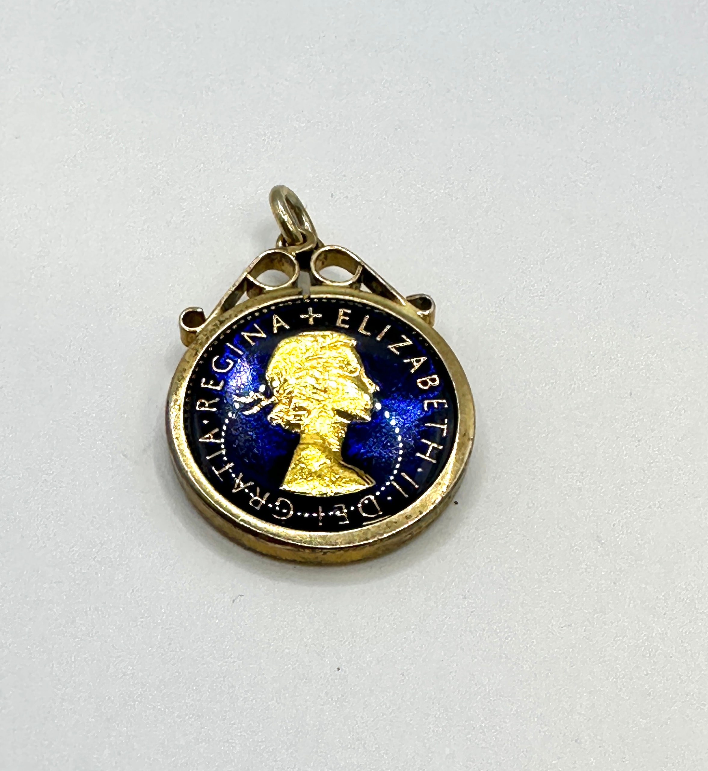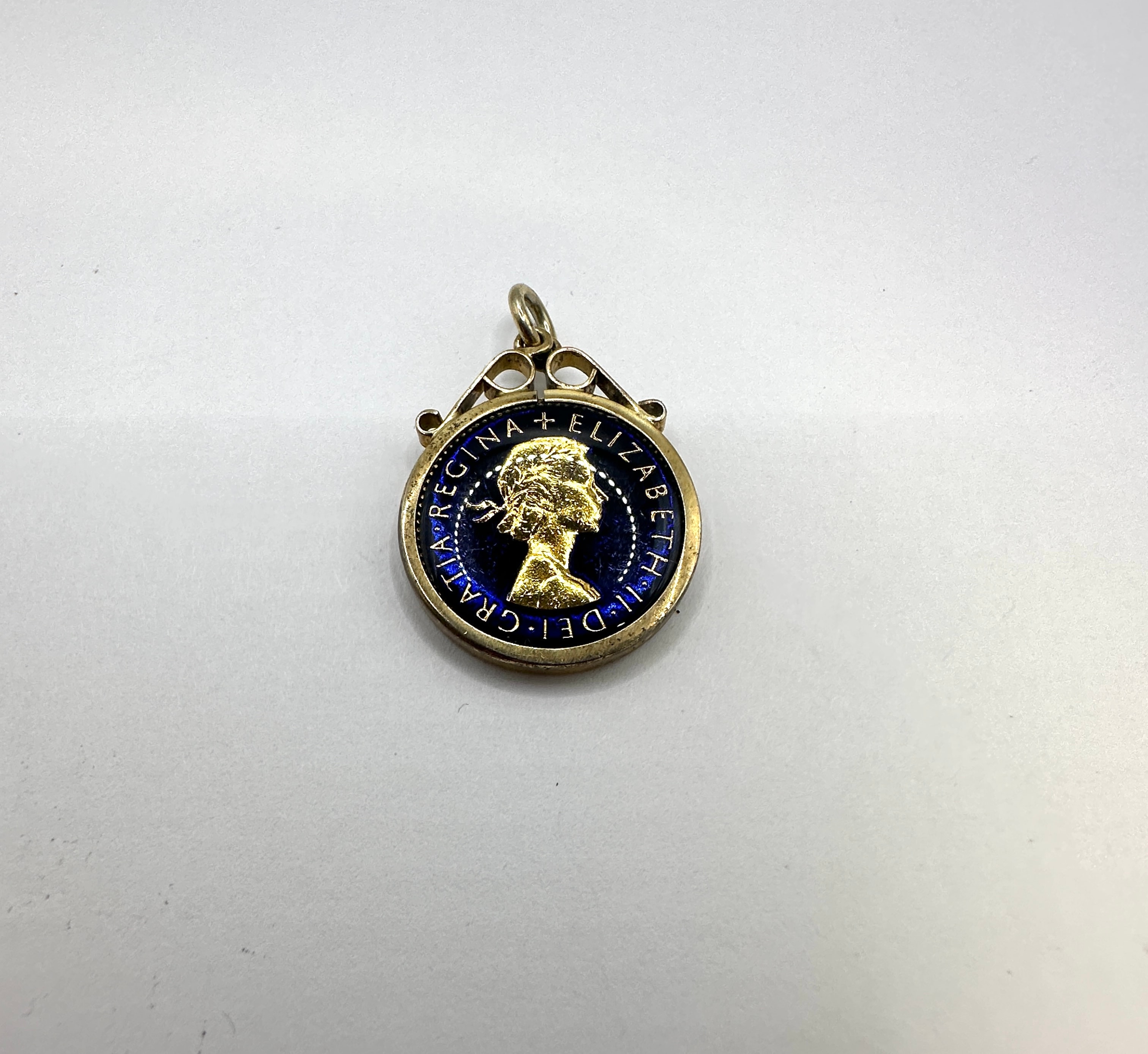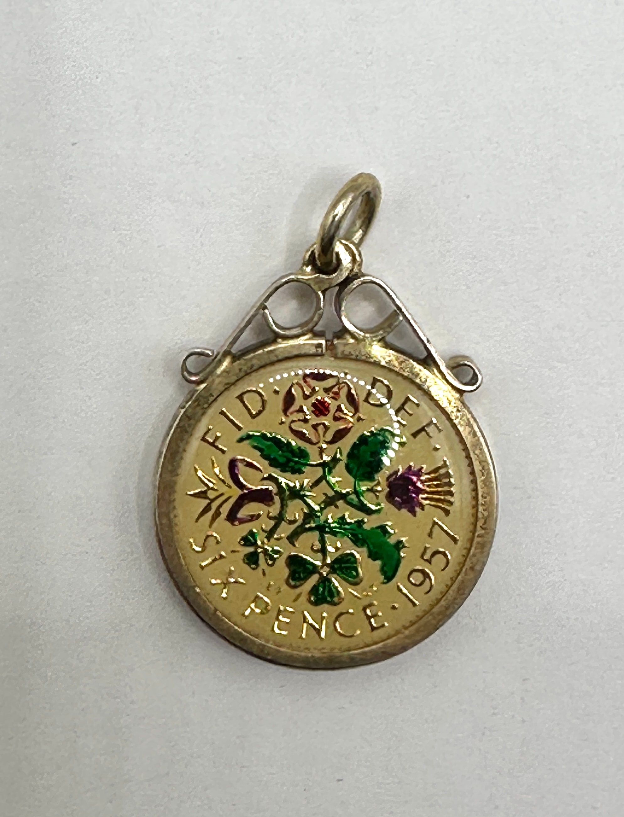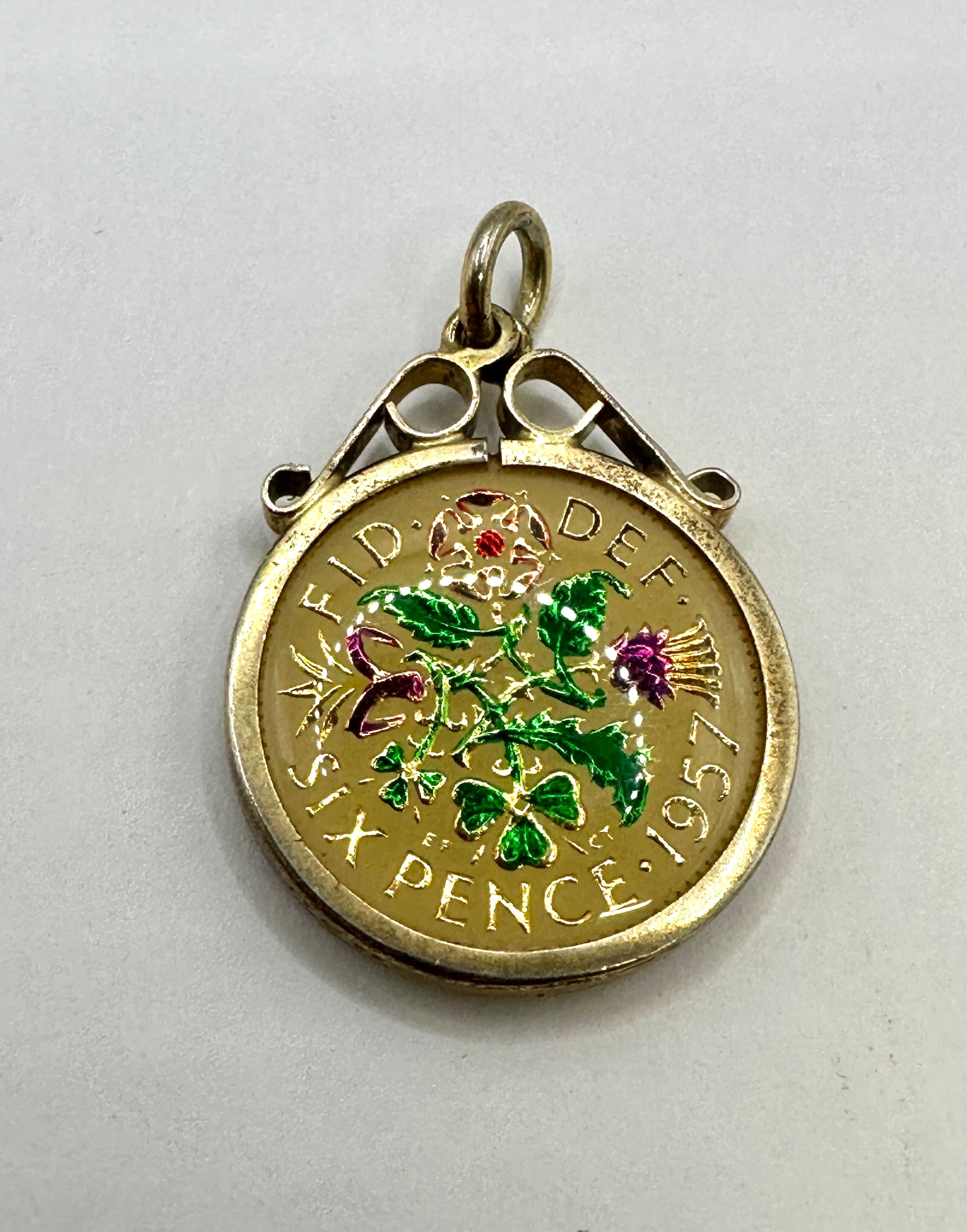A vintage enameled 1957 British sixpence coin pendant, set within a silver-toned metal frame with a top suspension loop. The coin itself appears to be a gold-colored base metal with colorful enamel decoration. The obverse features an enameled floral design in red, green, and purple, highlighting the original pattern, with visible text “SIX PENCE 1957” and partially visible “FID DEF”. The reverse displays a profile bust of Queen Elizabeth II, enameled against a deep blue background, surrounded by the inscription “ELIZABETH II DEI GRATIA REGINA”.