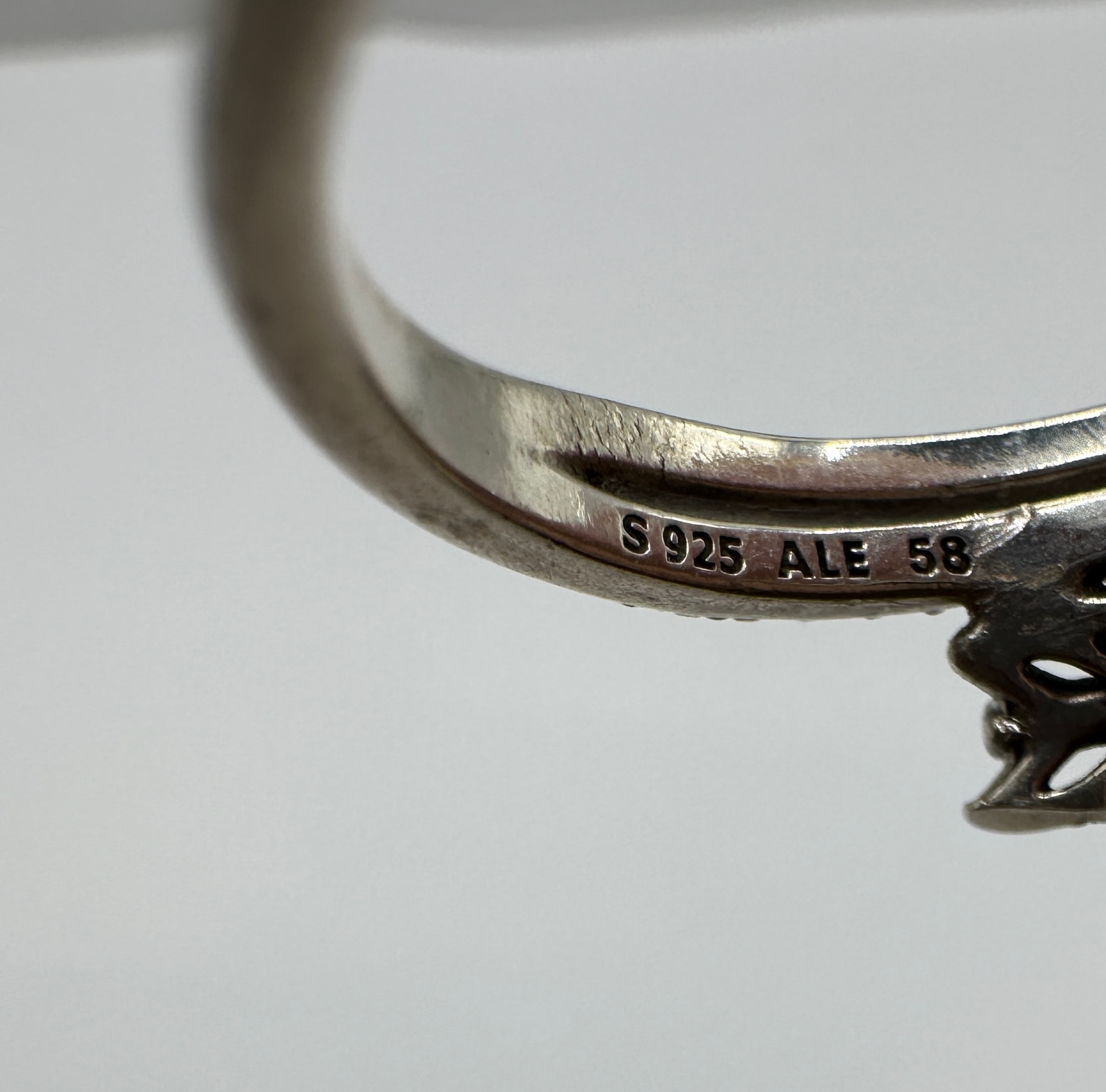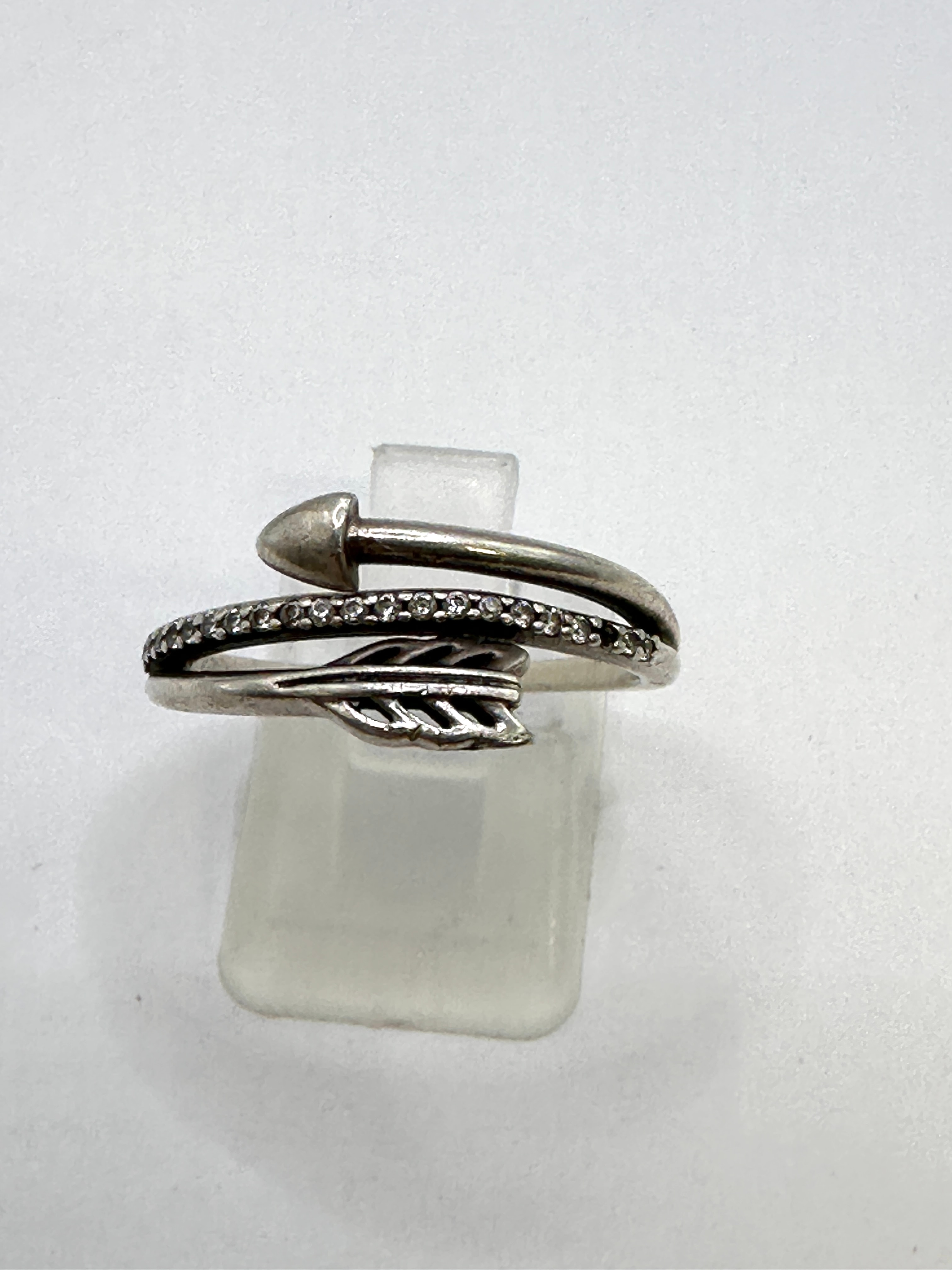 A Pandora sterling silver sparkling arrow ring. This contemporary finger ring features a wrap-around design, forming an arrow motif with a distinct arrowhead and stylized fletching. One section of the band is pave-set with numerous small, clear, round faceted cubic zirconia stones. The interior of the band is stamped with the maker’s mark “ALE”, the sterling silver purity mark “S925”, and the numerical size mark “58”.