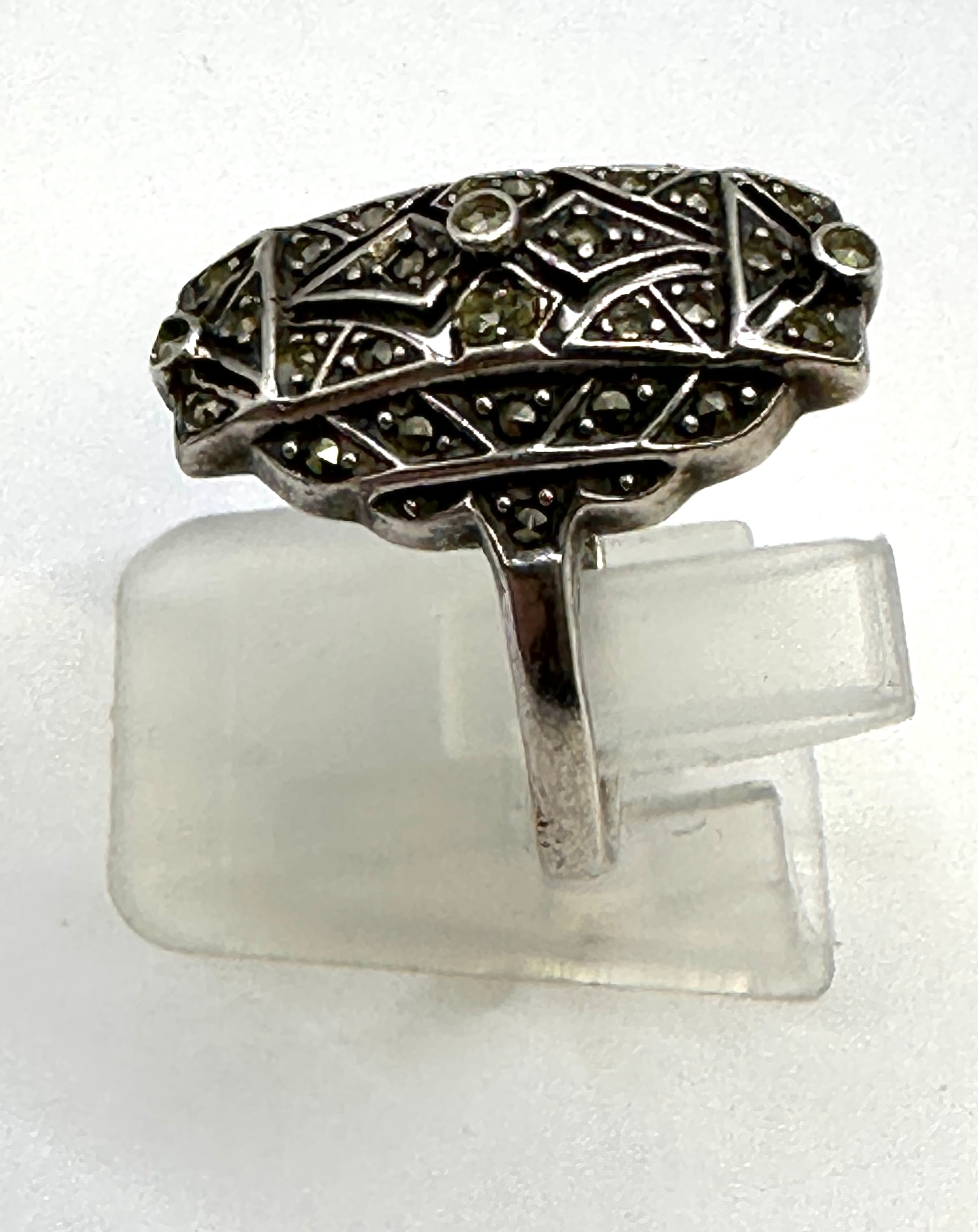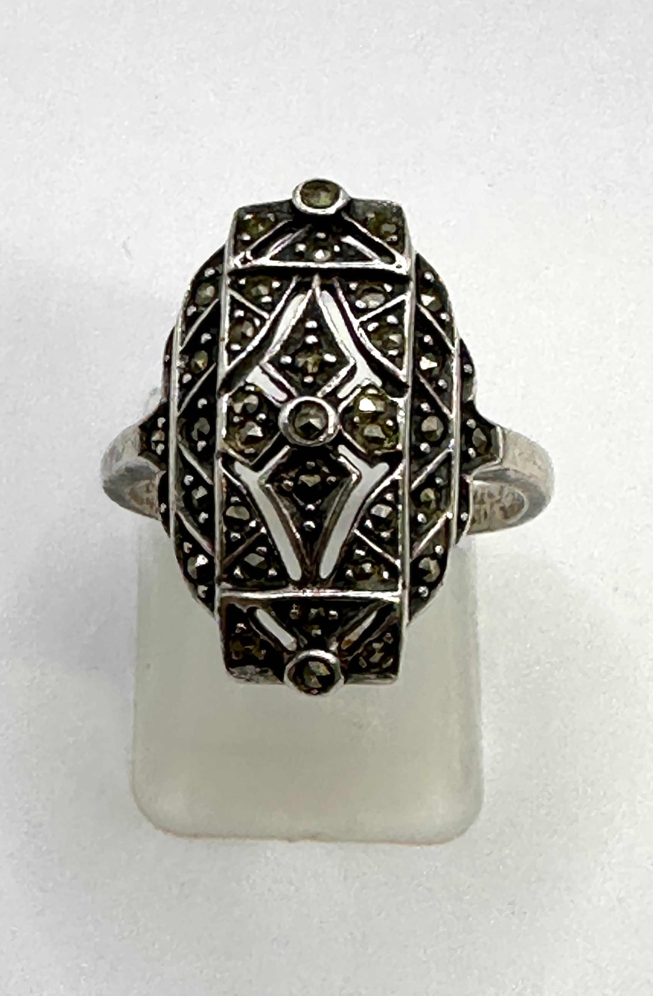 A vintage Art Deco style ring, crafted from sterling silver. The ring features an elongated, slightly oval-rectangular head with an intricate, openwork geometric design. The entire surface of the head is set with numerous small, dark, faceted marcasite stones, arranged in diamond, triangular, and linear patterns, with larger individual stones accentuating the center and ends. The metal exhibits dark patination. The style, characterized by its precise geometric motifs and marcasite setting, is consistent with Art Deco influence. No discernible text or maker’s marks are visible on the ring itself.