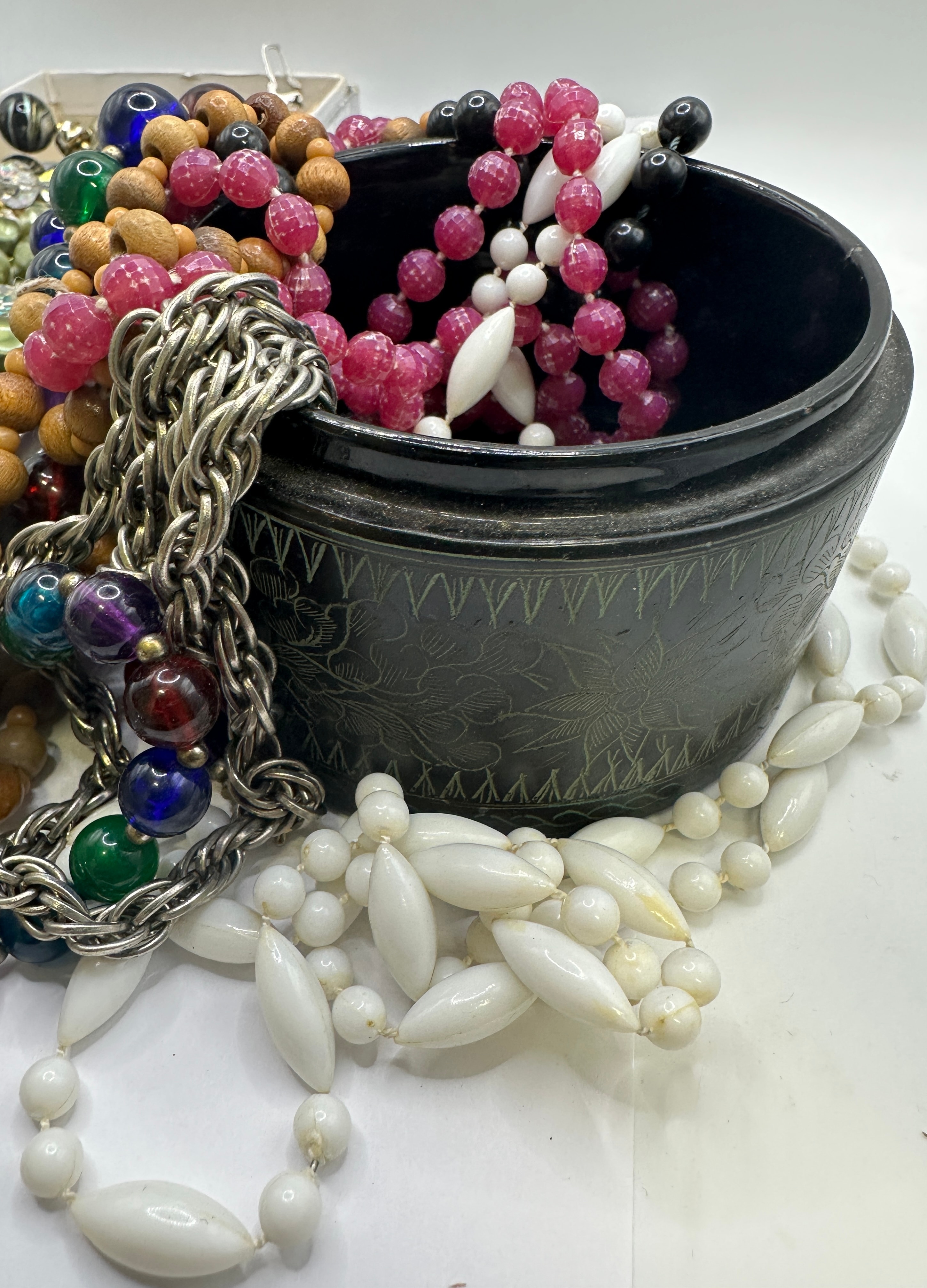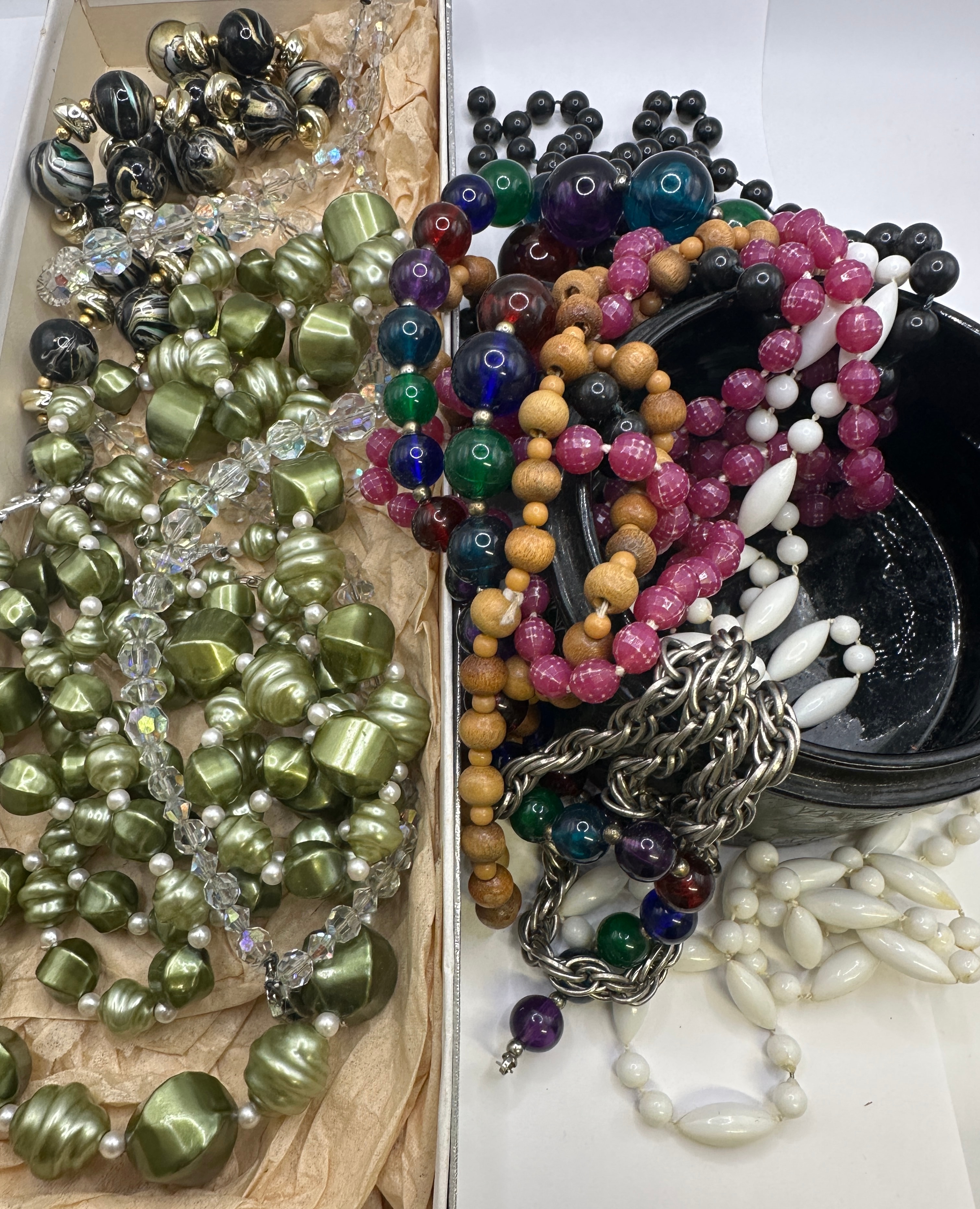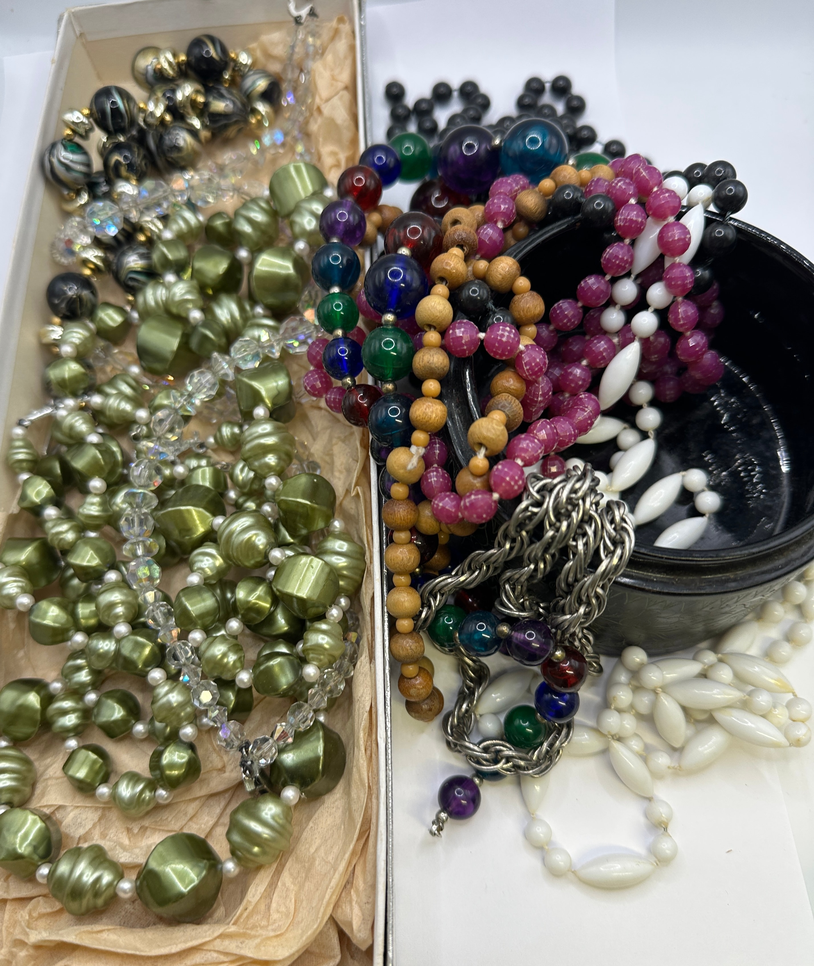 A diverse collection of vintage costume jewelry, predominantly necklaces, evoking a mid-to-late 20th-century aesthetic. The lot includes pieces housed partly within a plain cardboard box lined with crumpled paper and spilling from a dark, circular vessel that appears to be carved wood or resin with incised floral or geometric patterns. Materials present include faceted and smooth glass beads, plastic (likely lucite or resin) beads in solid, swirled, and pearlized finishes, natural wood beads, and silver-tone metal chains. Colors are abundant, encompassing olive green, chartreuse, clear, cream, black, white, magenta, fuchsia, purple, blue, green, and natural wood tones.