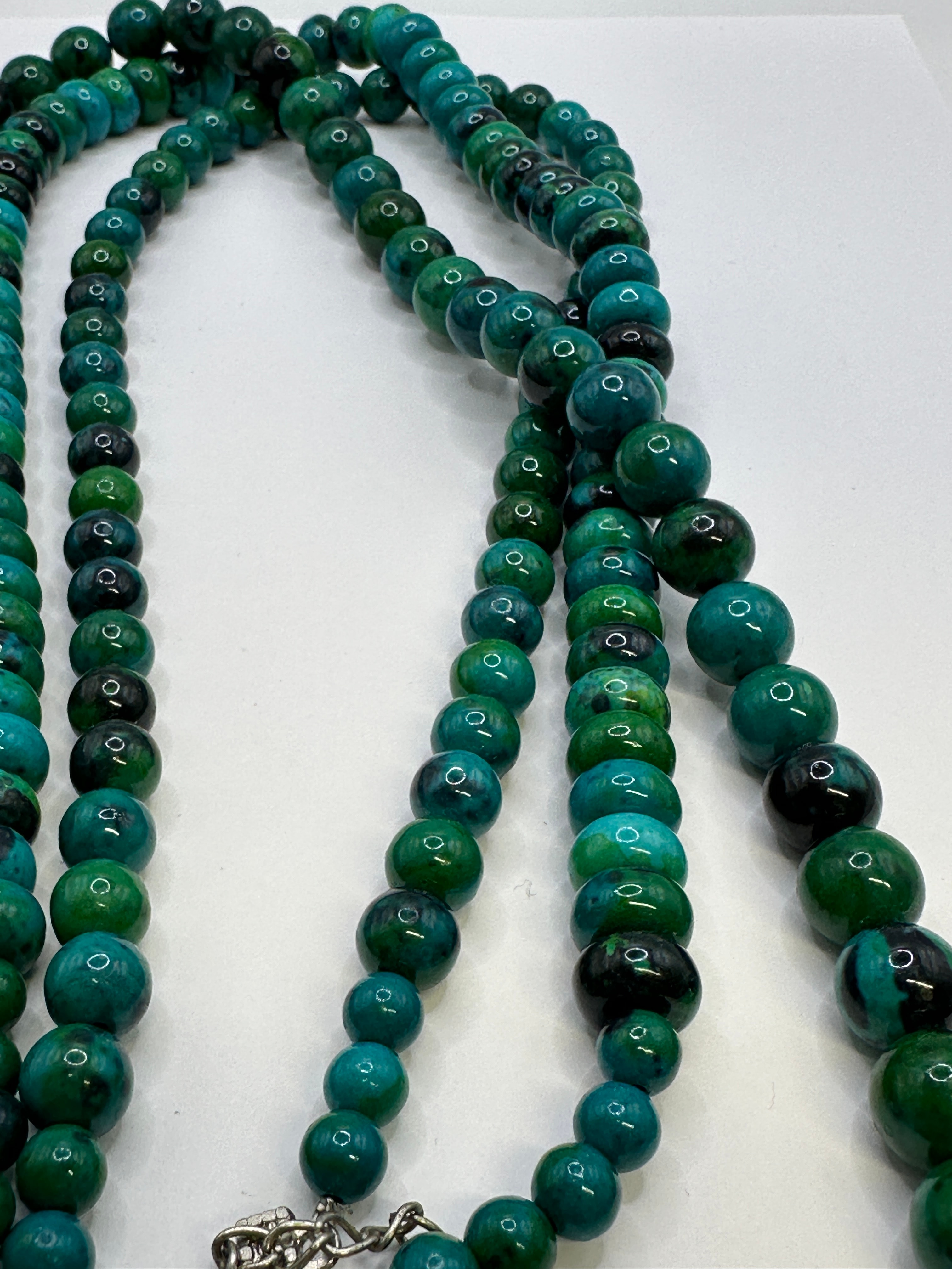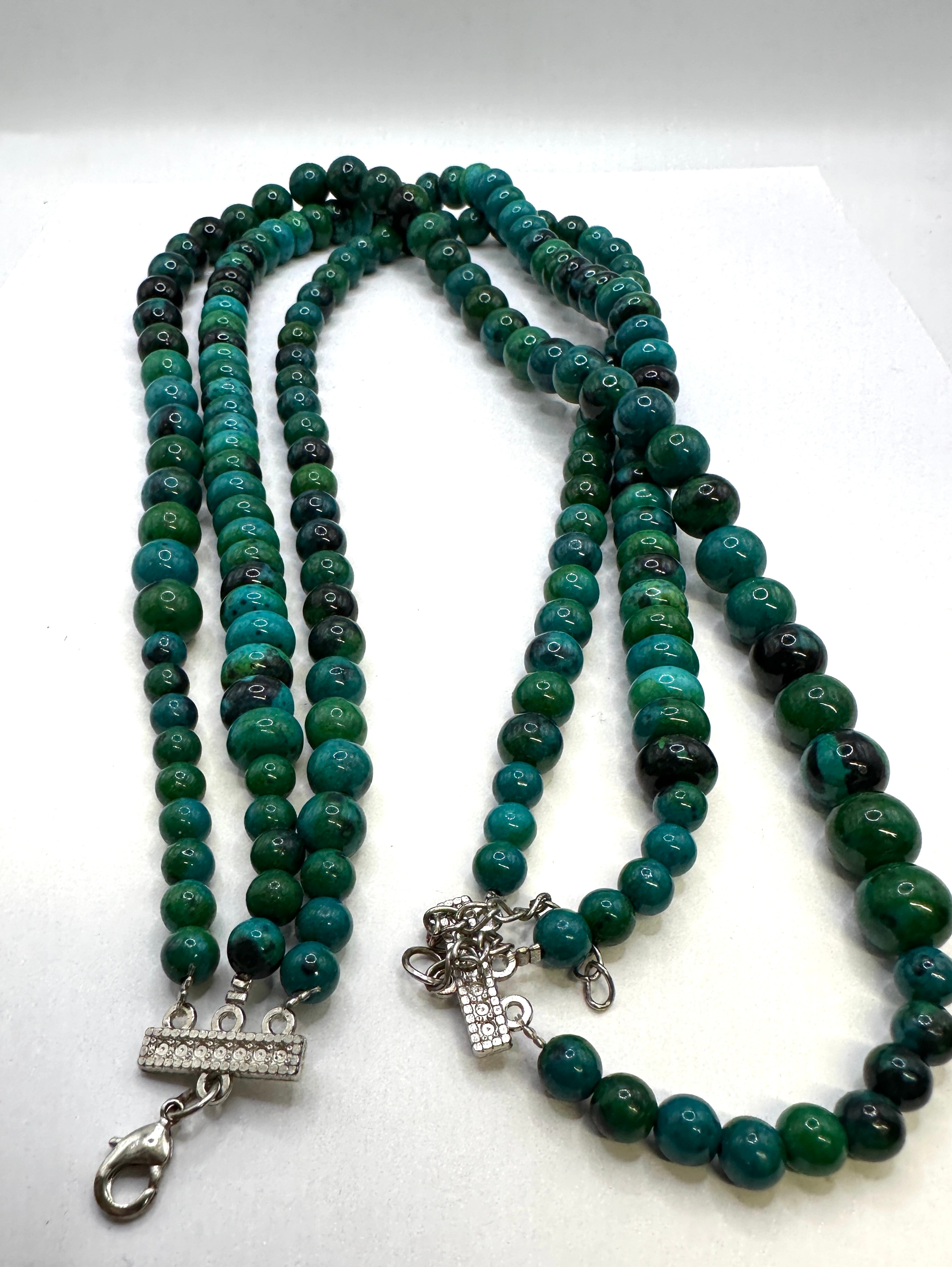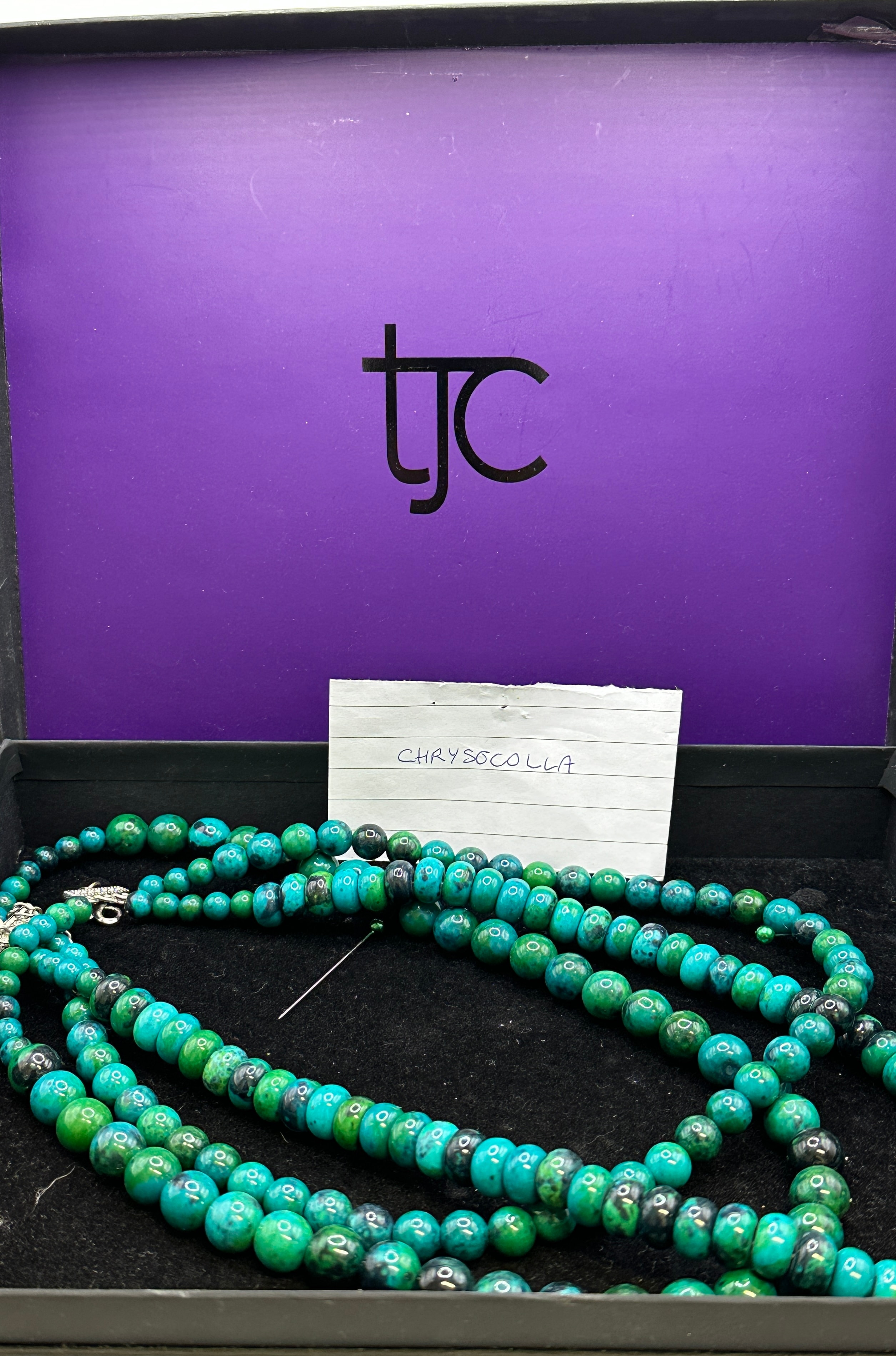 A contemporary multi-strand beaded necklace featuring polished, spherical chrysocolla beads exhibiting variegated teal, blue, and green hues. The necklace is fitted with silver-toned metal findings, including a multi-strand box clasp adorned with small clear stones and a lobster claw clasp with an extender chain. It is presented within a branded box featuring a black “tjc” logo on the purple interior lid.