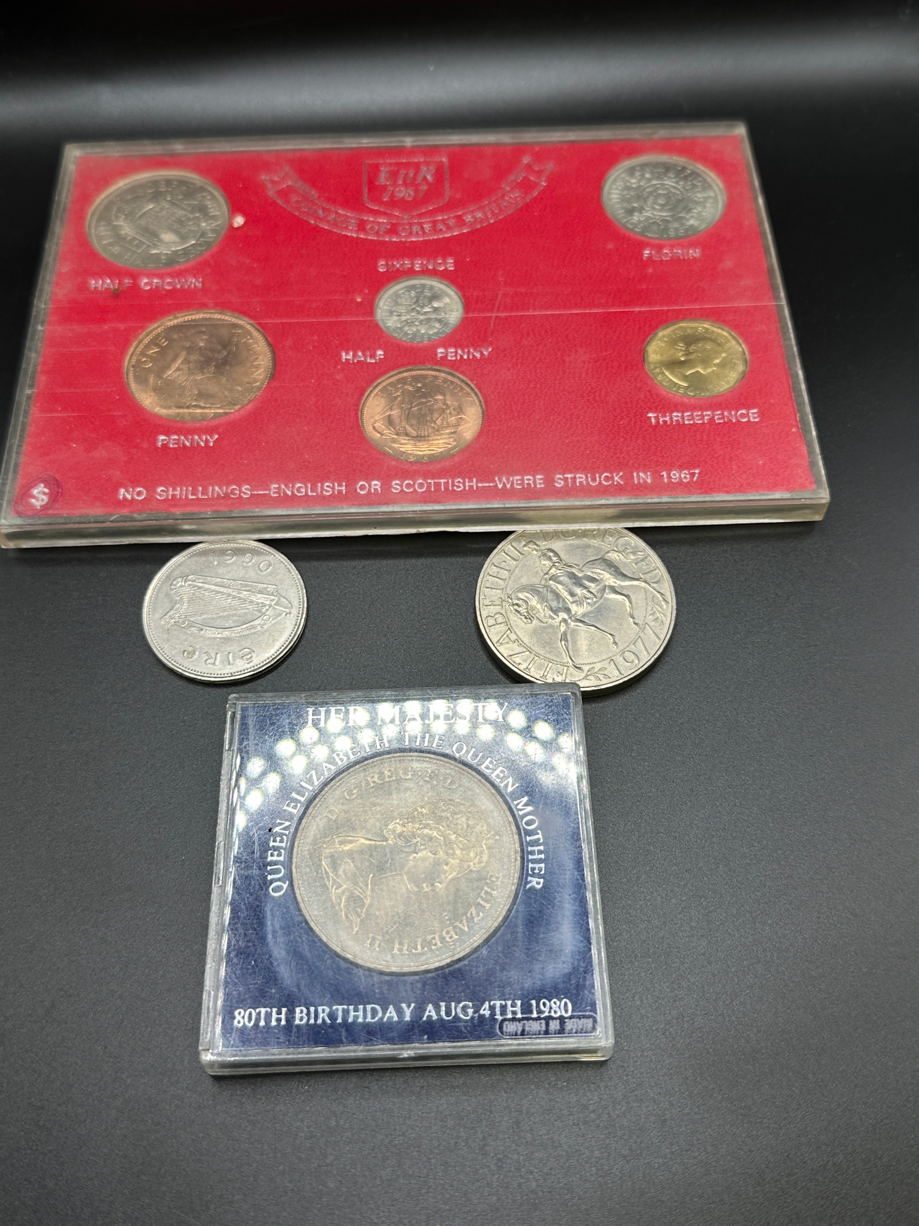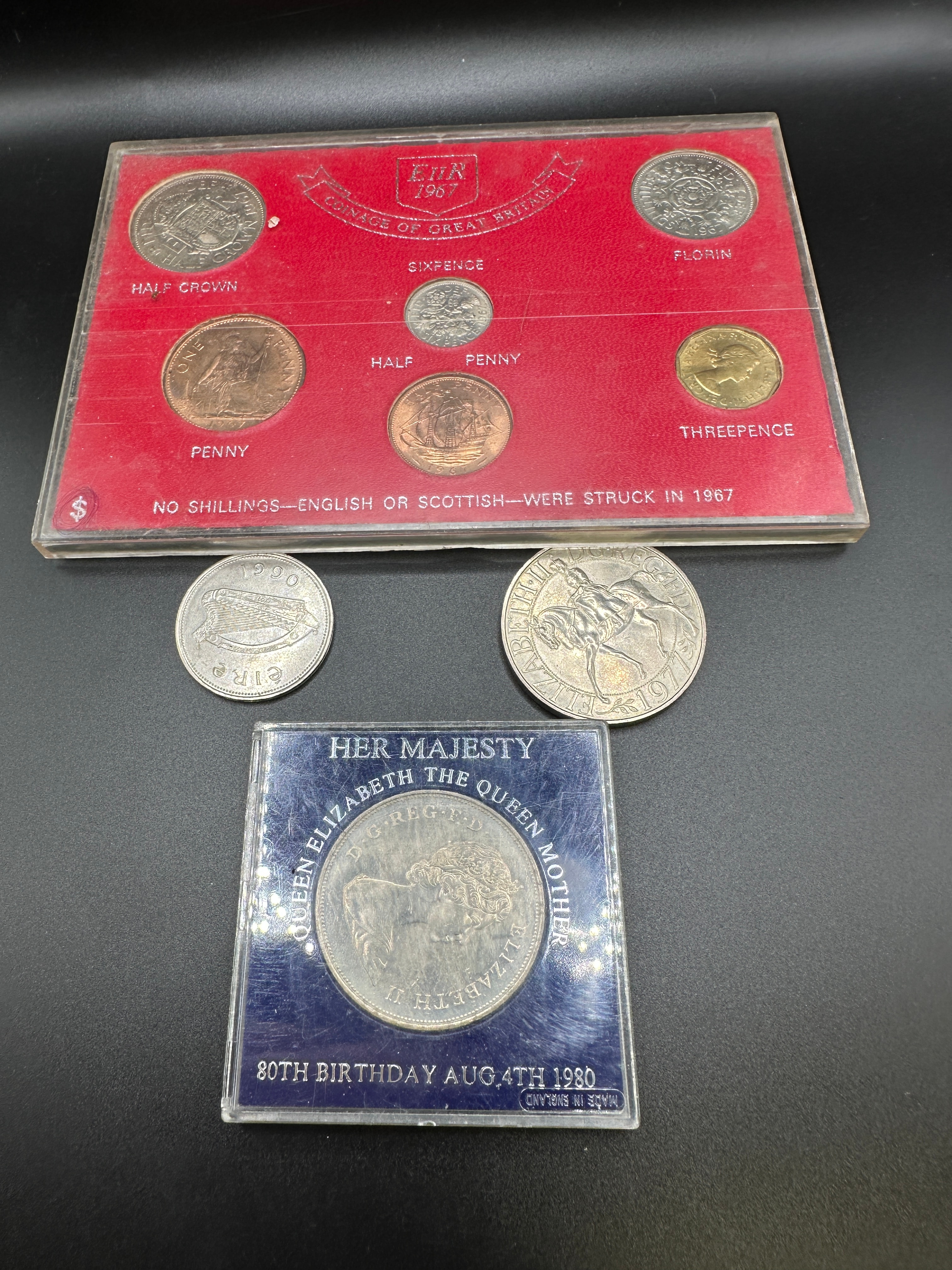 A 1967 Great Britain Pre-Decimal Mint Set, also known as the ‘Farewell to the L.S.D. System Coin Set’. Housed in a red display card with a clear plastic overlay, this set contains six pre-decimal coins: a Half Crown, Florin, Sixpence, Half Penny, Penny, and Threepence. An explanatory note on the card states ‘NO SHILLINGS—ENGLISH OR SCOTTISH—WERE STRUCK IN 1967’. Also included are two loose, circulated, silver-colored coins: one dated 1980 with ‘Ciro’ visible, and another dated 1977 depicting a horse and rider. The collection further comprises a commemorative coin, housed in a clear capsule within a blue cardboard holder, celebrating ‘HER MAJESTY QUEEN ELIZABETH THE QUEEN MOTHER 80TH BIRTHDAY AUG 4TH 1980’ and marked ‘MADE IN ENGLAND’, featuring a royal portrait.