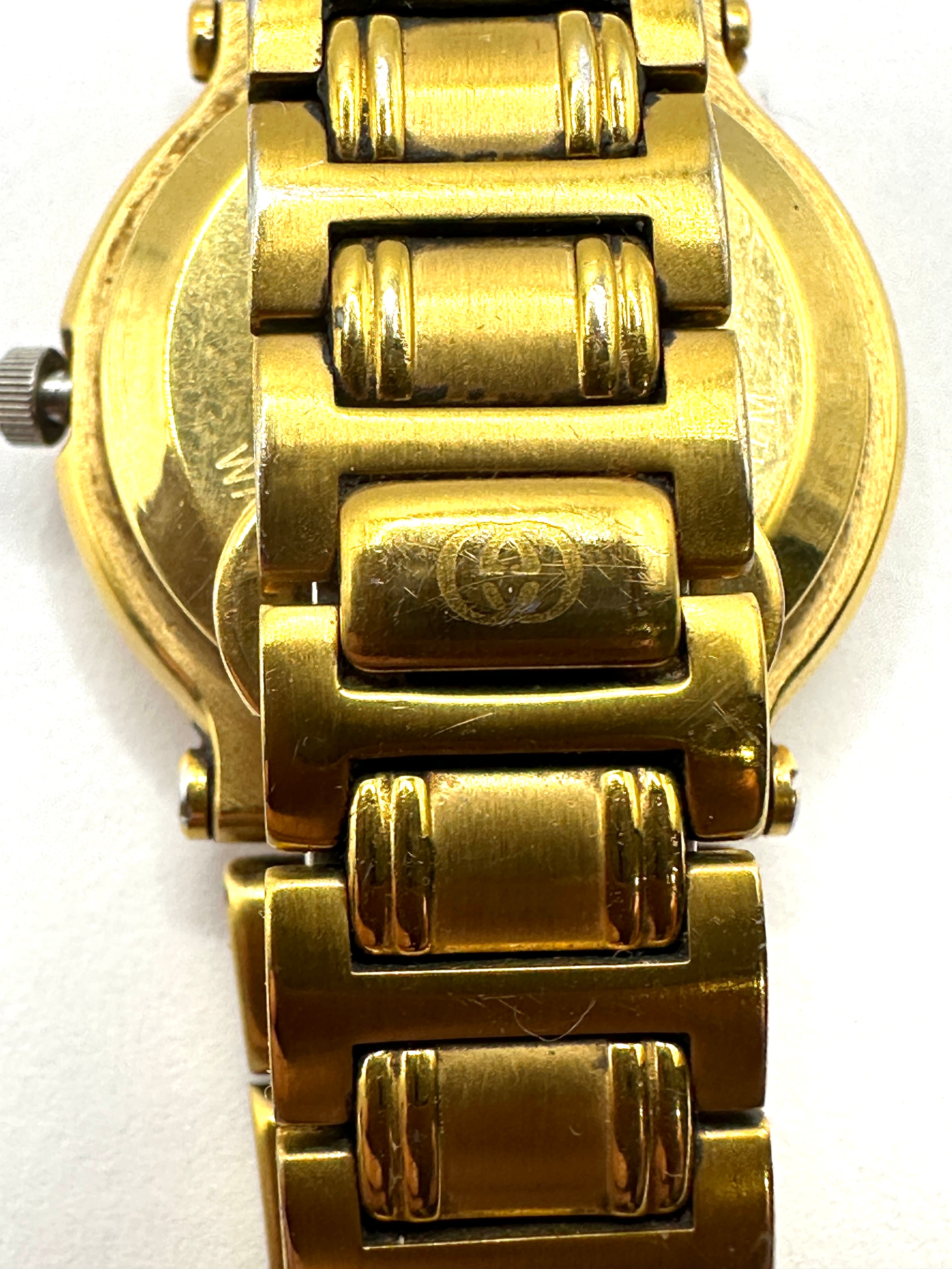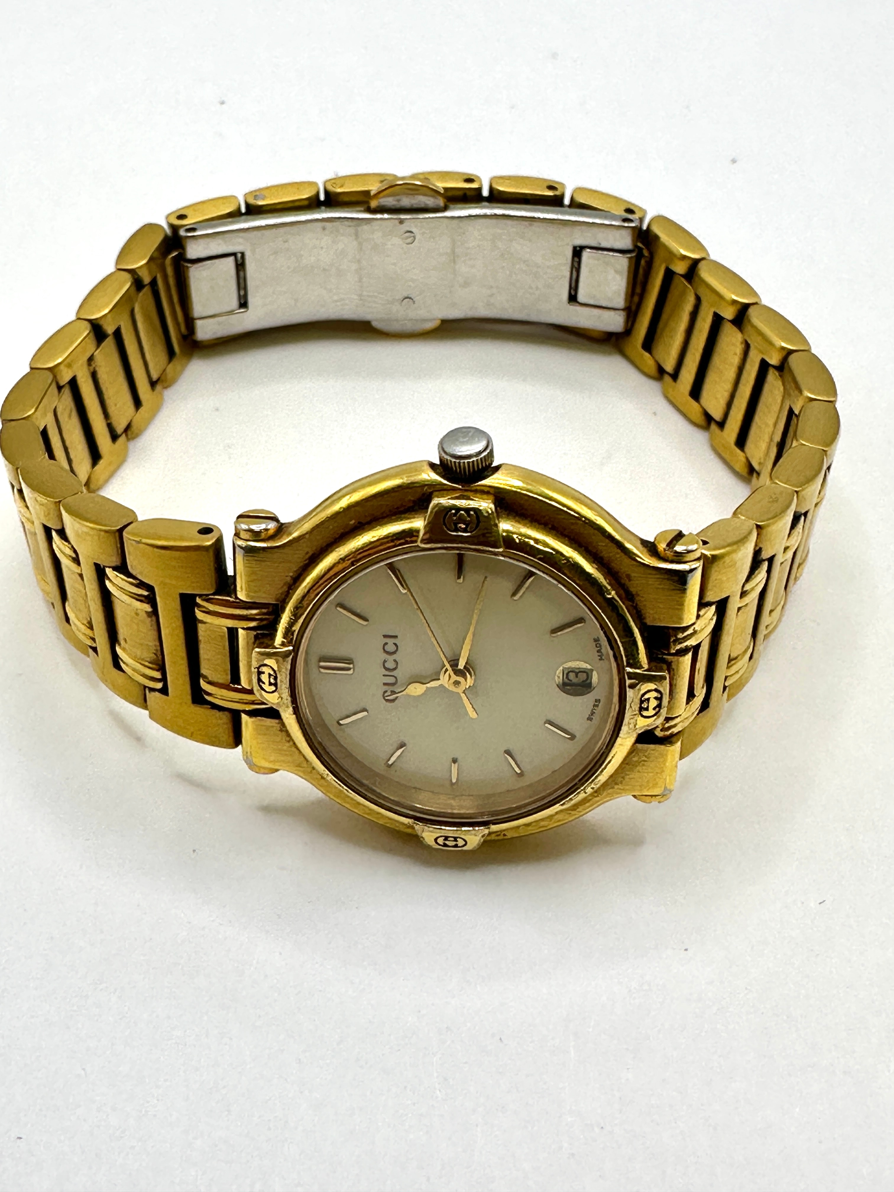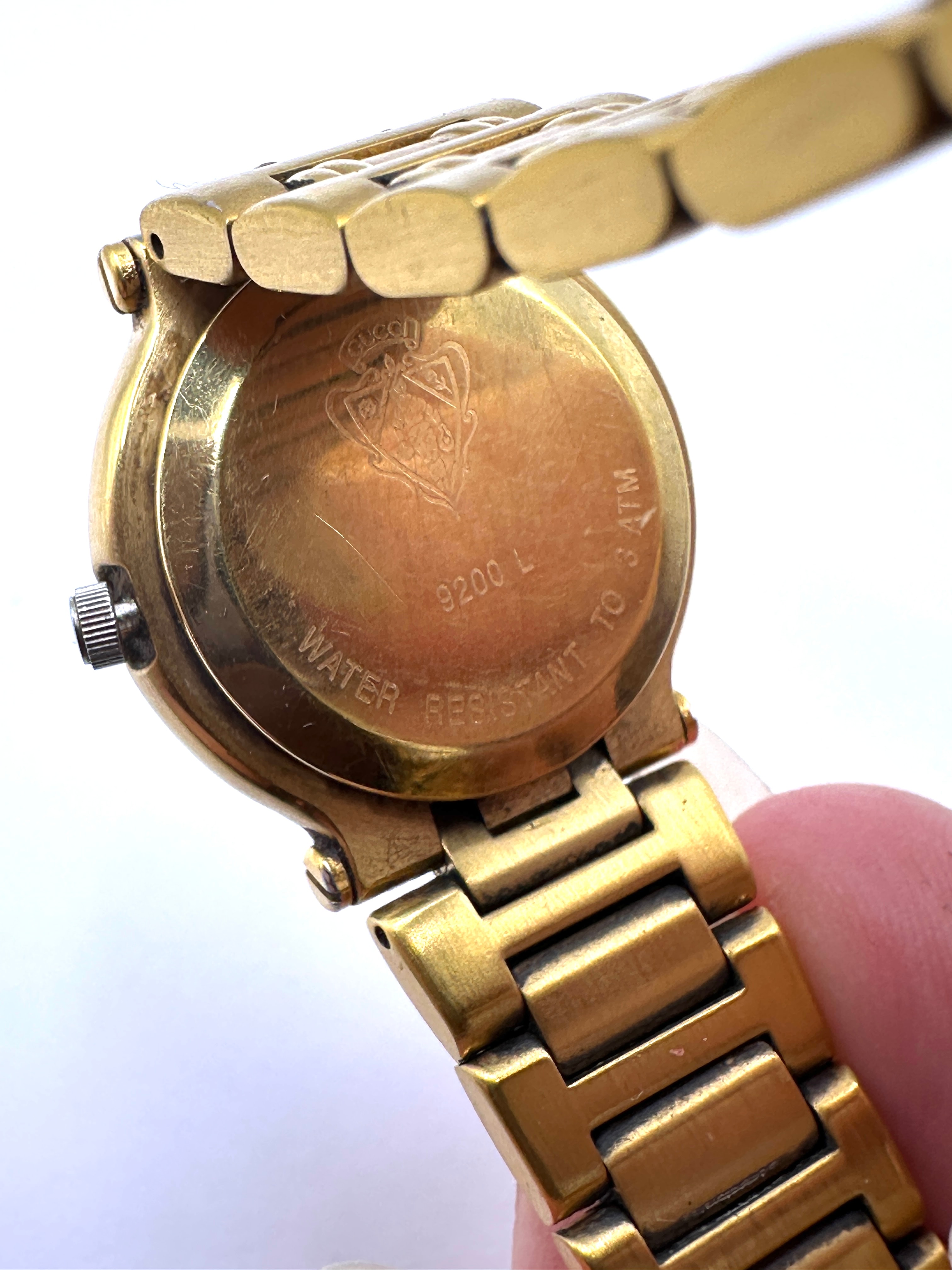 A Gucci 9200L Ladies Gold-Plated Quartz Wristwatch. The watch features a round case with an integrated multi-link bracelet and a deployant clasp. It has a cream-colored dial with gold-tone hands, applied hour markers, and a date window at the 3 o’clock position. The dial is marked “GUCCI” and “SWISS MADE”. The caseback is engraved with the “GUCCI” interlocking G logo, “9200 L”, and “WATER RESISTANT TO 3 ATM”. An embossed “GUCCI” logo is visible on a bracelet link.