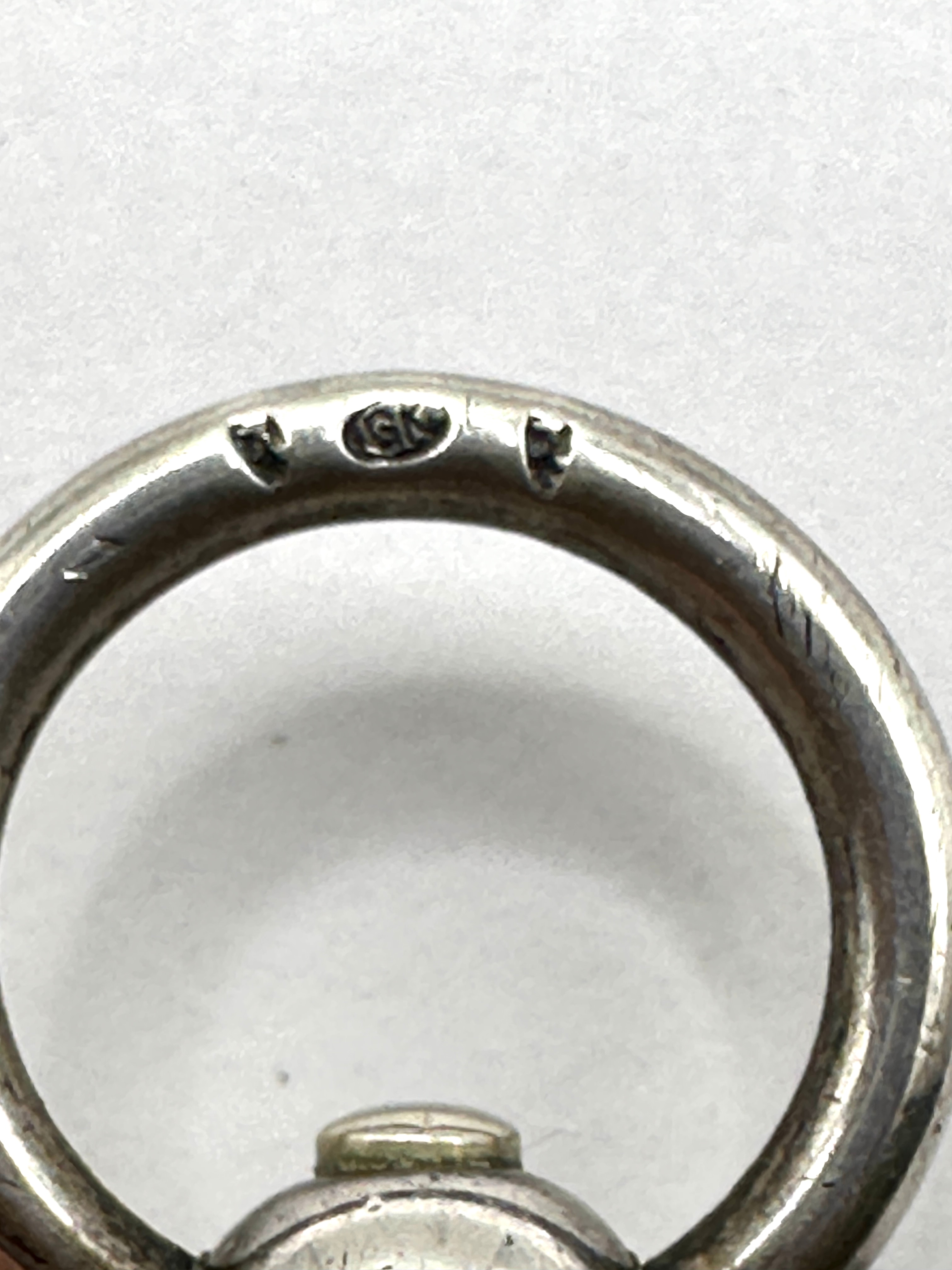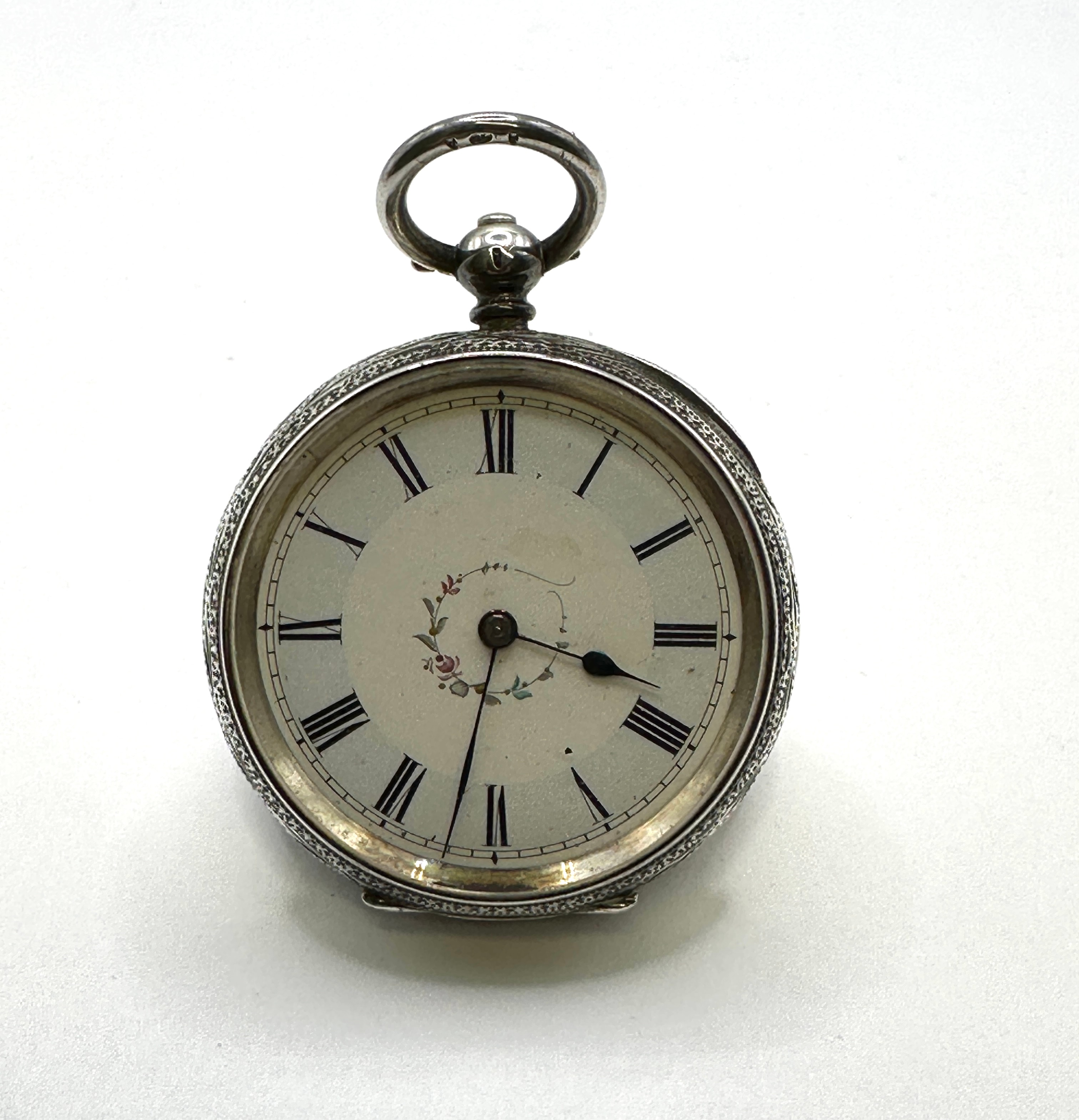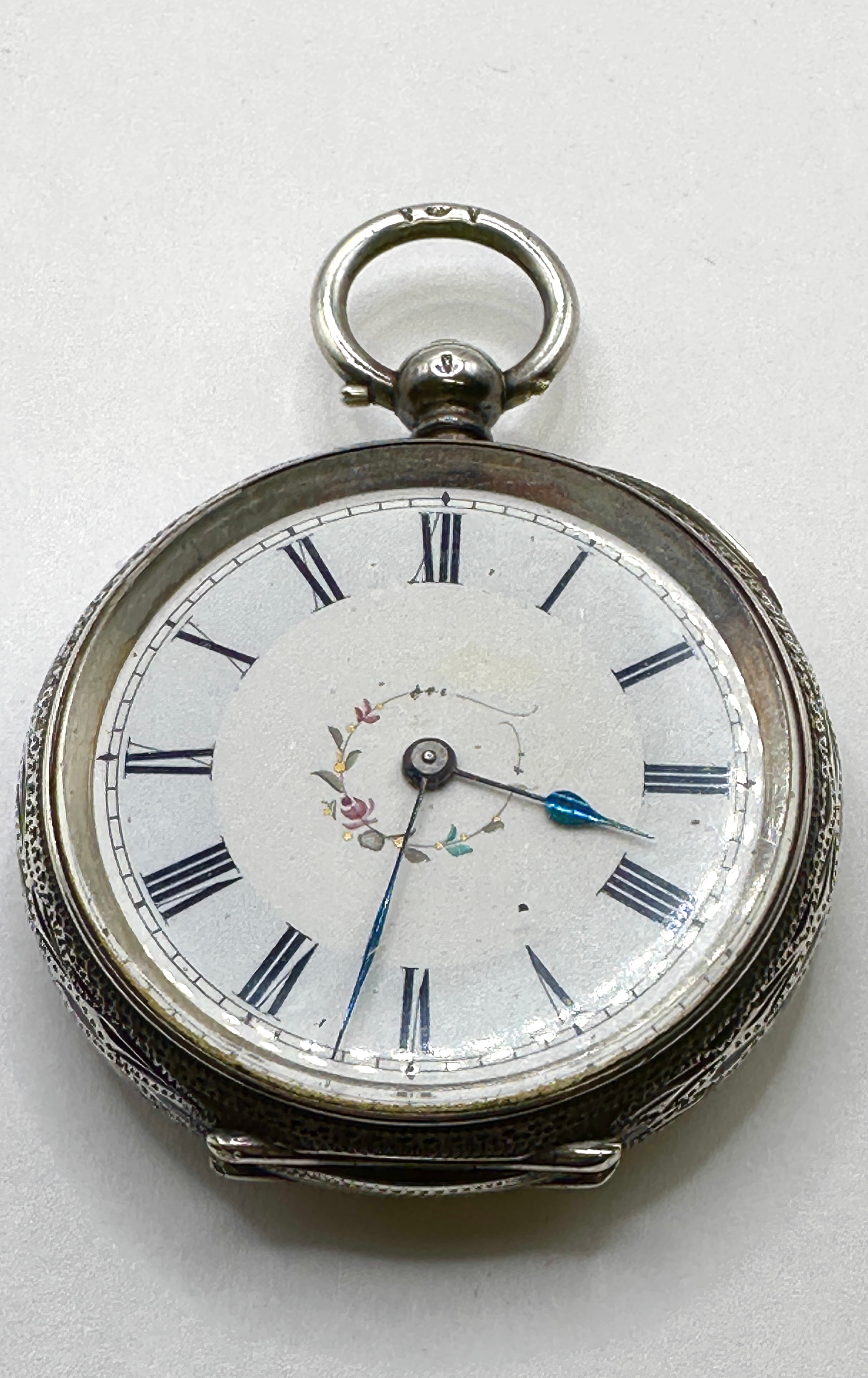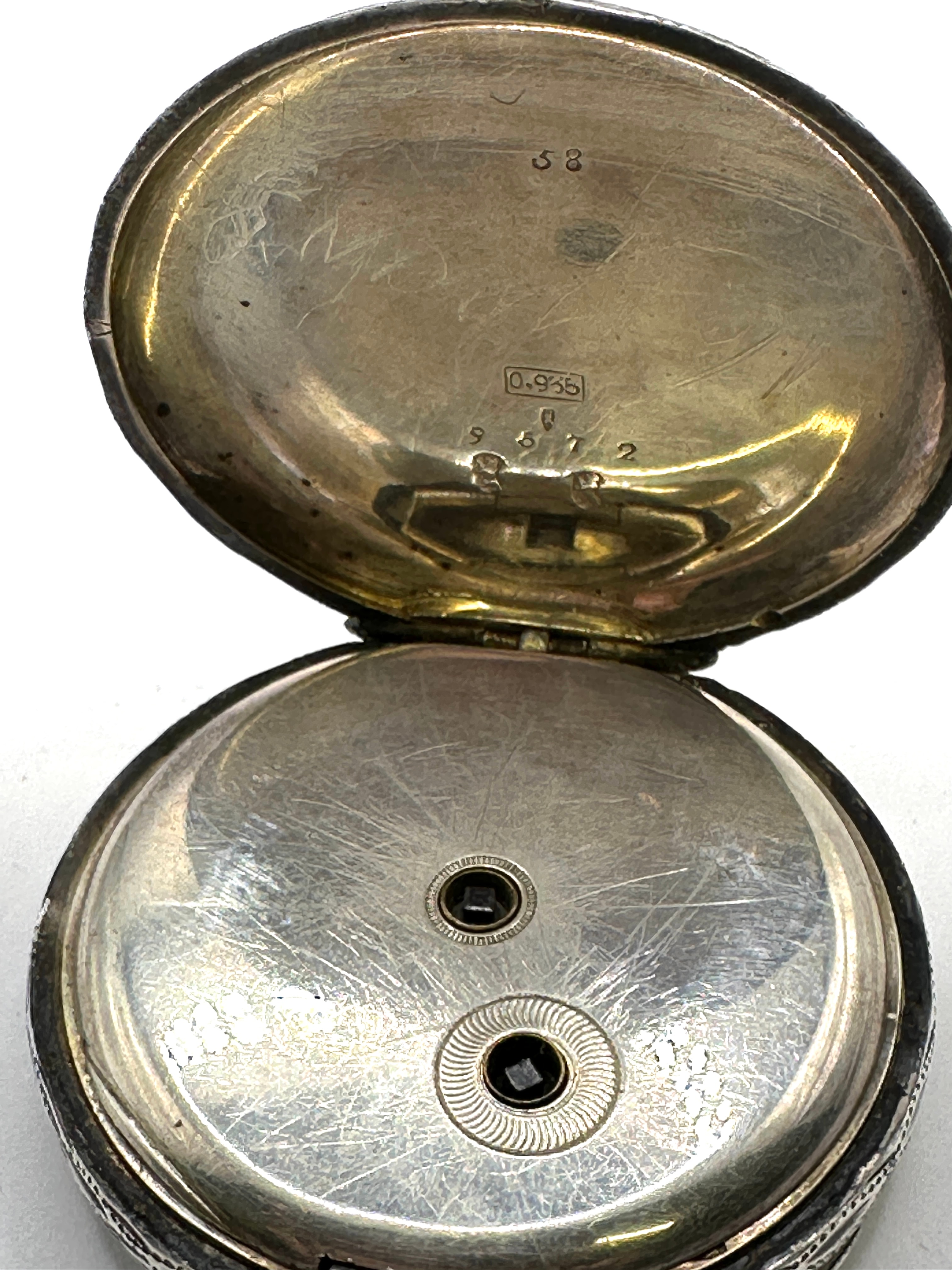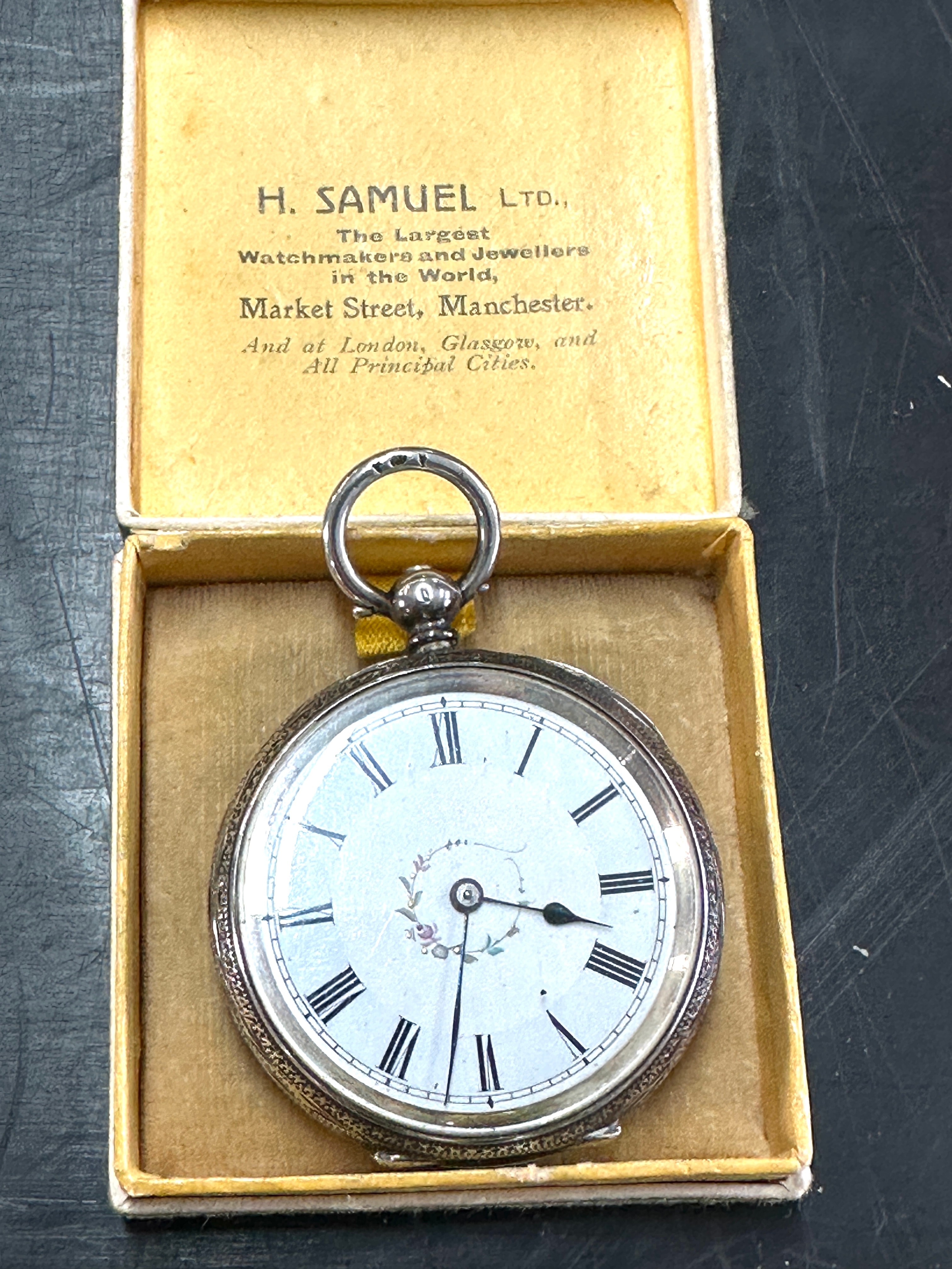 An antique 935 silver pocket watch, likely Swiss, featuring bear hallmarks. The circular hinged silver case is internally marked with a ‘0.935’ purity standard and case numbers ’53’ and ‘9872’. Further hallmarks, including an ‘SK’ maker’s mark and two animal heads (consistent with bear hallmarks), are visible on the suspension bail. The white dial, likely enamel, features black Roman numeral hour markers and a delicate hand-painted floral motif in the center, complemented by a black and a blued-steel hand. An inner hinged metal cover protects the movement. The case exhibits ornate decorative chasing or engraving around the bezel. The watch is presented in an original retail box from ‘H. SAMUEL LTD., The Largest Watchmakers and Jewellers in the World, Market Street, Manchester. And at London, Glasgow, and All Principal Cities,’ providing context for its British retail origin.