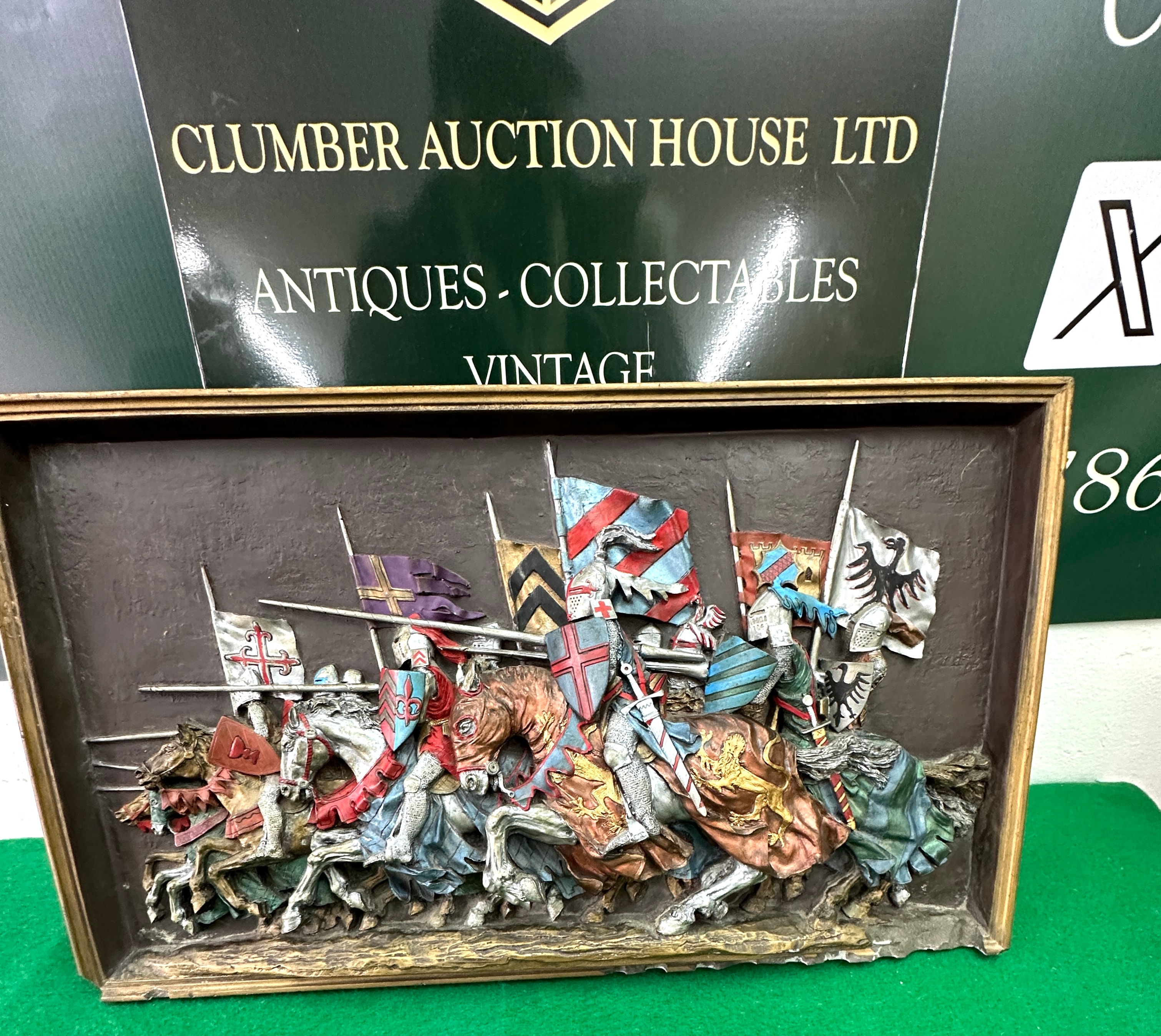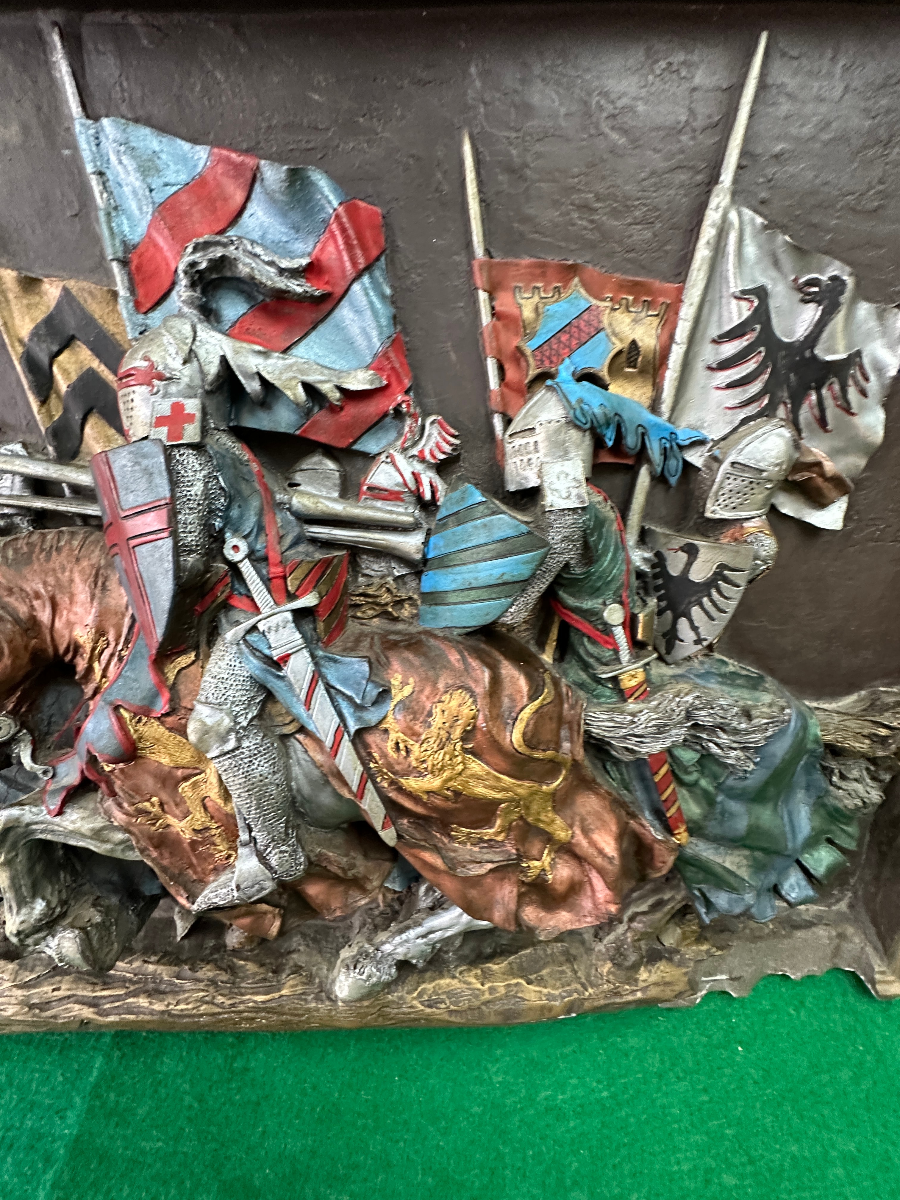 A Marcus Designs “The Charge” Medieval Wall Plaque. This high-relief decorative plaque depicts a dynamic scene of medieval knights on horseback, each bearing distinct shields and flags with heraldic devices. Crafted from a cast resin or composite material, it features a textured dark background with the figures rendered in various painted colors, simulating metallic armor, fabric, and flesh tones. The overall style evokes a historical or medieval revival aesthetic. The piece is enclosed in a rectangular frame with a warm, possibly faux-bronze finish.