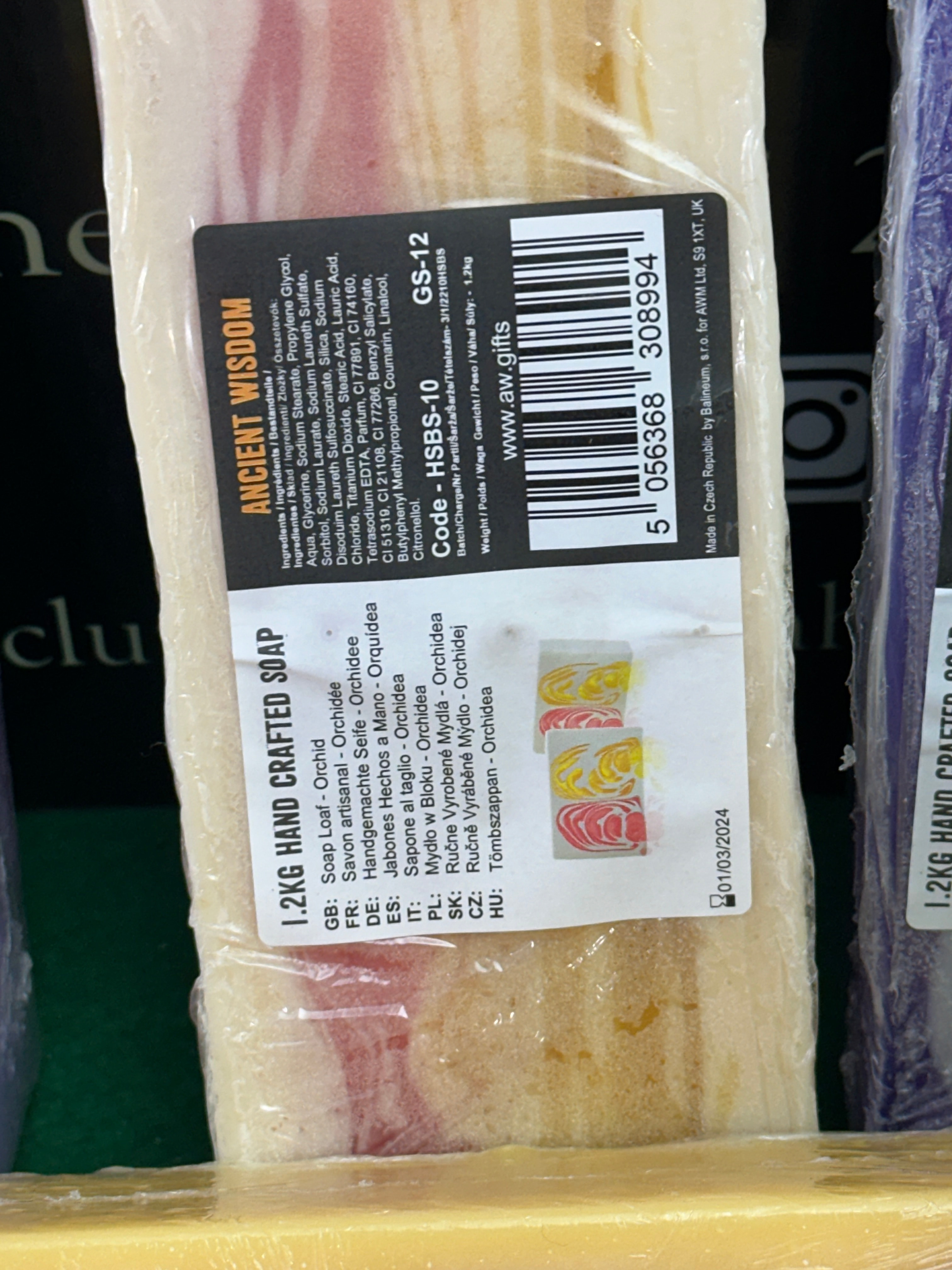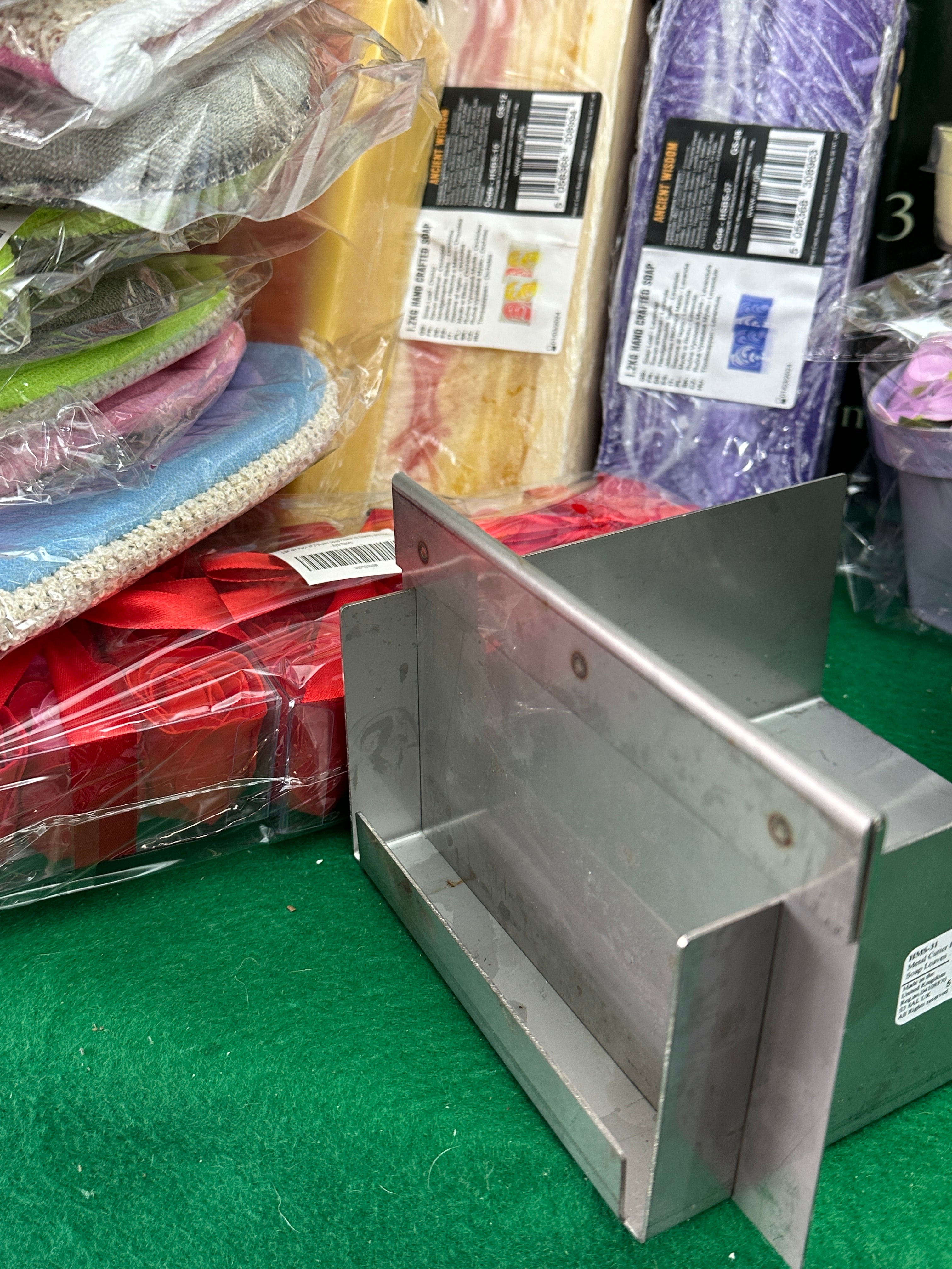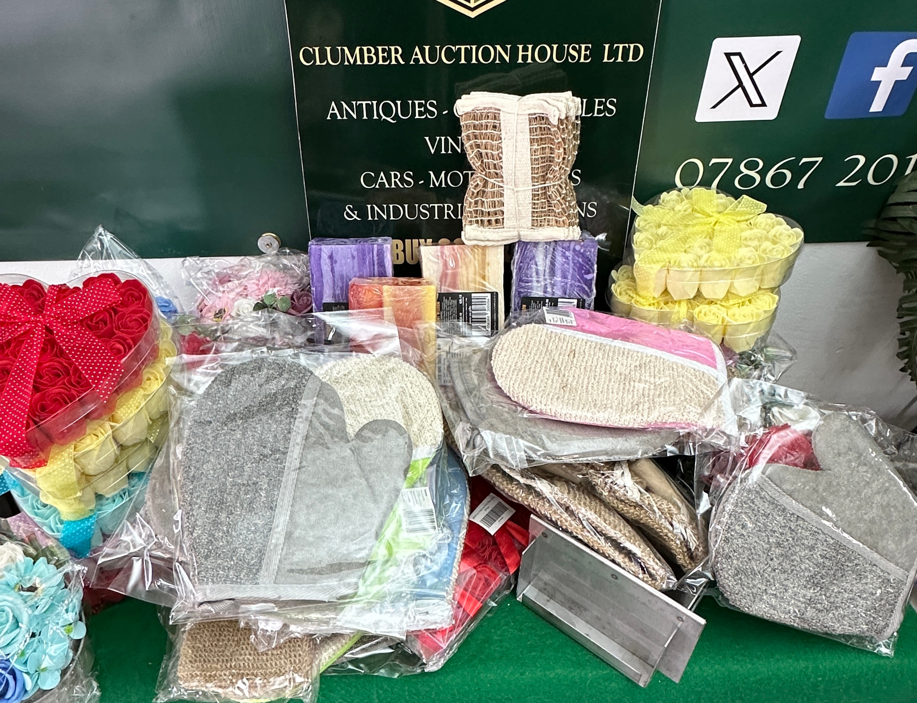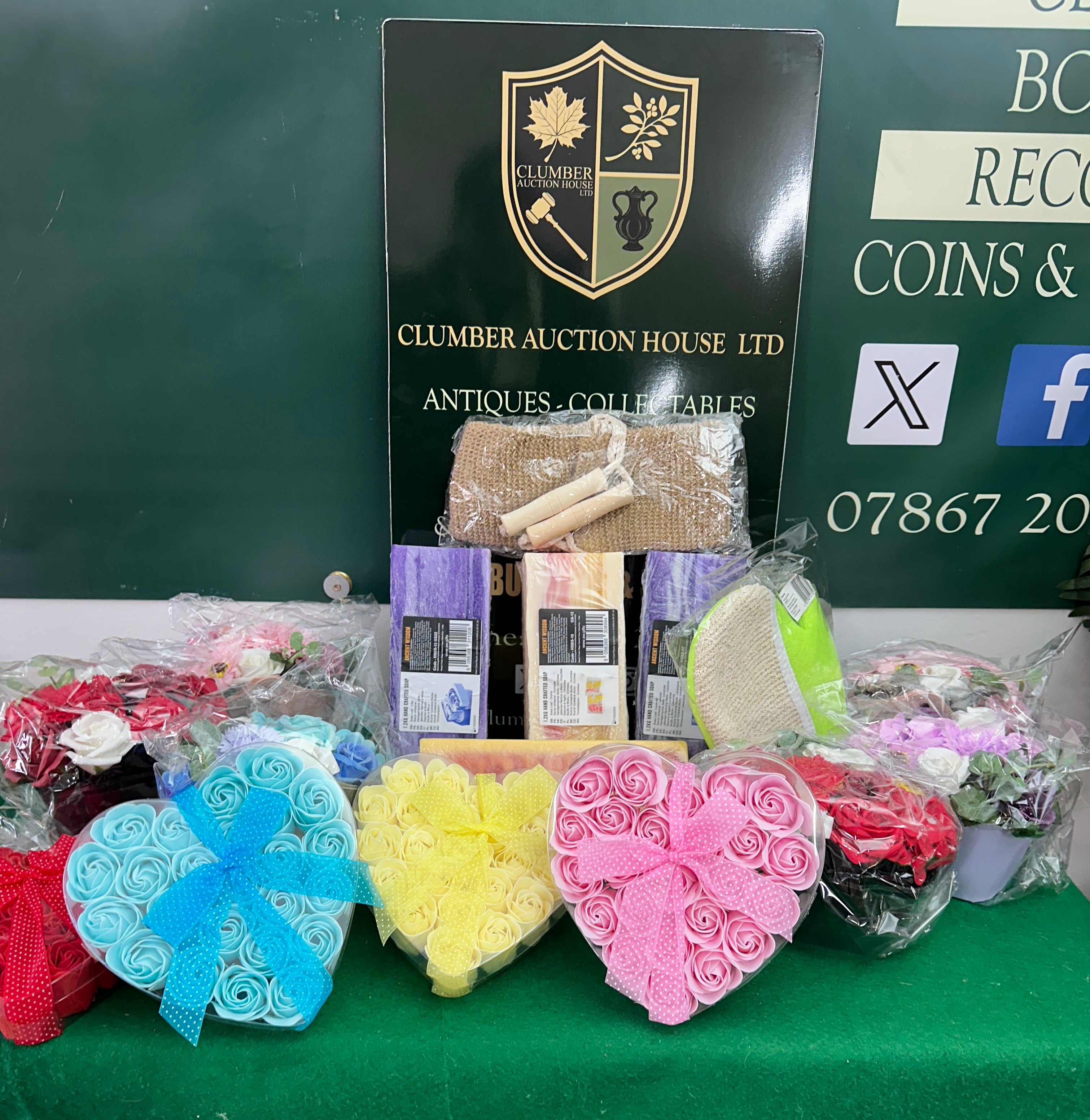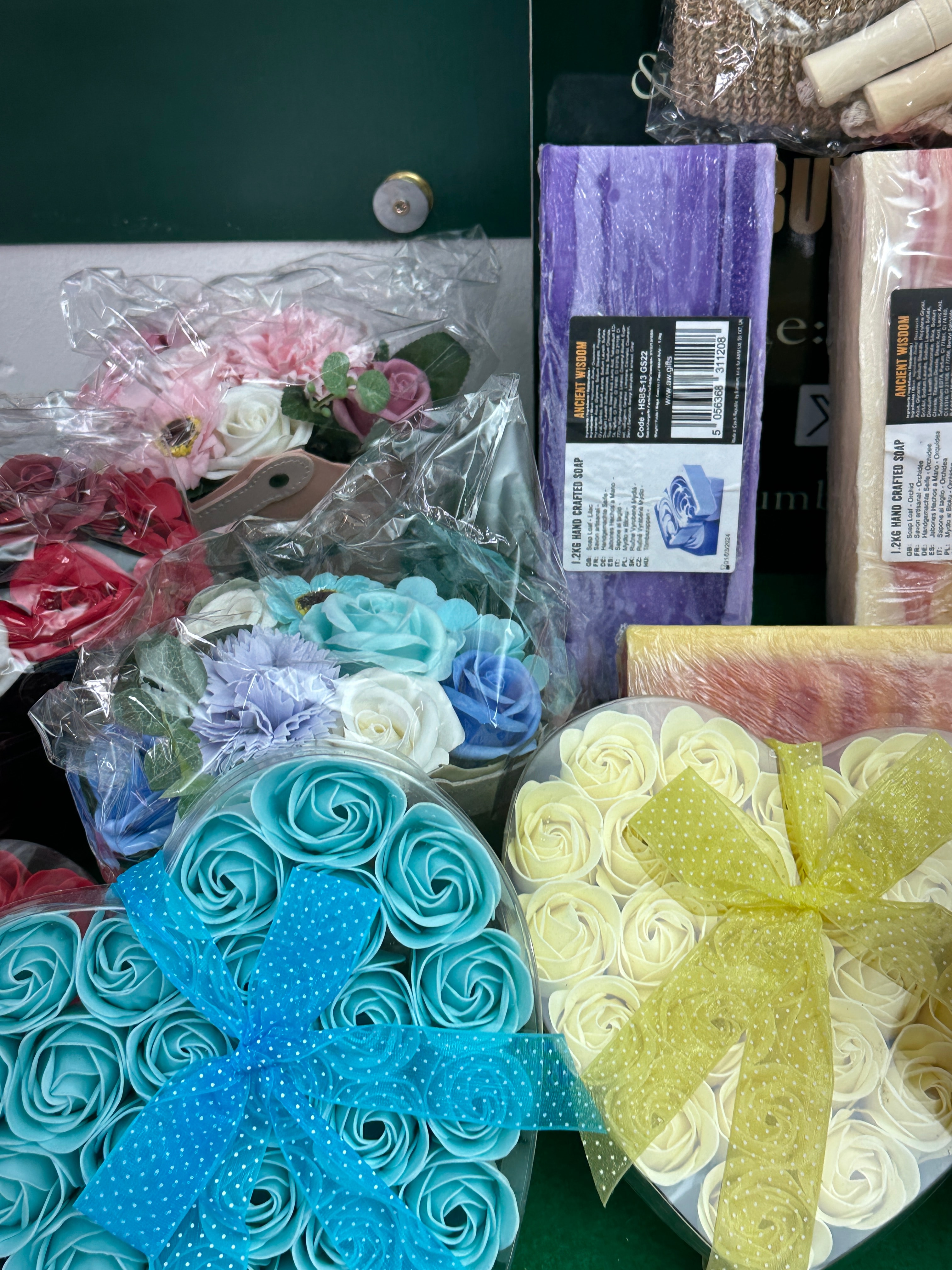 This lot presents a collection of new, contemporary bath and body care products and accessories. It includes a group of large, plastic-wrapped 1.2kg blocks of “ANCIENT WISDOM” hand-crafted soap, primarily in “Orchid” scent. These soaps feature labels indicating manufacture in the Czech Republic for a UK company and have a best-before date of 01/03/2024. Also included is a collection of heart-shaped clear plastic boxes filled with decorative, rose-shaped soap flowers, consistent with “Rose Soap Favors,” in various colors such as red, blue, yellow, and pink, each adorned with a ribbon. The collection further comprises a group of individually packaged bath accessories, including scrubbing mitts, sponges, and loofahs made of textiles and plastic. The lot also contains a metallic soap cutter or mold and a burlap bag containing small wooden items.