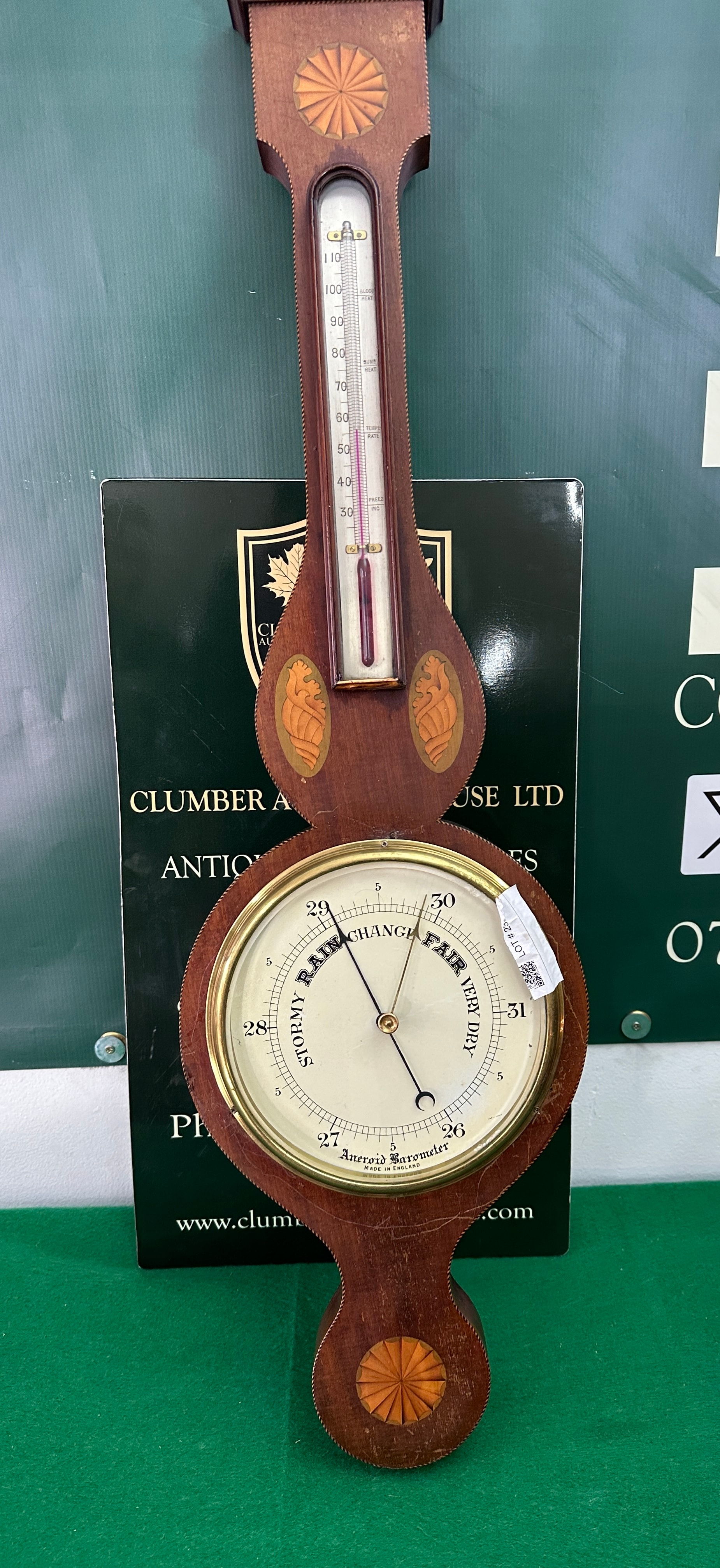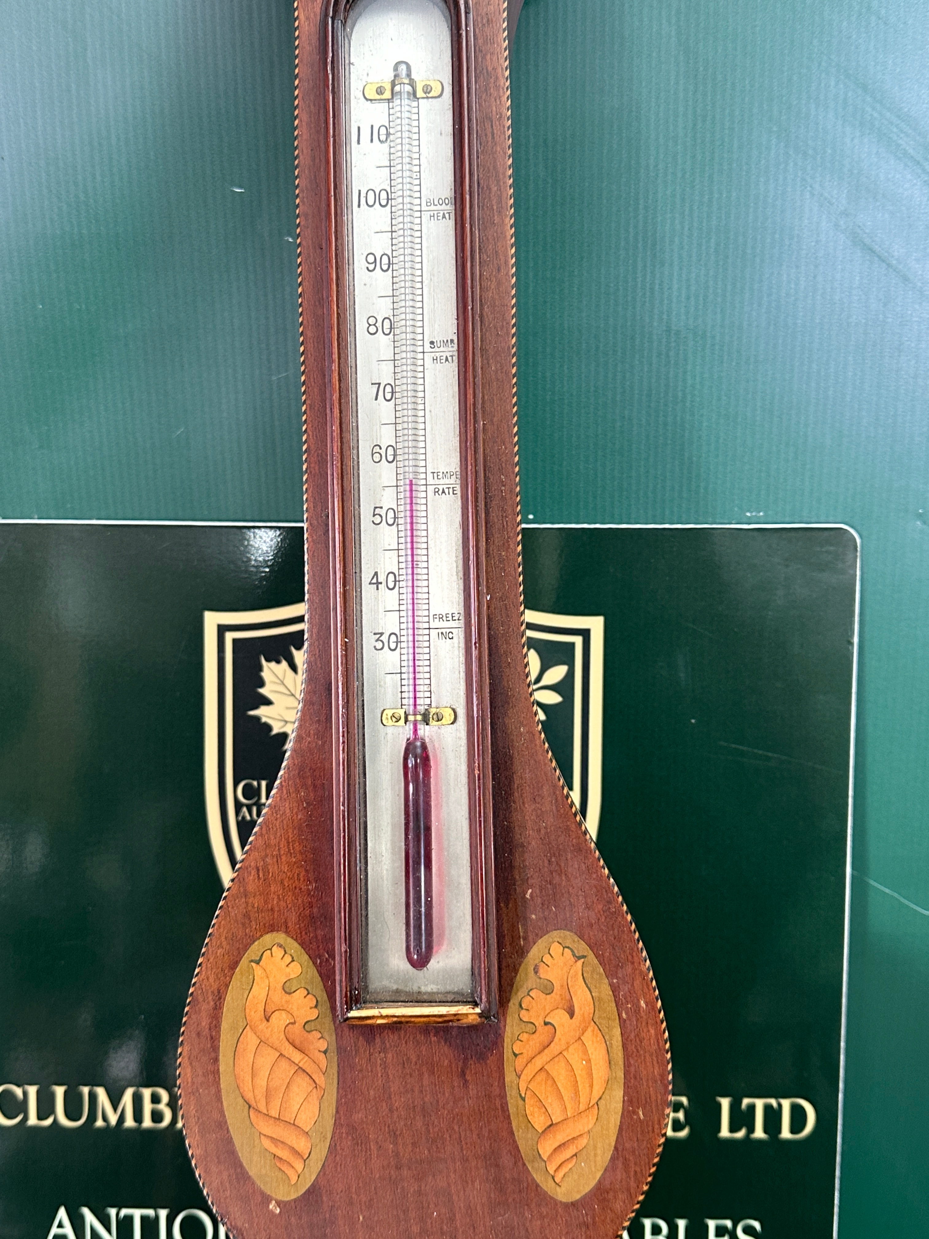 An Airguide Mahogany Banjo Style Barometer Weather Station, a vintage banjo-shaped aneroid barometer and thermometer combination. Crafted from polished dark wood, likely mahogany, it features decorative light wood inlay in a fan motif at the top and base, and stylized shell or leaf forms flanking the thermometer. The mercury or alcohol thermometer, displaying a reddish-purple liquid, shows Fahrenheit readings from 30 to 110, marked with older terms such as “Blood Heat,” “Sumr Heat” (Summer Heat), “Temperate,” and “Freezing.” The lower circular aneroid barometer, set within a brass bezel, indicates atmospheric pressure from 26 to 31 and is inscribed with weather conditions: “STORMY,” “RAIN,” “CHANGE,” “FAIR,” and “VERY DRY,” along with the designation “Aneroid Barometer” and “MADE IN ENGLAND.”