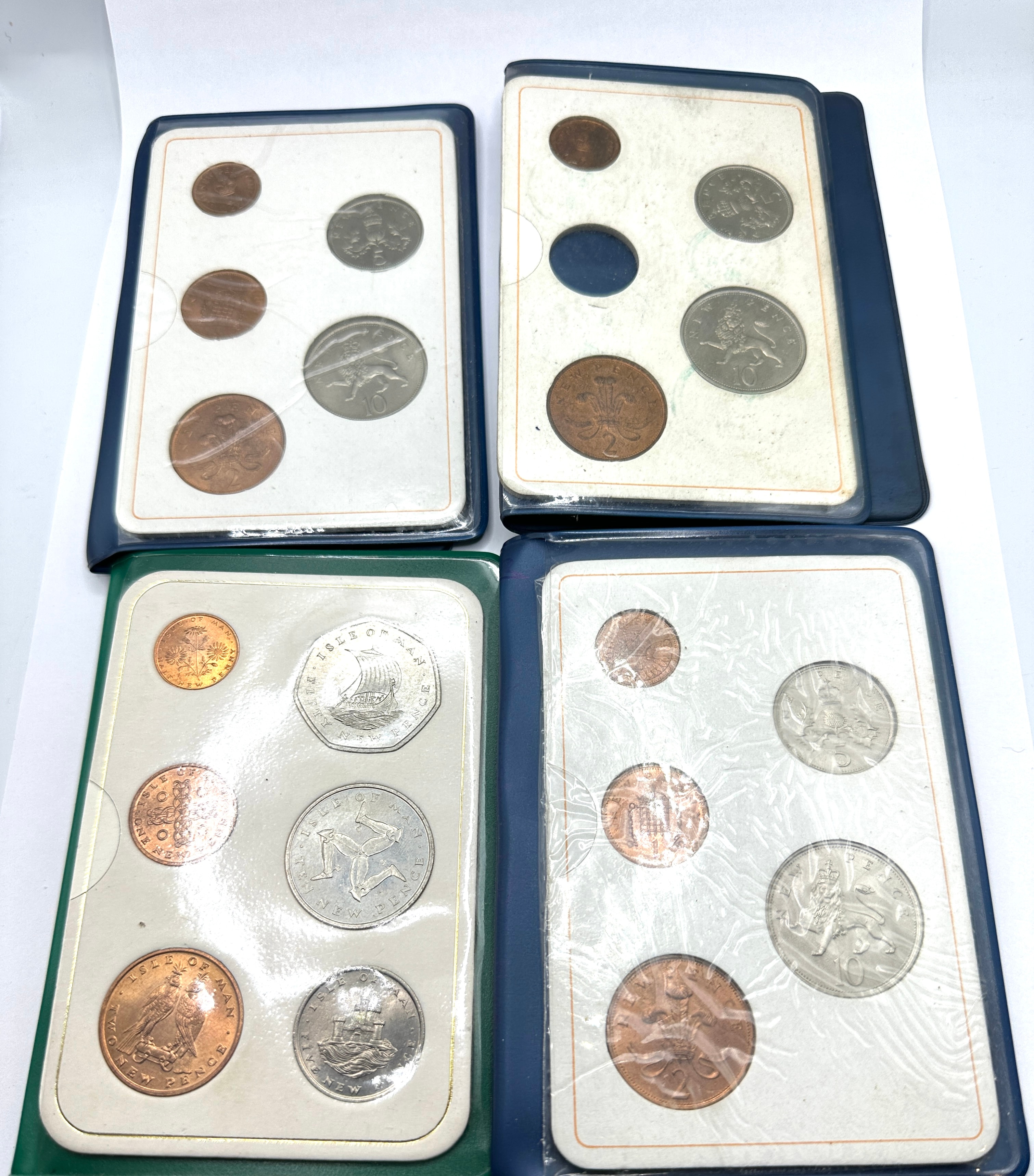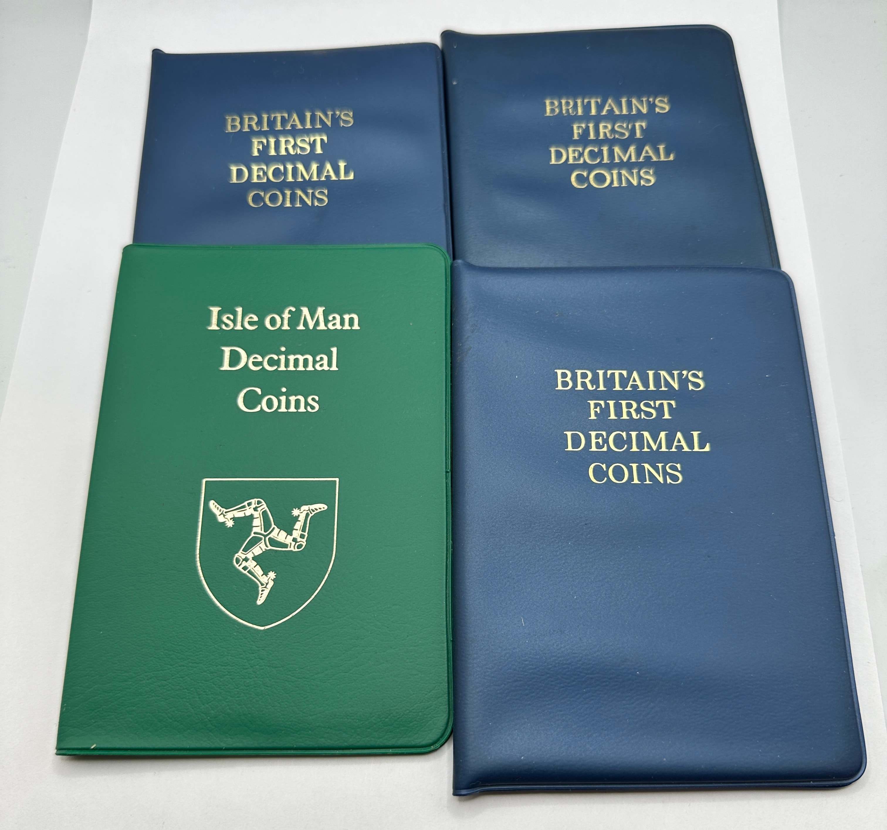 A collection of four compact coin collection albums. Three albums feature blue faux leather or vinyl covers titled “BRITAIN’S FIRST DECIMAL COINS,” and one album has a green cover titled “Isle of Man Decimal Coins” with a triskelion emblem. Each album contains sets of various base metal decimal coins, likely dating from the early 1970s, presented within individual plastic sleeves on cardboard inserts. The coins are generally well-preserved.