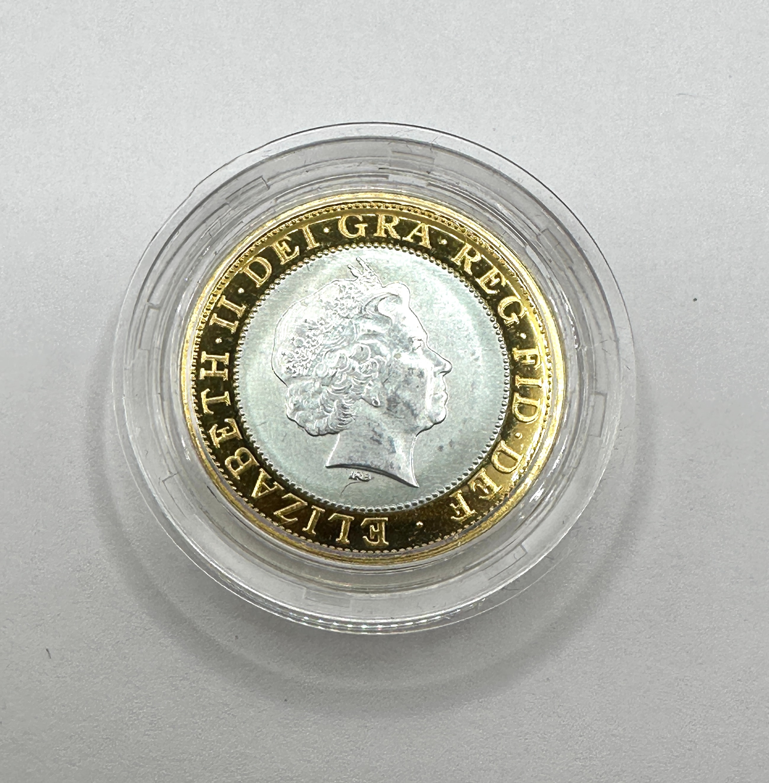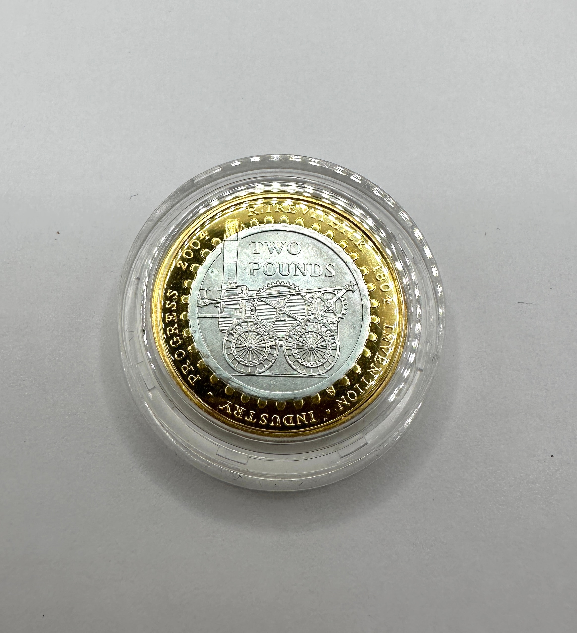 A Royal Mint Richard Trevithick Steam Locomotive £2 Bimetallic Coin, issued in 2004. The coin is housed within a clear plastic protective capsule. The obverse features a right-facing portrait of Queen Elizabeth II, encircled by the inscription “ELIZABETH II D G REG F D.” The reverse depicts an early steam locomotive, with the denomination “TWO POUNDS” inscribed above the engine. The outer ring of the reverse includes the text “PROGRESS • 2003 • INDUSTRY • 1804 • INVENTION,” commemorating 200 years of industrial invention.