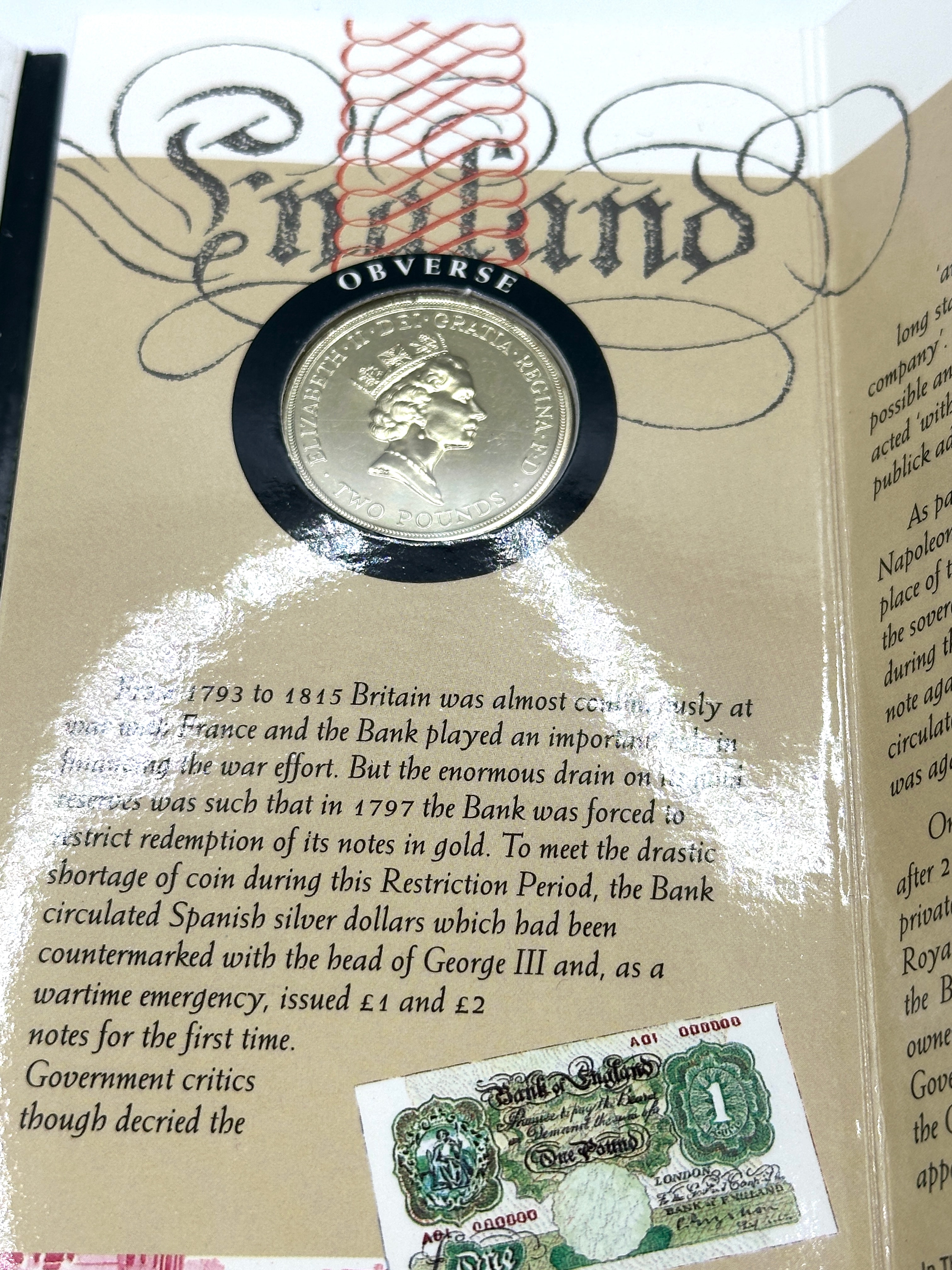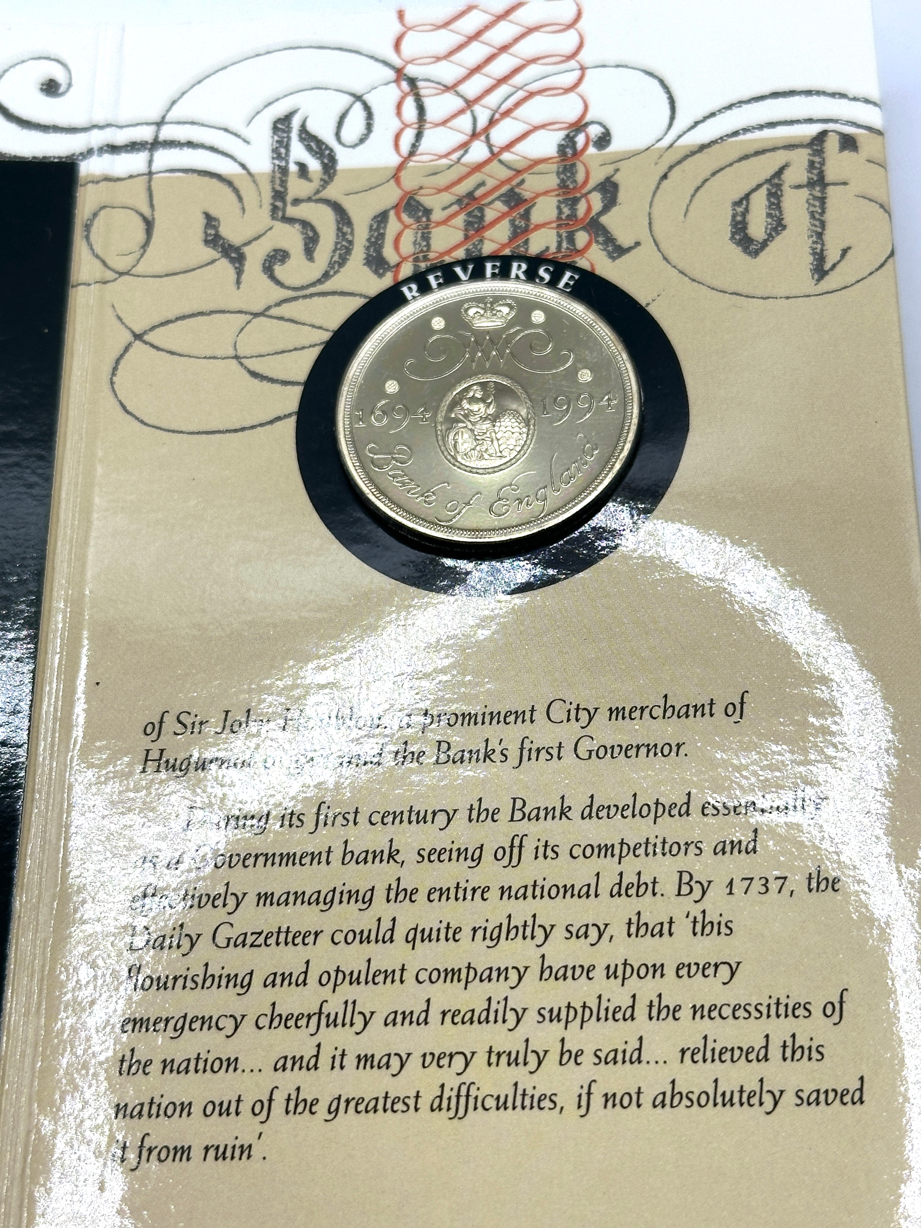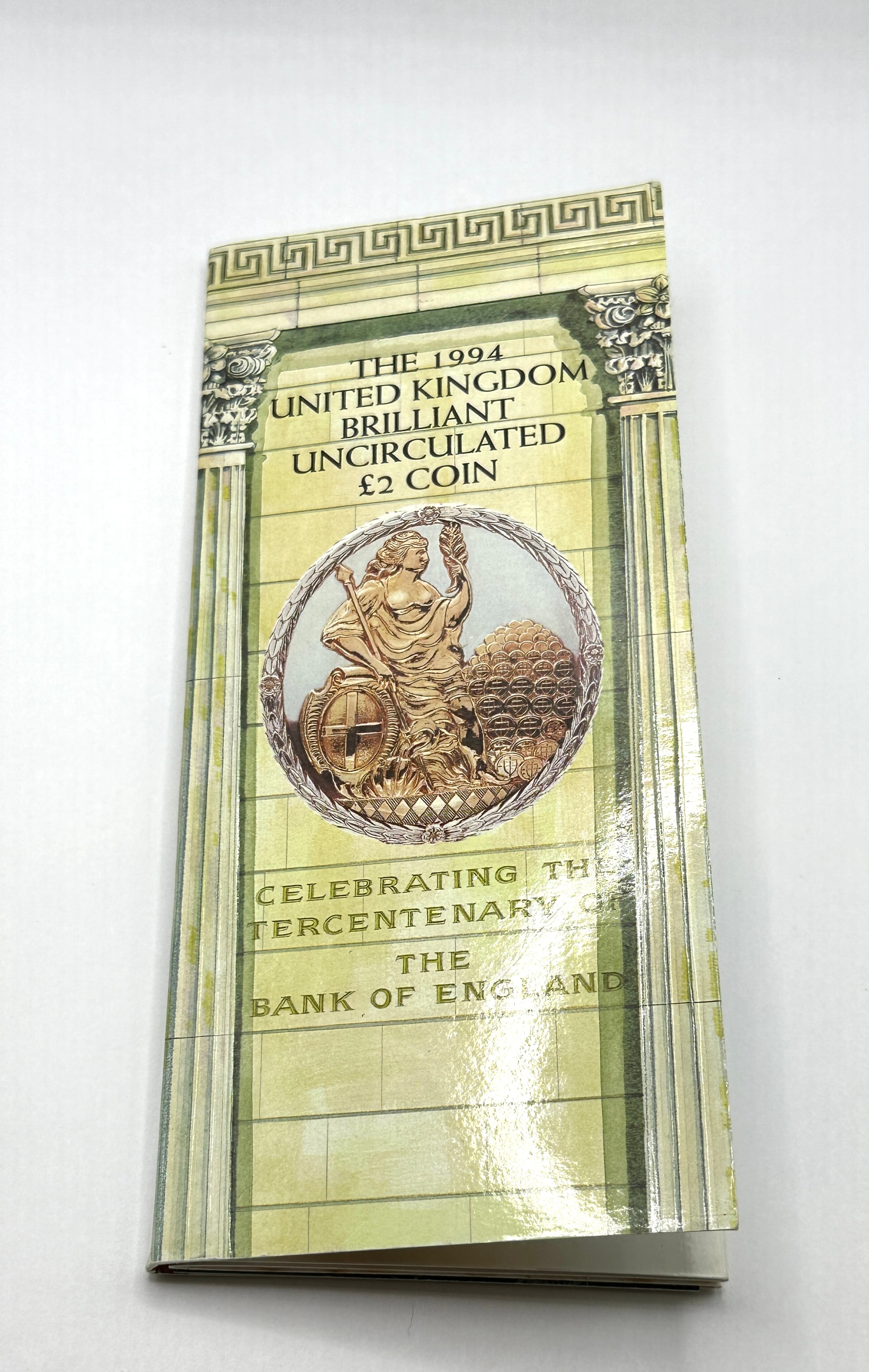 A 1994 United Kingdom Royal Mint Brilliant Uncirculated £2 coin, commemorating the Tercentenary of the Bank of England. The bi-metallic coin is presented within its original commemorative cardboard presentation folder. The folder’s exterior features a classical architectural design with columns and a Greek key border, framing an allegorical illustration of a seated figure with riches. It is clearly marked “THE 1994 UNITED KINGDOM BRILLIANT UNCIRCULATED £2 COIN CELEBRATING THE TERCENTENARY OF THE BANK OF ENGLAND.” The coin’s reverse displays the dates “1694” and “1994” alongside “Bank of England” and a crown design. The obverse features the portrait of “ELIZABETH II D G REG F D” and “TWO POUNDS.” The interior pages of the folder provide historical context related to the Bank of England, including an illustration of an older one-pound banknote.