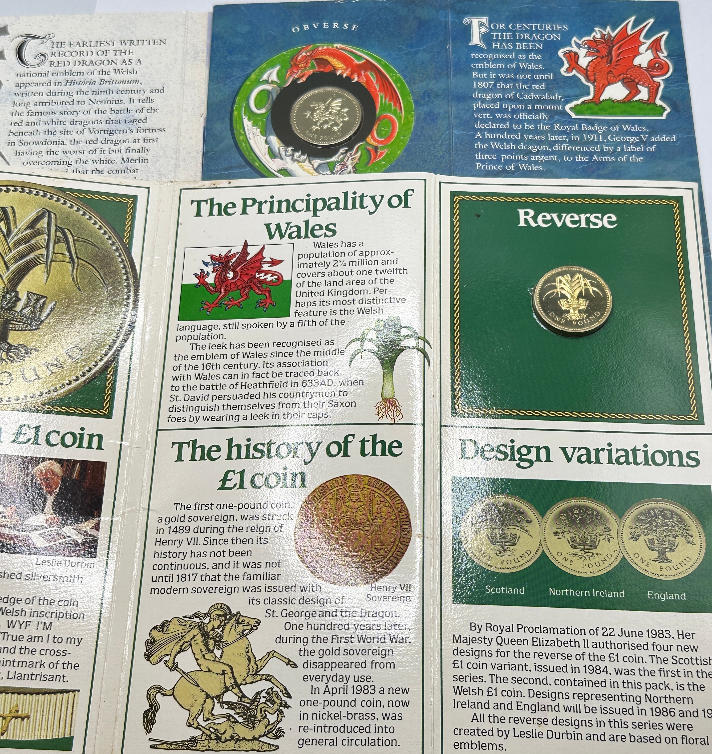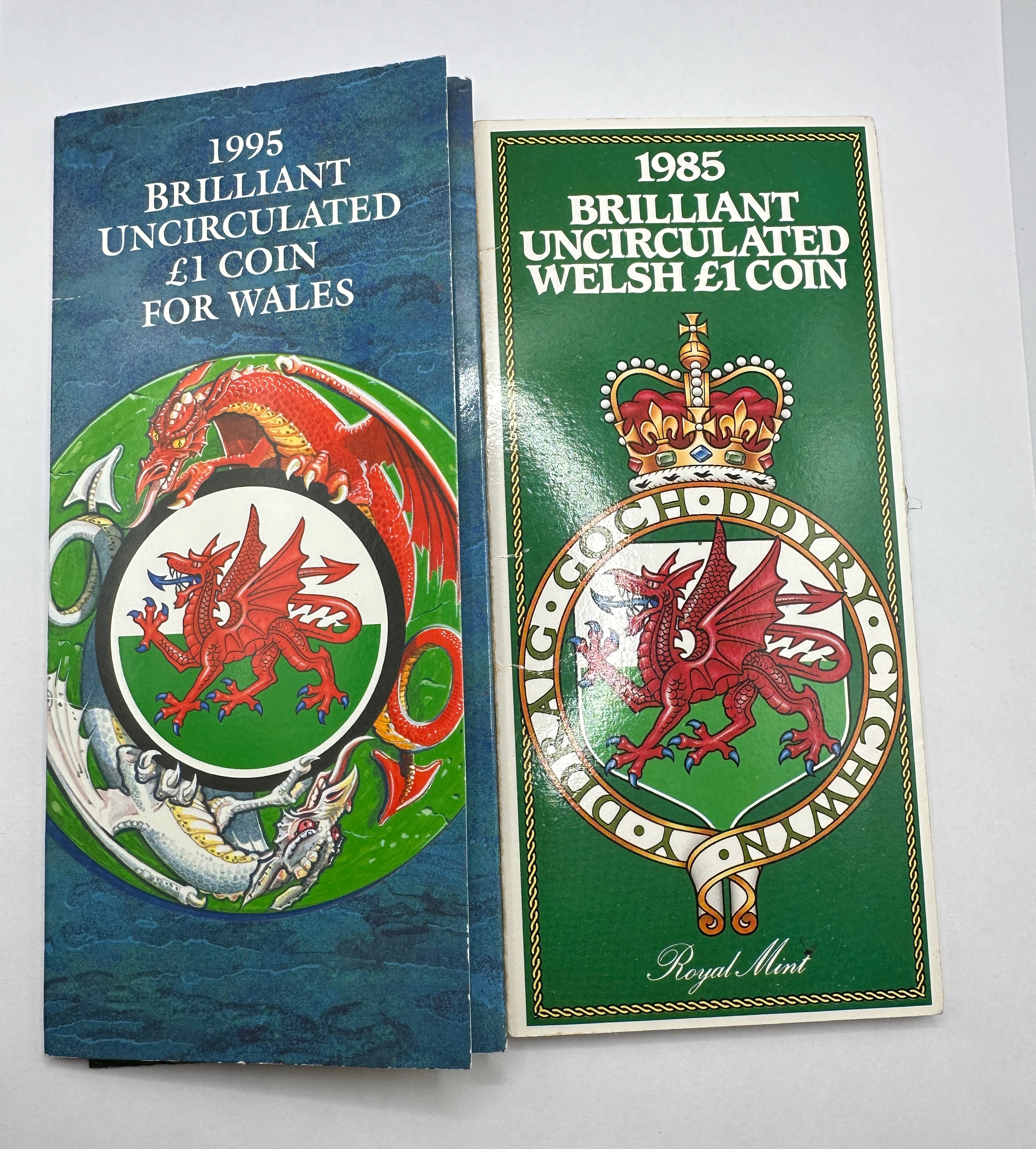 This lot comprises two Royal Mint commemorative presentation folders, each housing a Brilliant Uncirculated £1 Coin. The folder dated 1995 is titled “BRILLIANT UNCIRCULATED £1 COIN FOR WALES” and features an elaborate illustration of a red Welsh dragon. The folder dated 1985 is titled “BRILLIANT UNCIRCULATED WELSH £1 COIN” and showcases a crowned Welsh dragon design with the motto “PLEIDIOL WYF I’M GWLAD” (True am I to my country) encircling it. Both folders include educational content regarding the history, design, and variations of the £1 coin series, with depictions of the obverse and reverse sides.