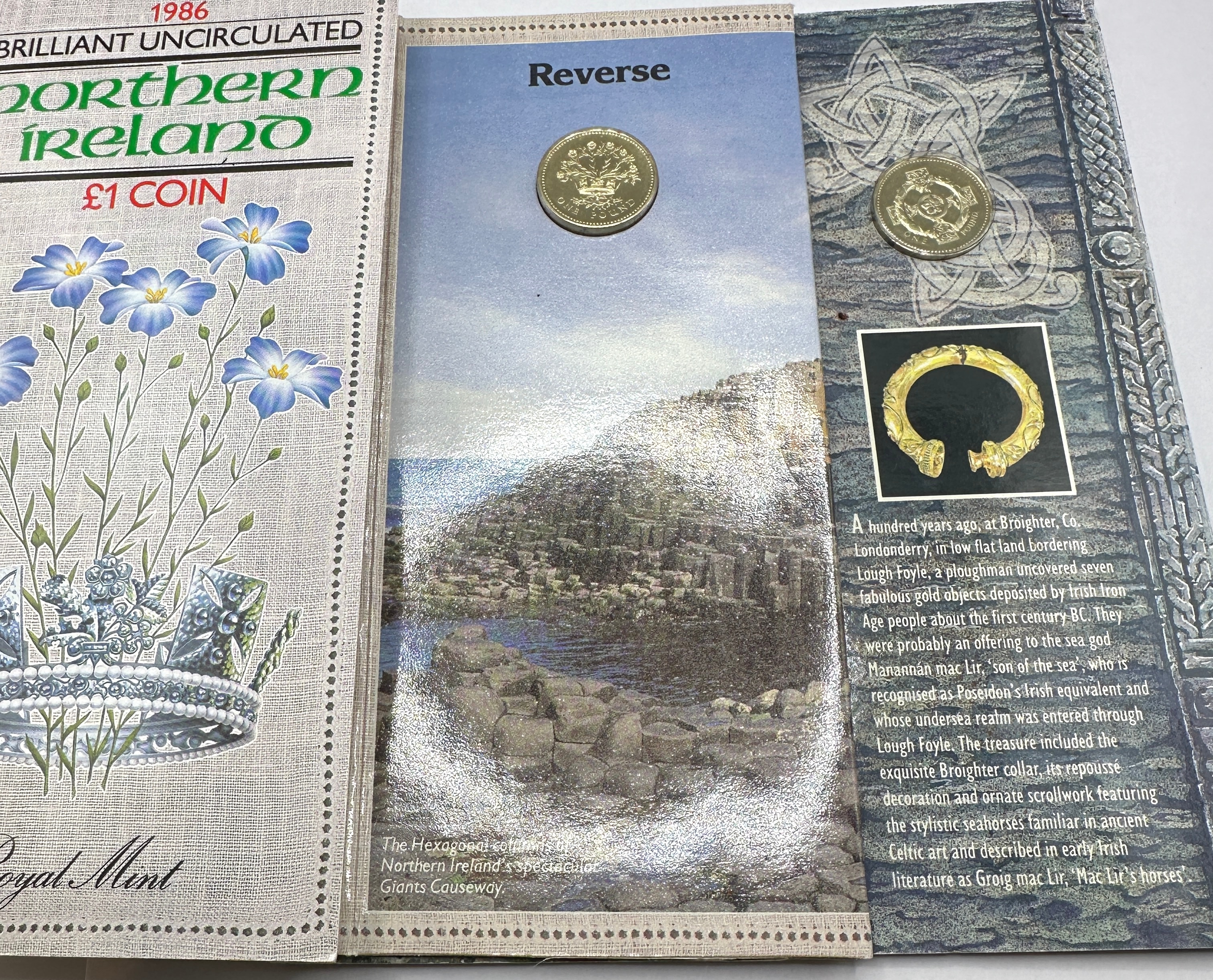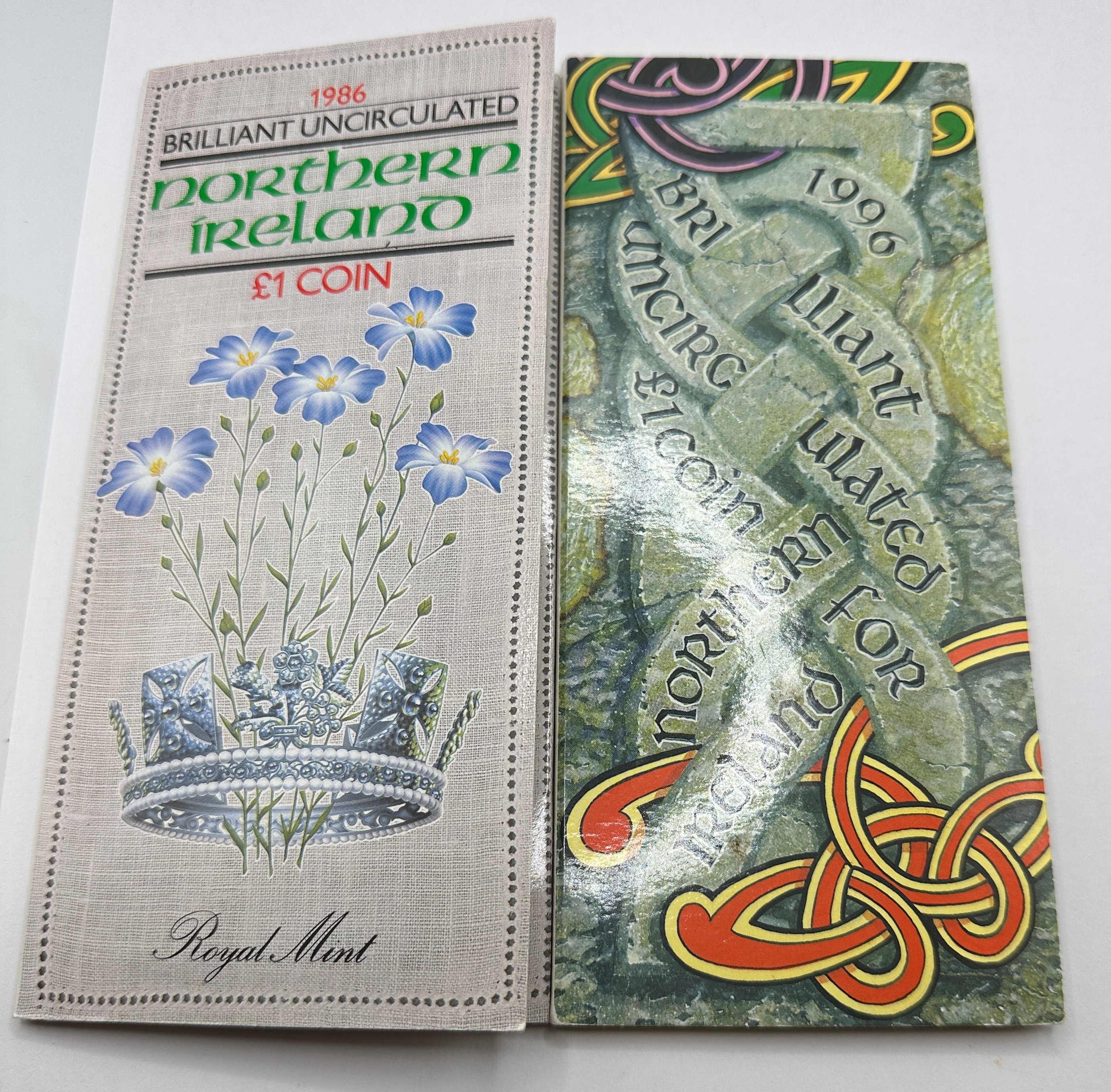 This lot comprises two Royal Mint ‘Brilliant Uncirculated’ £1 coin presentation packs, dating from 1986 and 1996, both commemorating Northern Ireland. The 1986 pack, housed in a textured card sleeve, features imagery of flax flowers and a crown, containing a gold-toned coin depicting the hexagonal columns of the Giant’s Causeway. The 1996 pack, presented in a more decoratively styled sleeve with Celtic knotwork and a green, stone-like background, contains a gold-toned coin bearing an animal motif, identified within the pack as ‘Mac Lir’s horses’. This pack also includes a photographic depiction of an ornate gold ‘Broughter collar’ with accompanying historical context relating to Irish Iron Age artifacts.