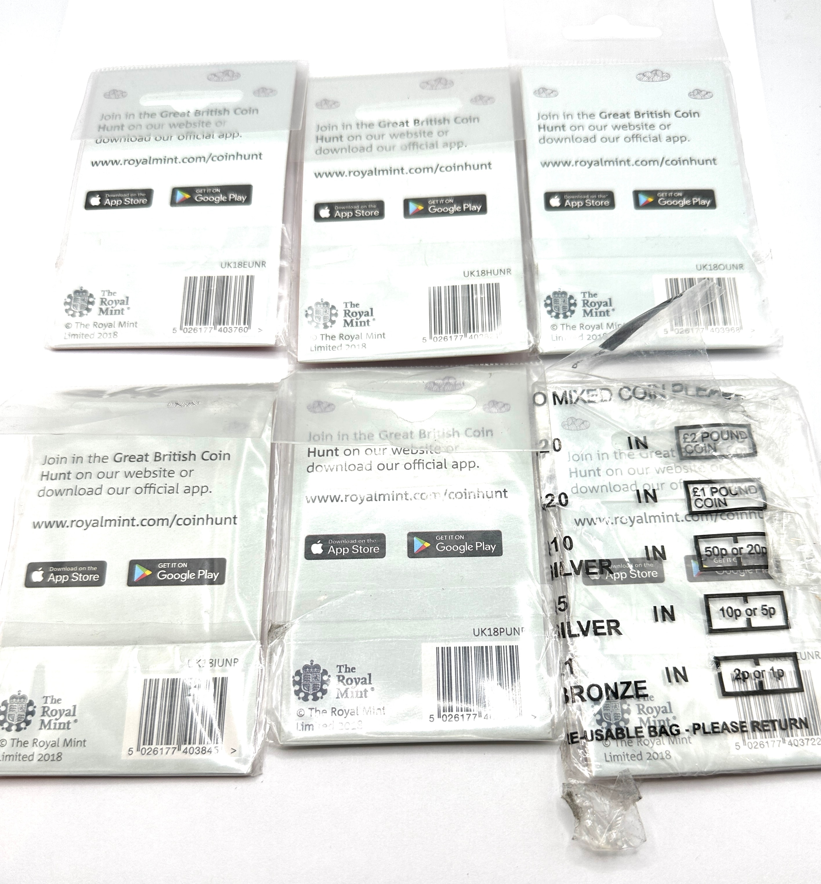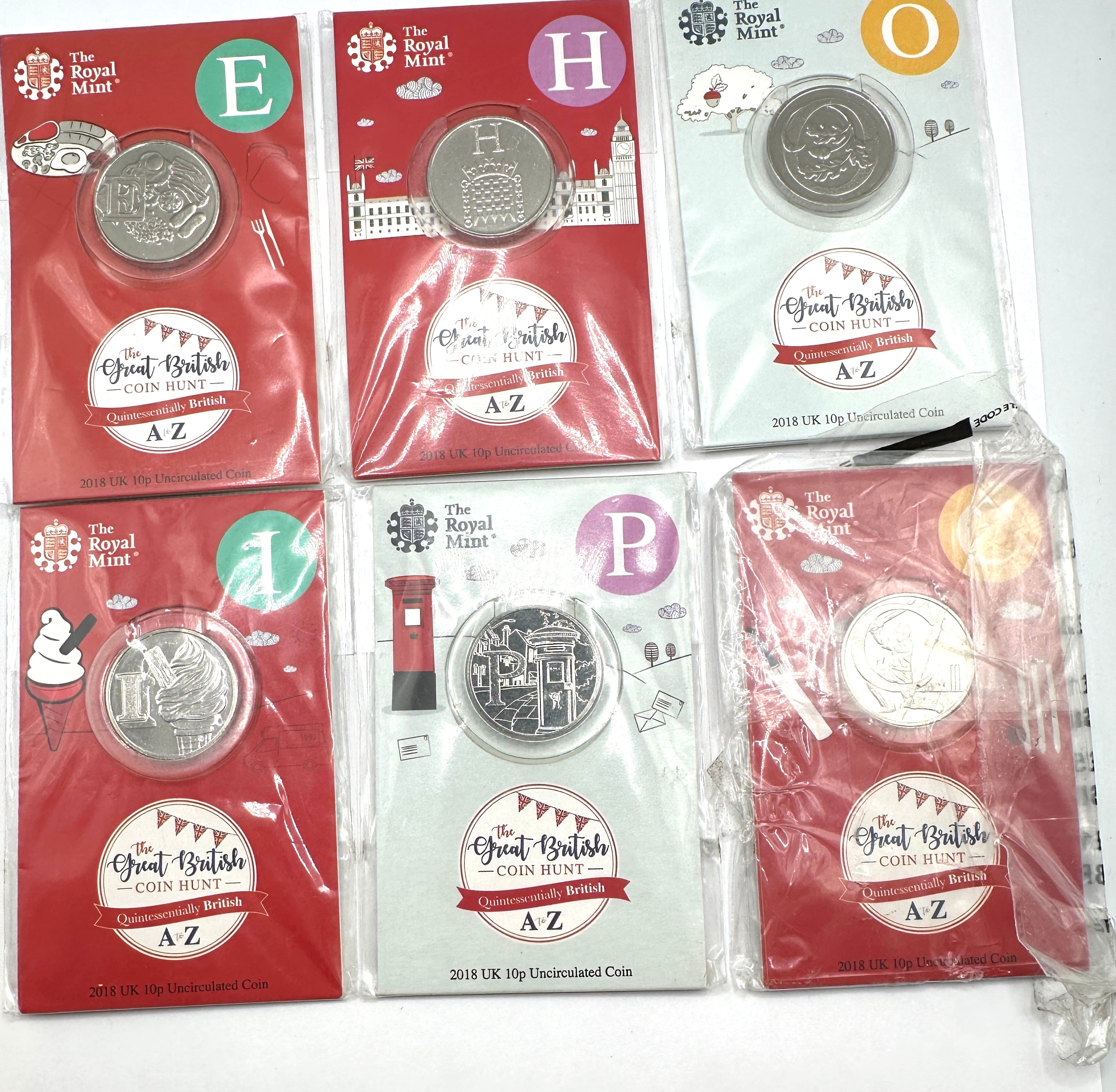 A set of six Royal Mint 2018 ‘The Great British Coin Hunt: Quintessentially British A-Z’ 10p uncirculated commemorative coins. Each silver-colored cupro-nickel coin is individually sealed in its original Royal Mint cardboard and clear plastic blister pack. The packaging prominently displays “The Royal Mint”, “2018 UK 10p Uncirculated Coin”, and encourages participation in the “Great British Coin Hunt” via its website or app, noting “© The Royal Mint Limited 2018”. The collection includes coins depicting ‘E’ for tea/crumpets, ‘H’ for the House of Parliament, ‘O’ for an umbrella, ‘I’ for an ice cream cone, ‘P’ for a pillar box, and a sixth coin featuring a queue of people.