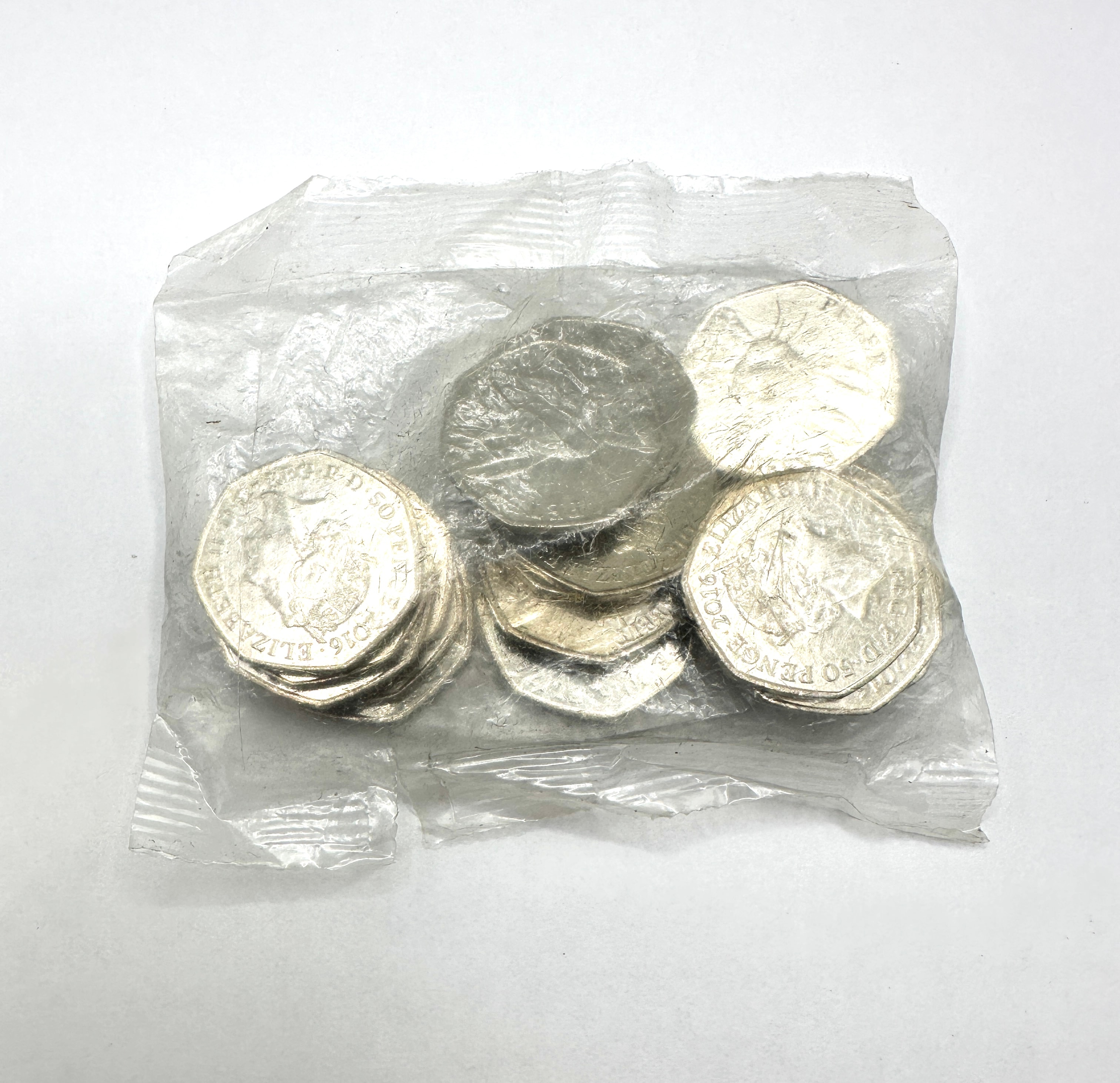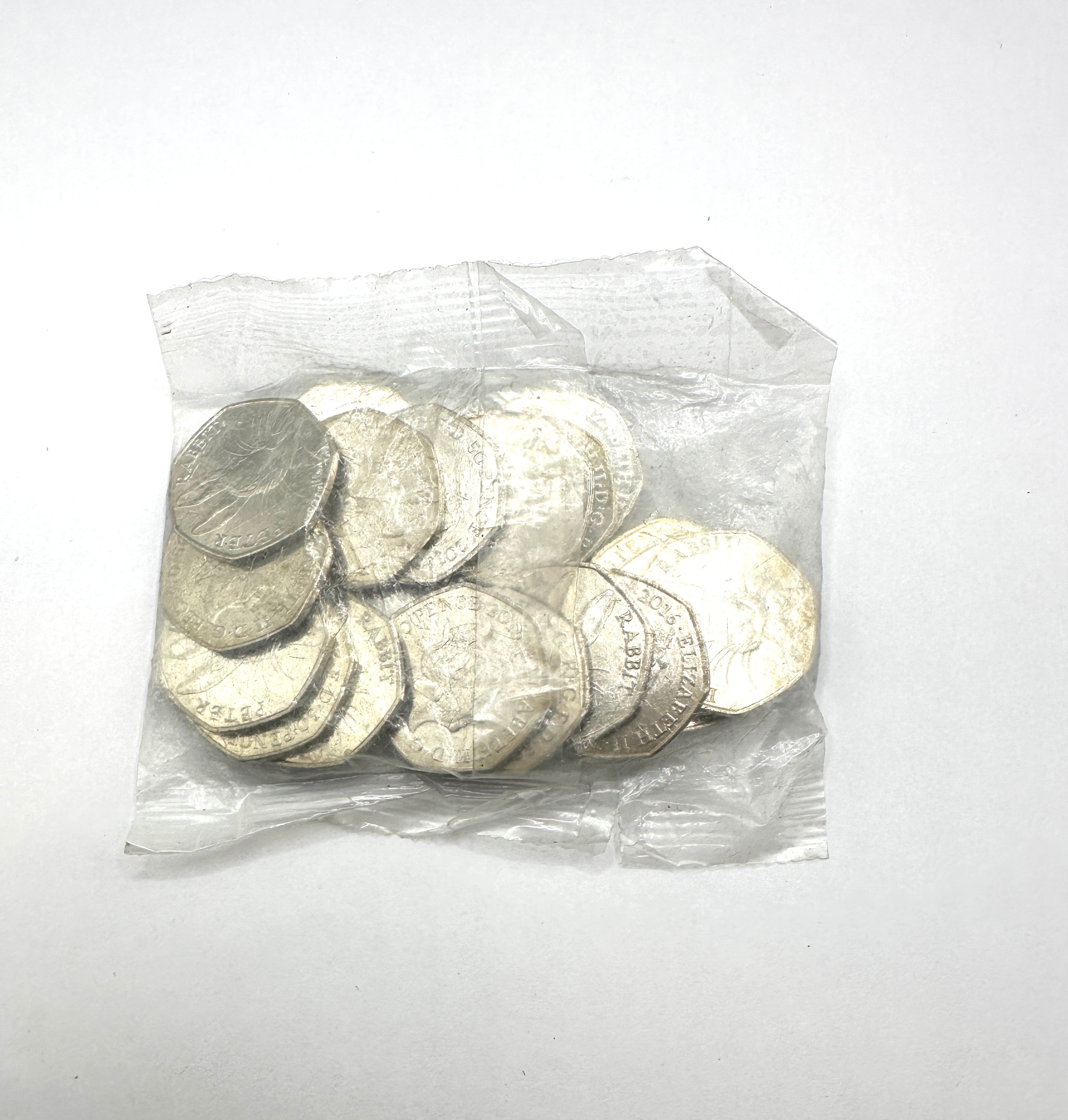 A collection of British 50 Pence coins, presented within a clear, crinkled plastic bag. Approximately 20-30 metallic coins are visible, bearing inscriptions such as “ELIZABETH II D G REG F D” and “50 PENCE”. Dates including “2016” are discernible. Several coins feature partial text, identifying them as part of the commemorative Peter Rabbit and Beatrix Potter series.
