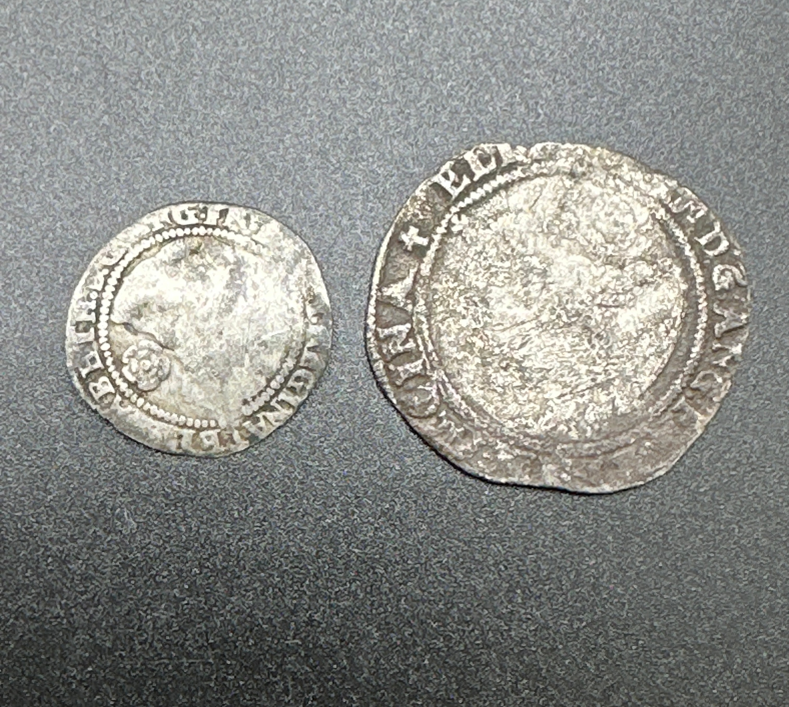 A pair of Elizabeth I Silver Threepence coins, consistent with late 16th-century English coinage. The larger coin, dated 1581, features a central cruciform design on the obverse with partially legible Latin text “MOMEN…” and “…TORE…” around the perimeter. Its reverse exhibits a worn central motif surrounded by a legend where “REGINA” (Queen) and “ANG” (of England) are faintly visible. The smaller coin, dated “158x” (likely 1587 or 1588), displays a similar cruciform design on its obverse with discernible Latin legend “ELIZABETH DEI GRA…” (Elizabeth by the Grace of God) around the edge. Its reverse shows a central crowned rose surrounded by a worn legend. Both are circular, irregularly shaped hammered coins, appearing to be silver due to their color and patina.