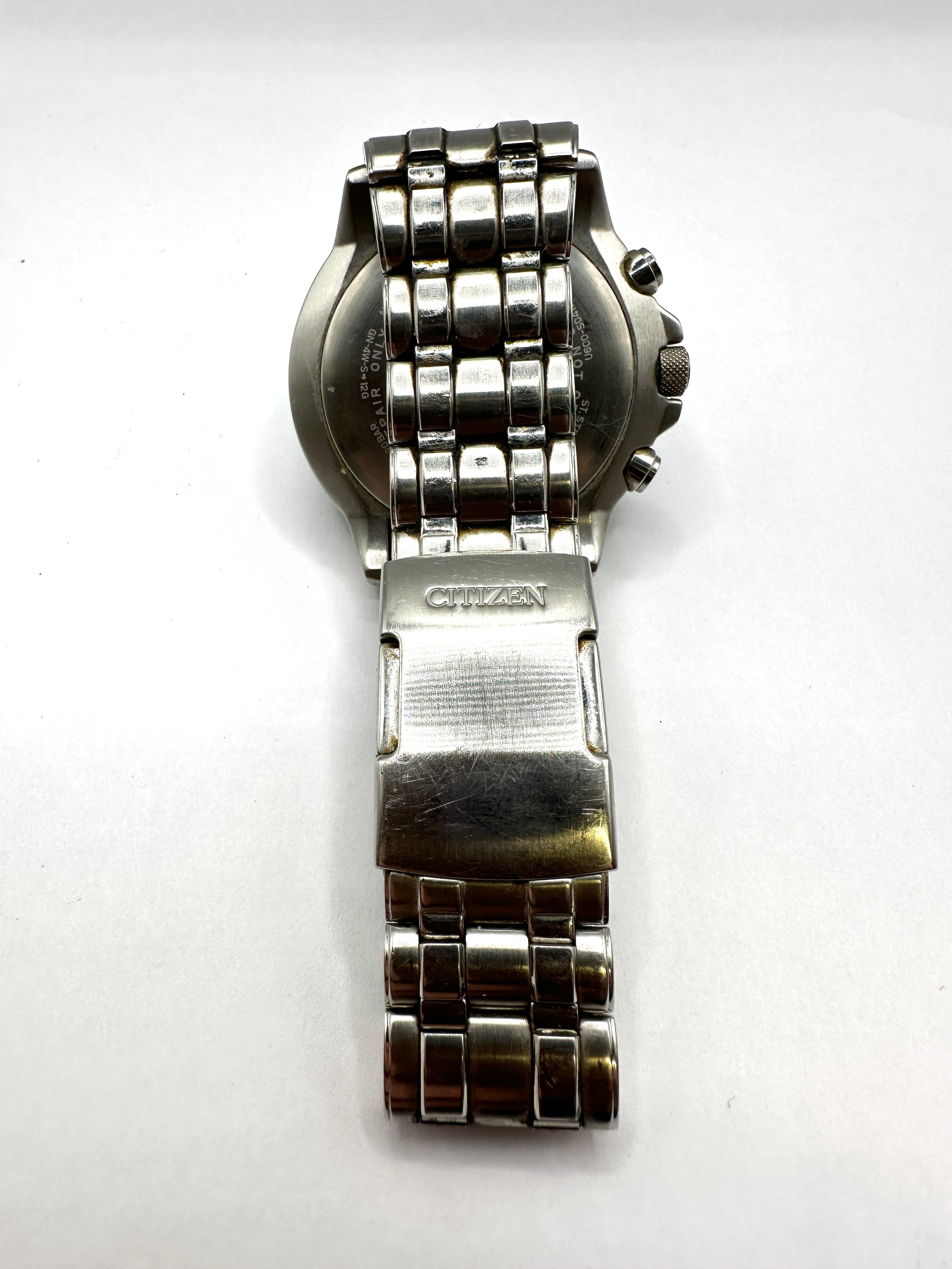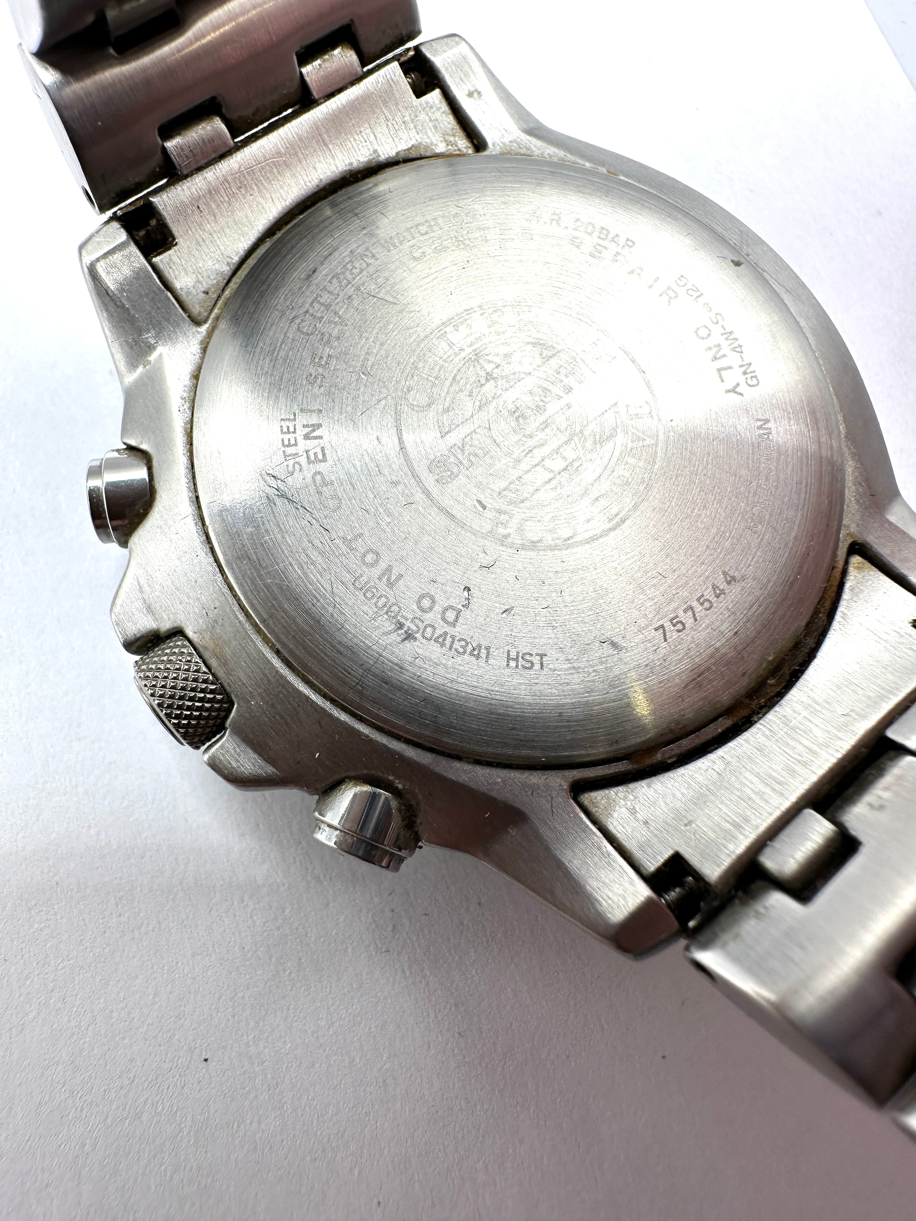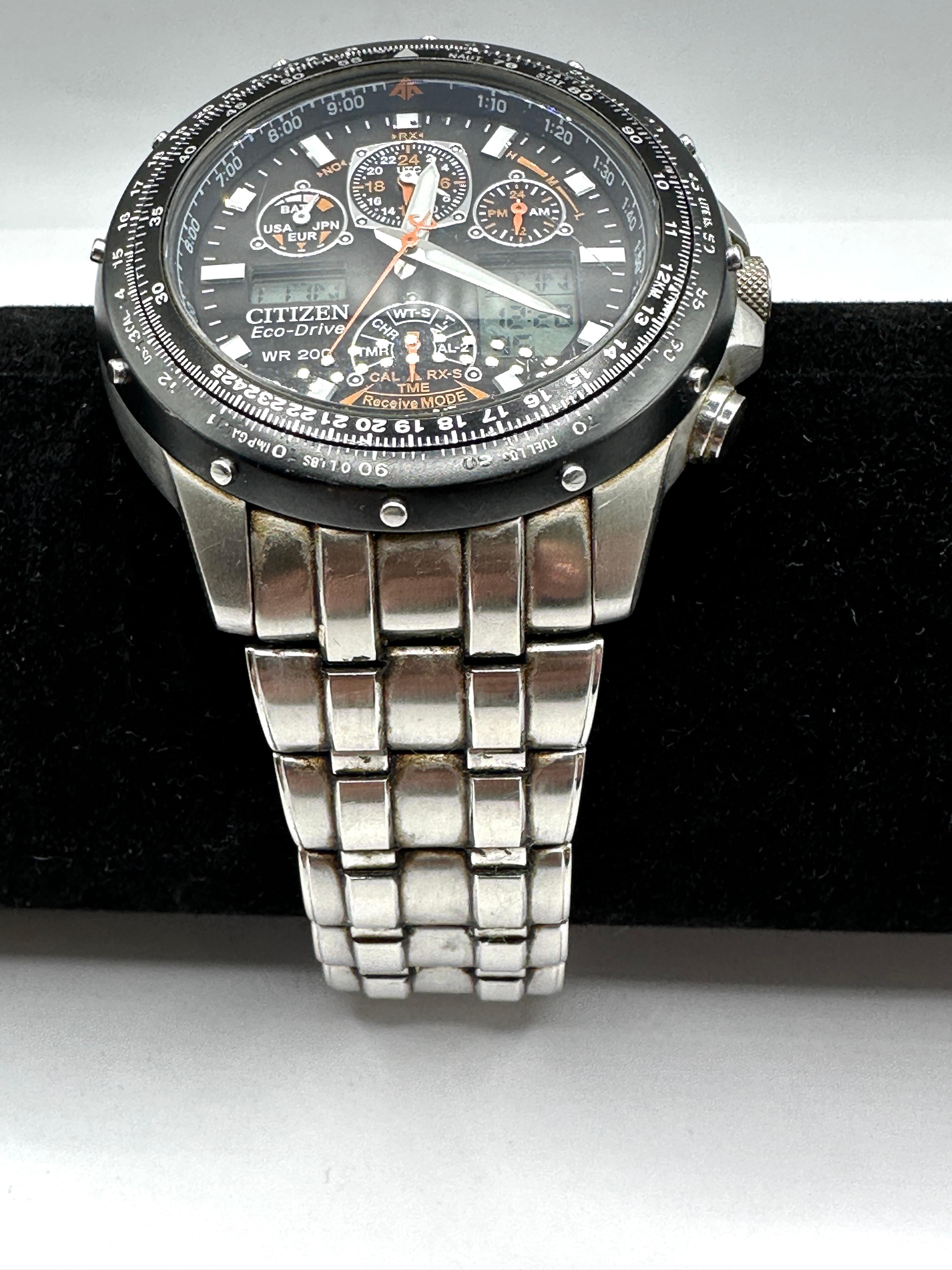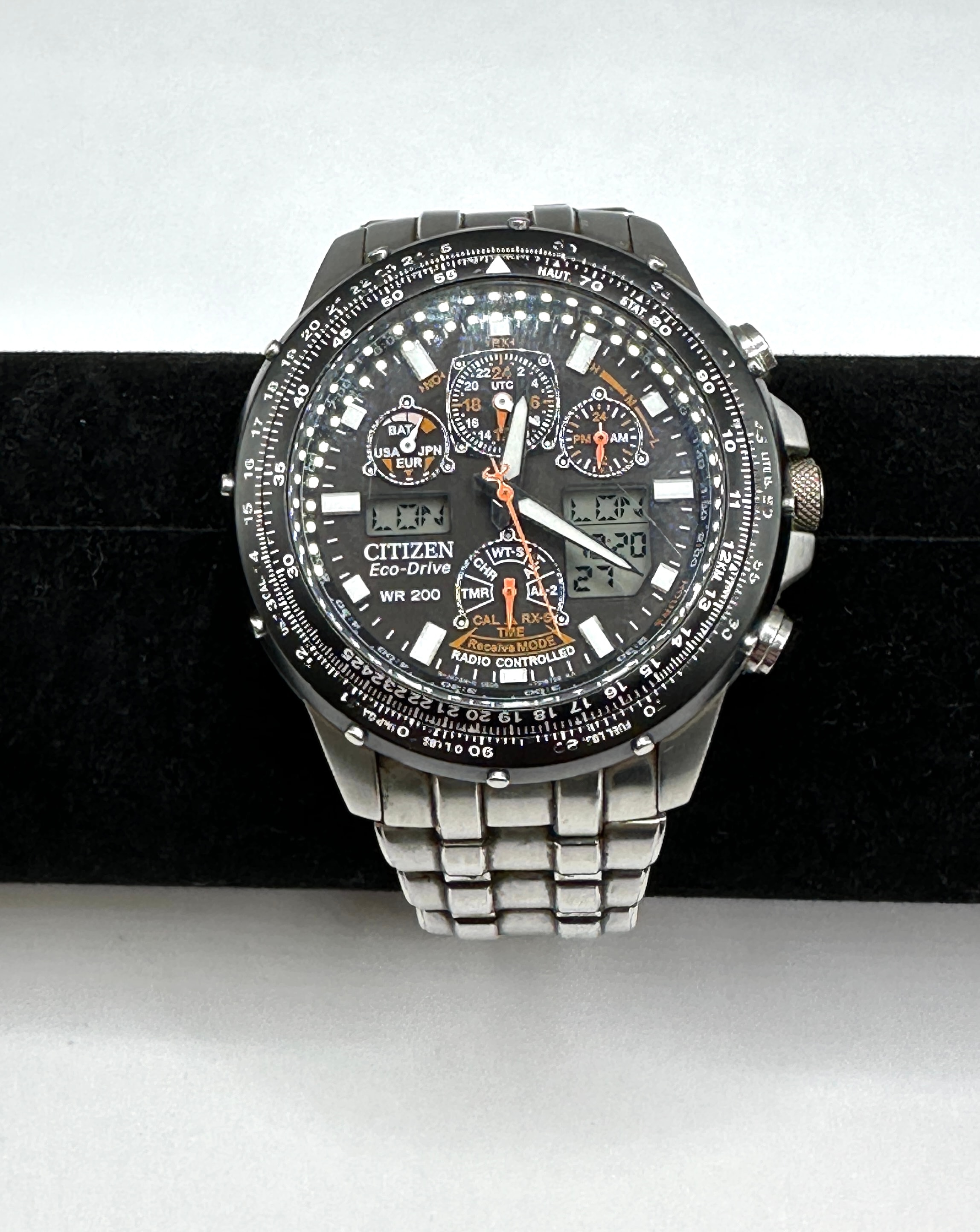 A Citizen Eco-Drive Skyhawk A-T stainless steel pilot’s wristwatch. This modern multi-function timepiece features a black dial with analog hands, three sub-dials, and two digital readouts. The dial is marked “CITIZEN Eco-Drive”, “WR 200”, and “RADIO CONTROLLED”, along with various city codes (e.g., LON, LAX, DEN, NYC) and function indicators (e.g., CAL, TMR, ALM, WT-S). The watch is fitted with a bidirectional slide rule bezel and a multi-link stainless steel bracelet with a “CITIZEN” signed clasp. The stainless steel caseback is engraved with “CITIZEN WATCH CO.”, “W.R. 20BAR”, “GN-4W-S-12G”, “JAPAN”, “ST. STEEL”, “757544”, and “0600472041381 HST”, with a partially visible “SKYC” branding.