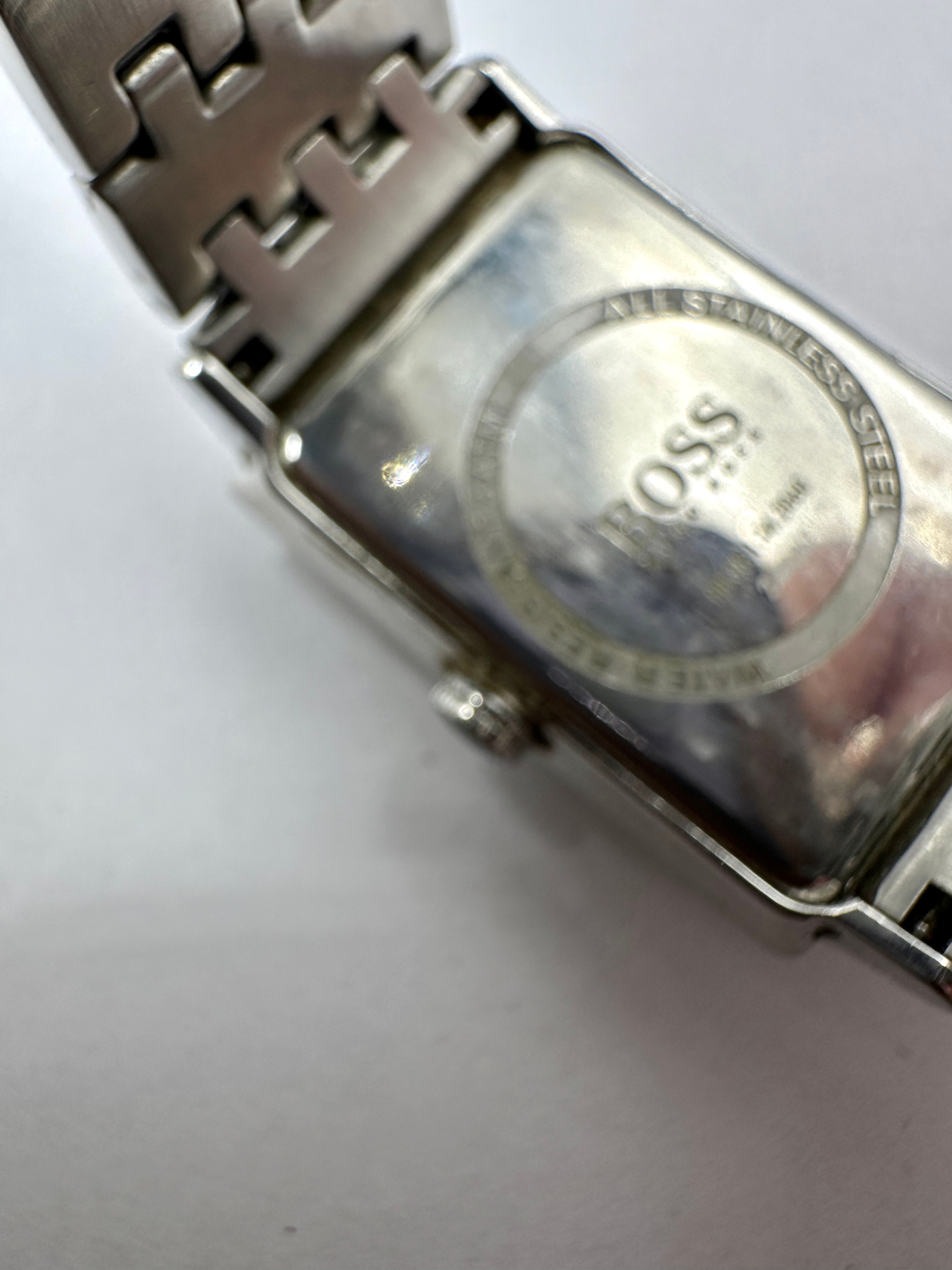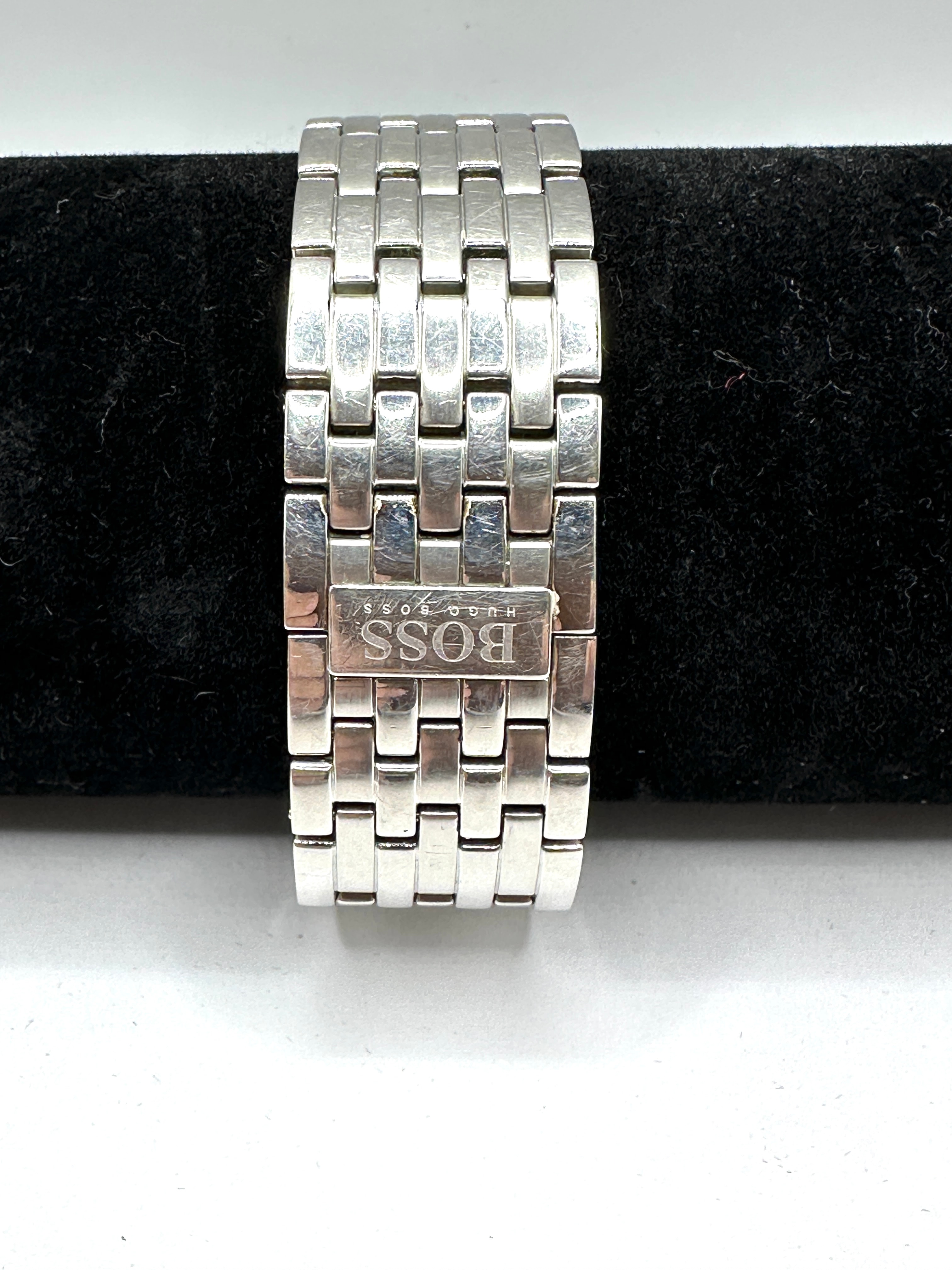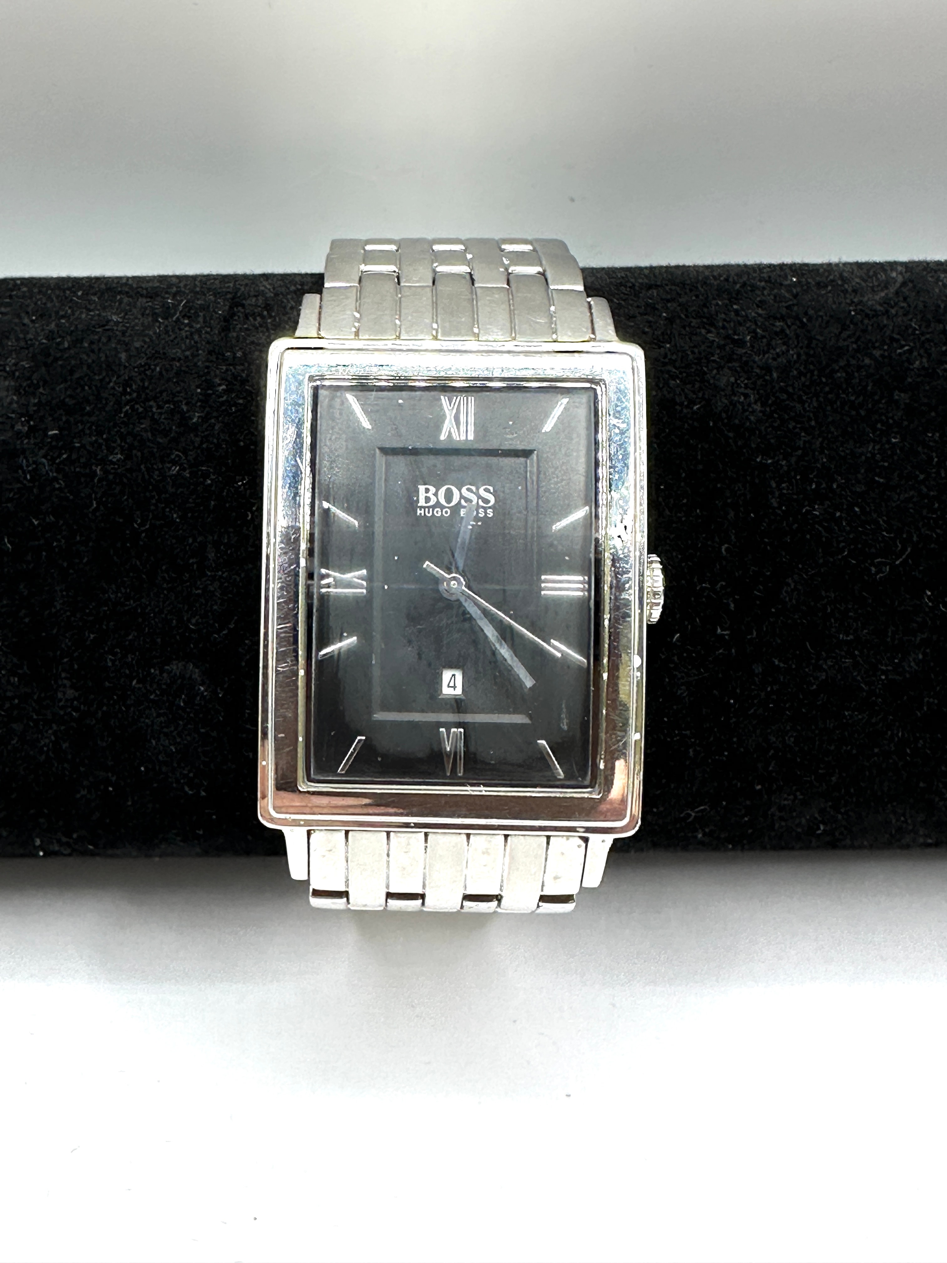 A Hugo Boss Men’s stainless steel rectangular wristwatch. The silver-tone watch features a rectangular case and a matching metal link bracelet with a fold-over clasp. The black dial displays Roman numeral hour markers at XII, III, VI, and IX, with stick markers for the remaining hours, and a date window at the 6 o’clock position showing “4”. The dial and clasp are marked “BOSS” with “HUGO BOSS” in smaller font below. The case back is engraved with “ALL STAINLESS STEEL”, “BOSS”, “HUGO BOSS”, “WATER RESISTANT”, and “5 BAR”.