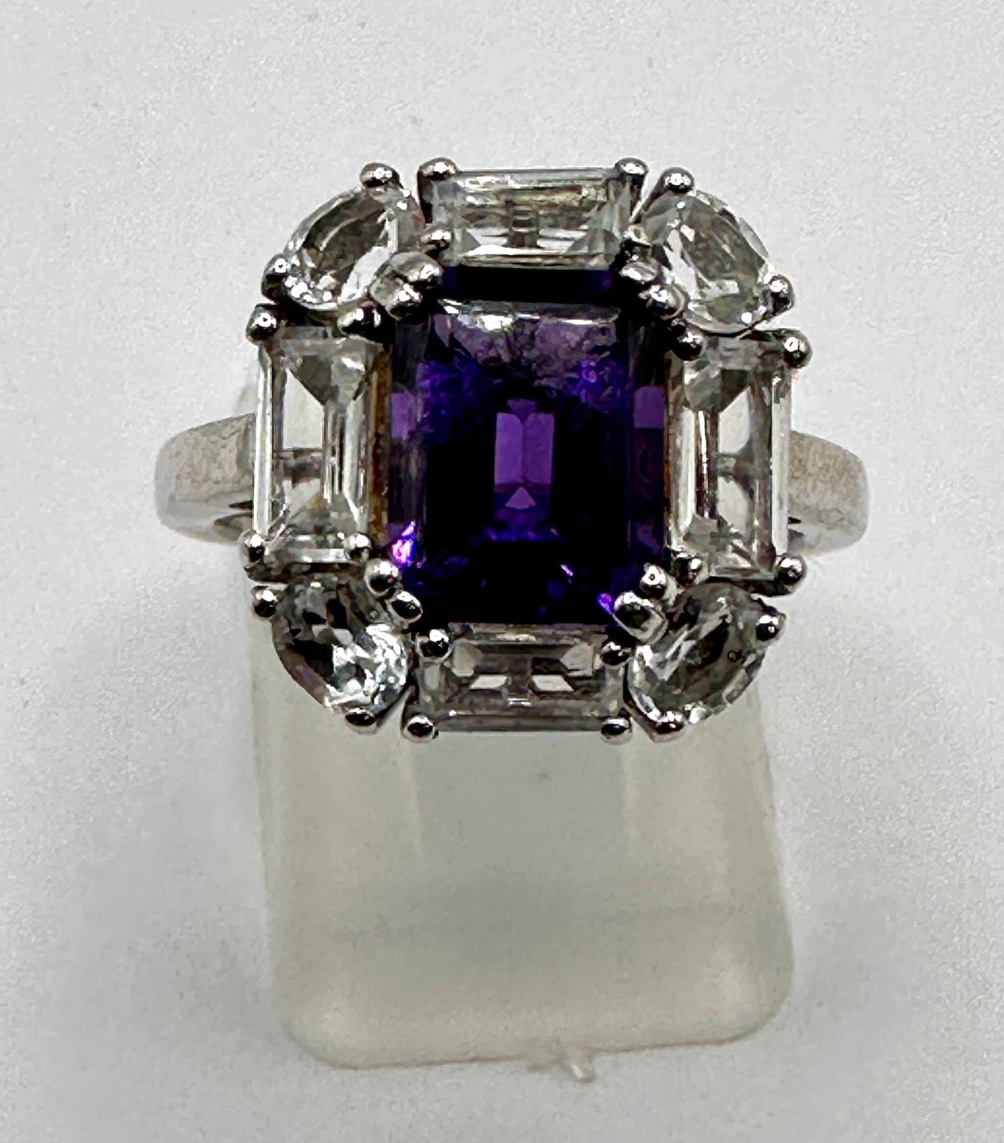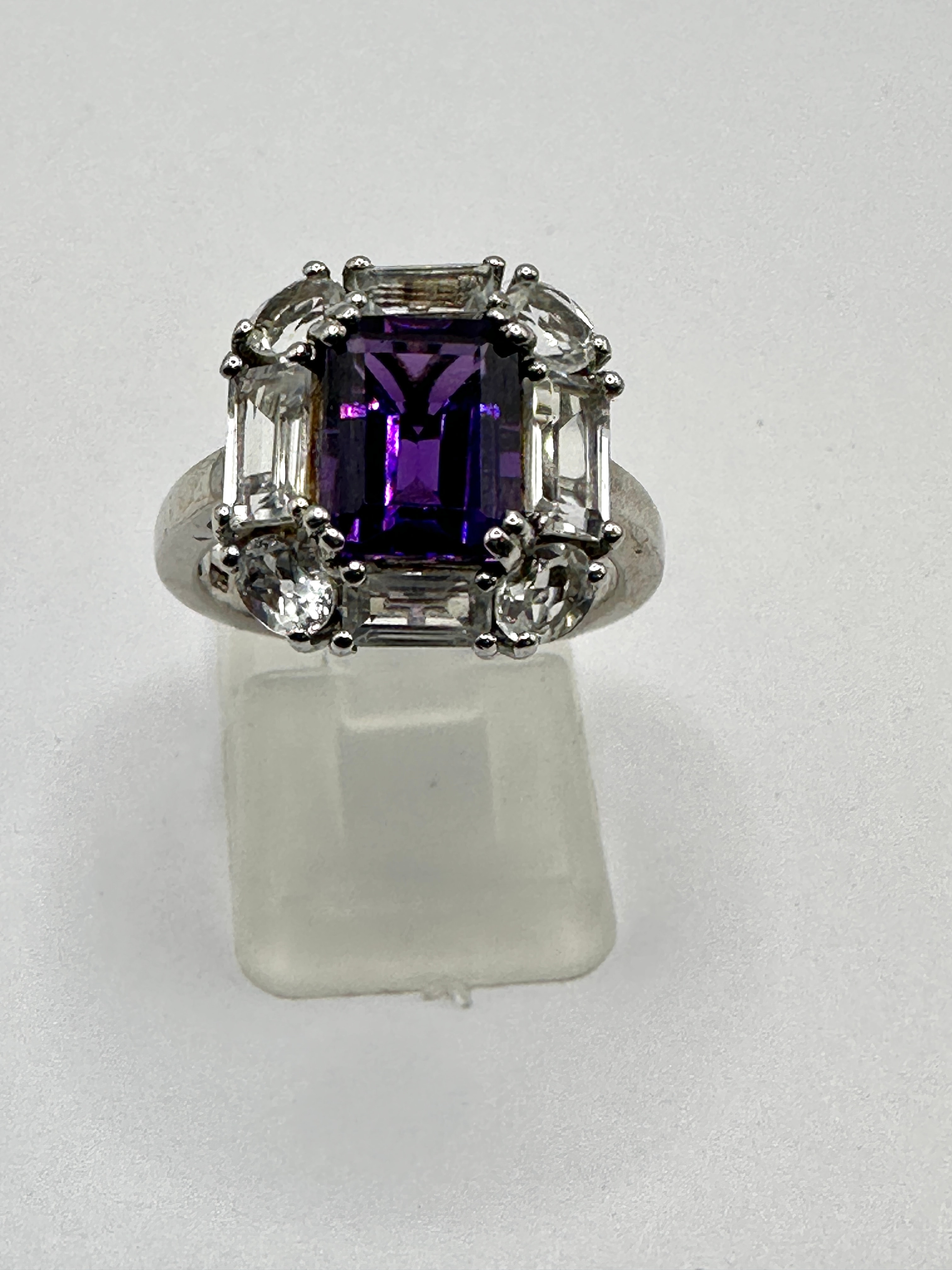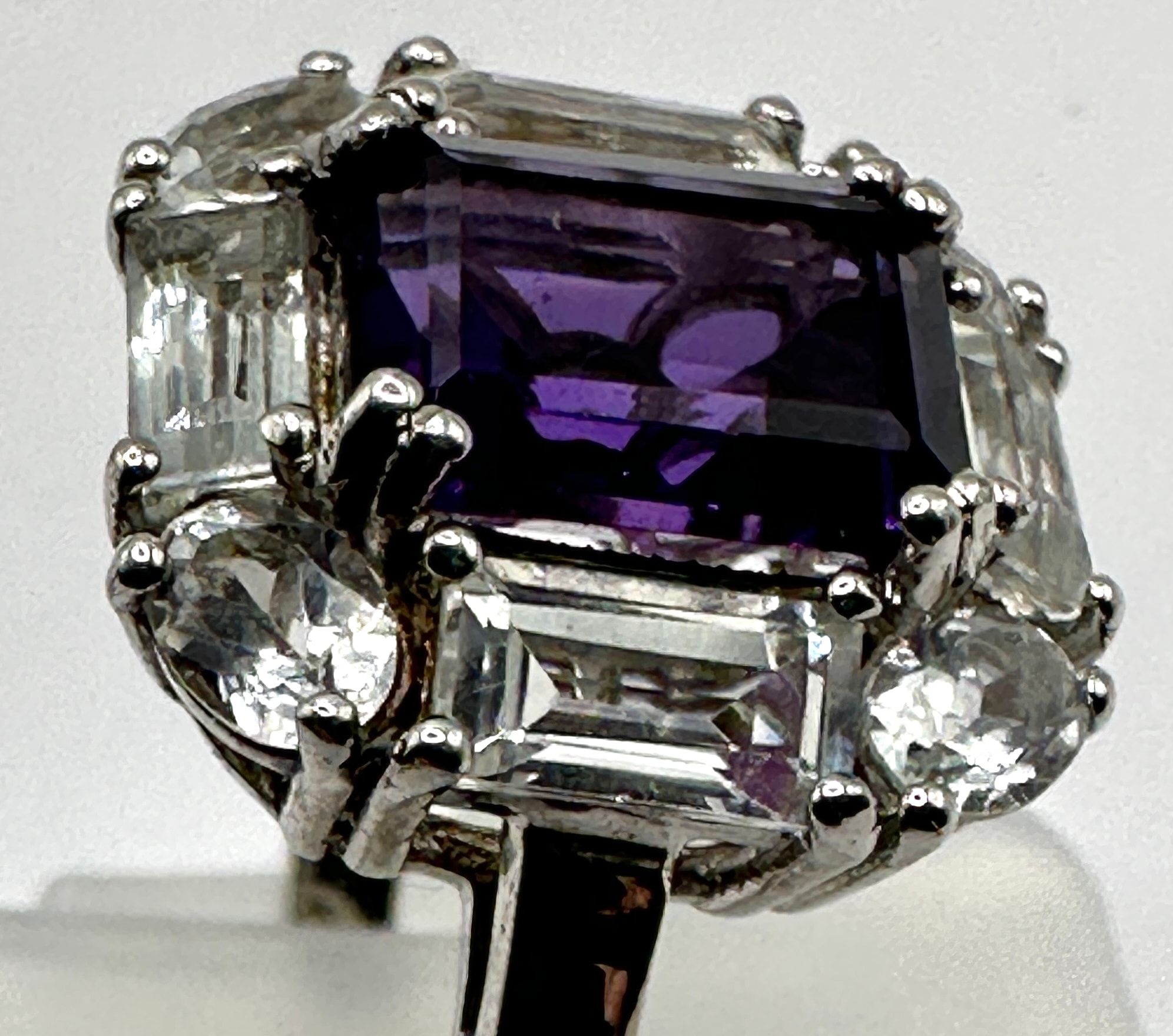A sterling silver ring, stamped ‘925’ on the inner band, featuring a prominent emerald-cut deep purple stone central gemstone. The central stone is flanked and surrounded by a cluster of clear-cut gemstones, including baguette and oval/round shapes.