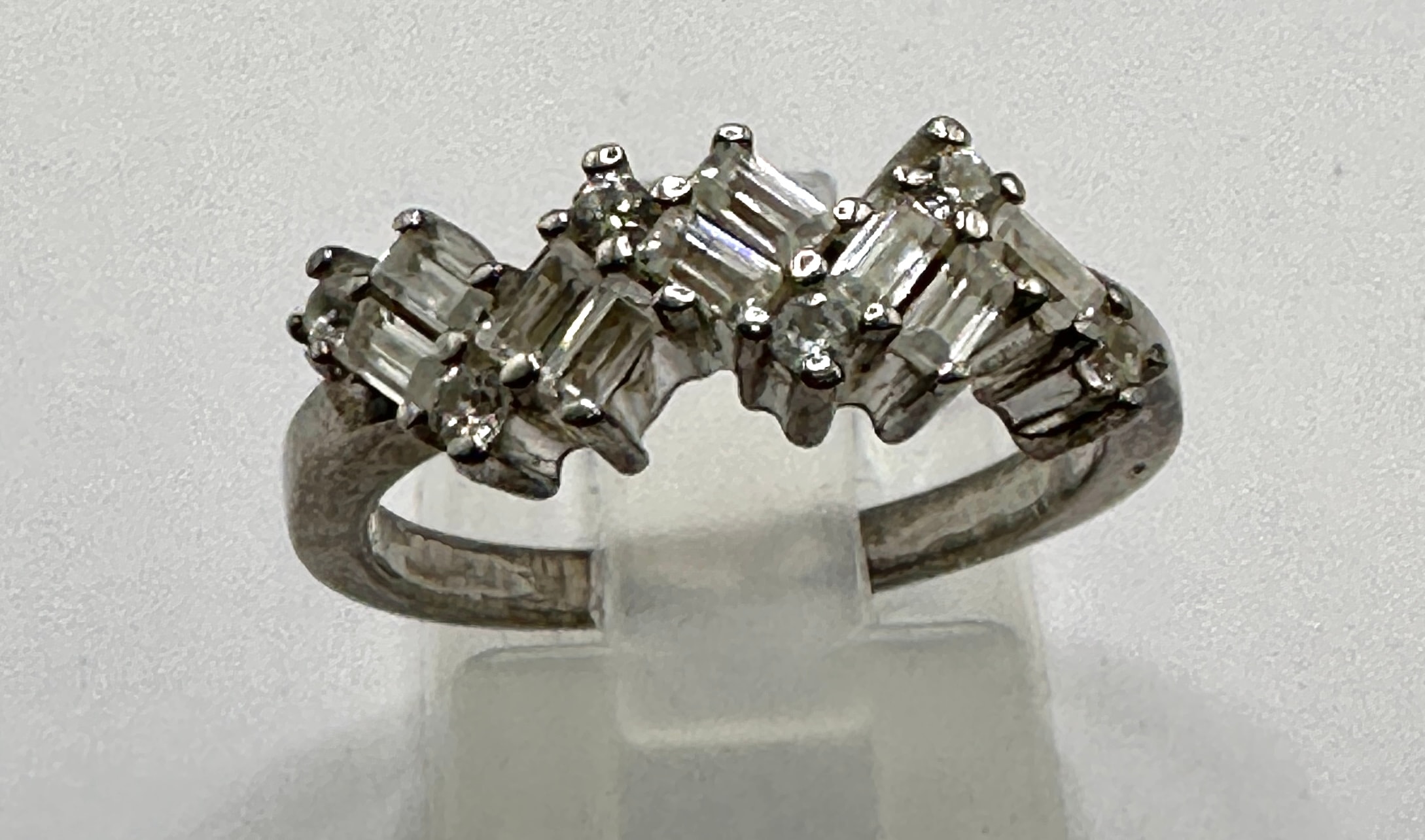 A modern sterling silver ring featuring a cluster design of baguette and round CZ Stones. The design presents a distinctive zigzag or wave-like arrangement, adorned with numerous clear, faceted stones, predominantly baguette-cut, interspersed with smaller round brilliant-cut accents. The inner shank bears a ‘925’ hallmark, indicating sterling silver, alongside a copyright symbol (©).