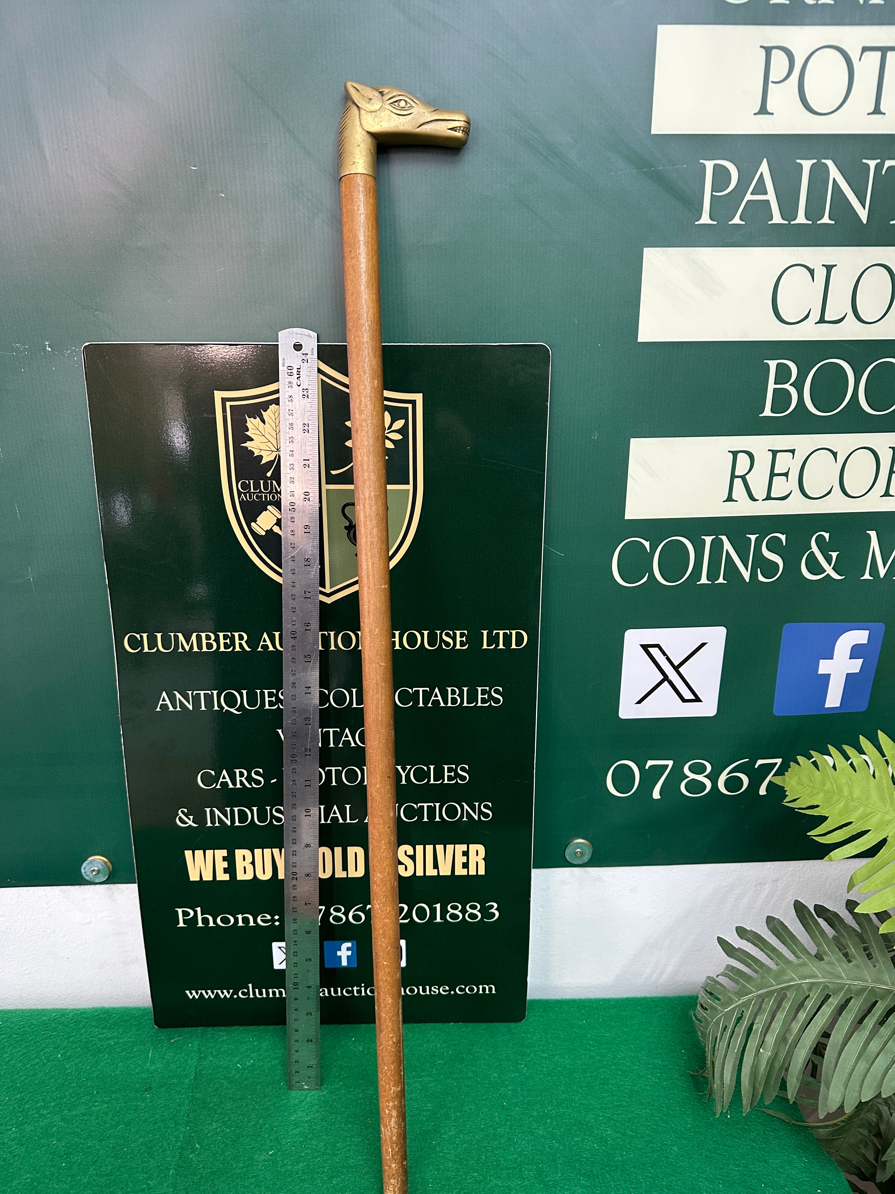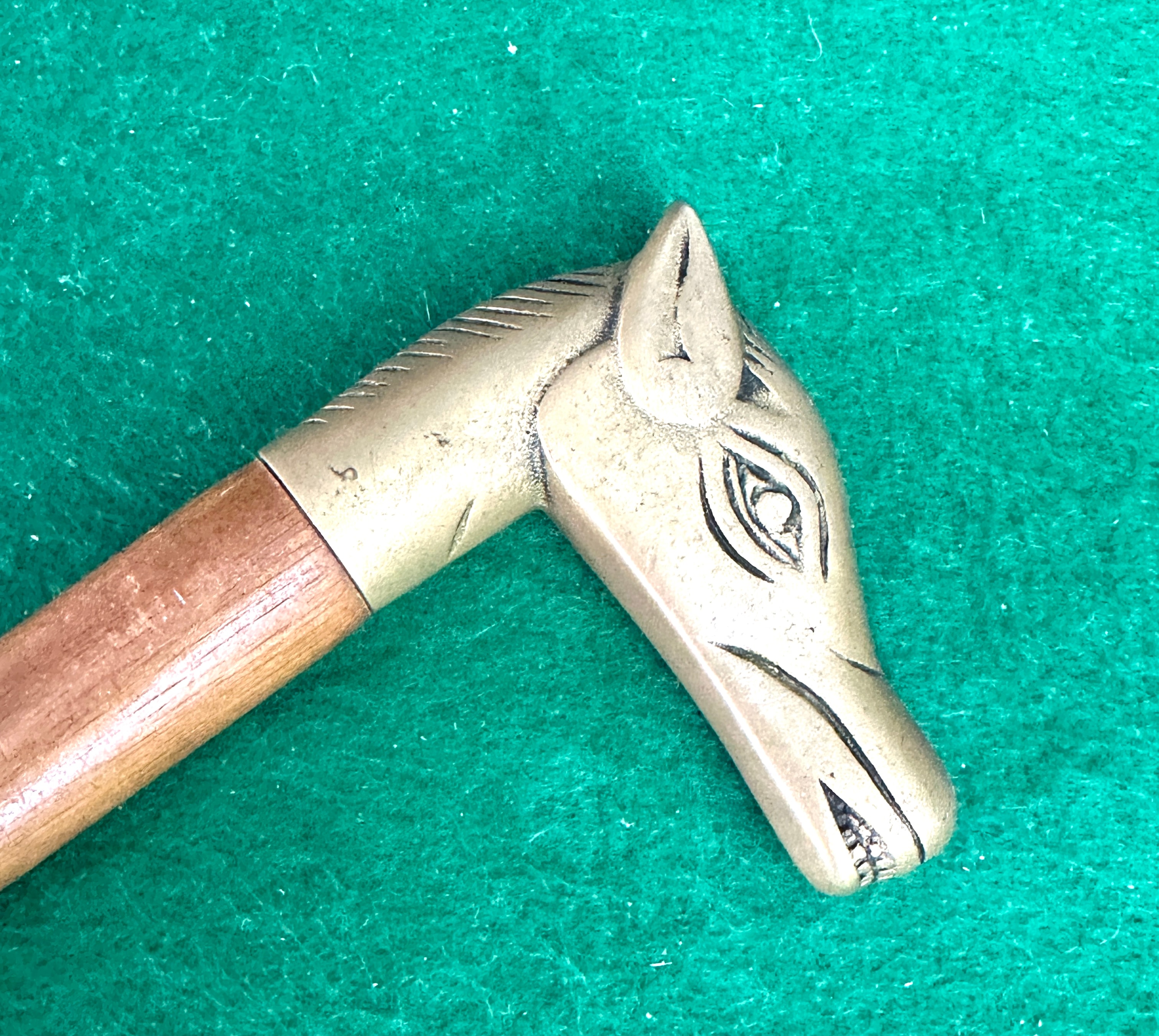 This item is a walking stick or cane, featuring a stylized equine (likely horse) head handle crafted from a yellowish metal, possibly brass or bronze, which exhibits a natural patina. The head design includes incised details for the eyes, nostrils, and mane. The shaft is made of polished wood, presenting a uniform medium-brown tone. There are no apparent maker’s marks or distinct textual engravings directly on the item.