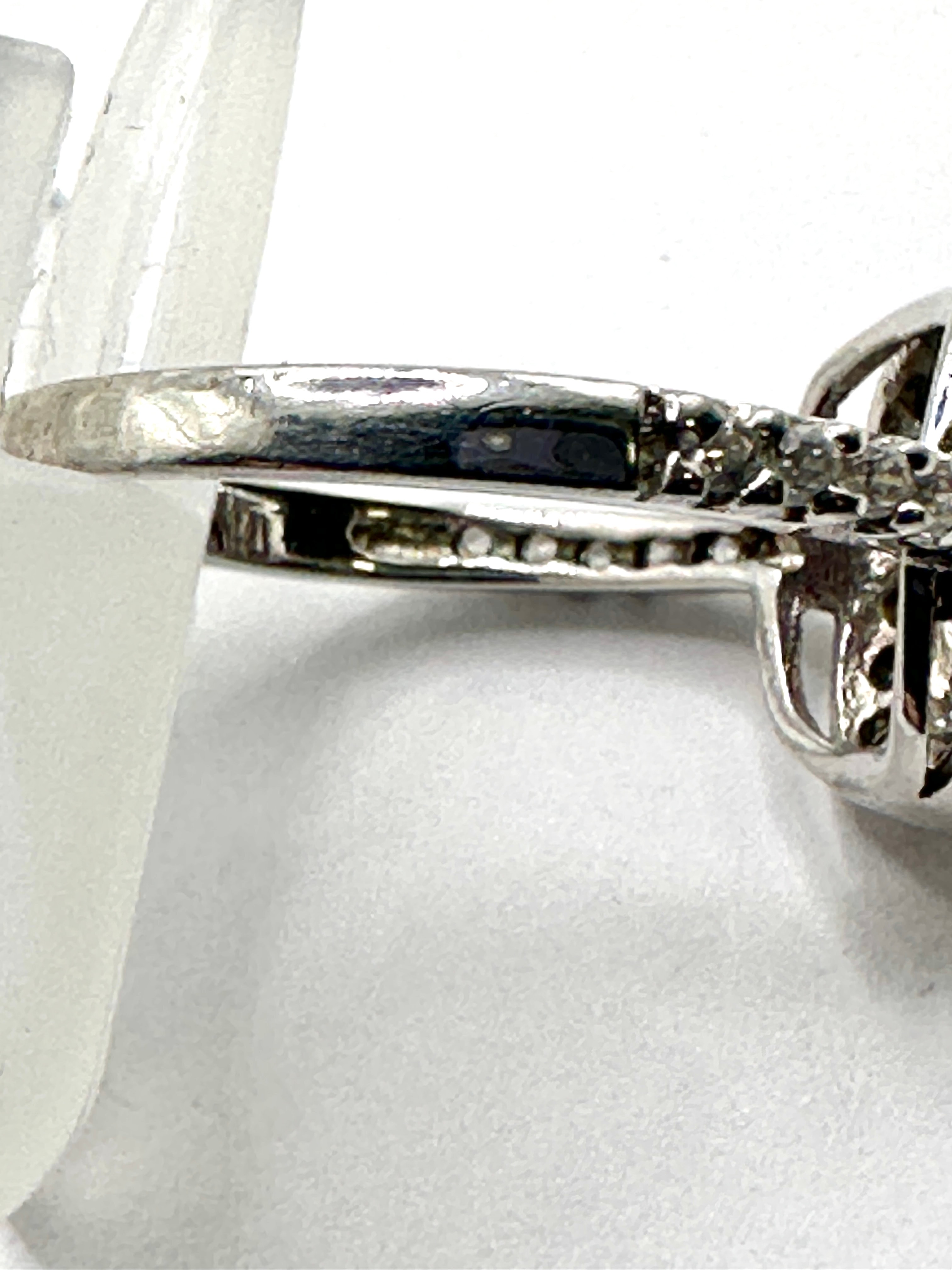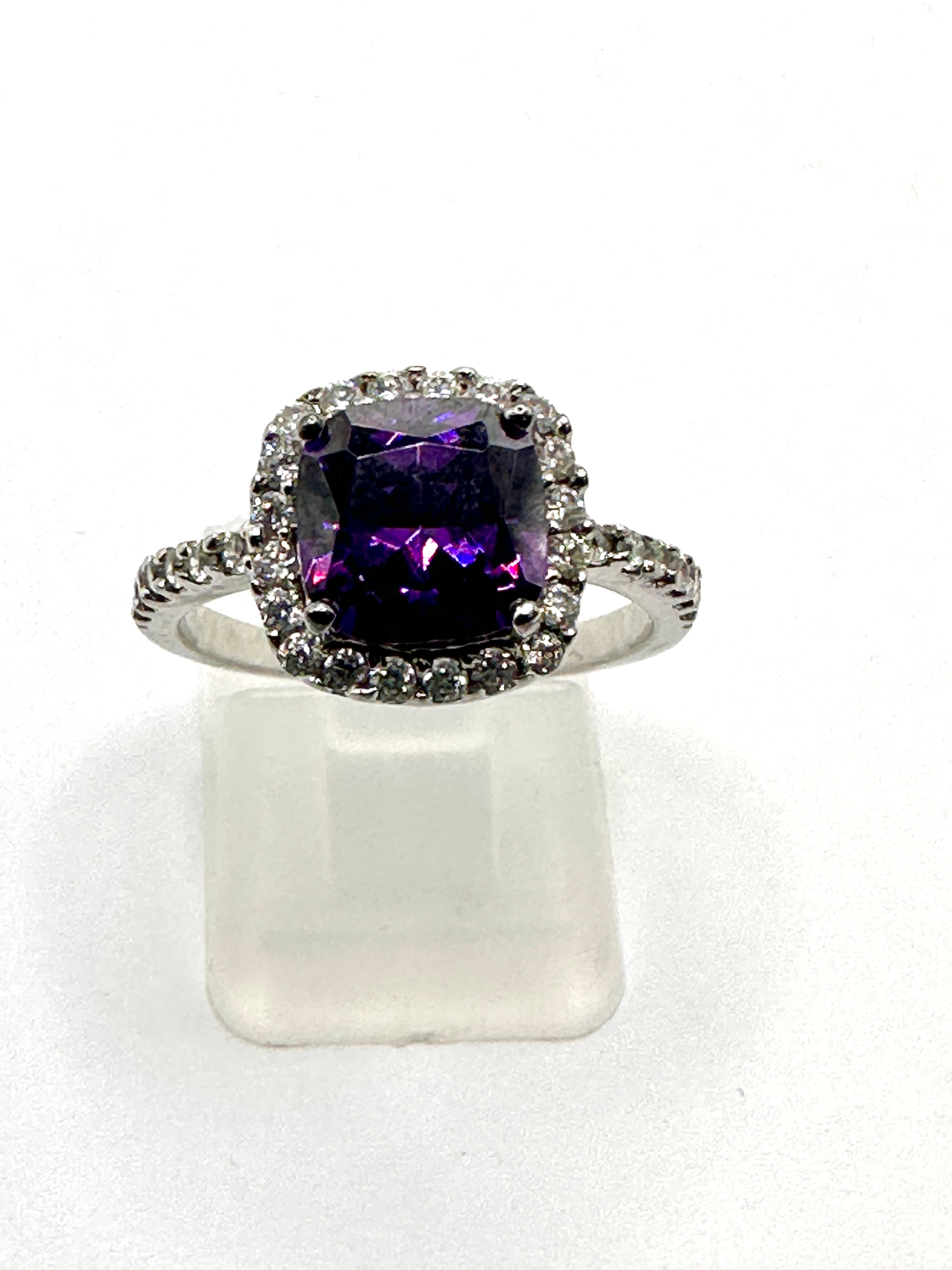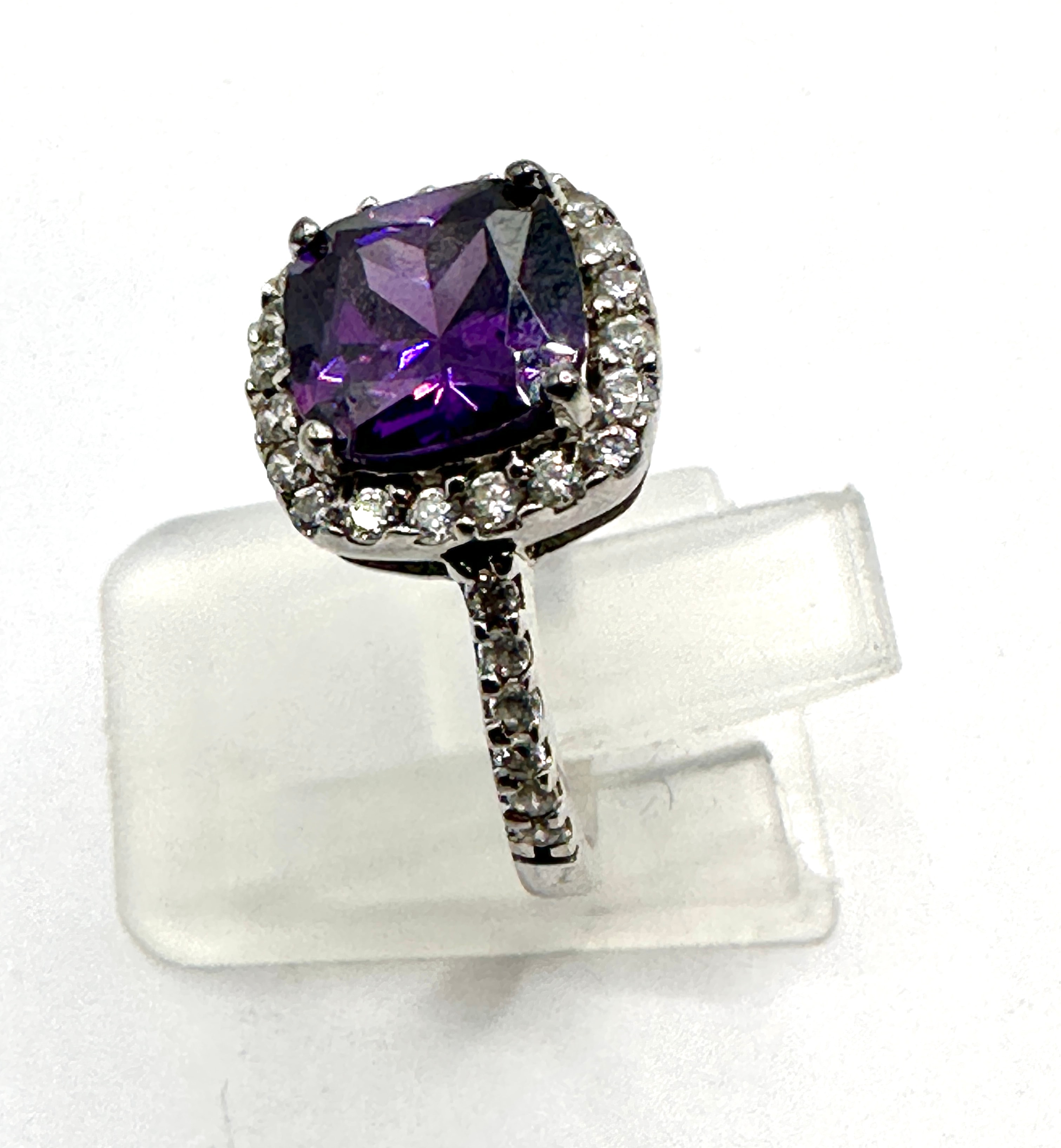 A sterling silver ring featuring a prominent cushion-cut purple cubic zirconia gemstone, held by four prongs and encircled by a halo of numerous small, round clear accent stones. Additional clear accent stones are pavé-set along the ring’s shoulders. The interior of the band is visibly stamped with “S925,” confirming sterling silver.