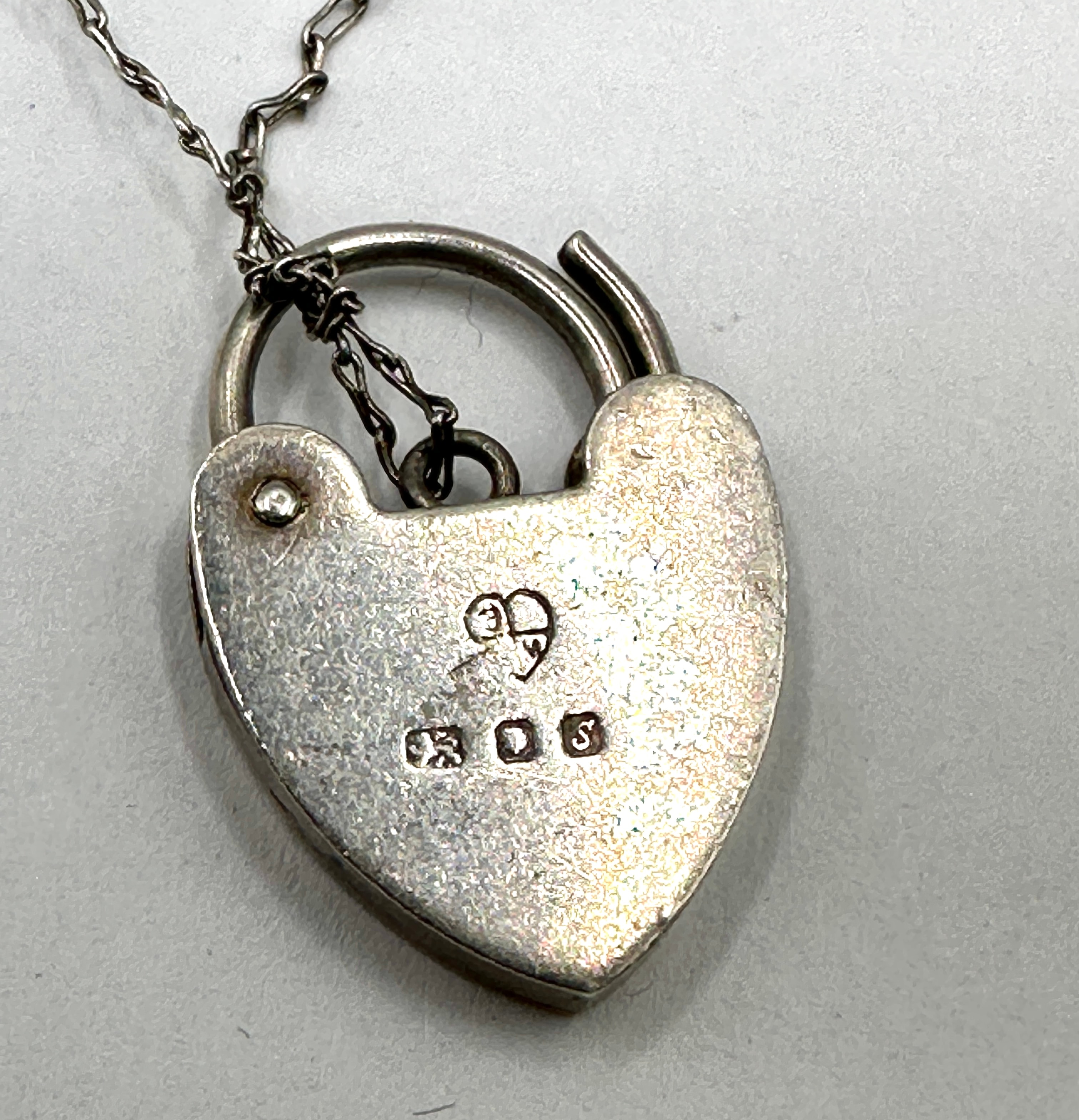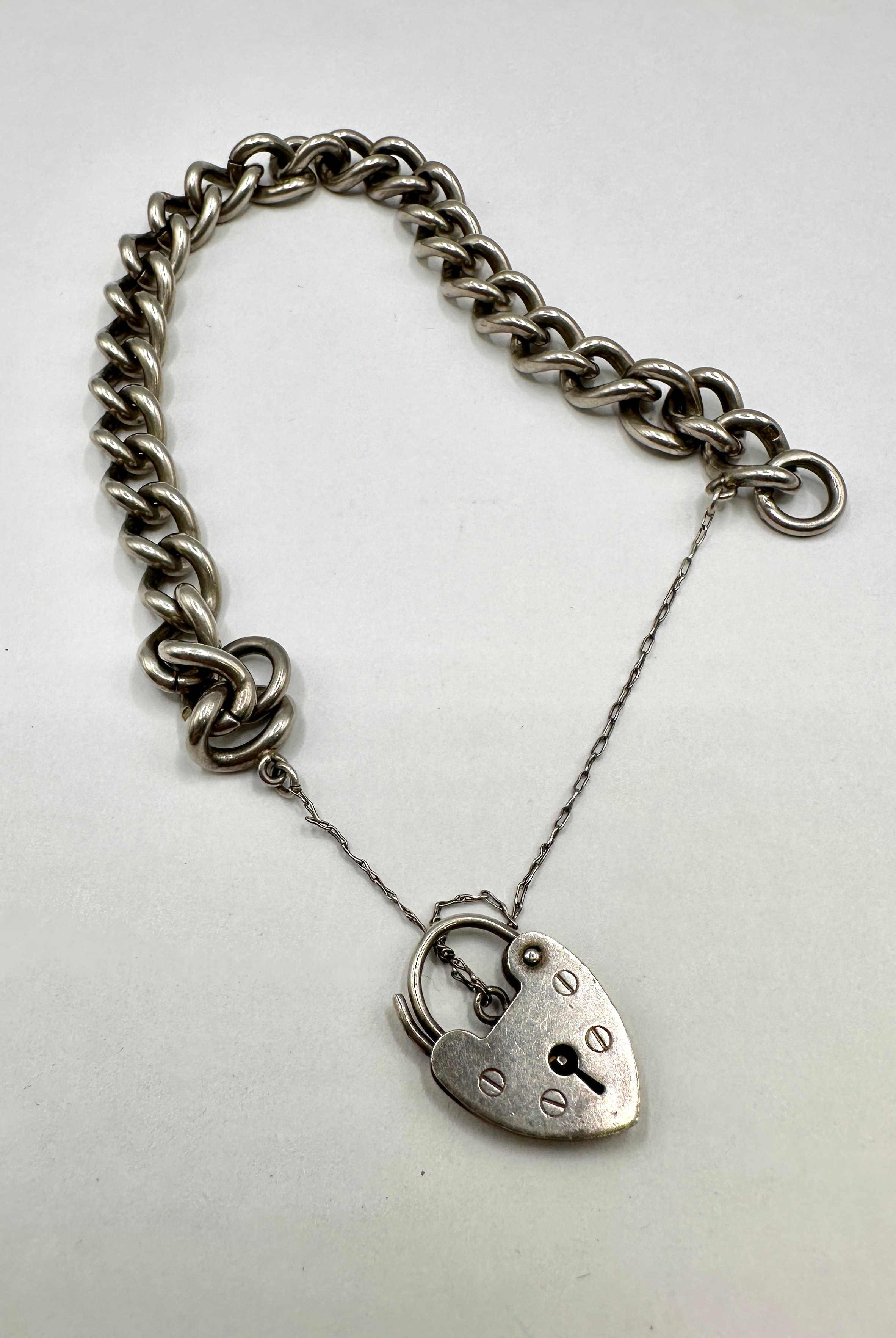 A vintage English sterling silver curb-link bracelet, featuring a heart-shaped padlock attached by a thinner safety chain. The padlock displays a keyhole and is clearly marked with English hallmarks, including an anchor symbol for the Birmingham Assay Office, a lion passant for sterling silver standard, a lowercase ‘s’ date letter, and an additional, partially obscured mark. The padlock’s shackle is visible in an open position.