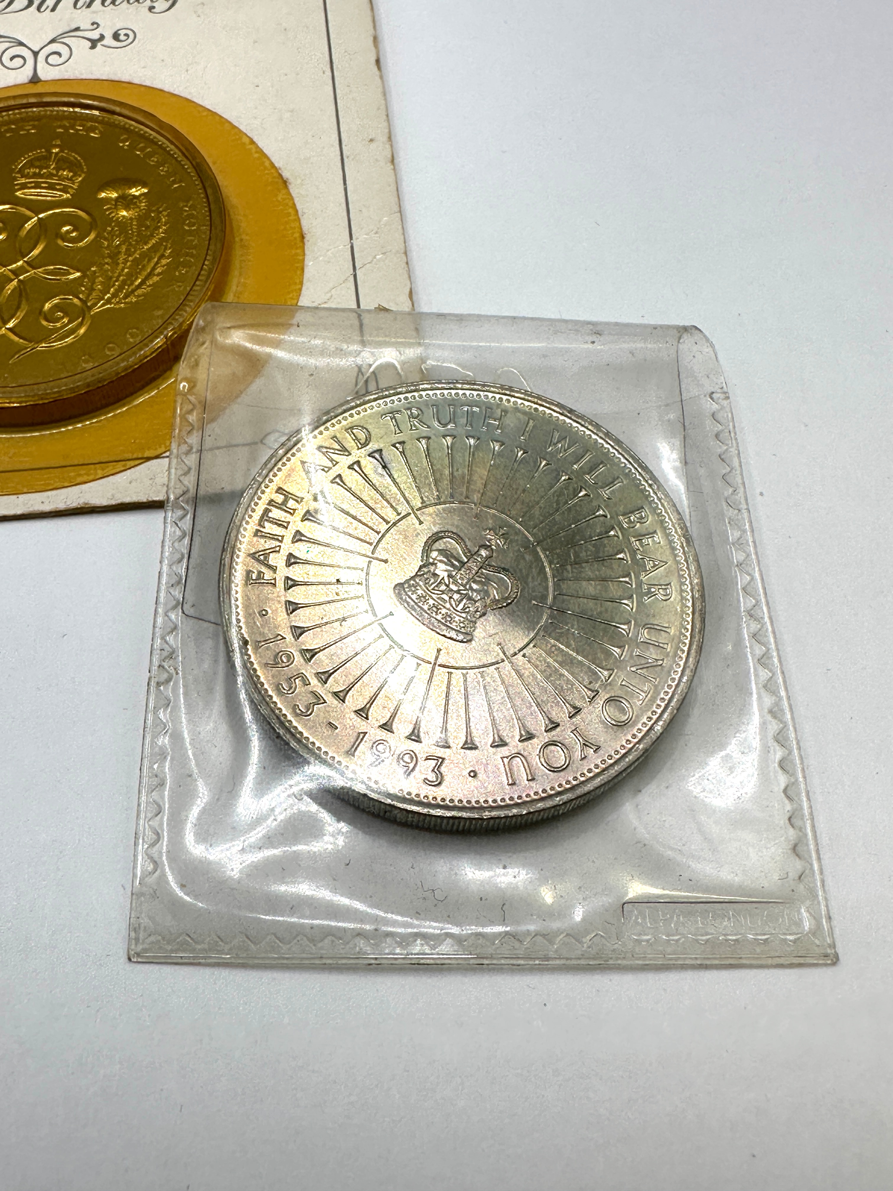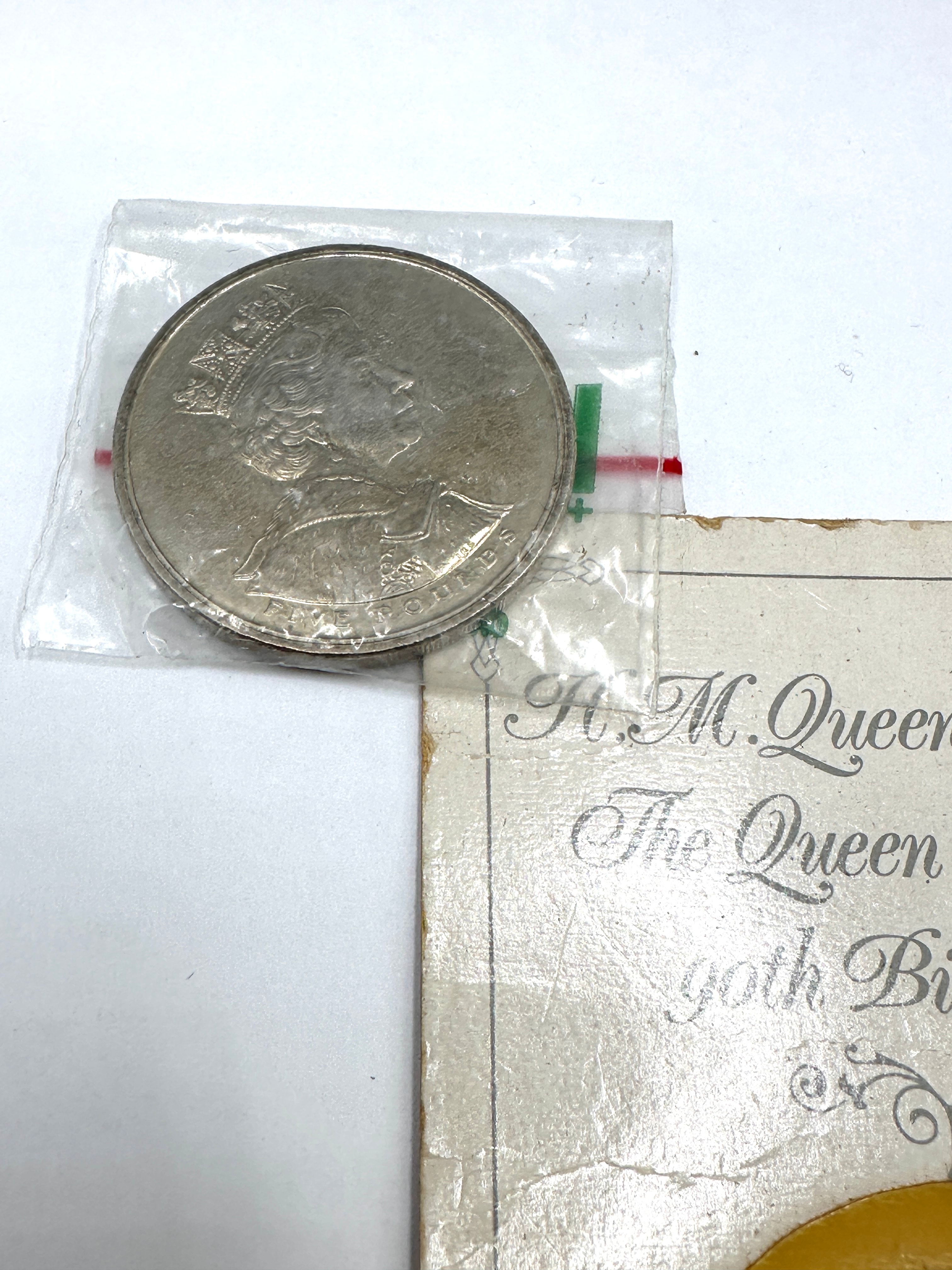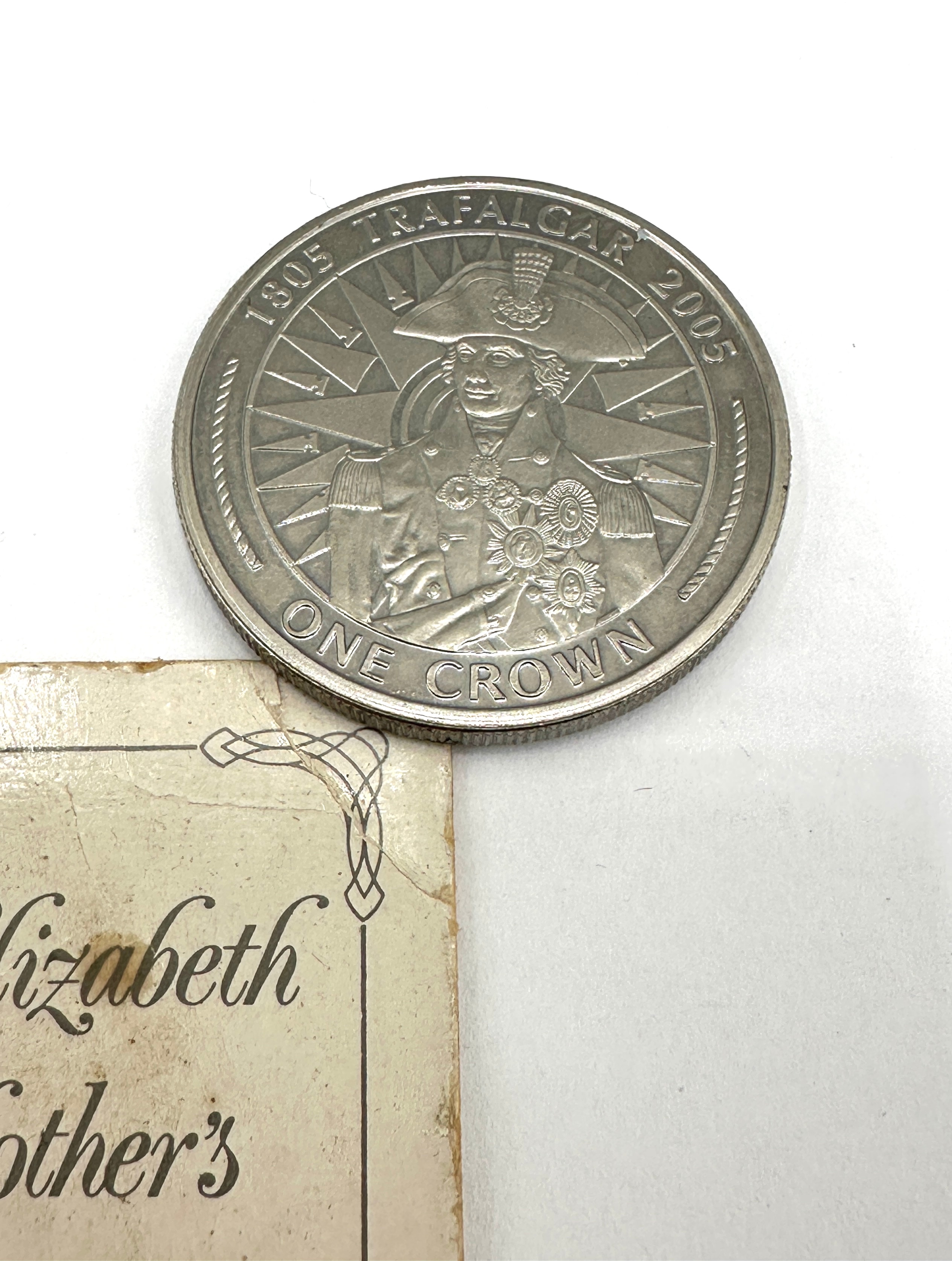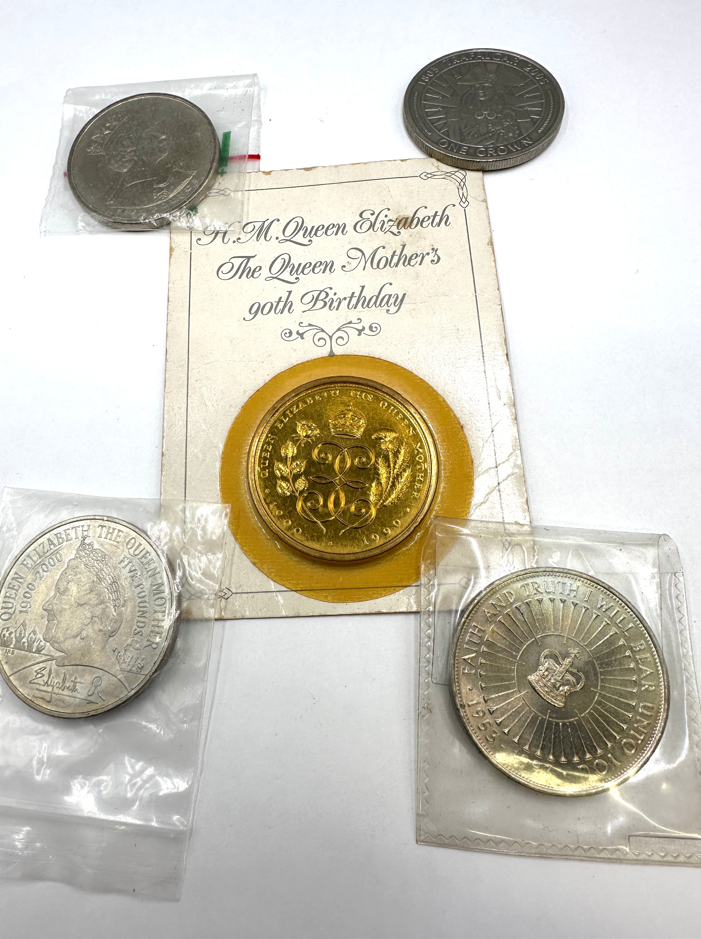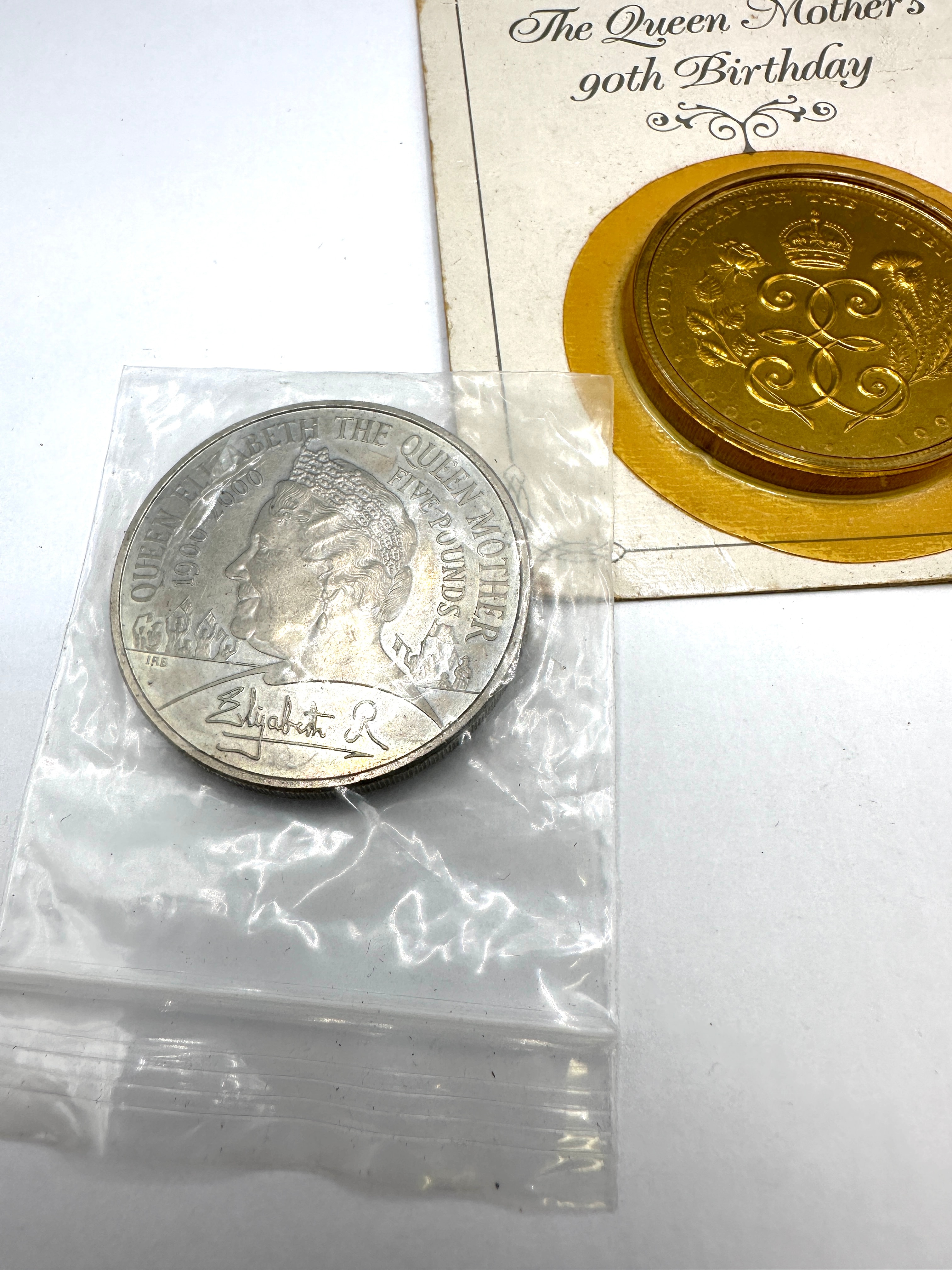 A H.M. Queen Elizabeth The Queen Mother’s 90th Birthday Crown, dated ‘1900-1990’, featuring a crowned ‘ER’ monogram surrounded by roses and thistles, presented in a yellowed plastic blister on a discolored paper card. Also included are four additional modern British commemorative coins, primarily composed of a silver-colored metal. These comprise: a ‘QUEEN ELIZABETH THE QUEEN MOTHER 1900-2000’ ‘FIVE POUNDS’ coin with a profile portrait of Queen Elizabeth II; a ‘1805 TRAFALGAR 2005’ ‘ONE CROWN’ coin depicting Lord Nelson; a ‘FAITH AND TRUTH I WILL BEAR UNTO YOU 1953-1993’ coin featuring a crown surrounded by radiating lines; and a coin with a portrait of Queen Elizabeth II and the Latin inscription ‘ELIZABETH II D.G. REG. F.D.’ (Dei Gratia Regina Fidei Defensor – By the Grace of God, Queen, Defender of the Faith). The central Queen Mother’s 90th Birthday Crown is gold-colored.