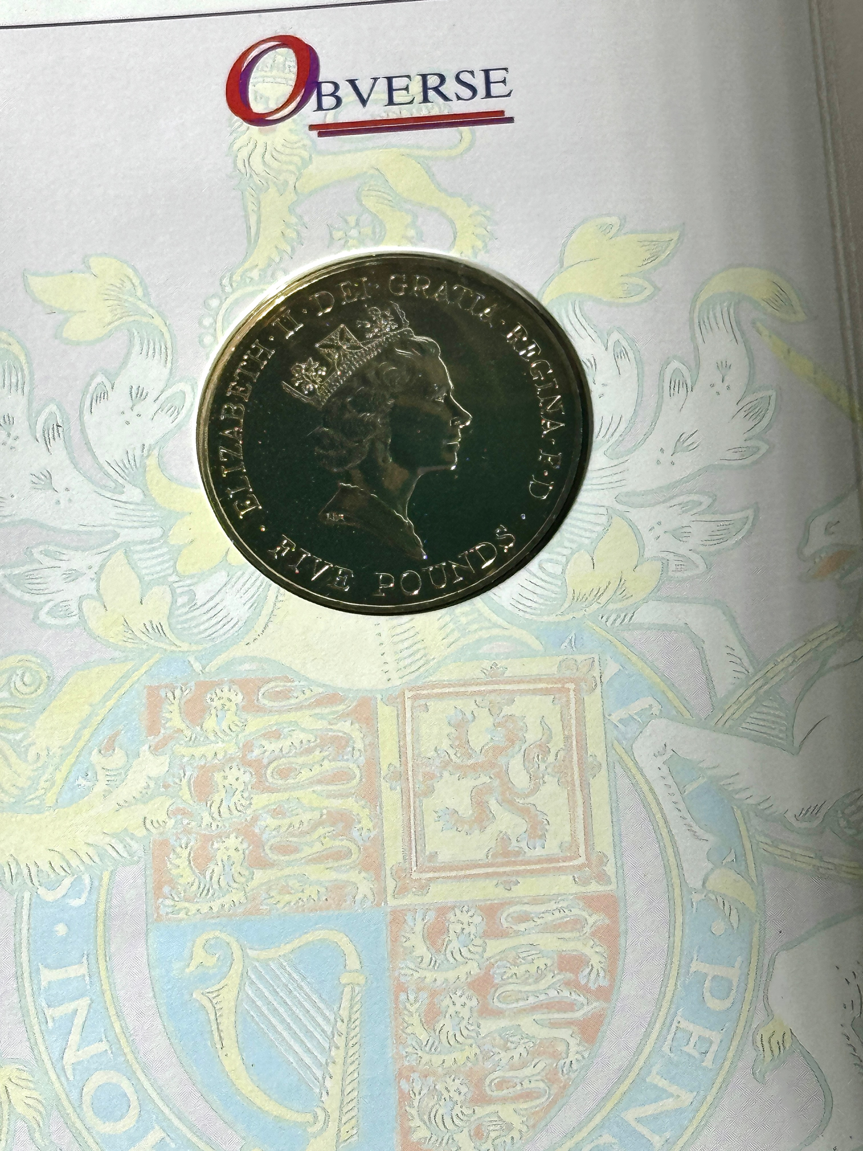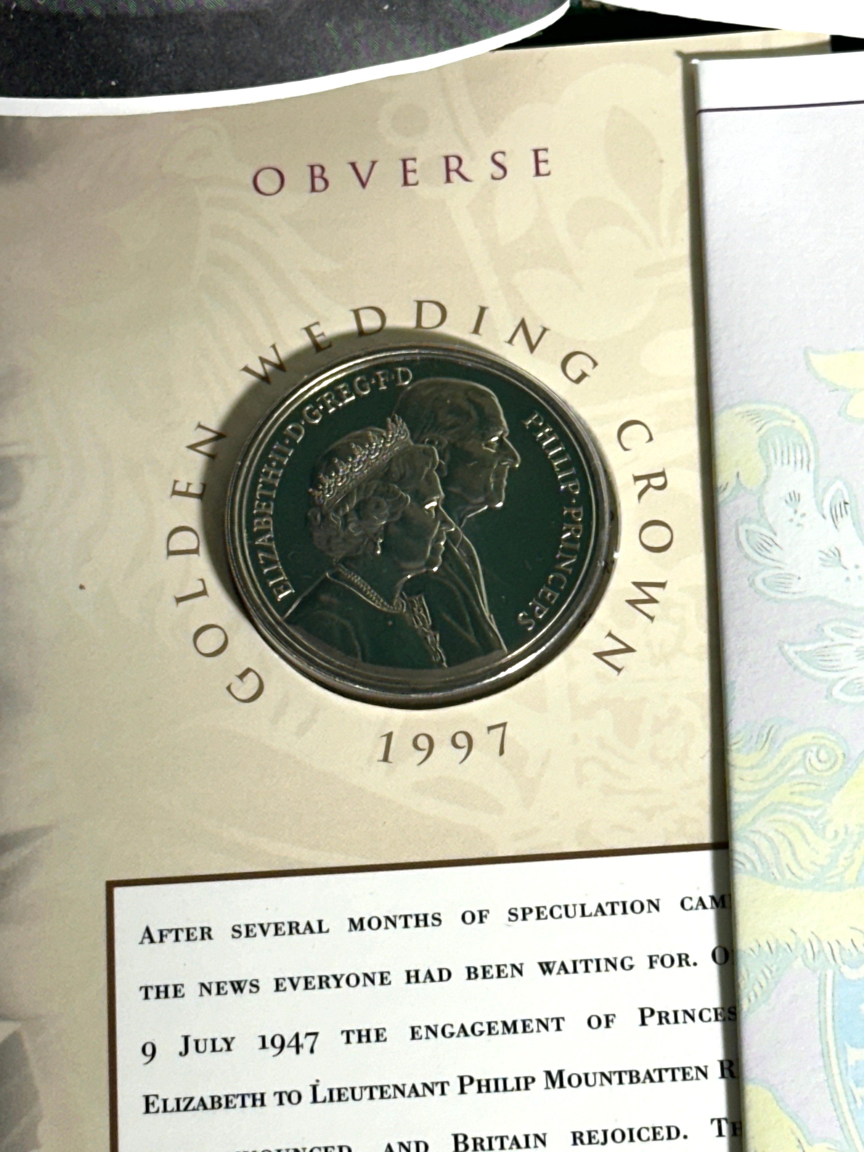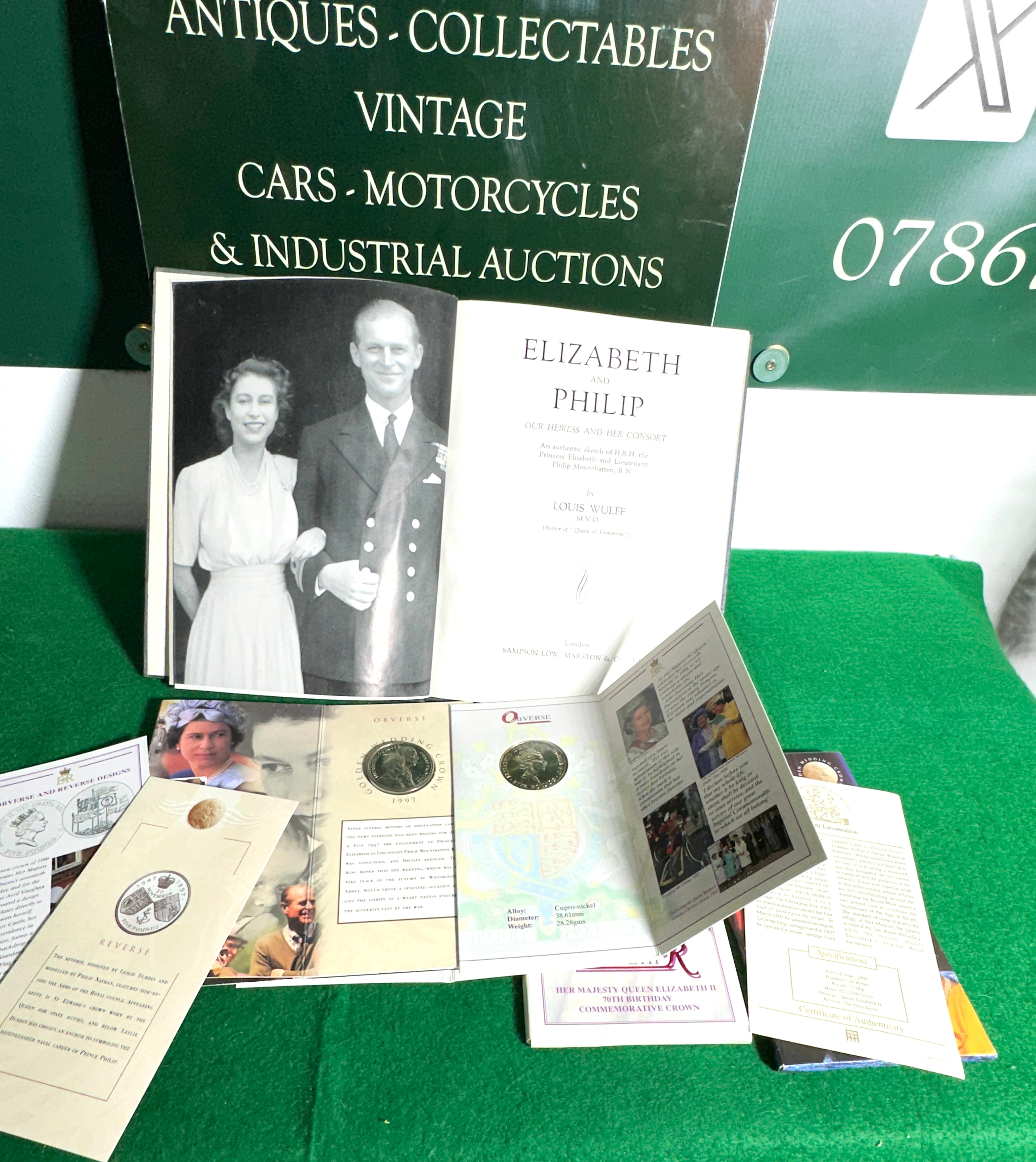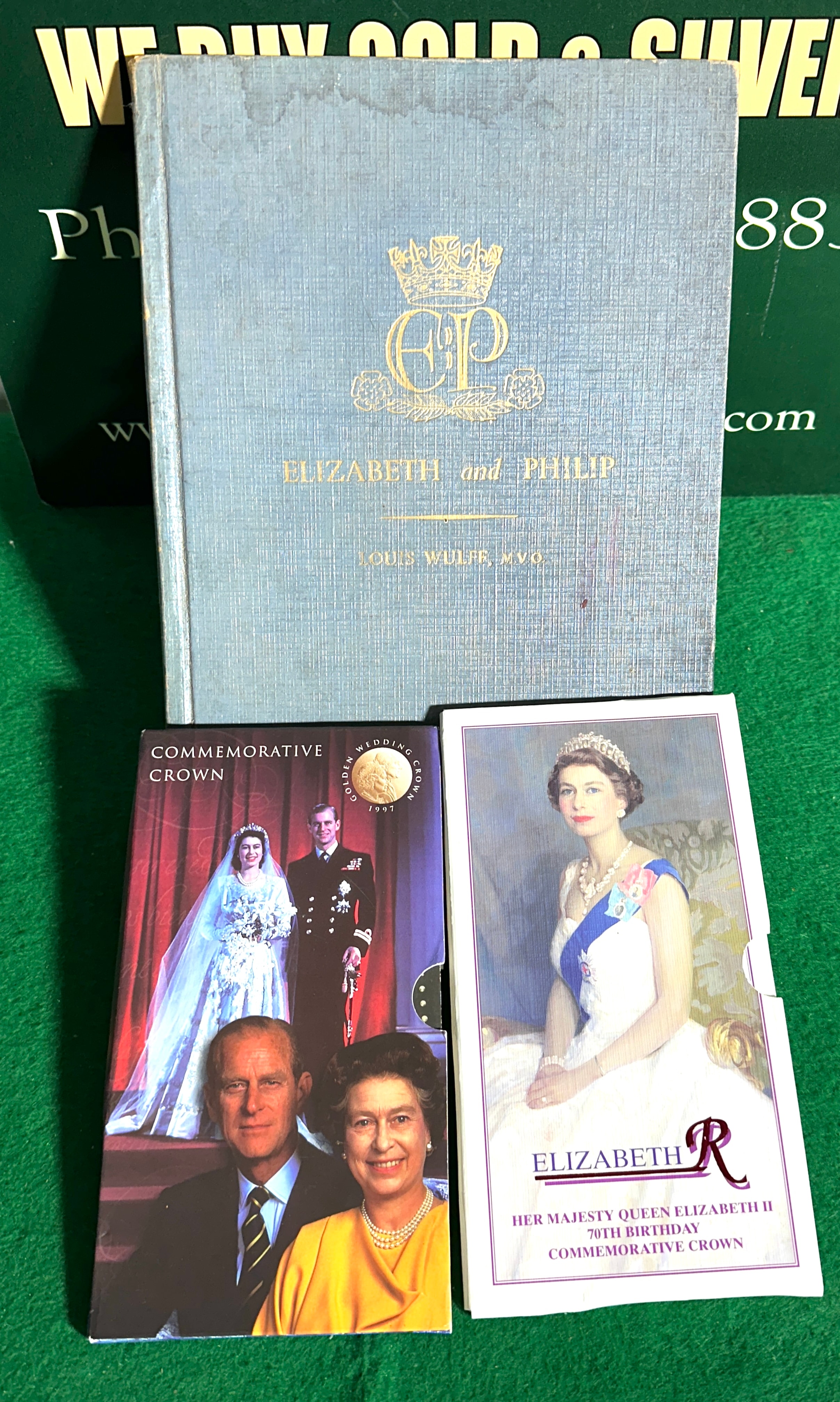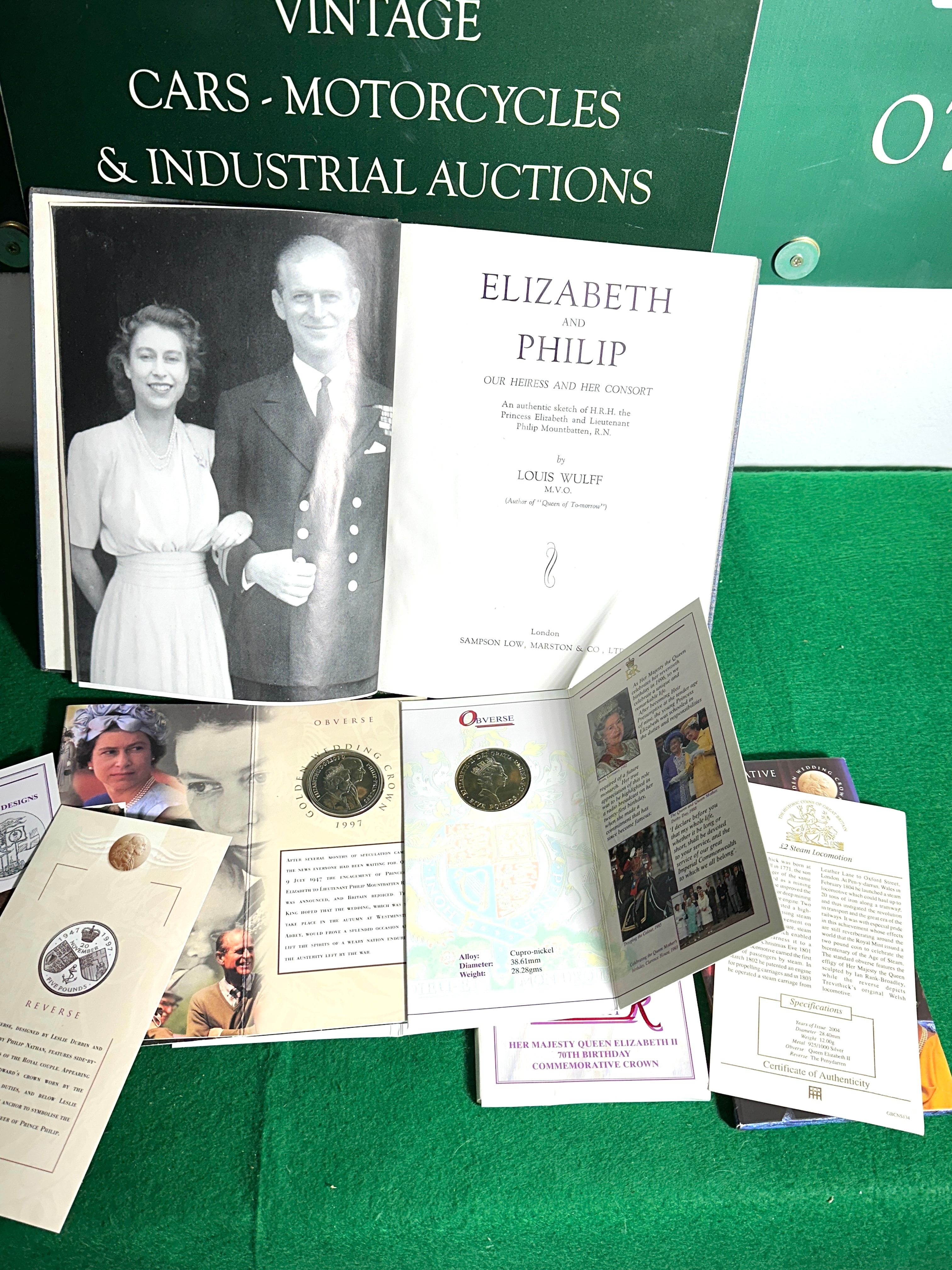 A collection featuring Louis Wulff’s “Elizabeth and Philip: Our Heiress and Her Consort,” a light blue fabric-bound hardcover book with a gold “EP” royal cipher on the cover and an early black and white photograph of the couple within. Accompanying the book are two British Royal commemorative coin presentation folders. The first is a “GOLDEN WEDDING CROWN 1997” booklet, containing a coin depicting the side profiles of Queen Elizabeth II and Prince Philip, inscribed “ELIZABETH II DEI GRATIA REGINA F D PHILIP PRINCE” and “1997.” The second is a “HER MAJESTY QUEEN ELIZABETH II 70TH BIRTHDAY COMMEMORATIVE CROWN” booklet, which houses a “FIVE POUNDS” coin made of copper-nickel, inscribed “ELIZABETH II DEI GRATIA REGINA F D FIVE POUNDS” and featuring a crowned profile of Elizabeth II. A partially visible certificate of authenticity from “The Westminster Collection” is also present.
