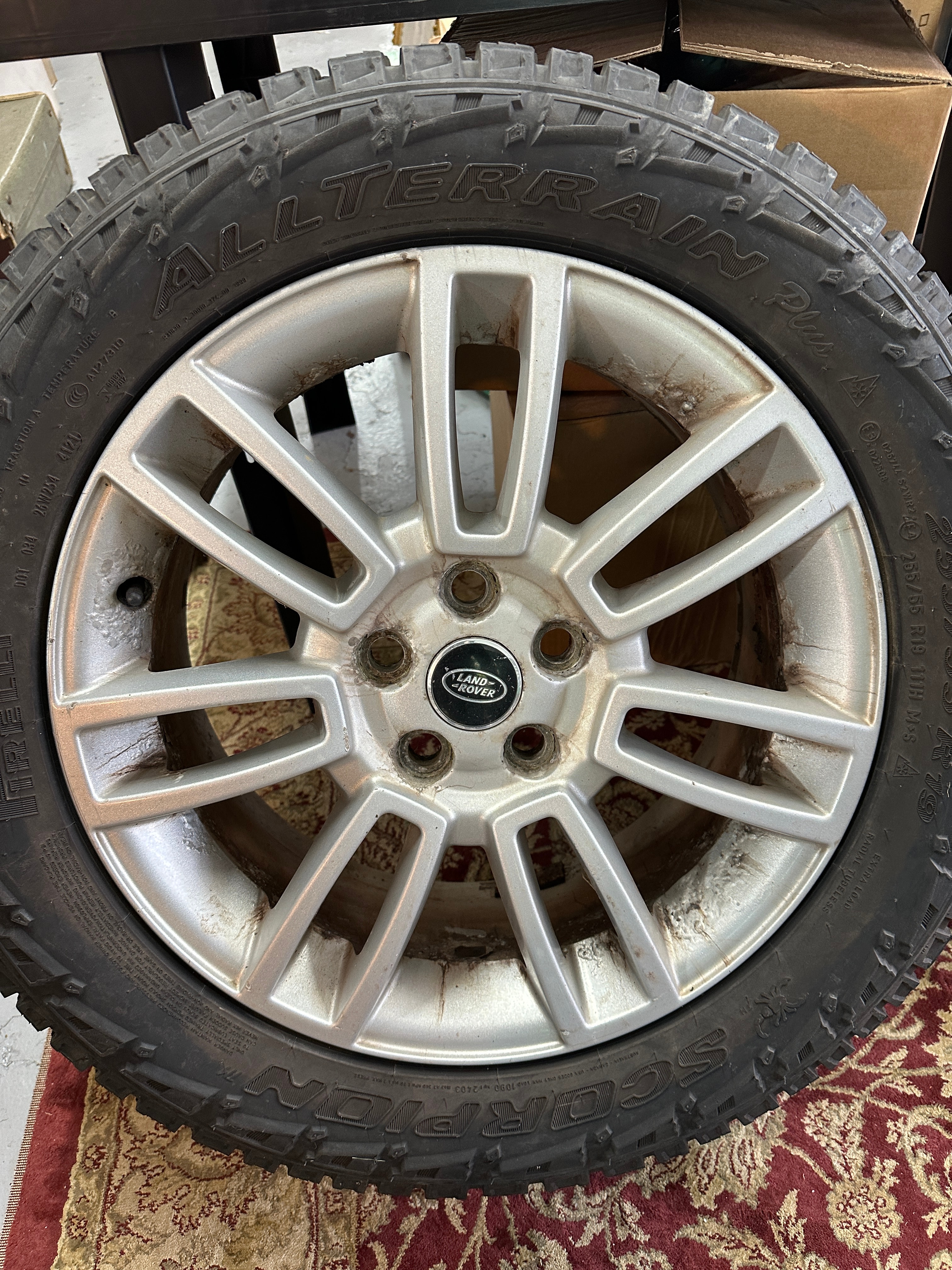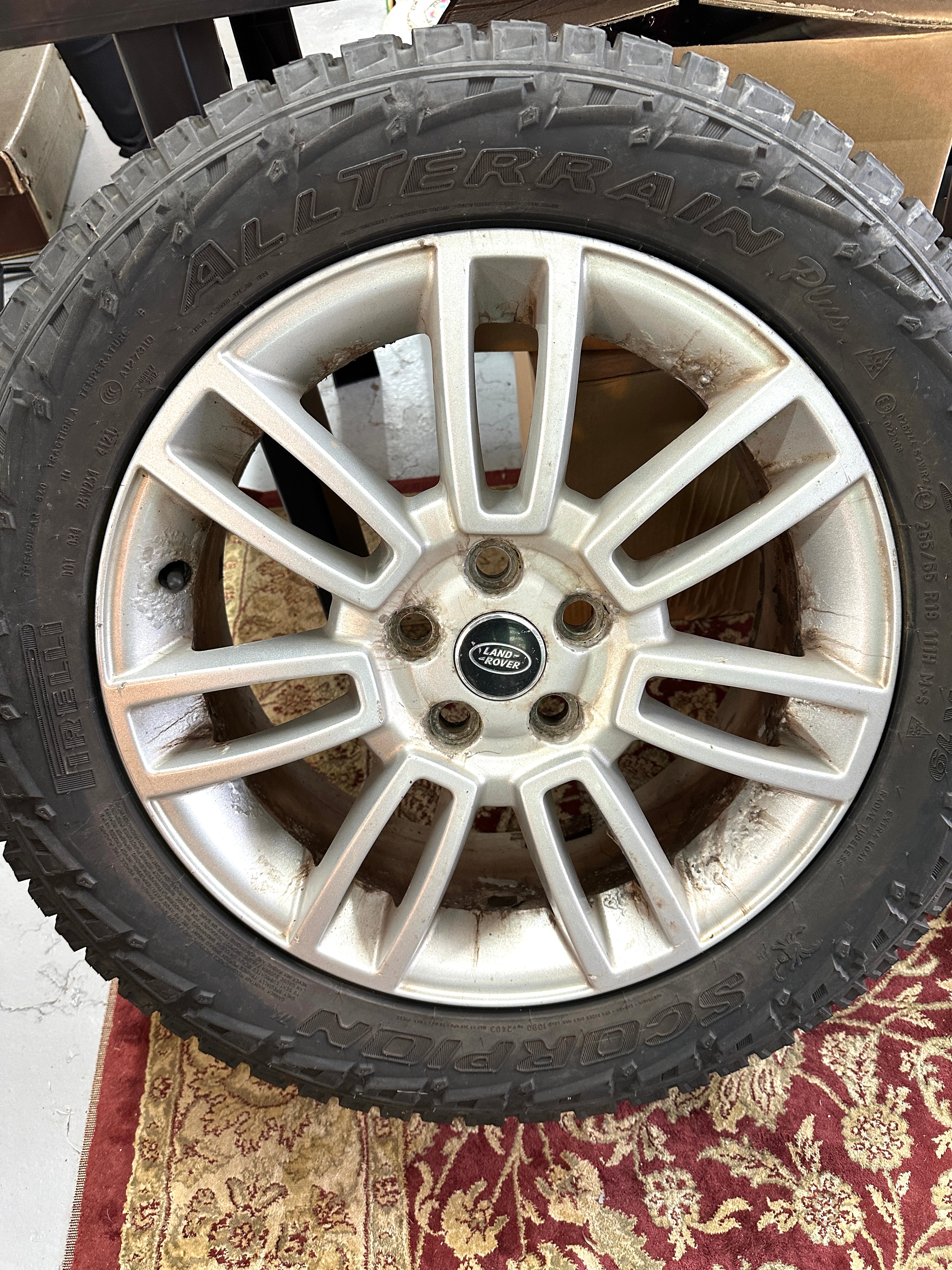 An OEM Land Rover Range Rover 19×8 silver aluminum alloy wheel, featuring a 10-spoke design and a “LAND ROVER” logo on its center cap. The wheel is fitted with a Pirelli Scorpion All Terrain Plus black rubber tire, marked with the size “255/55 R19” and featuring an aggressive, blocky tread pattern.