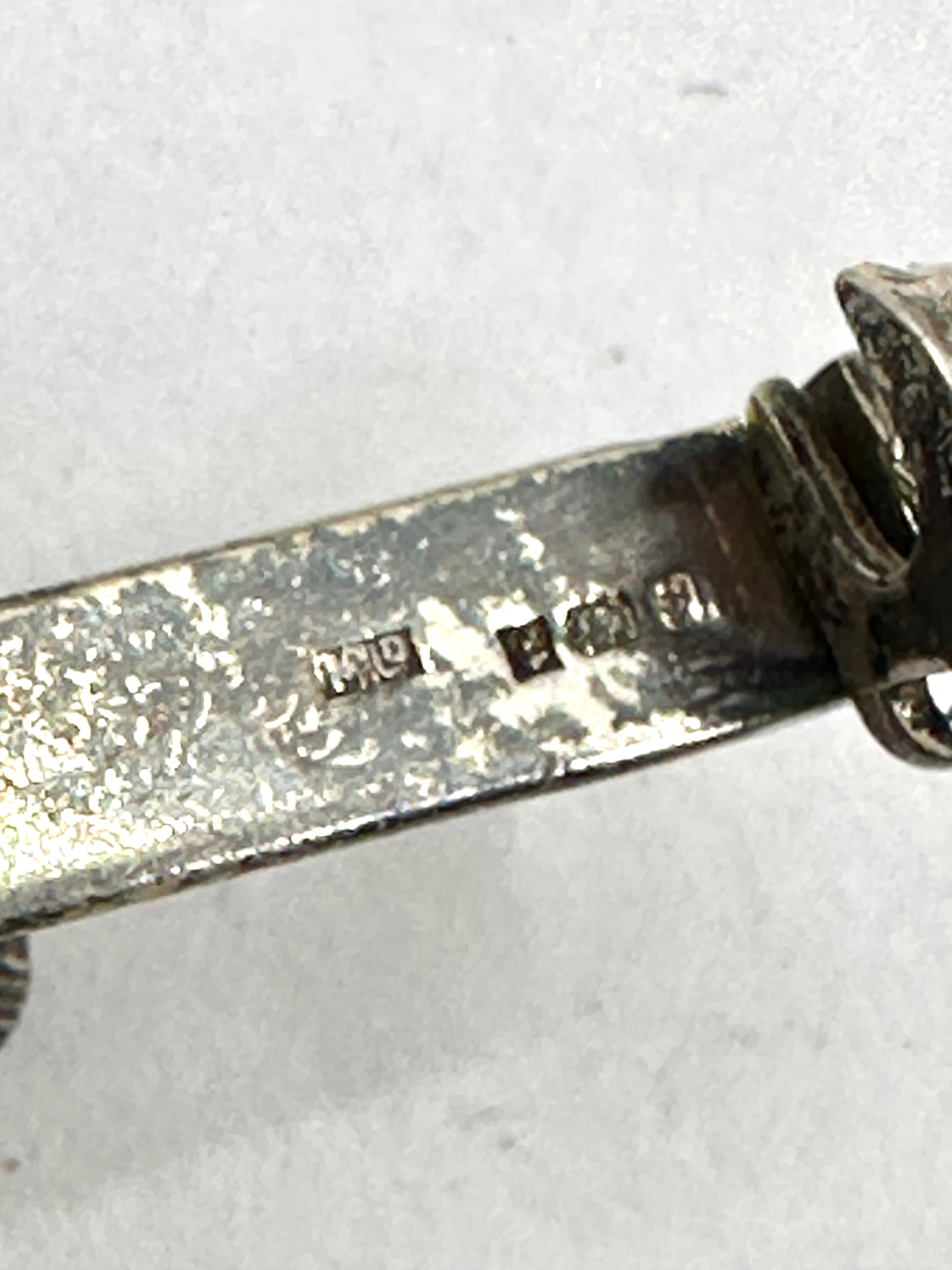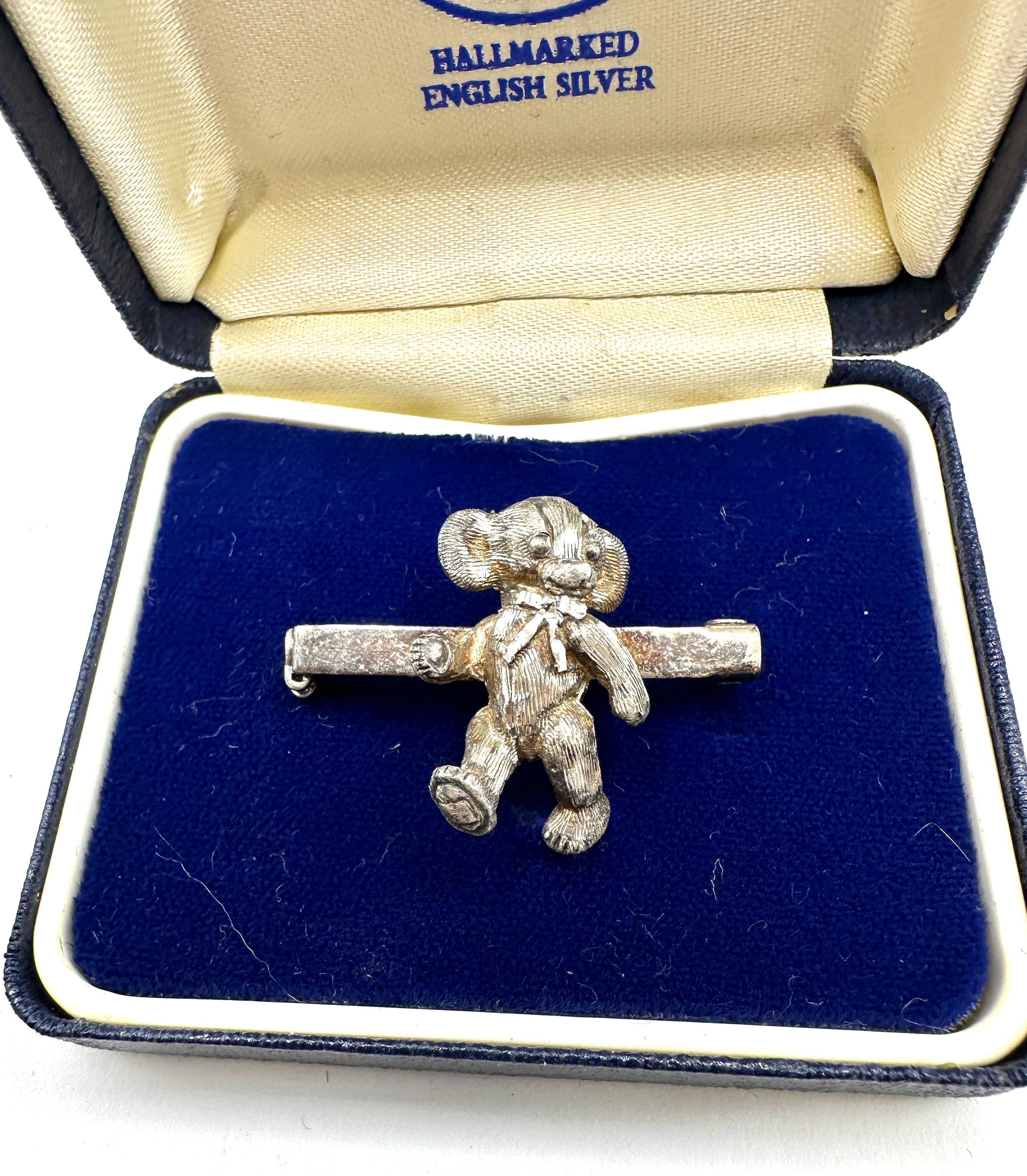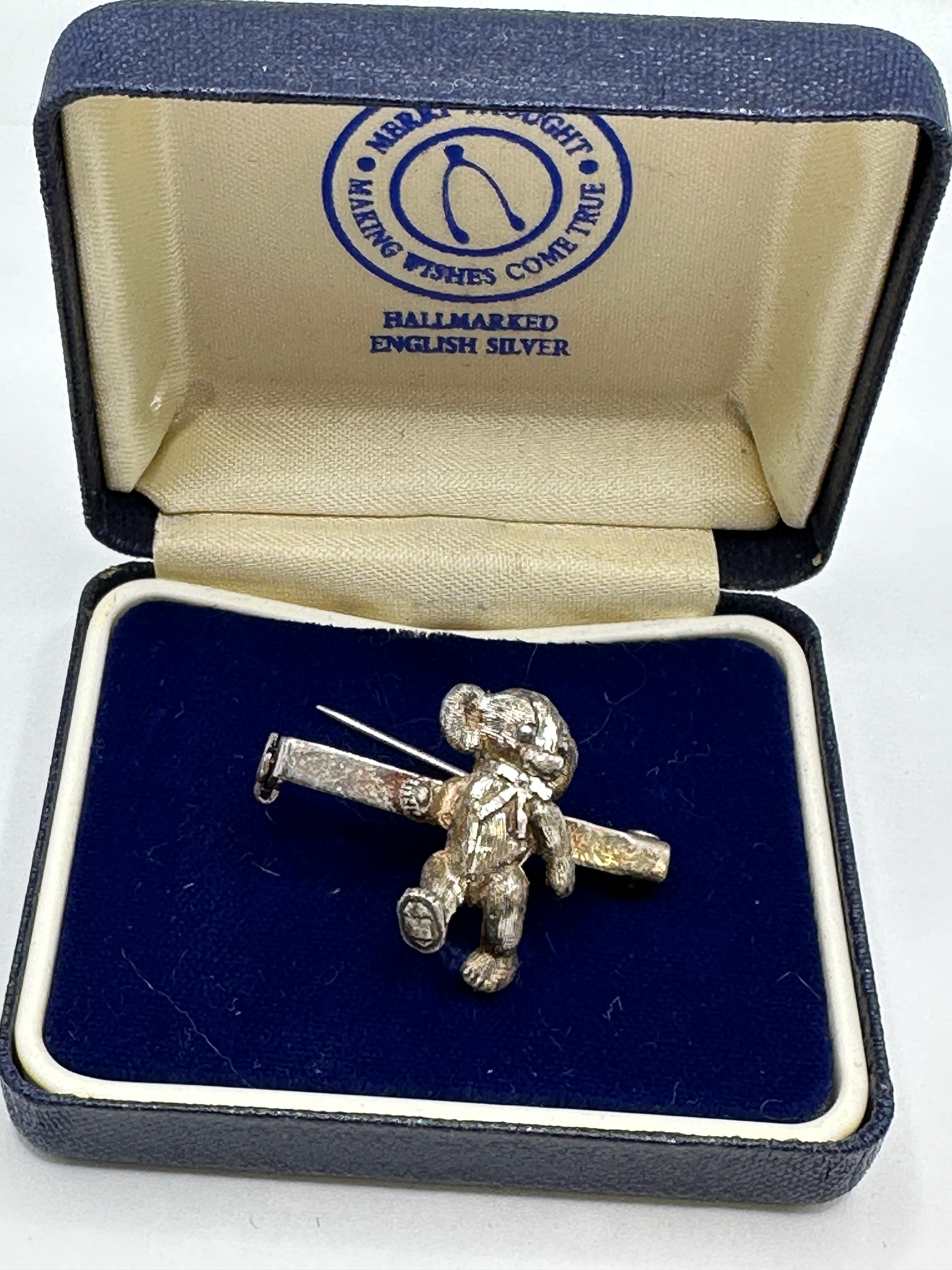 A Merrythought sterling silver bear brooch, crafted from hallmarked silver-colored metal, featuring a three-dimensional teddy bear with a bow detail, affixed to a horizontal bar. The reverse includes a pin closure. It is presented in its original dark blue hinged box with a cream satin lid lining and a deep blue velvet base. The satin lining displays the Merrythought logo and text “MAKING WISHES COME TRUE” and “HALLMARKED ENGLISH SILVER”. Multiple distinct British hallmarks, indicating sterling silver, are clearly visible on the reverse of the brooch’s horizontal bar.