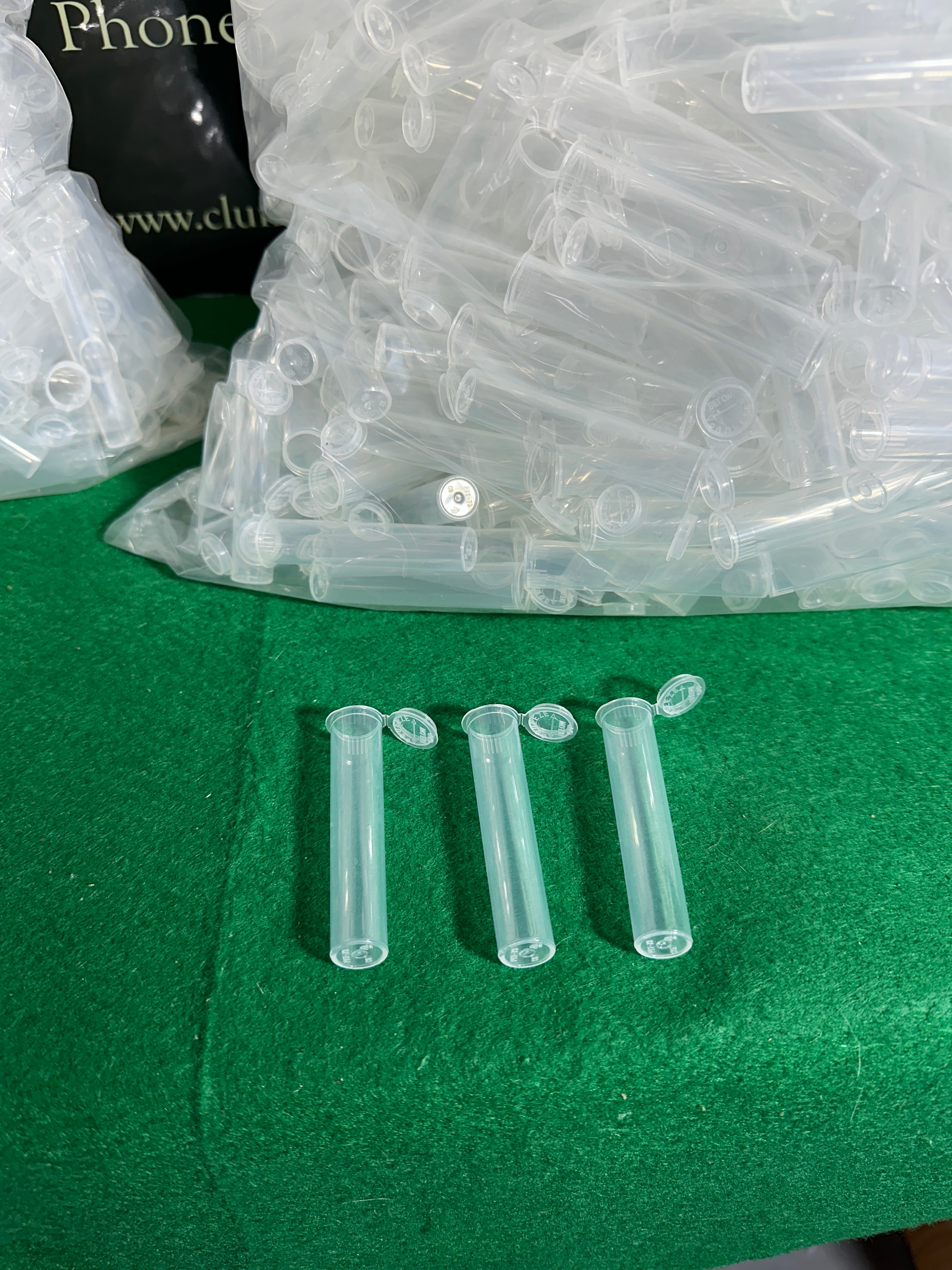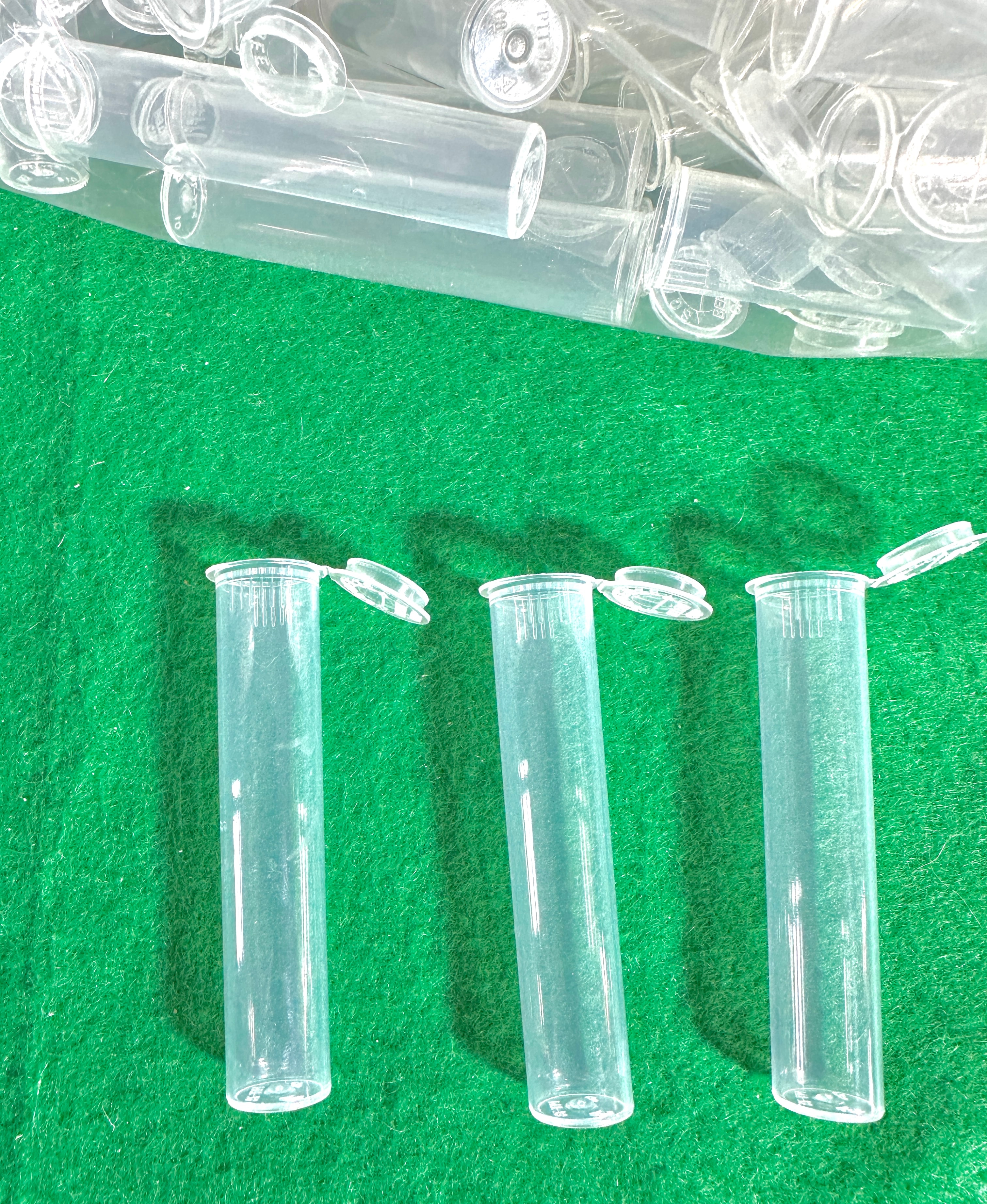 A collection of modern disposable micro centrifuge tubes, likely with a 2.0mL capacity. Each tube is clear, cylindrical, and features an integrated hinged snap-cap. Constructed from a transparent polymer, likely polypropylene, these utilitarian tubes are presented in bulk within multiple clear zip-top plastic bags. No manufacturer’s marks or branding are visible.