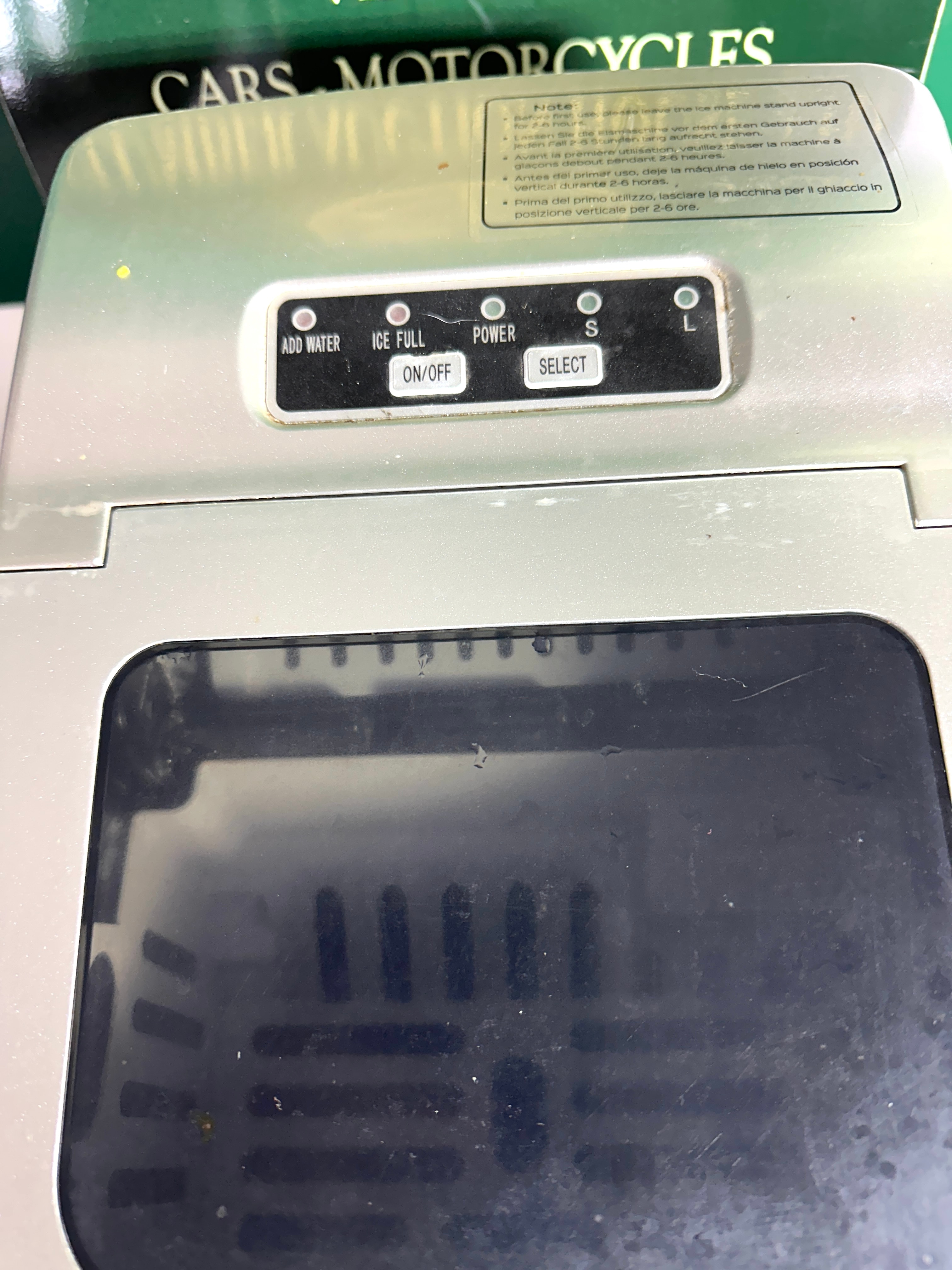 An IKICH Portable Countertop Ice Maker Machine, model CP173A. This modern, compact appliance is designed for countertop use, featuring a predominantly plastic construction with a silver-toned finish that mimics brushed aluminum. The front is marked with the brand name “ikich” in black text. The top surface incorporates a control panel equipped with indicator lights and buttons labeled “ADD WATER,” “ICE FULL,” “POWER,” “ON/OFF,” and “SELECT,” offering options for “S” (Small) and “L” (Large) ice cubes. A rectangular transparent window is set into the lid, allowing visibility into the interior. A multilingual “NOTE” label is present, providing instructions in English, German, French, and Italian, advising, “Before first use, leave the machine standing upright in a vertical position for 4 to 6 hours.” The appliance includes a white power cord with a three-pin plug.